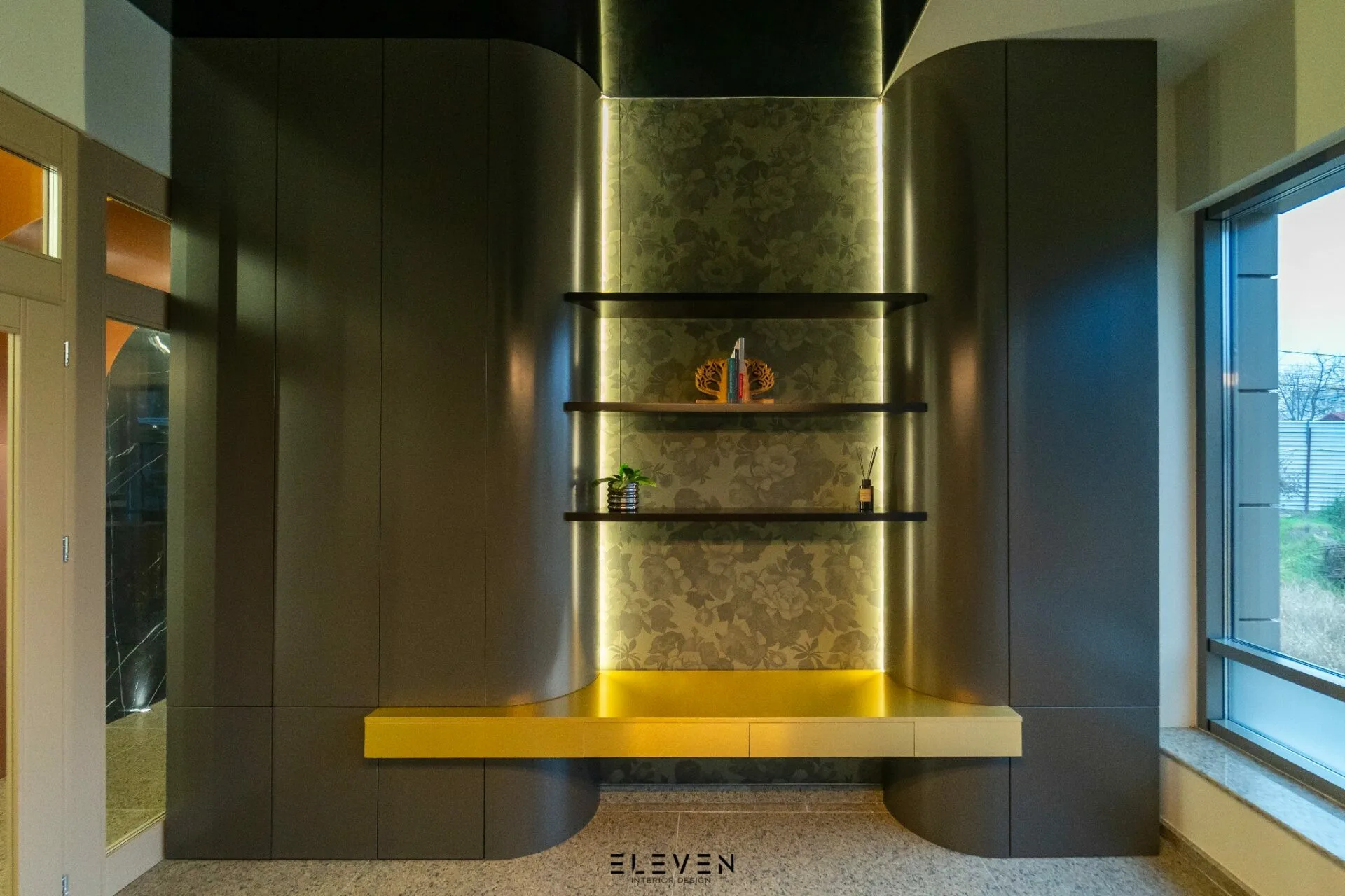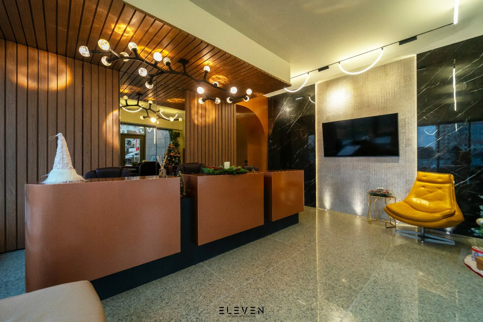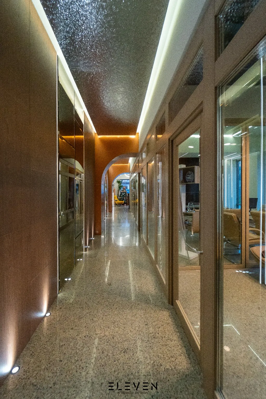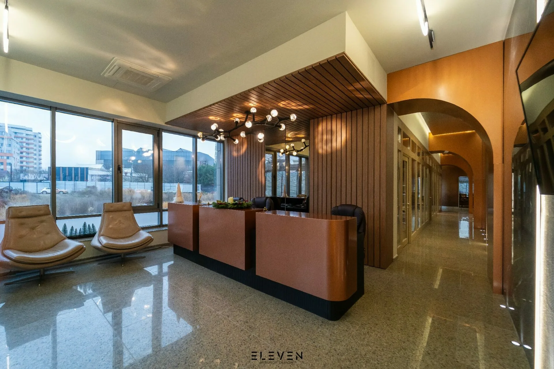 Circulațiile sunt organizate pe un hol principal ritmat de arcade ample, care delimitează vizual diferitele zone funcționale. Tavanul lucios, placat cu panouri water ripple, reflectă luminile și volumele, amplificând percepția de adâncime și continuitate. Pardoseala din granit cu finisaj lucios completează această senzație de fluiditate și unitate vizuală. Sălile de întâlnire sunt definite prin contraste de materiale și texturi, folosind tapet cu motive florale în nuanțe închise, inserții de piatră naturală cu venaturi contrastante și iluminat vertical integrat.