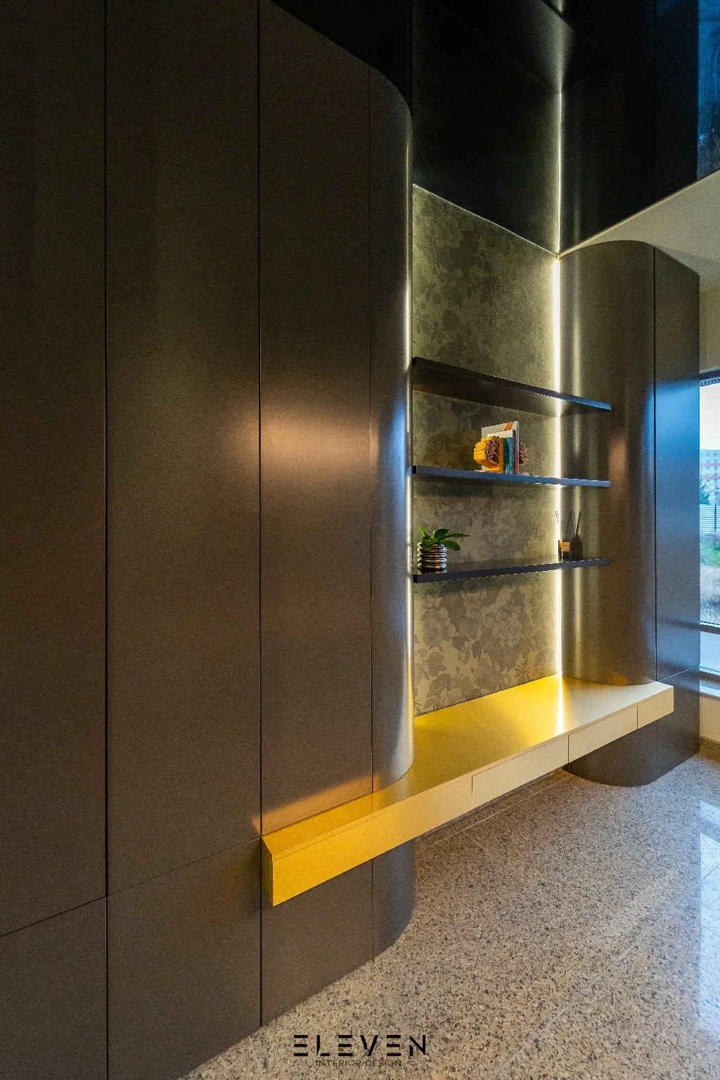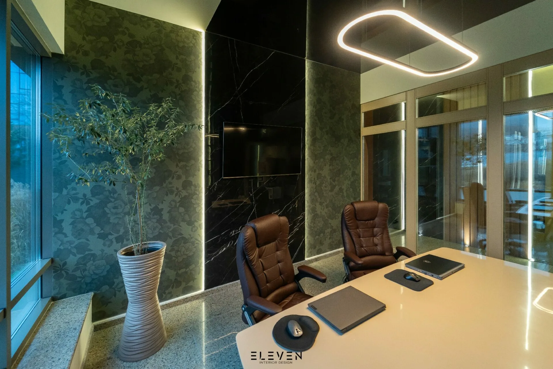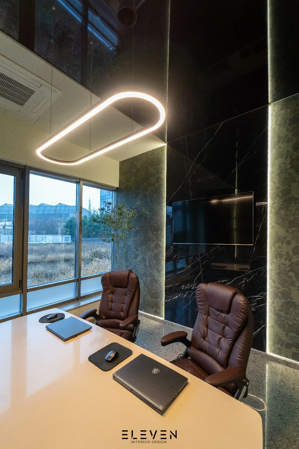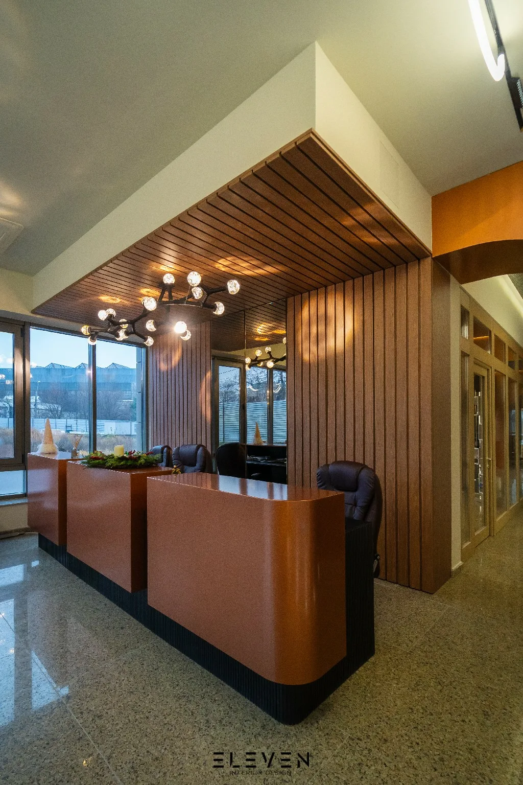Amenajarea proiectului Birou Zentrum, realizat de Eleven Interiors, este structurată în jurul unei zone centrale de recepție, tratată ca un nucleu volumetric distinct, cu placări din lemn dispuse vertical și tavan decorativ continuu, în care este integrat iluminatul ambiental și cel decorativ. Formele rotunjite ale mobilierului de recepție se regăsesc și în elementele arhitecturale, creând o tranziție fluidă între spații.