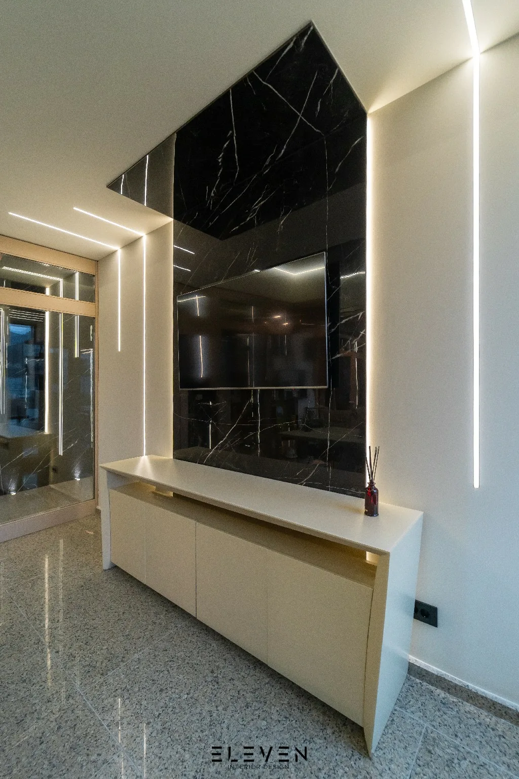 Mobilierul este dispus compact, adaptat funcțiunii de lucru și prezentare. Spațiile sanitare sunt incluse într-un volum arhitectural cu colțuri rotunjite, tratat ca un element sculptural în cadrul circulației. Accesul se face prin uși filomuro, integrate în finisajul continuu, pentru a menține un aspect unitar și curat al holului. La interior, finisajele din piatră naturală de mari dimensiuni, obiectele sanitare minimaliste și corpurile de iluminat suspendate continuă limbajul material și volumetric al întregului proiect Birou Zentrum.