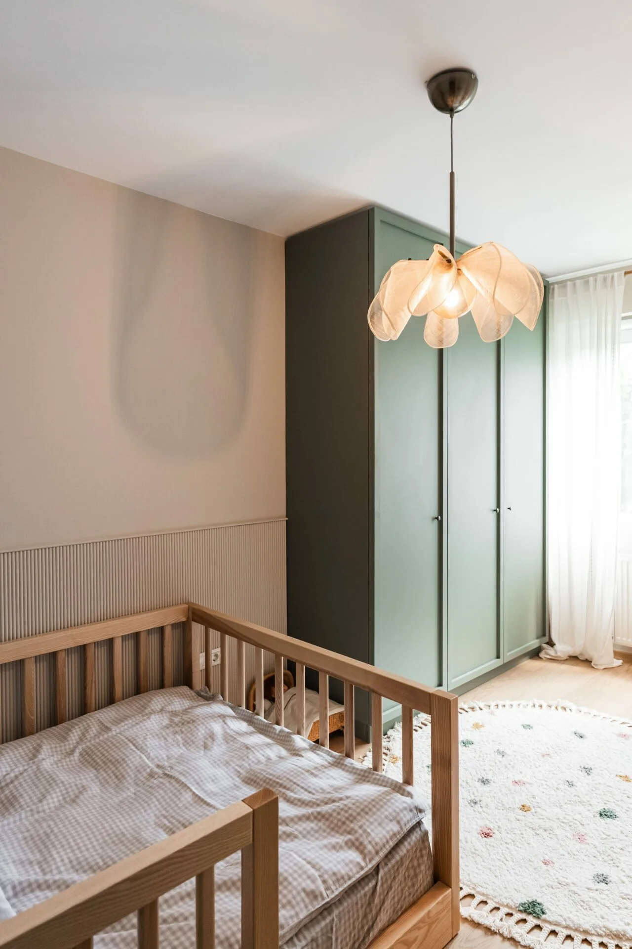 Paleta cromatică îmbină nuanțe liniștitoare cu accente subtile ce pun în valoare materialele naturale folosite: tonuri moi de lemn, textile fine, accente textile în nuanțe temperate. Lumina naturală, filtrată de draperii ușoare, modelează spațiul și evidențiază detaliile care creează un ritm vizual plăcut și relaxat.