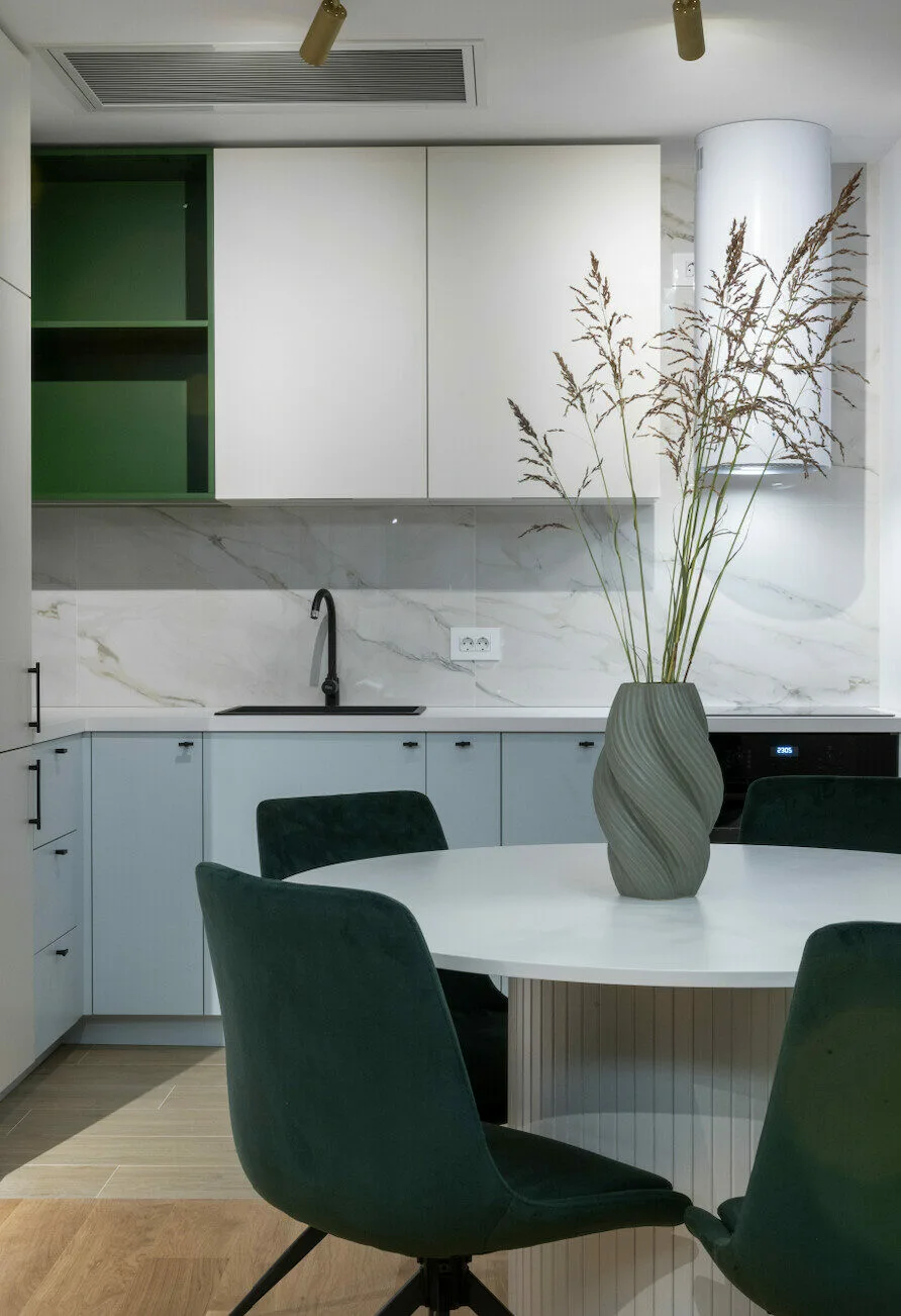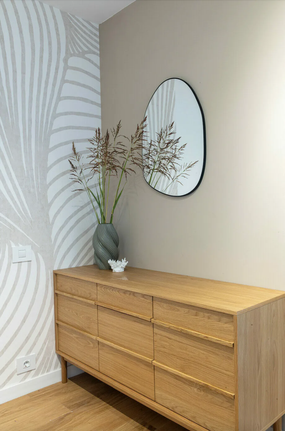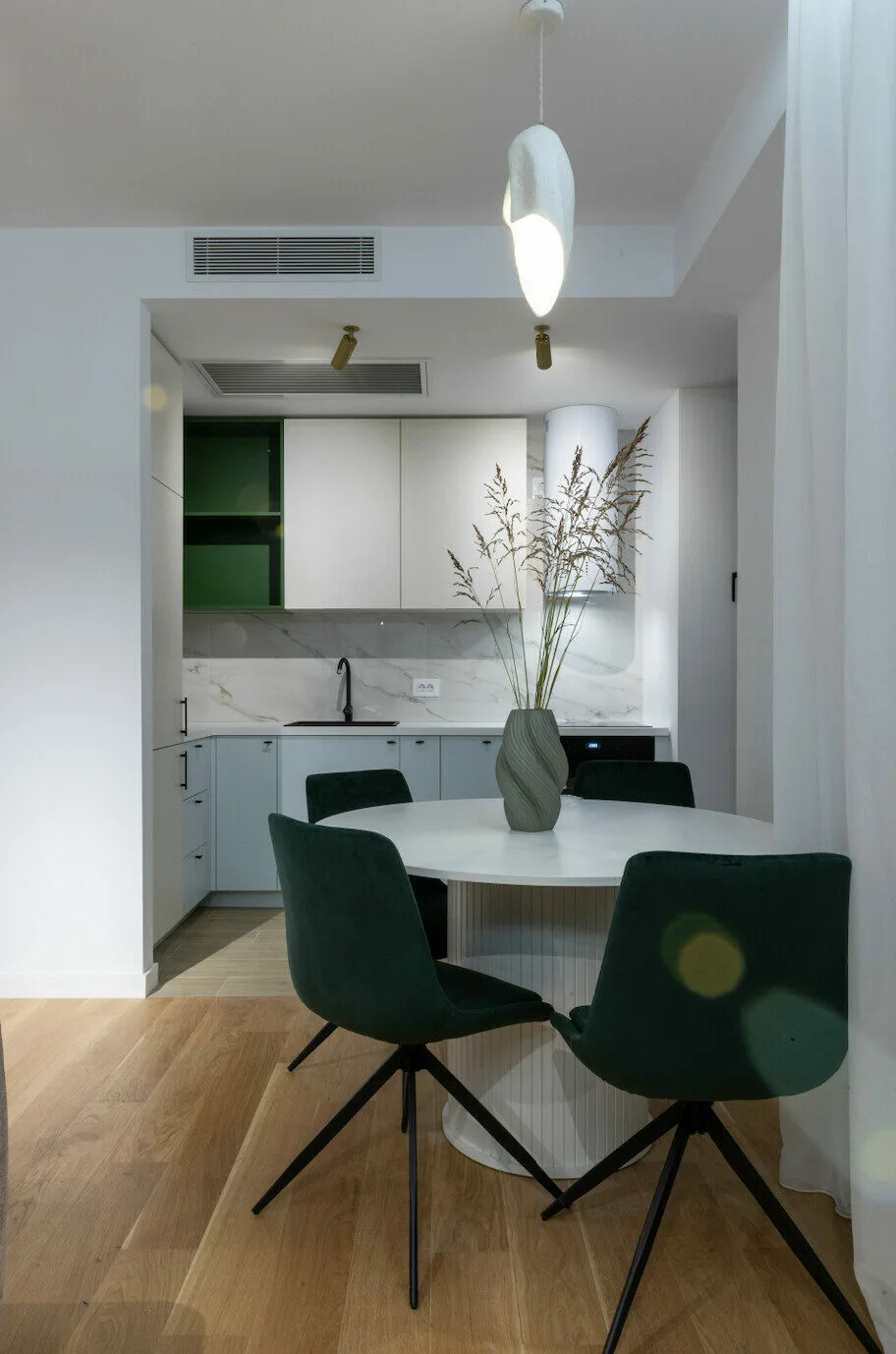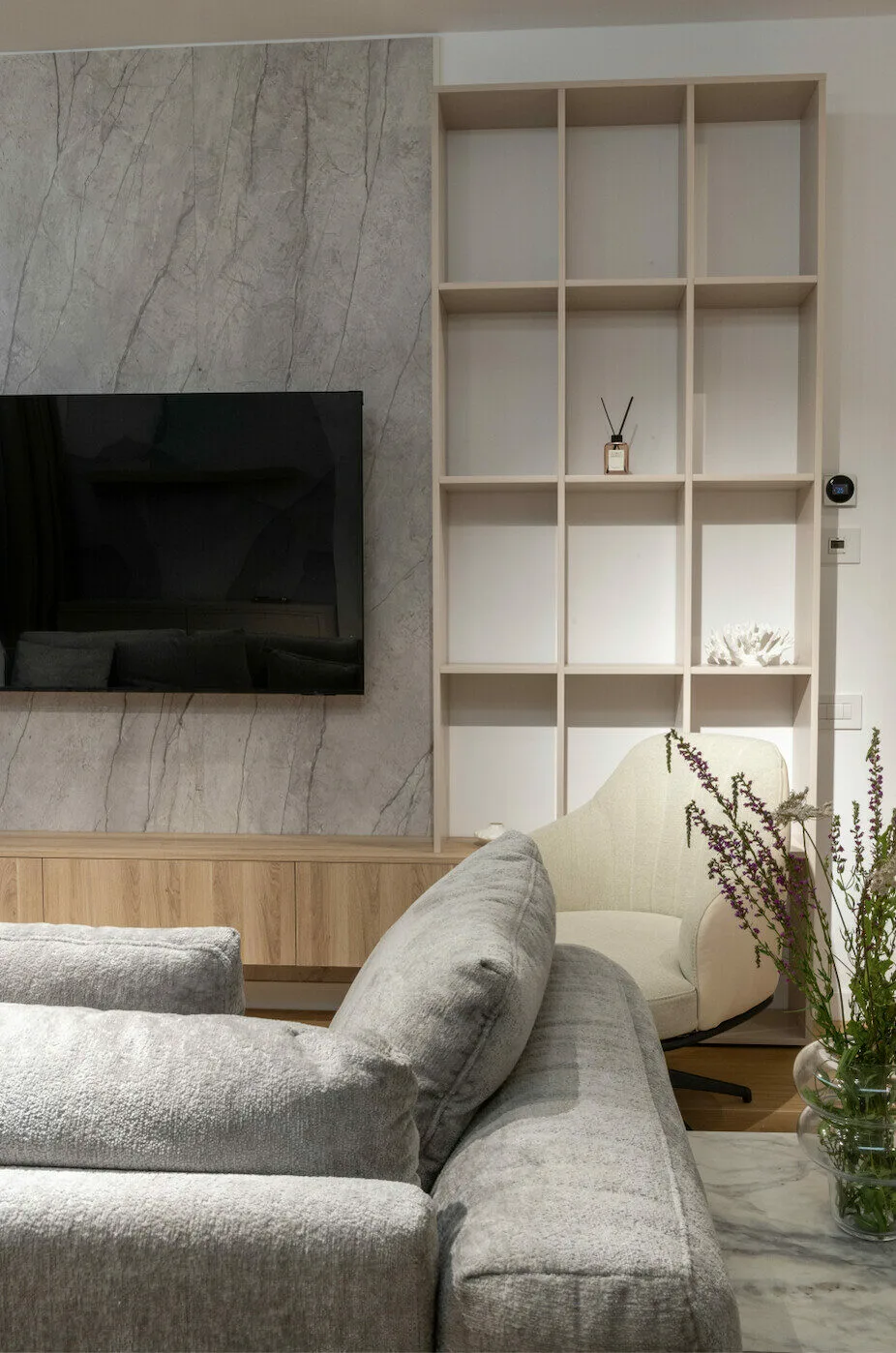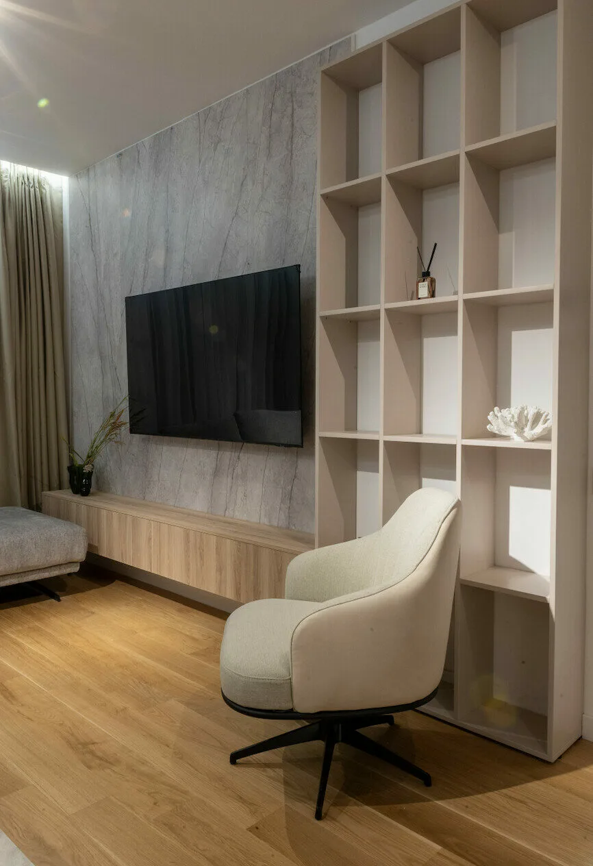 Spațiile sunt inundate de lumină naturală, având scheme cromatice delicate ce combină nuanțe de bej, alb și tonuri naturale, urmate de accente discrete menite să infuzeze energie. Interiorul este generos aerisit, materialele sunt impuse prin texturi autentice (lemn natur, textile fine, suprafețe mate), iar decorul subliniază eleganța sobră într-un stil prietenos și plin de viață. Fiecare element – de la mobilierul cu linii simple și ergonomice, până la detaliile organice – contribuie la senzația de calm și confort.