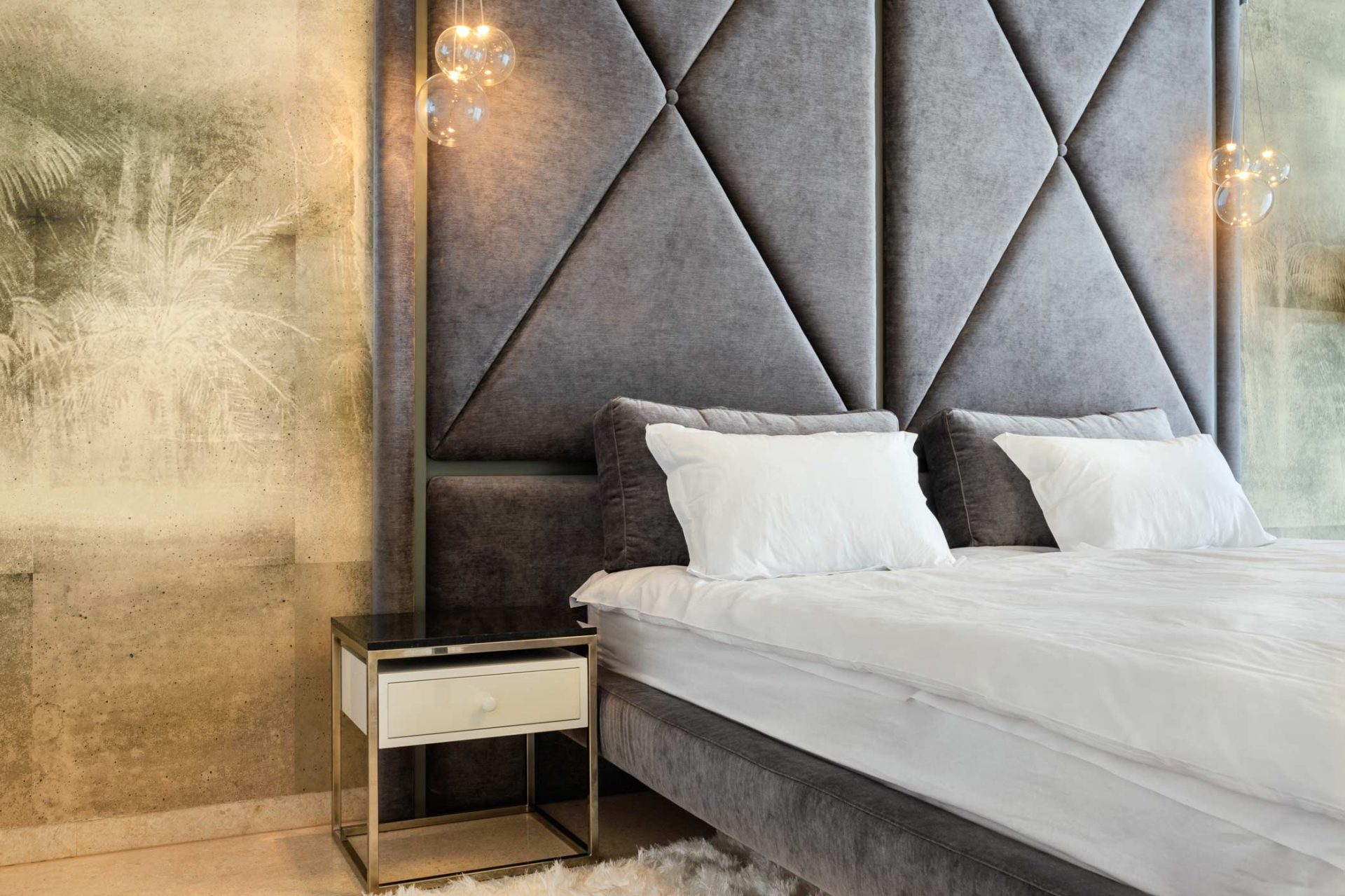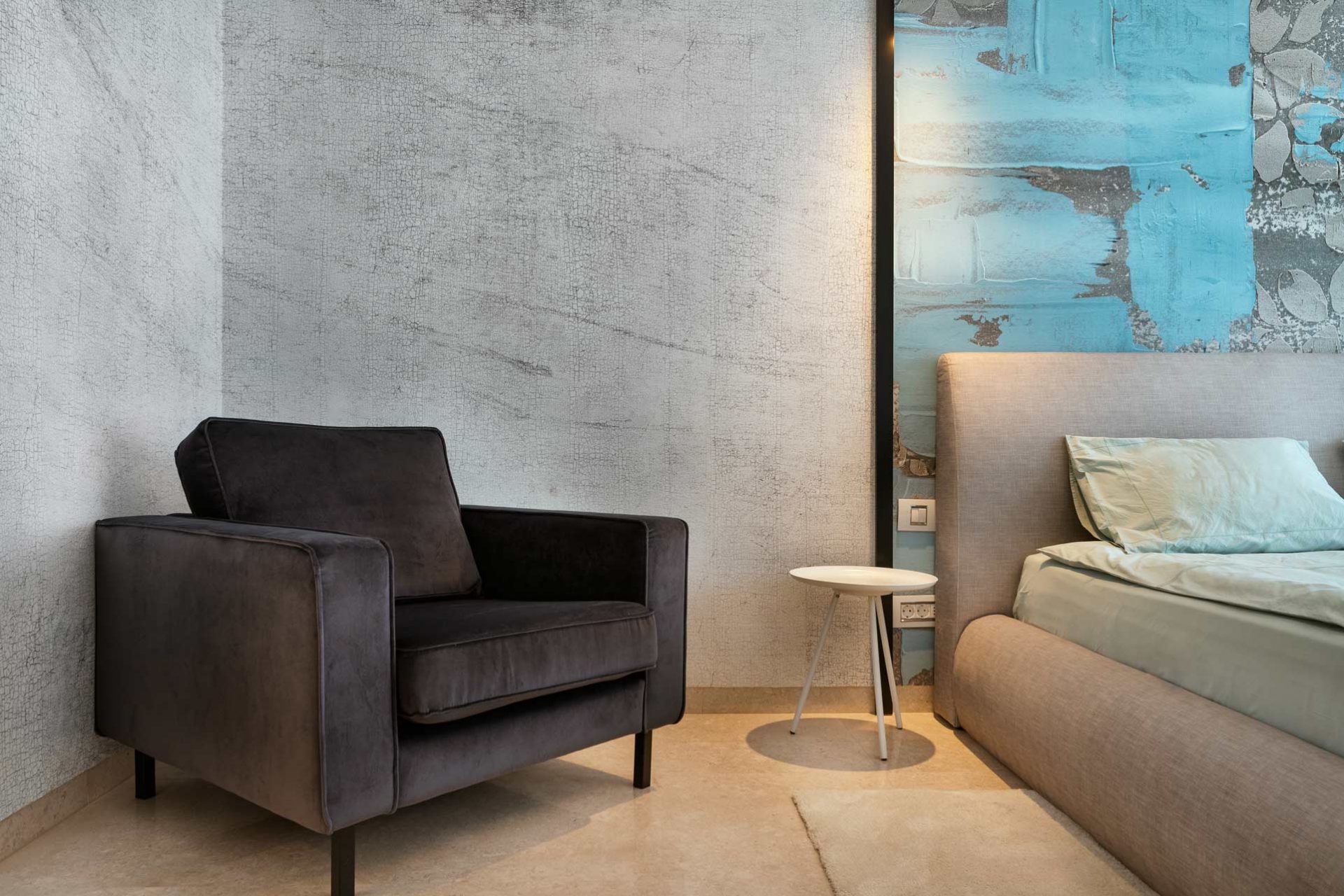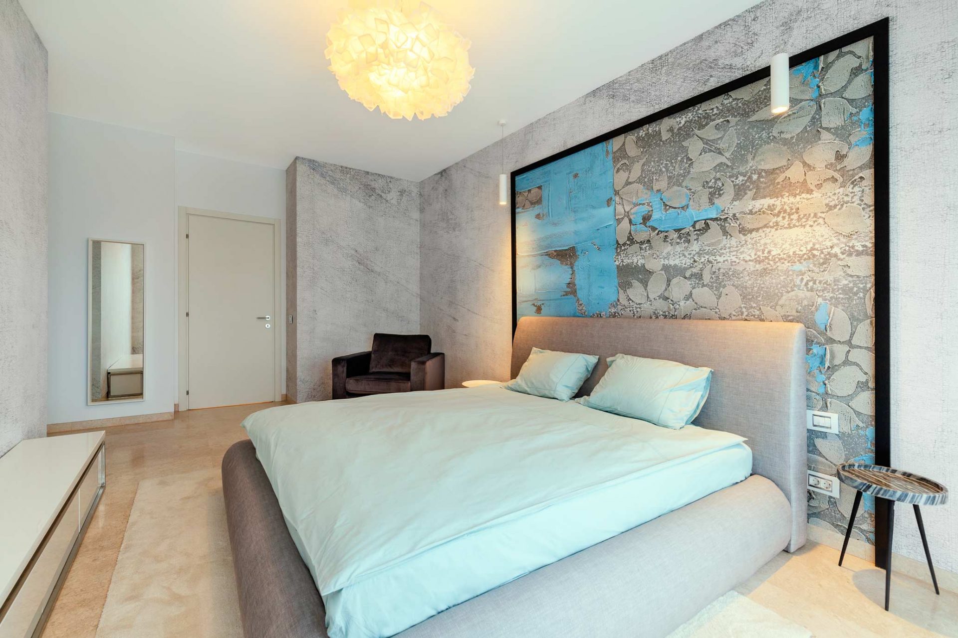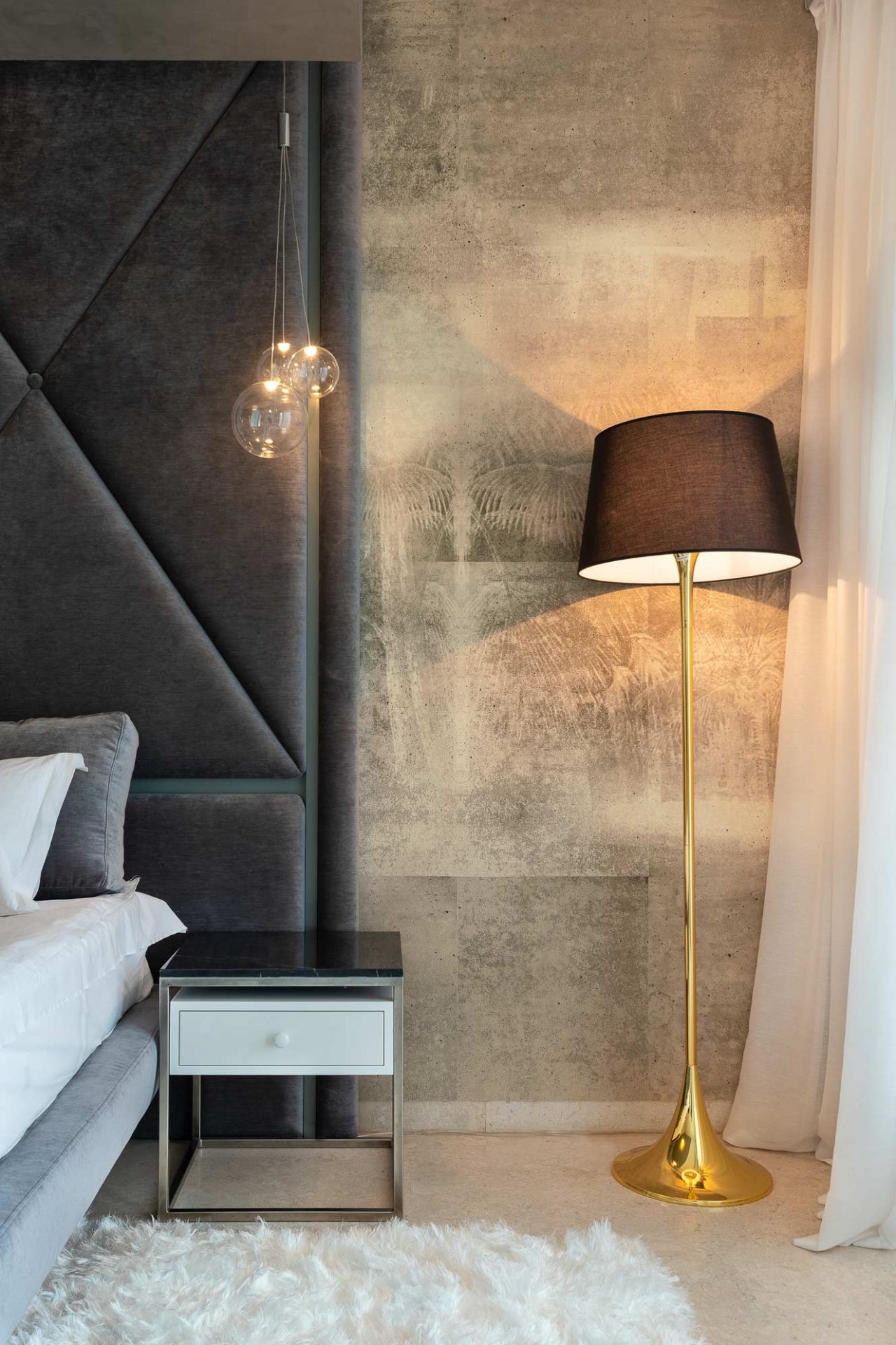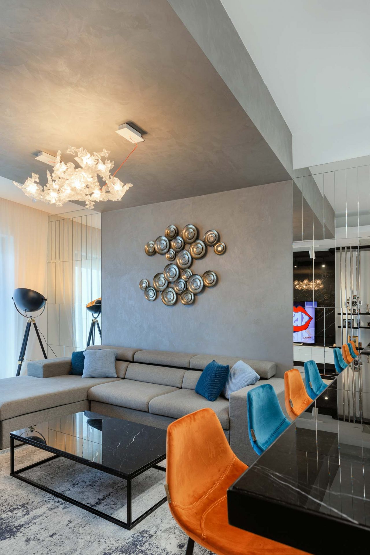 Spațiul adiacent, livingul, dispune de orientarea spre mare, și cu acces direct spre terasa principală. Livingul, împreună cu celelalte dormitoare, sunt tratate puțin mai intens, prin adoptarea unor finisaje speciale, tapet cu motive , tapiserii și marmură Nero Marquina. Piesele de mobilier sunt realizate din MDF și elemente cromate, cu un aer elegant. În contrast cu marmura neagră și vopsitoria gri cu efecte, s-a optat pentru amplasarea unor oglinzi de diferite dimensiuni, cu efectul de a mări spațiul.