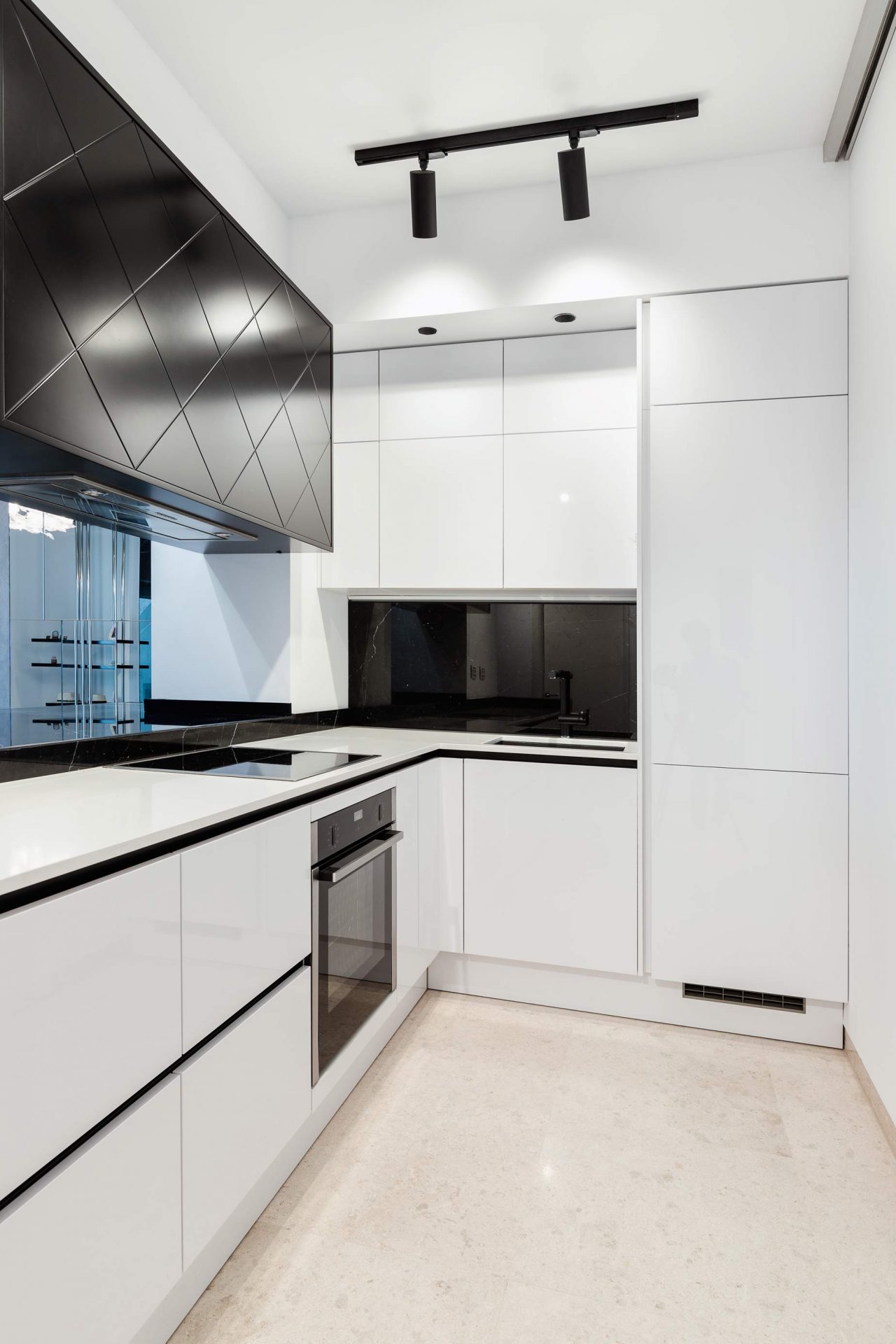 Pardoseala existentă s-a pastrat, și de asemenea finisajele din băi împreună cu obiectele sanitare. Prima intervenție s-a produs în bucătarie, ce s-a dorit a comunica cu livingul, astfel bucătaria devenind un spațiu mult mai aerisit și iluminat. Paleta de culori aleasă pentru bucătarie a fost minimalizata, realizând un joc de volume din alb și negru.