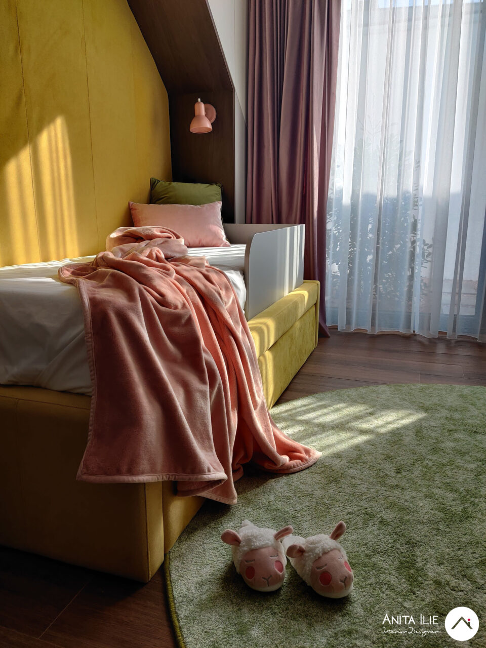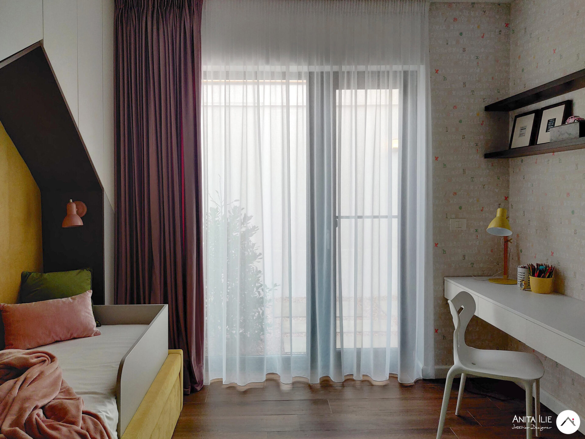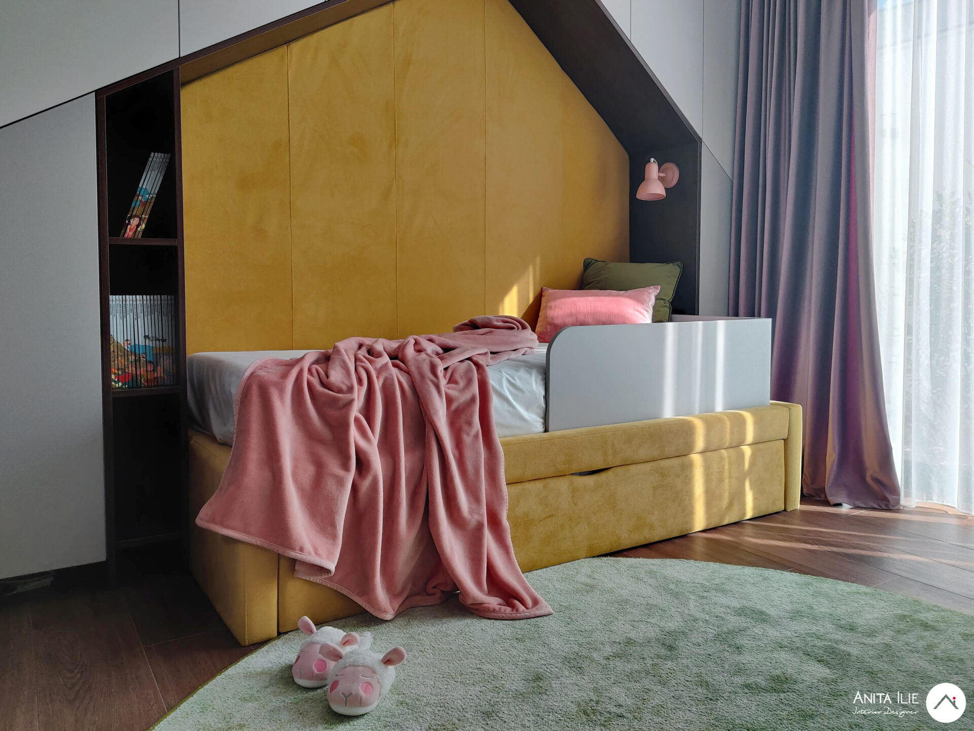 Tapetul folosit ca accent, devine aici elementul care leagă toată amenajarea, punctul de pornire a amenajării, în el regasindu-se toată paleta de culori. Patul cu tăblia în formă de căsuță a fost tapițat cu o nuanță luminoasă și veselă de galben, iar în jurul lui, urmând forma, am creat spatiu de depozitare pentru îmbrăcăminte. Patul dispune de o saltea extractibila pentru copii în cazul unei vizite. Biroul este amplasat pe peretele de vis-a-vis, creându-se între acestea un culoar de circulație și loc de joacă. Biroul este amplasat pe perete, fără picioare, lăsând senzația de aserisit, sub el rămânând un spațiu foarte potrivit pentru joacă. În dreapta lui găsim rafturile cu cutii de depozitare pentru jucării și dulapul care pe viitor va “găzdui” caiete și cărți de școală. Deasupra biroului stau rafturile pentru cărți (realizate cu același tip de finisaj ca și peretele despărțitor de la intrare) și un ceas în forma de căsuță ce mimează forma tăbliei patului. Peretele maro cu ușa creează un background perfect pentru toate afișele, desenele, orarele cu care Lea își va exprima personalitatea, funcționând ca o tabela de afișaj. Zona de joacă se conturează între cei doi pereți cu mobilier și este subliniată de covorul rotund în culoare verde mentă. Spor la joacă!