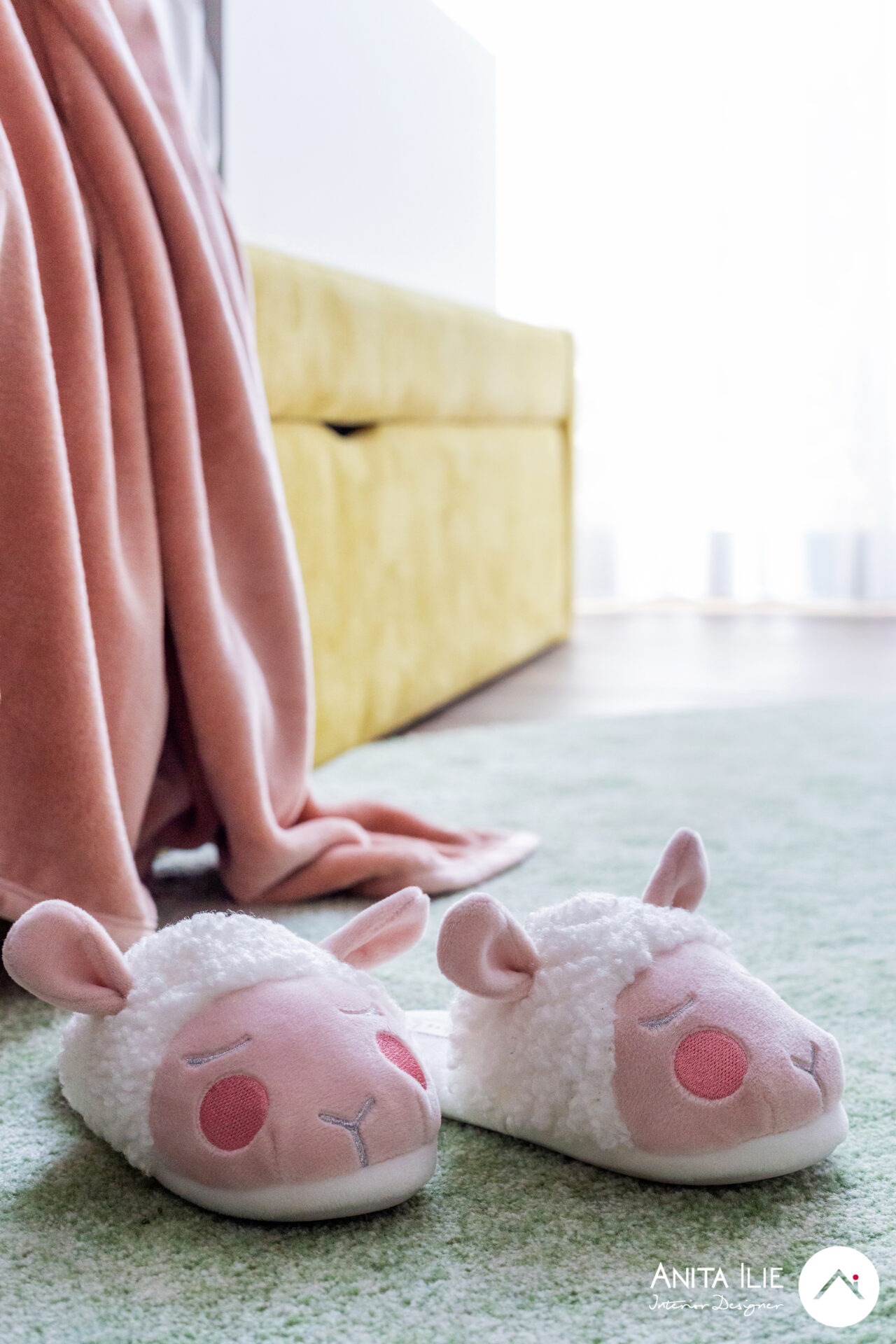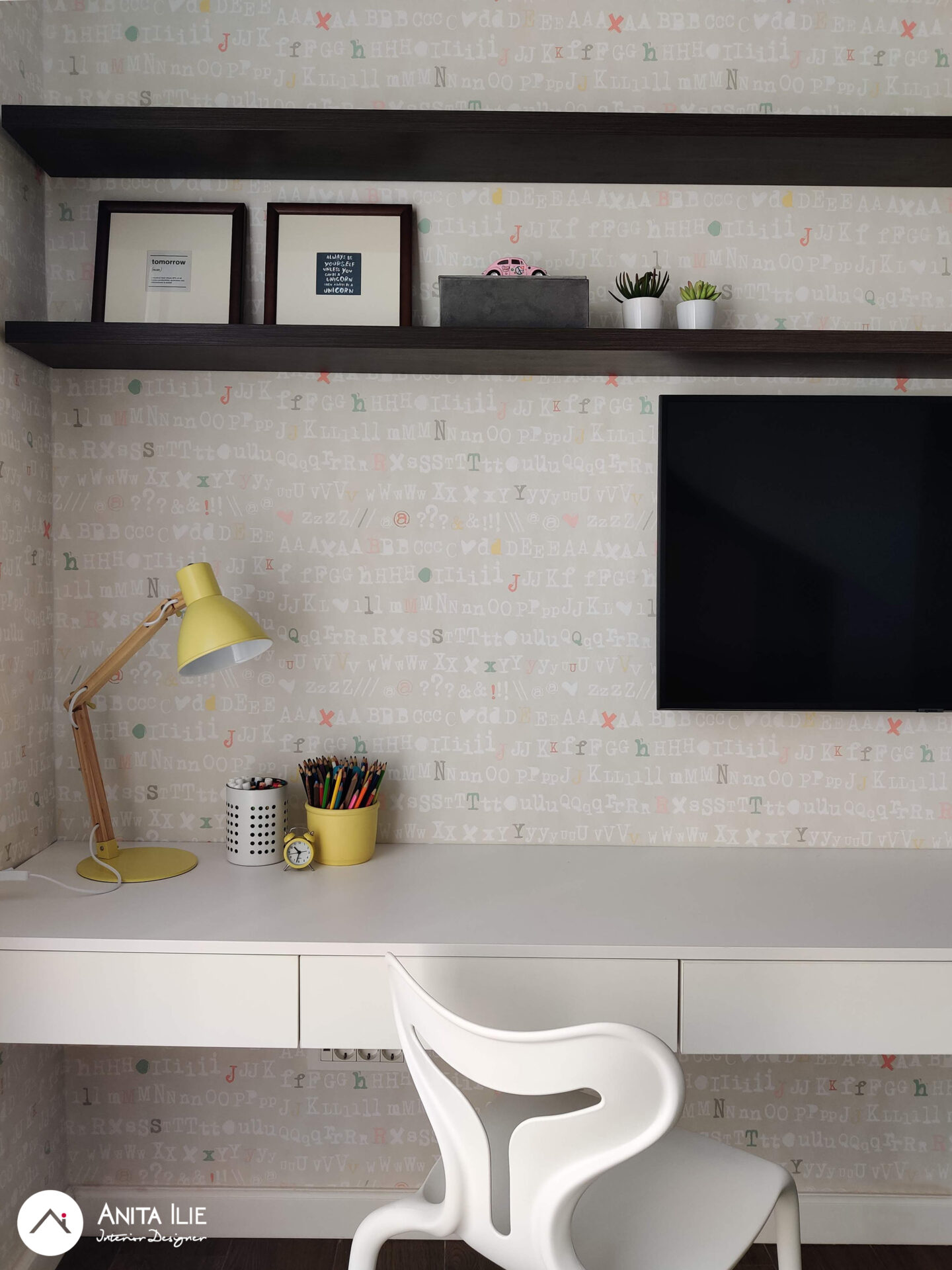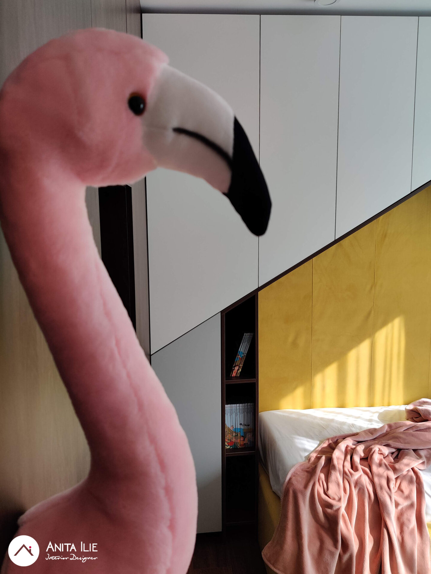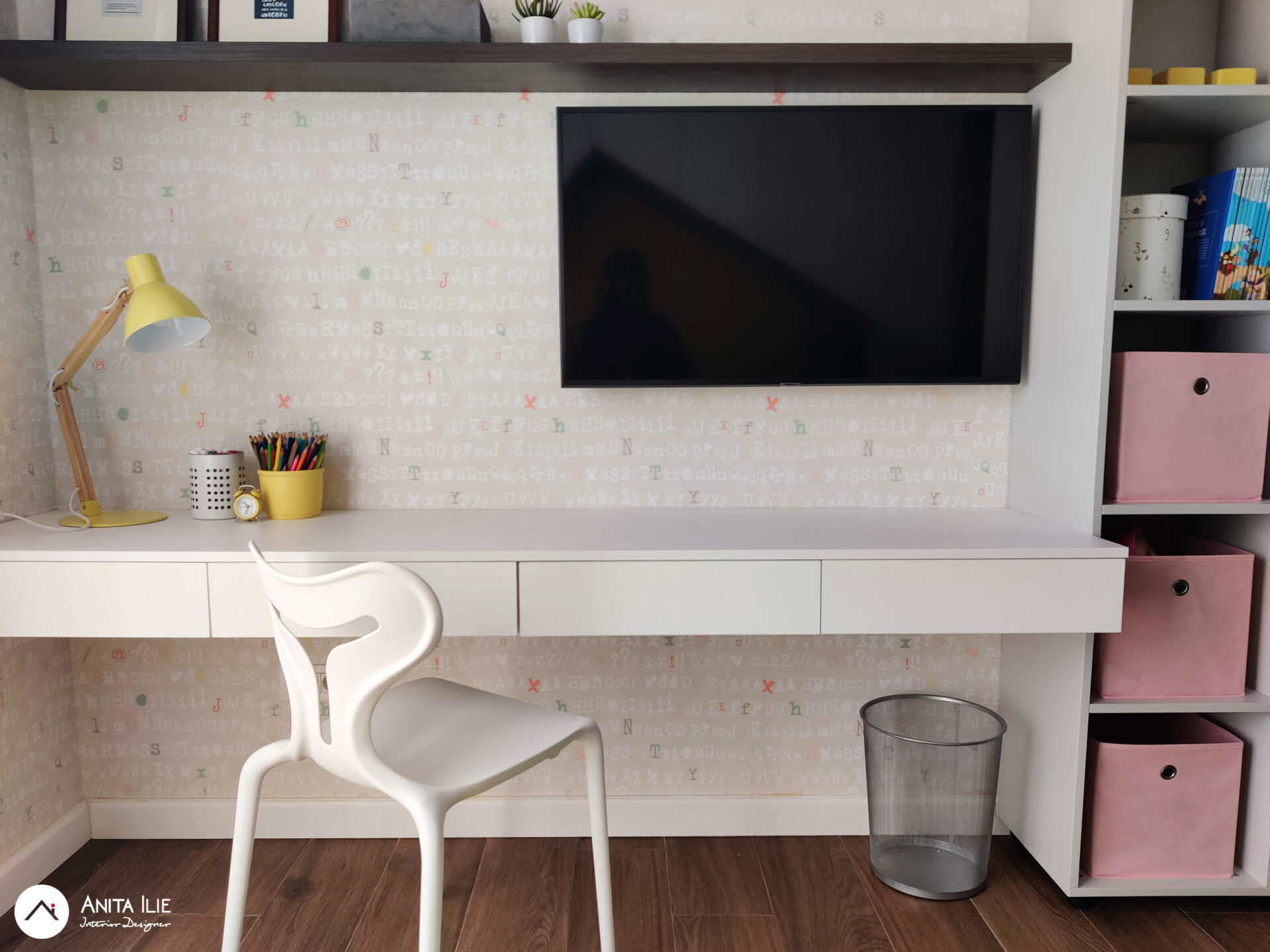 Tapetul folosit ca accent, devine aici elementul care leagă toată amenajarea, punctul de pornire a amenajării, în el regasindu-se toată paleta de culori. Patul cu tăblia în formă de căsuță a fost tapițat cu o nuanță luminoasă și veselă de galben, iar în jurul lui, urmând forma, am creat spatiu de depozitare pentru îmbrăcăminte. Patul dispune de o saltea extractibila pentru copii în cazul unei vizite. Biroul este amplasat pe peretele de vis-a-vis, creându-se între acestea un culoar de circulație și loc de joacă. Biroul este amplasat pe perete, fără picioare, lăsând senzația de aserisit, sub el rămânând un spațiu foarte potrivit pentru joacă. În dreapta lui găsim rafturile cu cutii de depozitare pentru jucării și dulapul care pe viitor va “găzdui” caiete și cărți de școală. Deasupra biroului stau rafturile pentru cărți (realizate cu același tip de finisaj ca și peretele despărțitor de la intrare) și un ceas în forma de căsuță ce mimează forma tăbliei patului. Peretele maro cu ușa creează un background perfect pentru toate afișele, desenele, orarele cu care Lea își va exprima personalitatea, funcționând ca o tabela de afișaj. Zona de joacă se conturează între cei doi pereți cu mobilier și este subliniată de covorul rotund în culoare verde mentă. Spor la joacă!