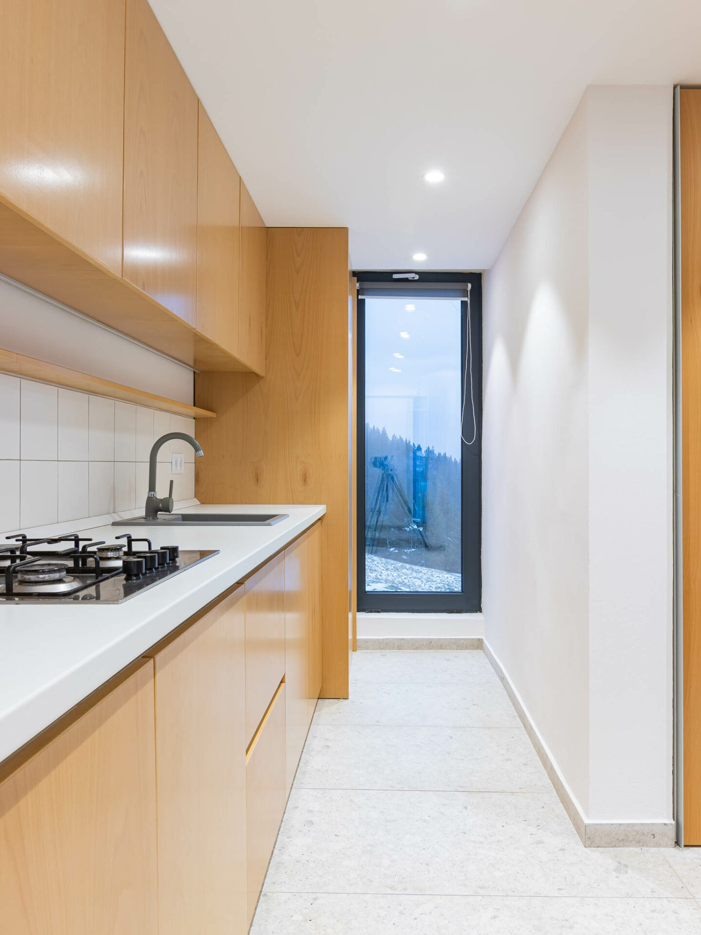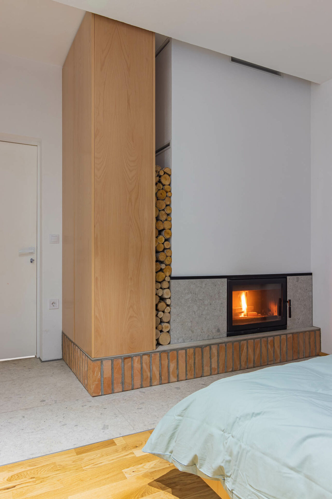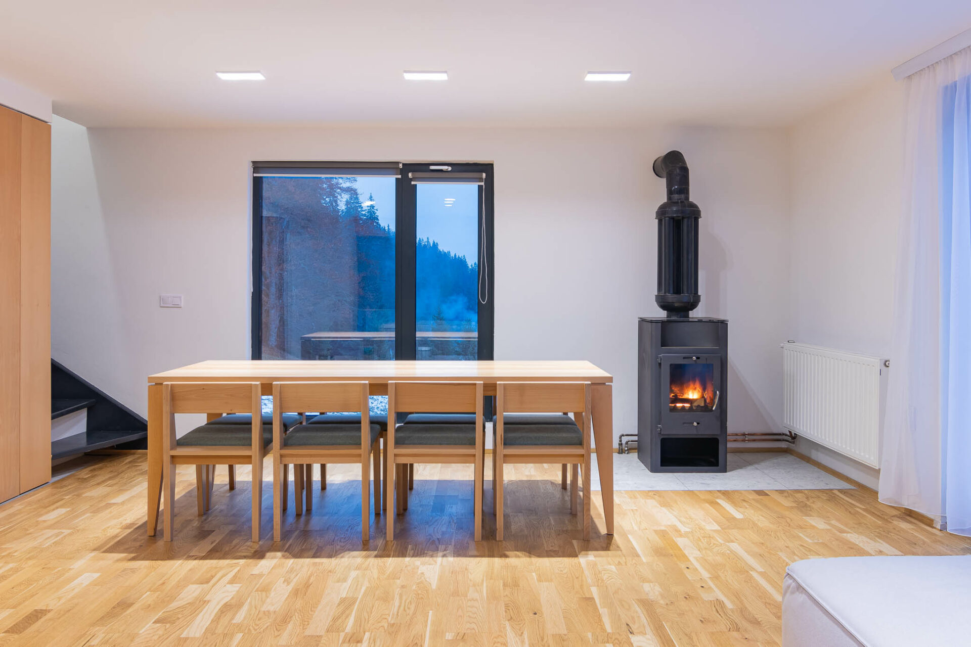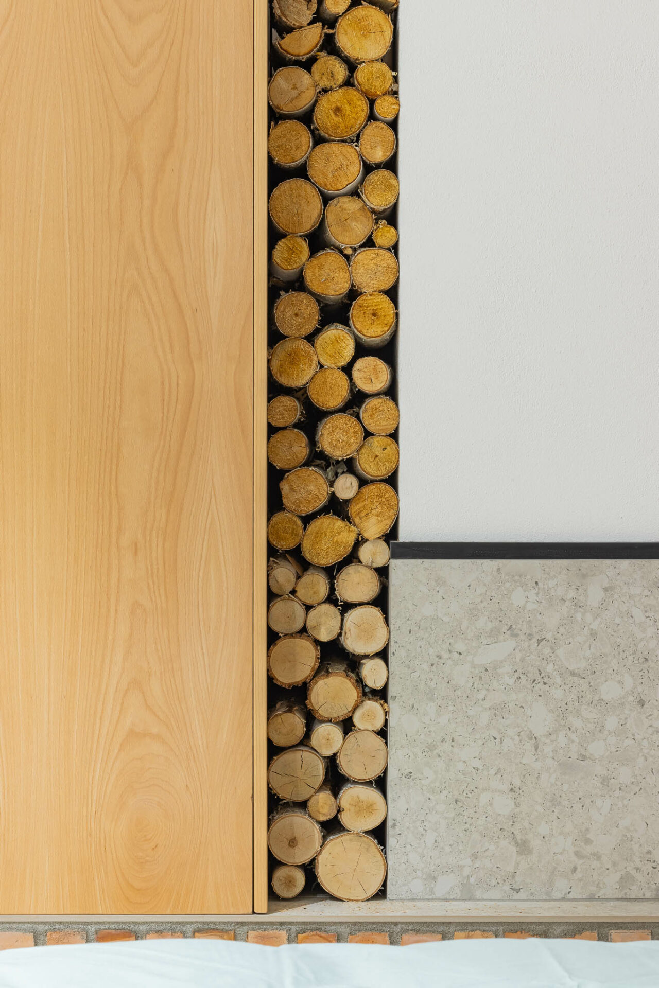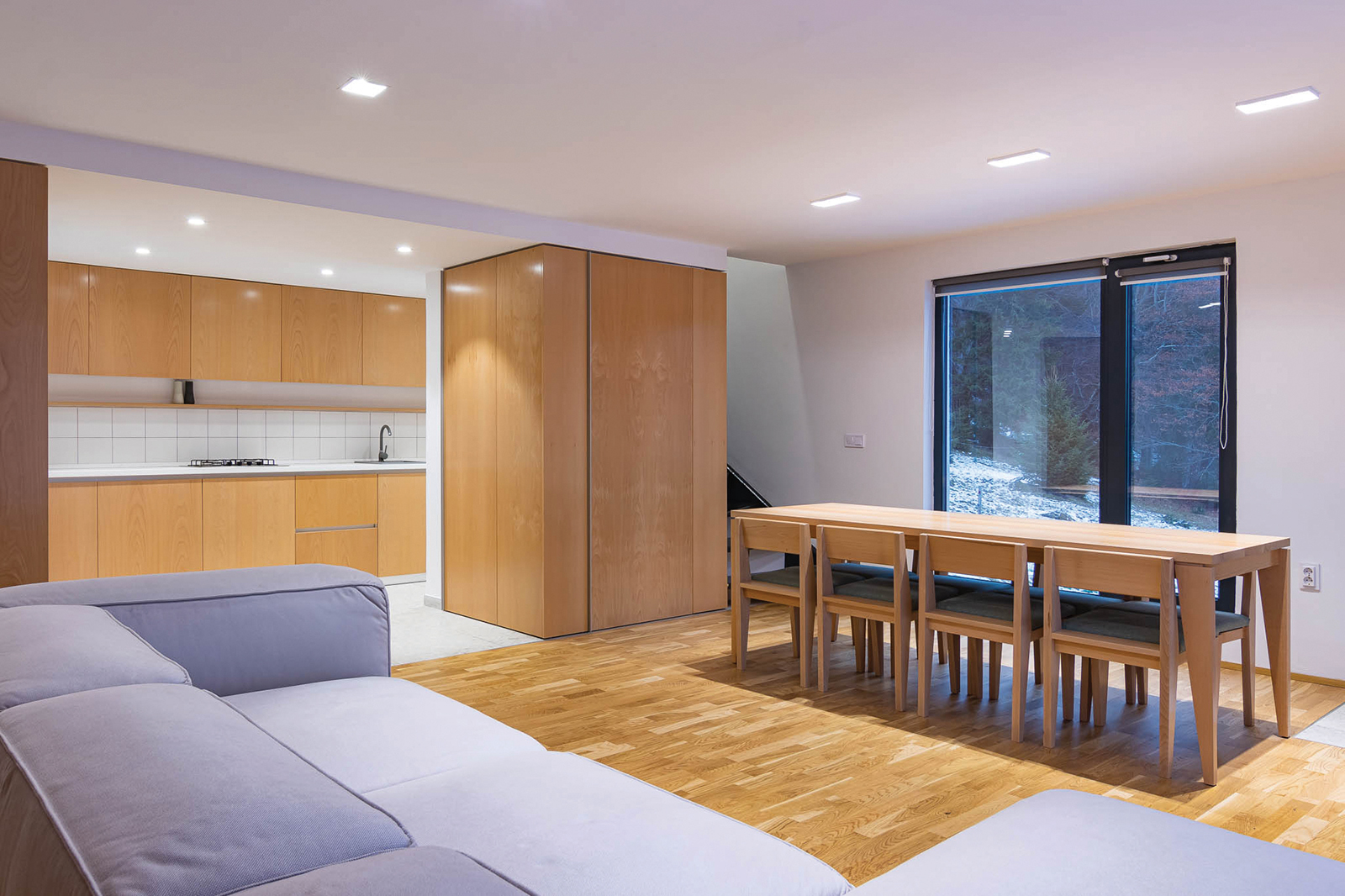 Unul dintre punctele tari ale amenajării a fost relația cu peisajele din exterior. Extinderea a fost gândită astfel încât casa să fie orientată către valea din apropiere. De asemenea, lemnul de fag a fost folosit ca textură principală alături de alb, câteva accente de verde și textura de caramidă aparentă.