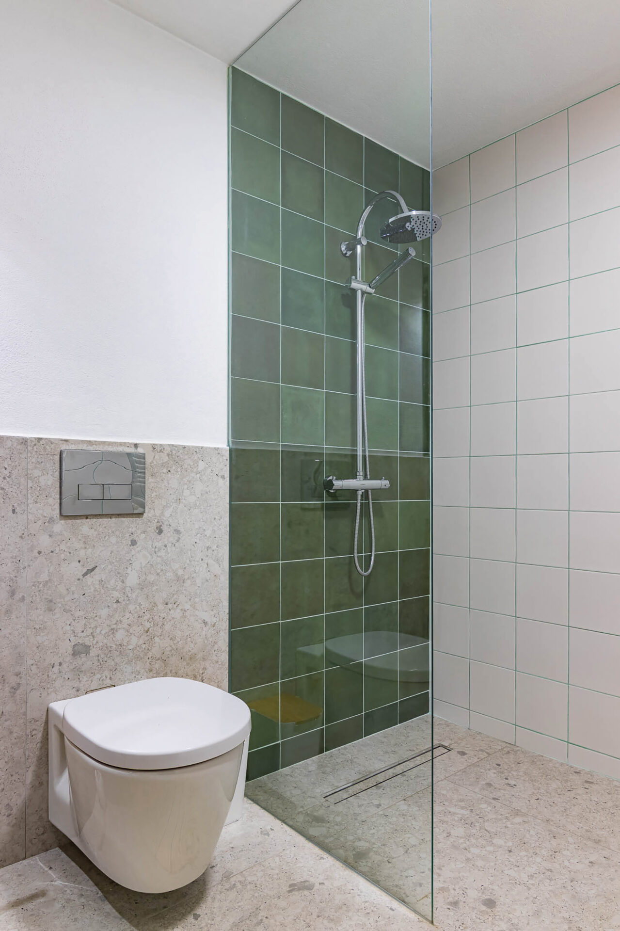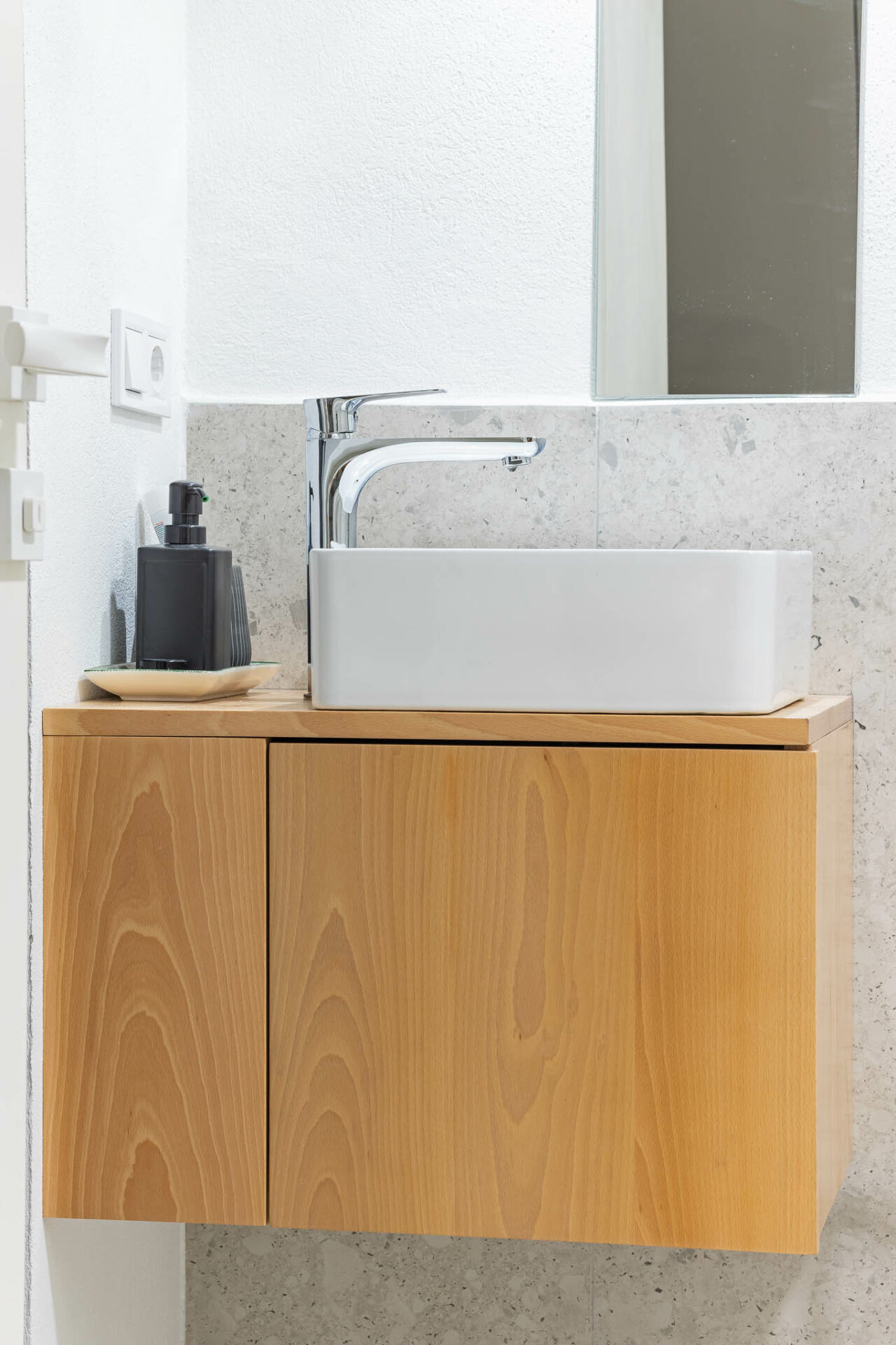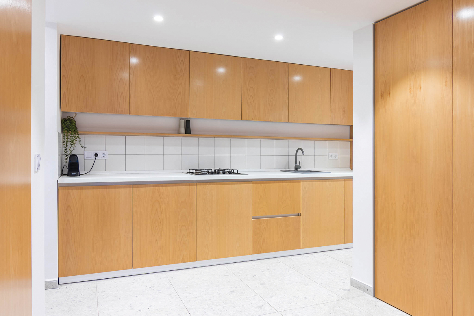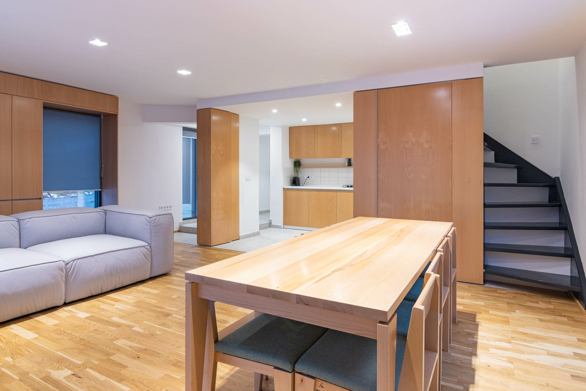 Toate încăperile au fost tratate unitar. Inițial, singura modificare prevăzută în proiect era extinderea construcției, însă între timp s-a hotărât renovarea integrală a casei existente, alături de o serie de alte modificări: recompartimentarea bucătăriei, mutarea băii în locul depozitării, reorganizată pentru o exploatare mai bună a spațiului sub scară. La etaj am intervenit aspura dormitorului mare în urma schimbărilor de fațadă, restul spațiilor fiind într-o stare bună.