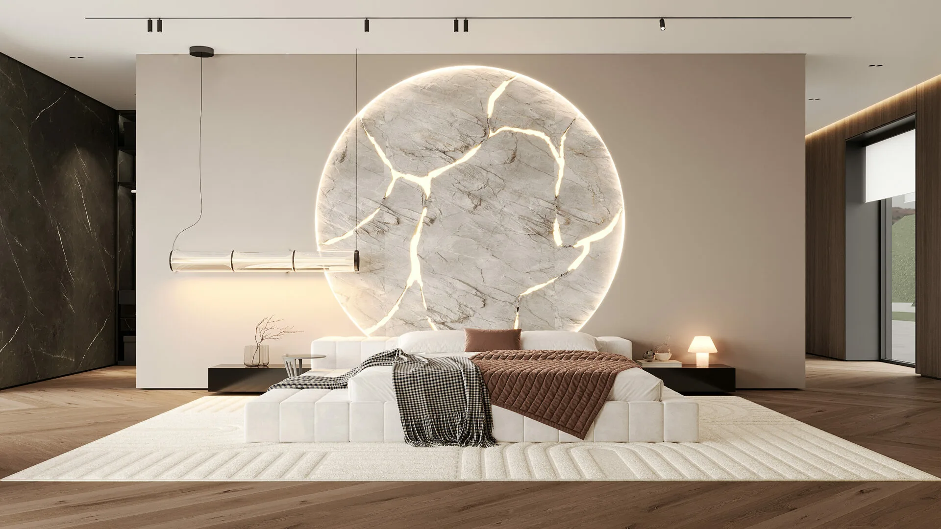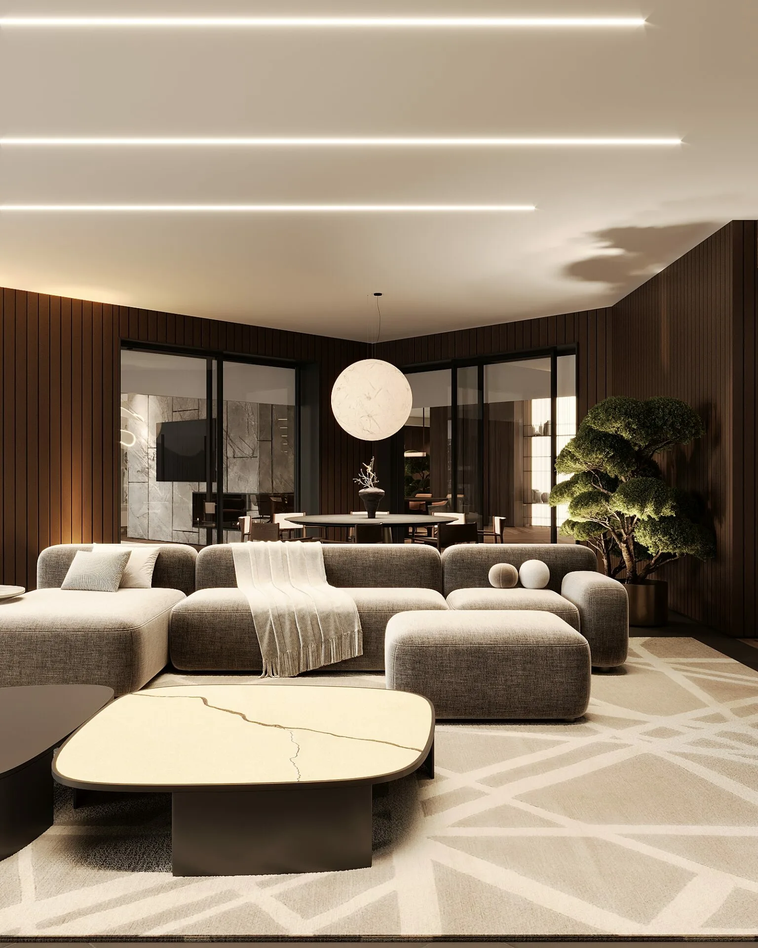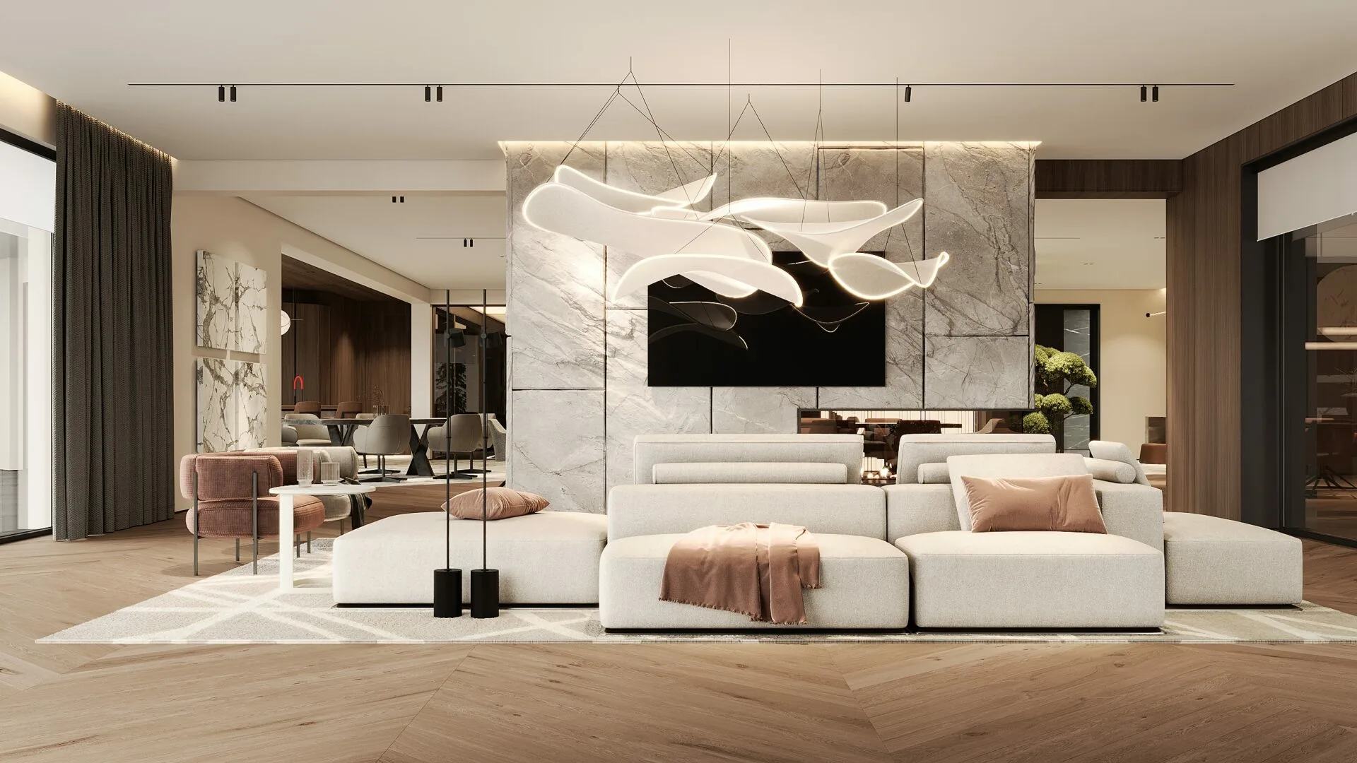 Proiectul, aflat în stadiu de execuție, reflectă viziunea mea asupra unui stil de viață modern, în care materialele naturale și lumina joacă roluri esențiale. Am mizat pe o paletă caldă, dominată de lemn natural, piatră și texturi fine, pentru a crea o atmosferă primitoare, dar sofisticată. Zona de zi este gândită ca un open-space generos, unde livingul, diningul și bucătăria comunică fluid, având ca punct central un perete sculptural din piatră, accentuat de iluminat ambiental. Corpurile de iluminat devin elemente artistice, completând identitatea spațiului.