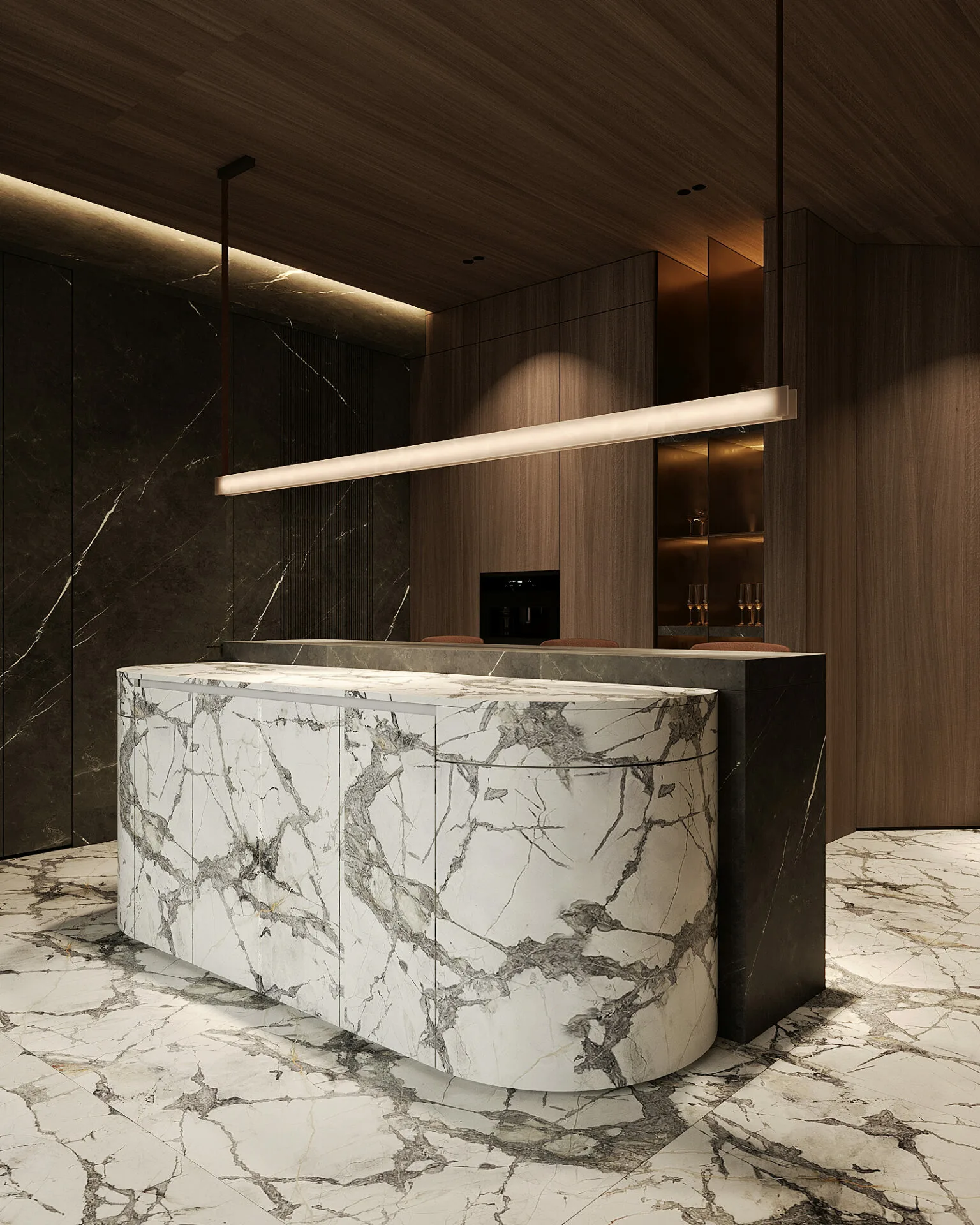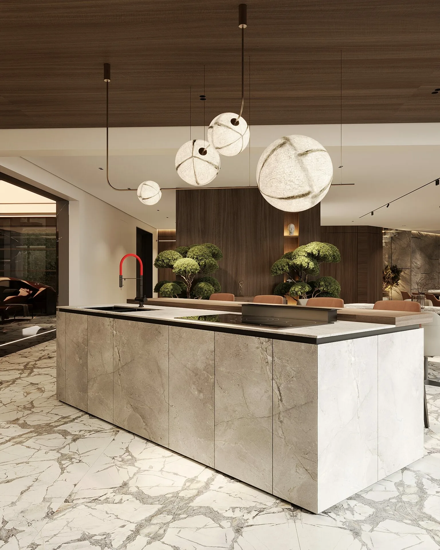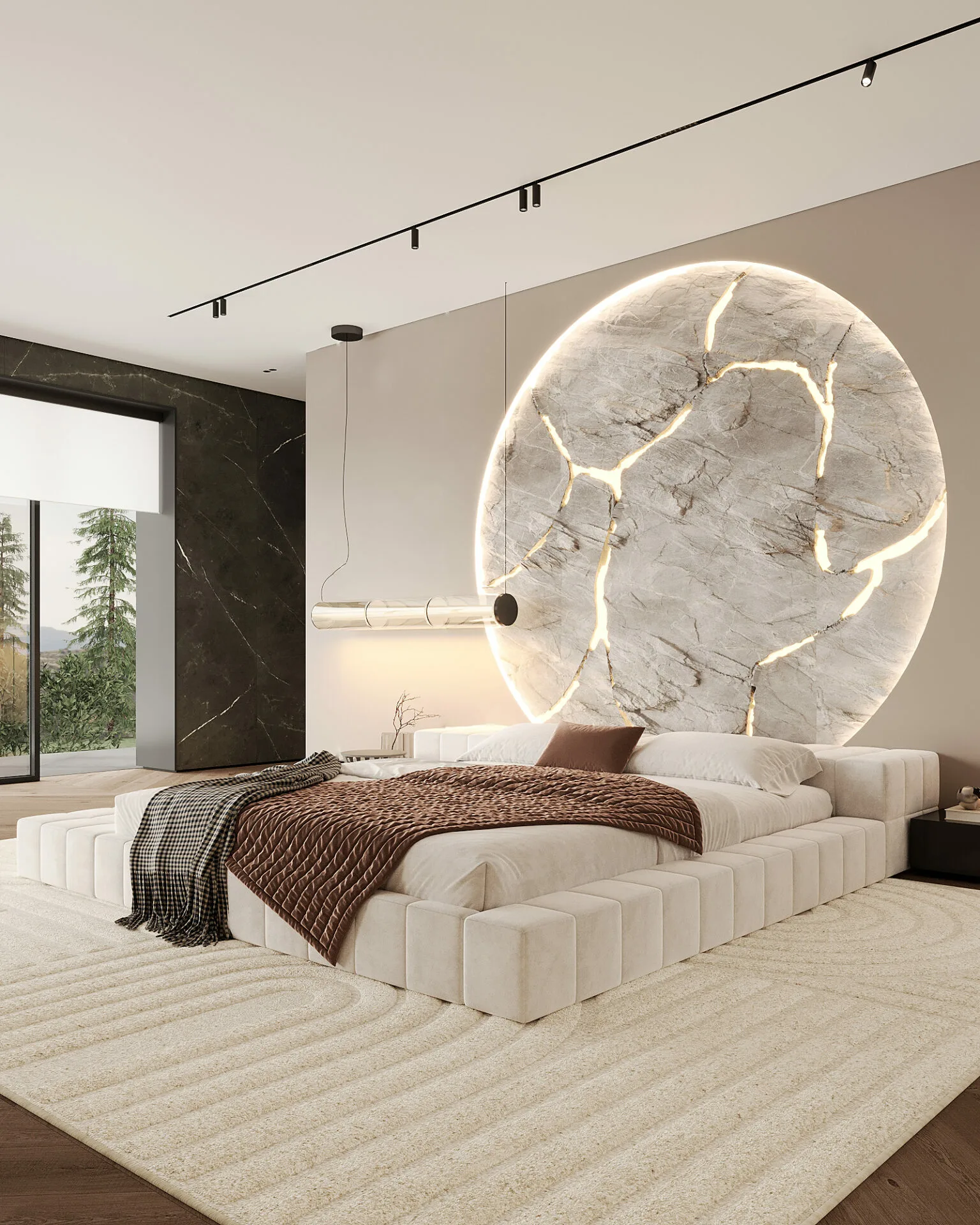 Proiectul, aflat în stadiu de execuție, reflectă viziunea mea asupra unui stil de viață modern, în care materialele naturale și lumina joacă roluri esențiale. Am mizat pe o paletă caldă, dominată de lemn natural, piatră și texturi fine, pentru a crea o atmosferă primitoare, dar sofisticată. Zona de zi este gândită ca un open-space generos, unde livingul, diningul și bucătăria comunică fluid, având ca punct central un perete sculptural din piatră, accentuat de iluminat ambiental. Corpurile de iluminat devin elemente artistice, completând identitatea spațiului.