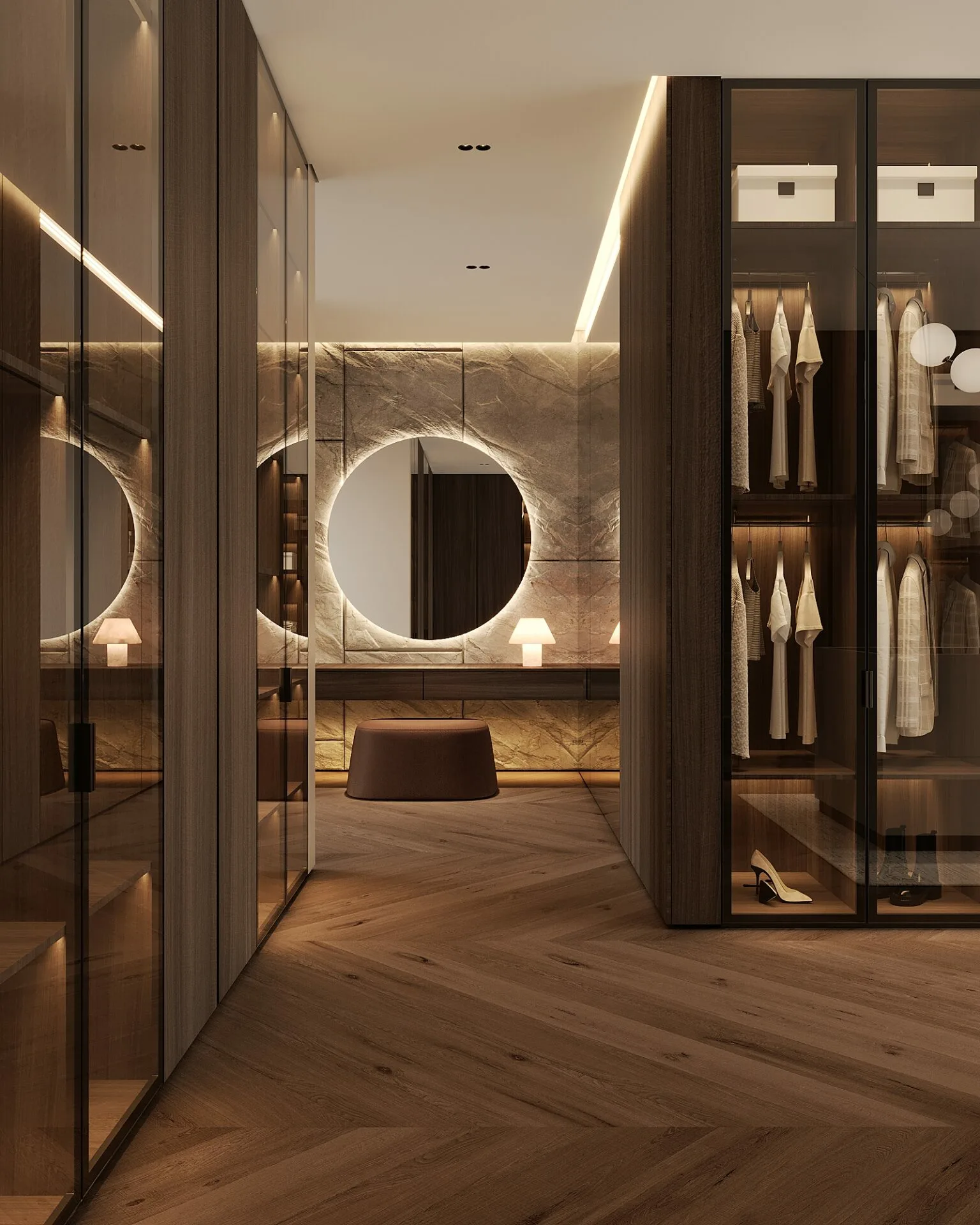 Dormitoarele sunt tratate ca refugii personale, unde liniile simple și materialele premium creează o stare de relaxare profundă. Dressingul walk-in și băile sunt proiectate cu aceeași atenție la detalii, punând accent pe funcționalitate și estetică. Un element aparte îl reprezintă garajul, integrat în conceptul general, tratat ca un spațiu de expunere, nu doar utilitar. De asemenea, casa scării devine o piesă de design, combinând piatra naturală cu lumina pentru un efect spectaculos. Acest proiect este, pentru mine, o expresie a rafinamentului contemporan, unde fiecare spațiu spune o poveste și contribuie la un stil de viață echilibrat și exclusivist.