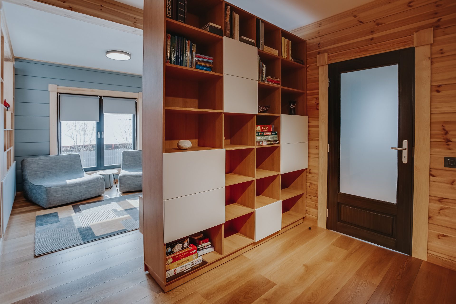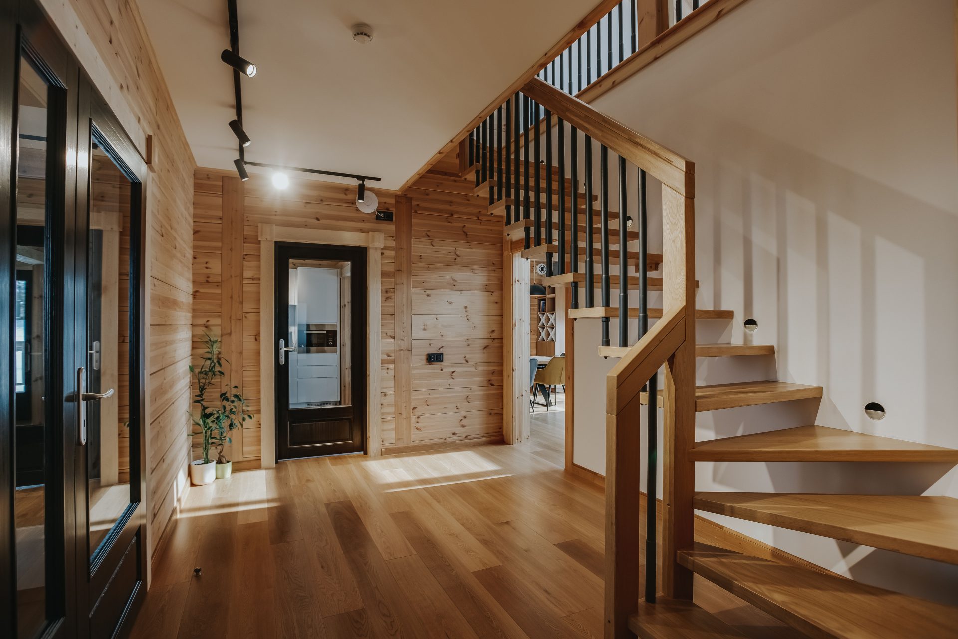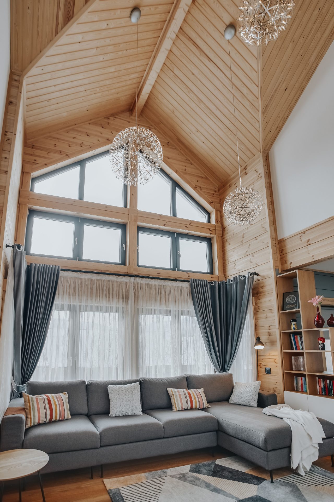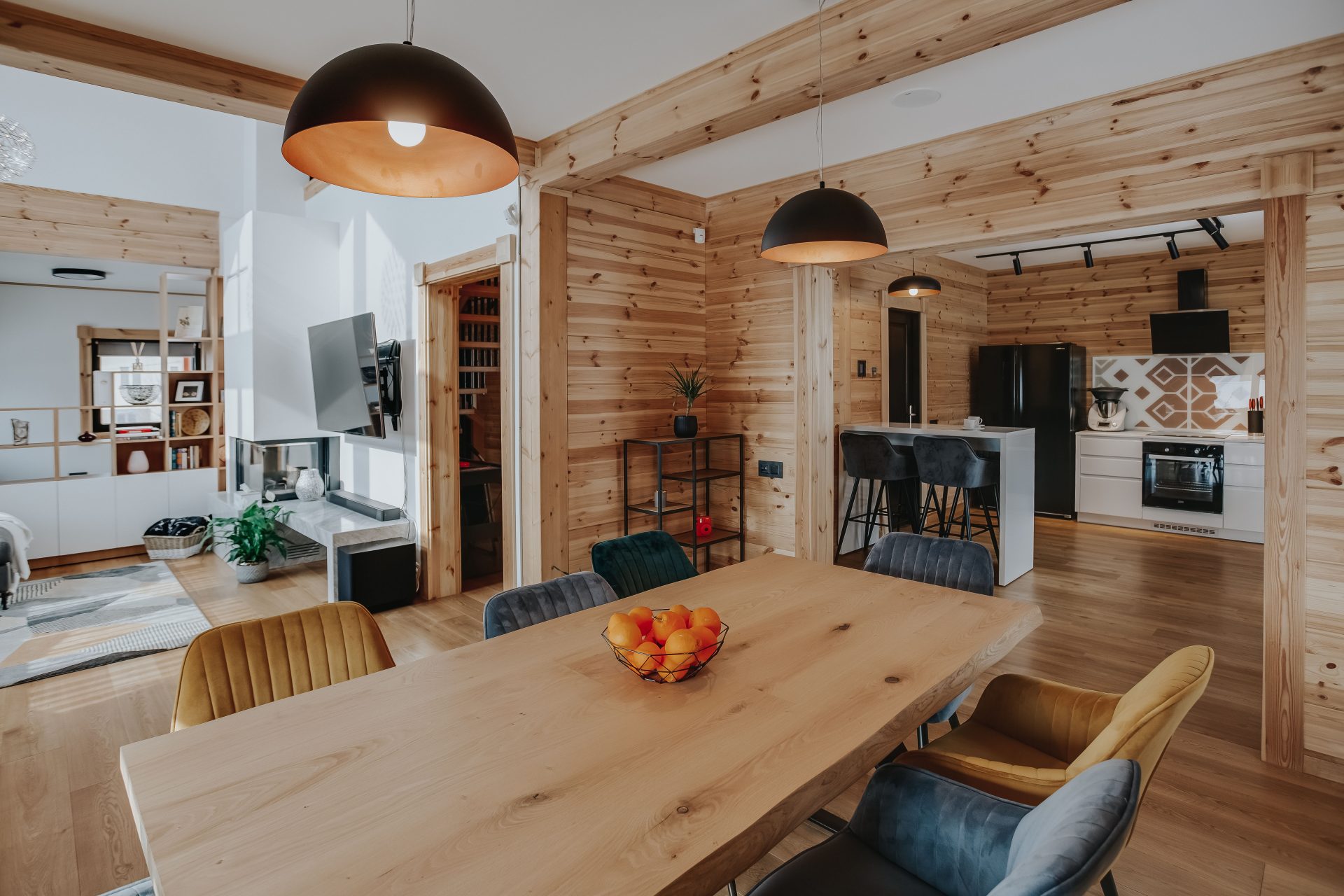 Amprenta in amenajarea casei este chiar lemnul, folosit în abundență, atât pentru placarea pereților, cât și pentru finisajul pardoselii, piese de mobilier și decorațiuni. Conceptul propus este de casa de familie cu un design contemporan. Aerul rustic al lemnului brut este modernizat prin liniile drepte și finisajele lucioase ale câtorva piese de mobilier, plăcile ceramice colorate sau cu aspect de ciment și tapițeriile de catifea și bumbac.
