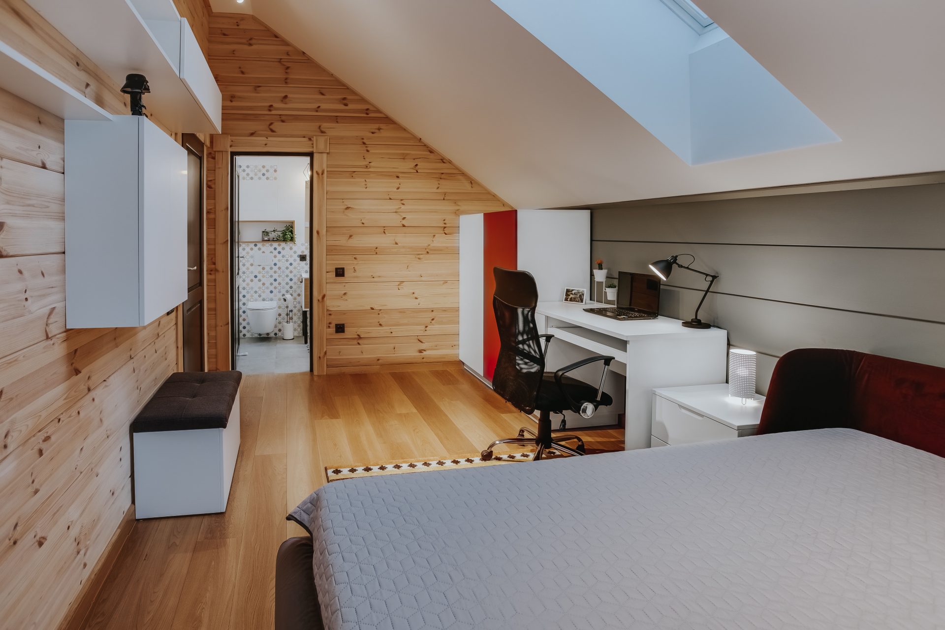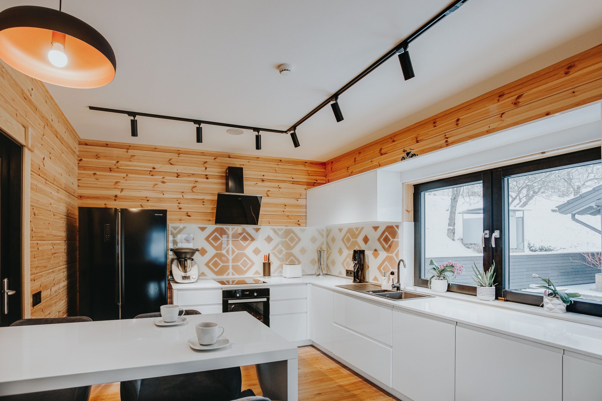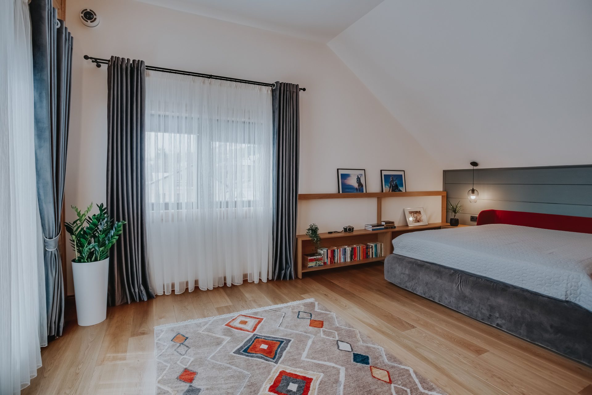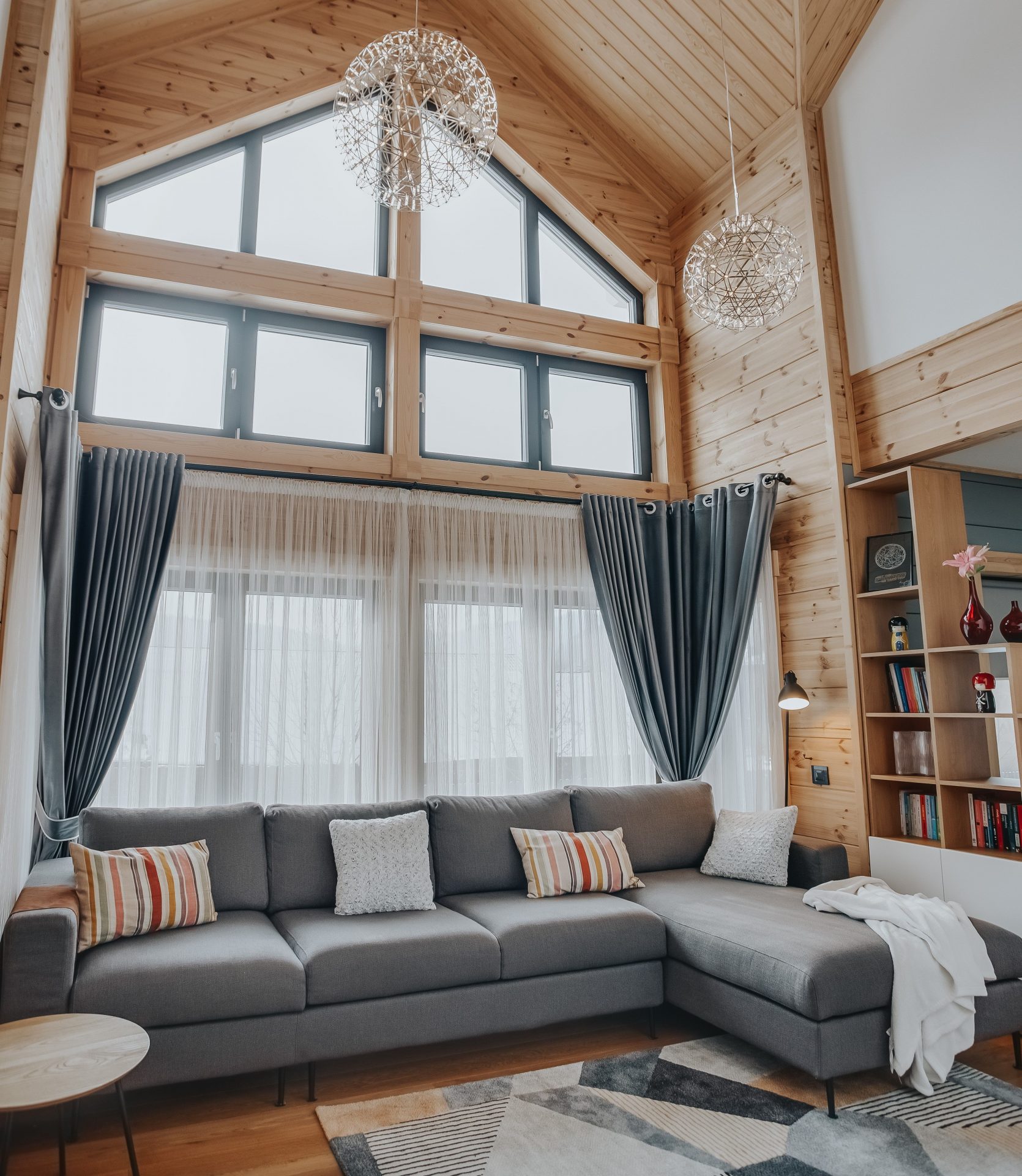 Amprenta in amenajarea casei este chiar lemnul, folosit în abundență, atât pentru placarea pereților, cât și pentru finisajul pardoselii, piese de mobilier și decorațiuni. Conceptul propus este de casa de familie cu un design contemporan. Aerul rustic al lemnului brut este modernizat prin liniile drepte și finisajele lucioase ale câtorva piese de mobilier, plăcile ceramice colorate sau cu aspect de ciment și tapițeriile de catifea și bumbac.