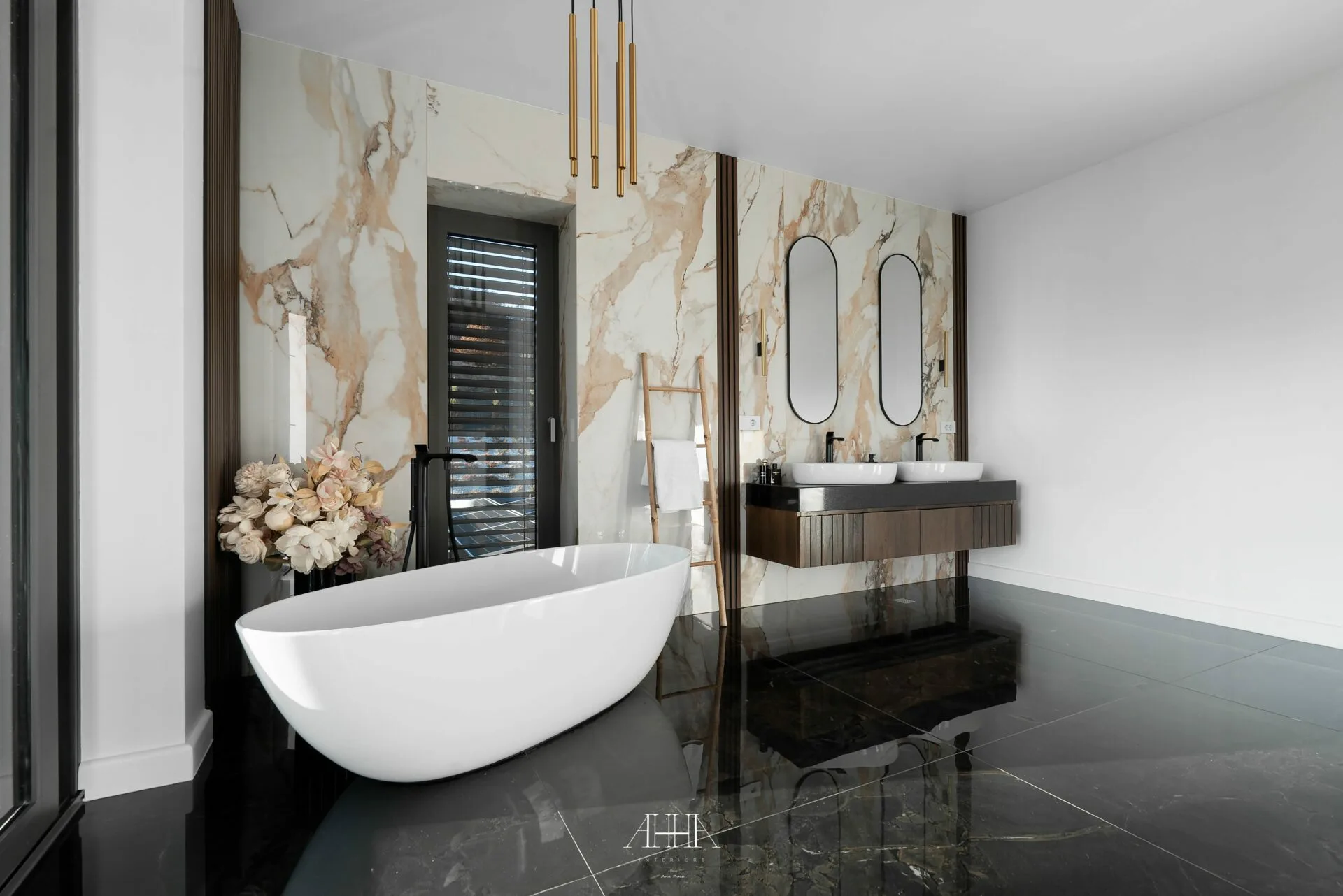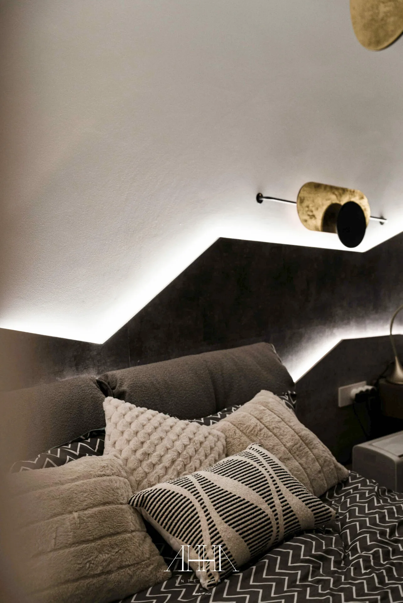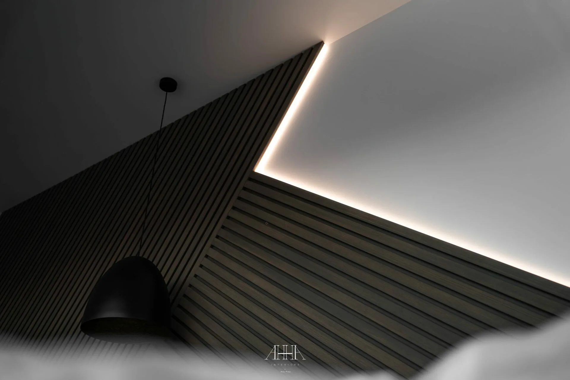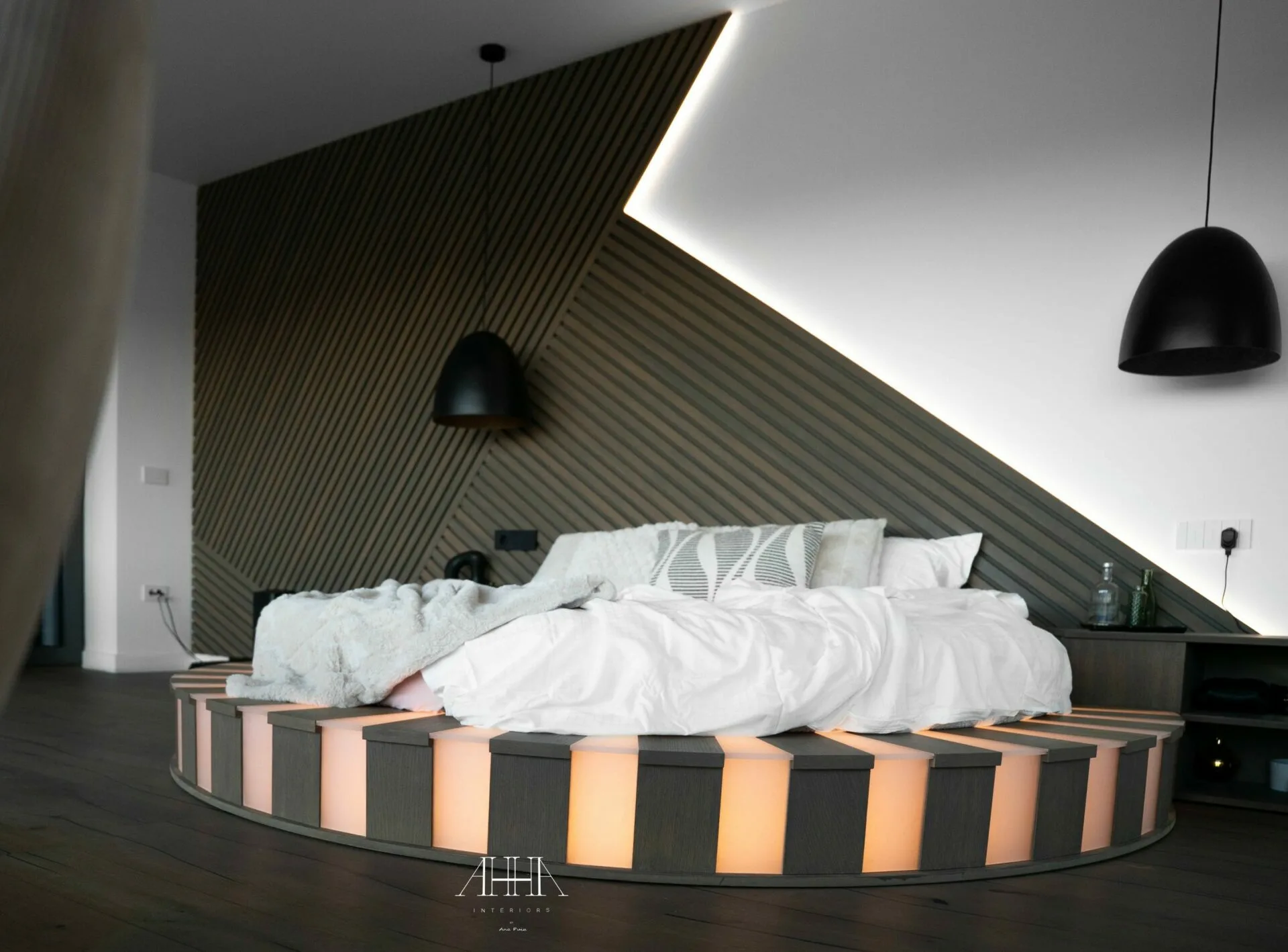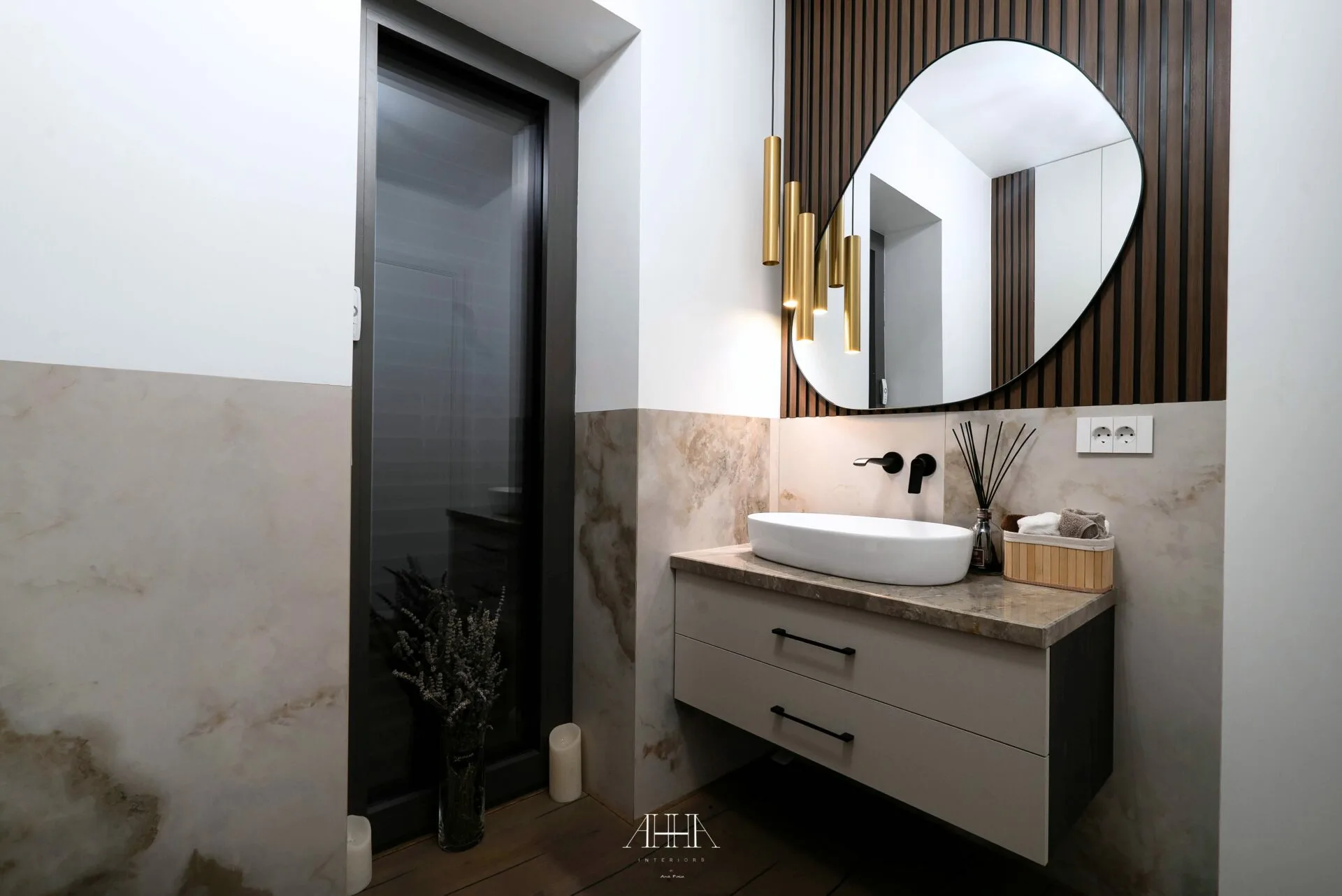 Scara interioară este tratată ca un element arhitectural de impact, cu trepte din lemn natural, balustrade din sticlă și iluminat integrat, asigurând continuitate vizuală între niveluri. Dormitorul matrimonial propune o atmosferă intimă și sofisticată, accentuată de un perete decorativ cu geometrie neregulată, iluminat indirect și obiecte decorative cu finisaje metalice. Băile continuă limbajul contemporan prin mobilier realizat la comandă, finisaje inspirate din natură și obiecte sanitare cu forme fluide. Întregul proiect reflectă o abordare atent controlată, unde luxul este exprimat prin detaliu, materiale și coerență, iar formele neconvenționale adaugă personalitate fiecărui spațiu.