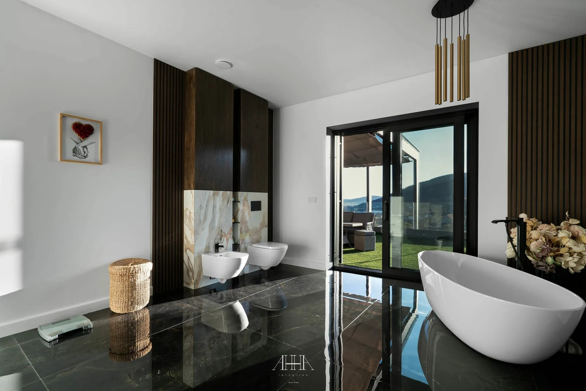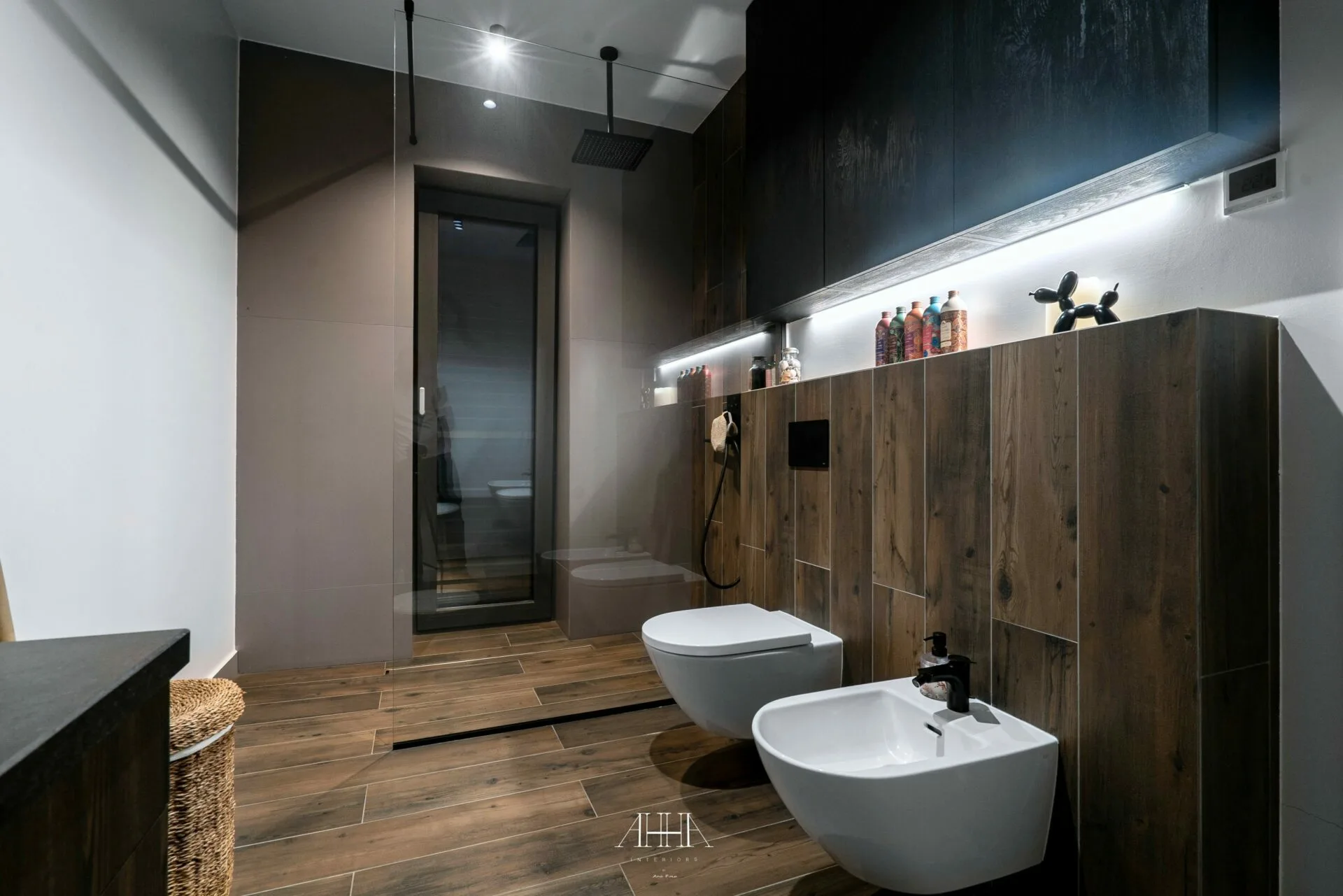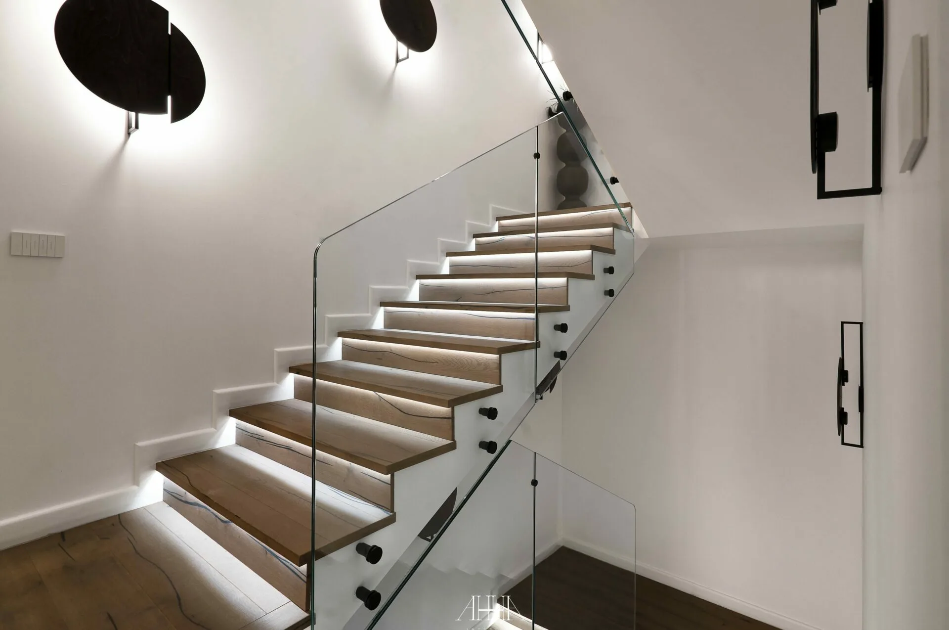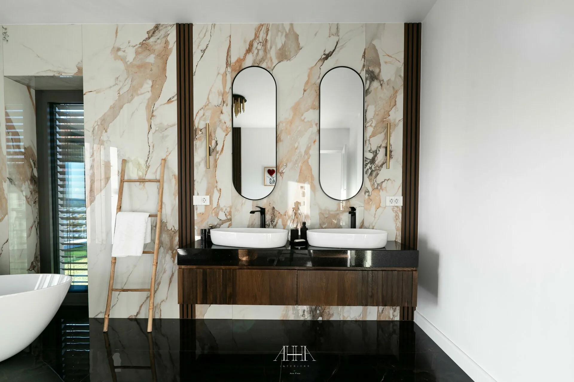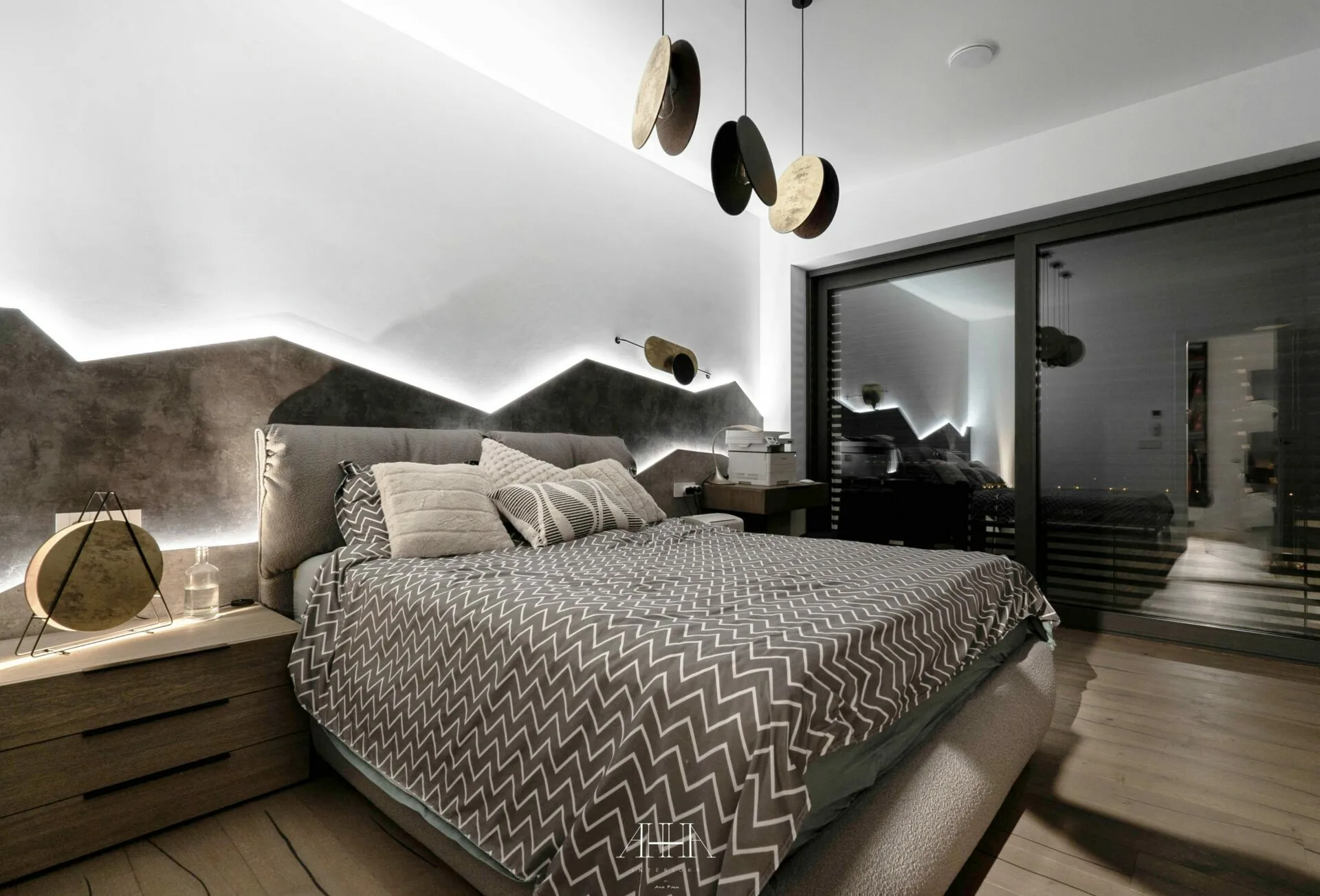Scara interioară este tratată ca un element arhitectural de impact, cu trepte din lemn natural, balustrade din sticlă și iluminat integrat, asigurând continuitate vizuală între niveluri. Dormitorul matrimonial propune o atmosferă intimă și sofisticată, accentuată de un perete decorativ cu geometrie neregulată, iluminat indirect și obiecte decorative cu finisaje metalice. Băile continuă limbajul contemporan prin mobilier realizat la comandă, finisaje inspirate din natură și obiecte sanitare cu forme fluide. Întregul proiect reflectă o abordare atent controlată, unde luxul este exprimat prin detaliu, materiale și coerență, iar formele neconvenționale adaugă personalitate fiecărui spațiu.