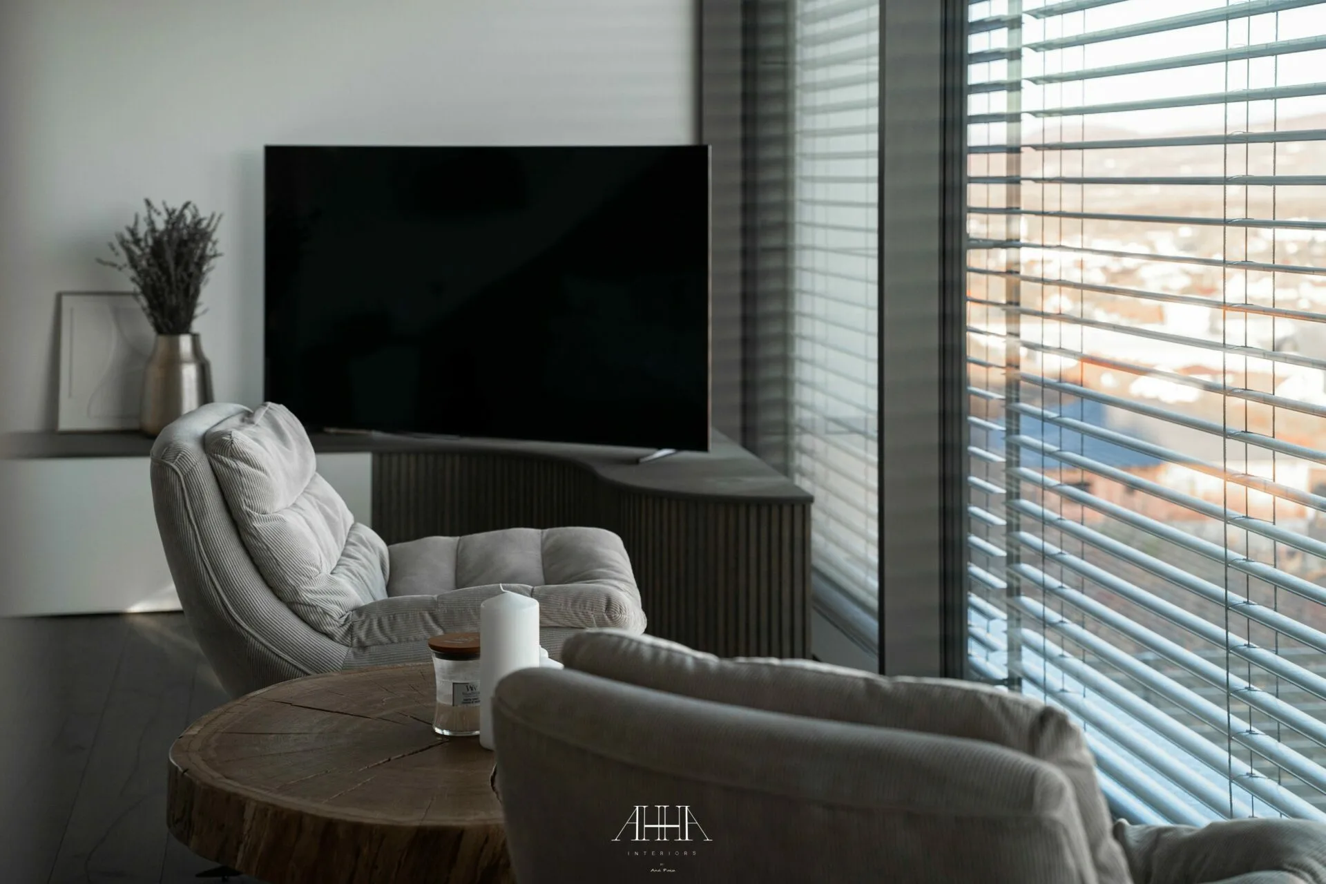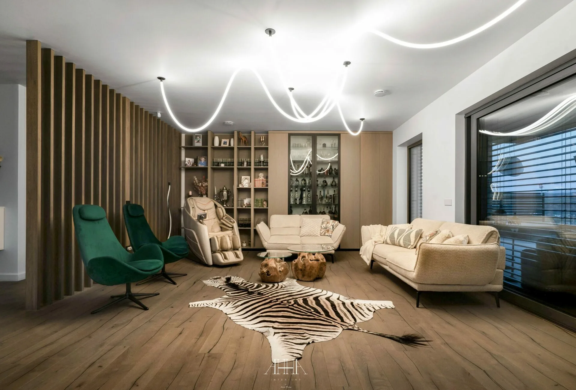 La interior, zona de living se desfășoară într-un spațiu amplu, unde mobilierul cu forme neconvenționale și texturi luxuriante creează contraste deliberate cu liniile riguroase ale arhitecturii.