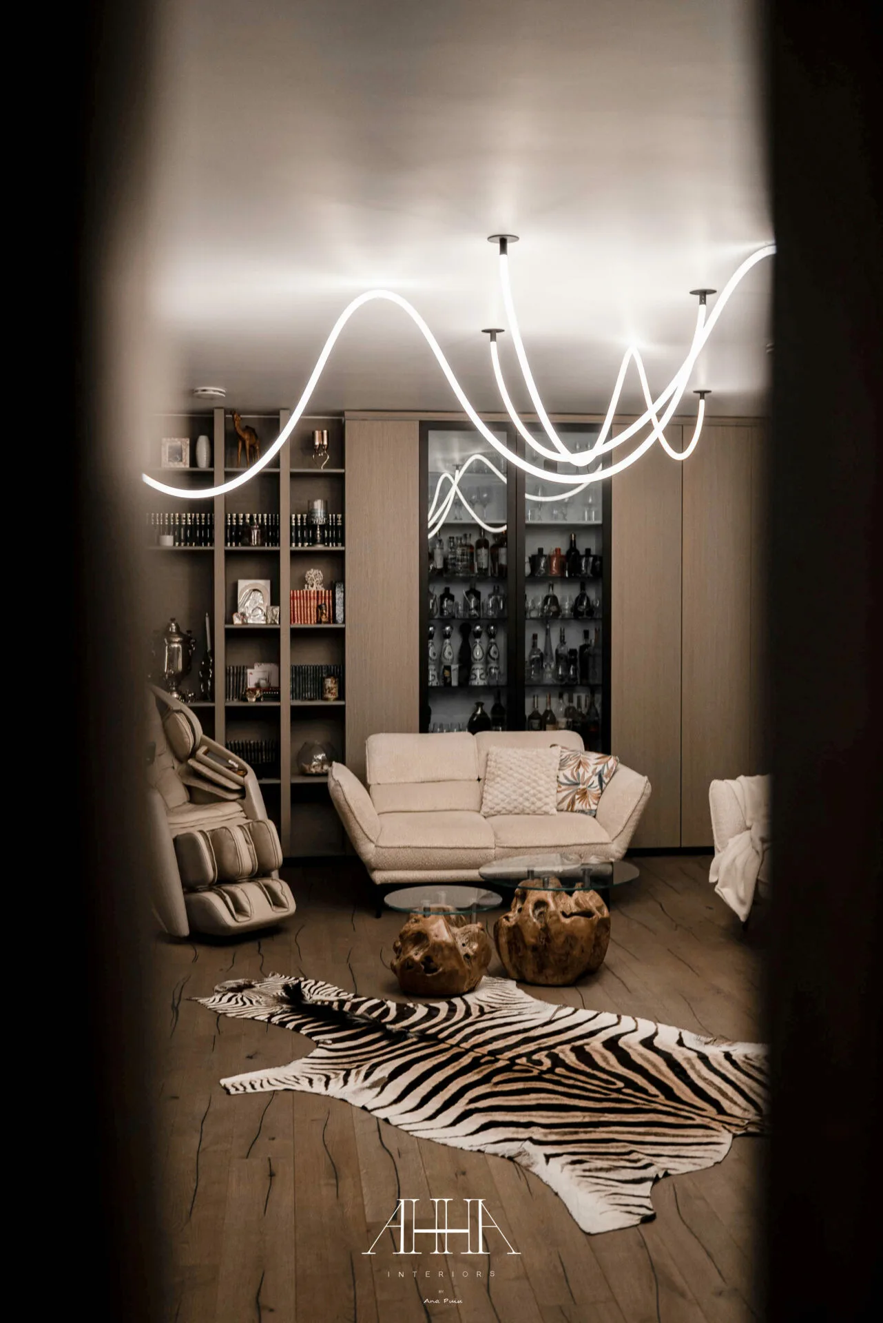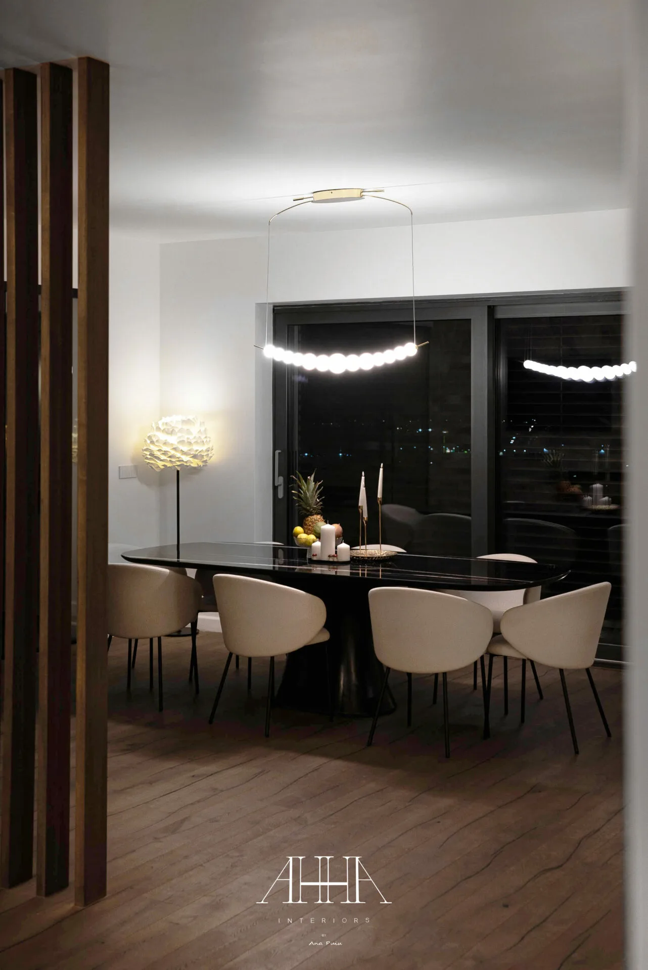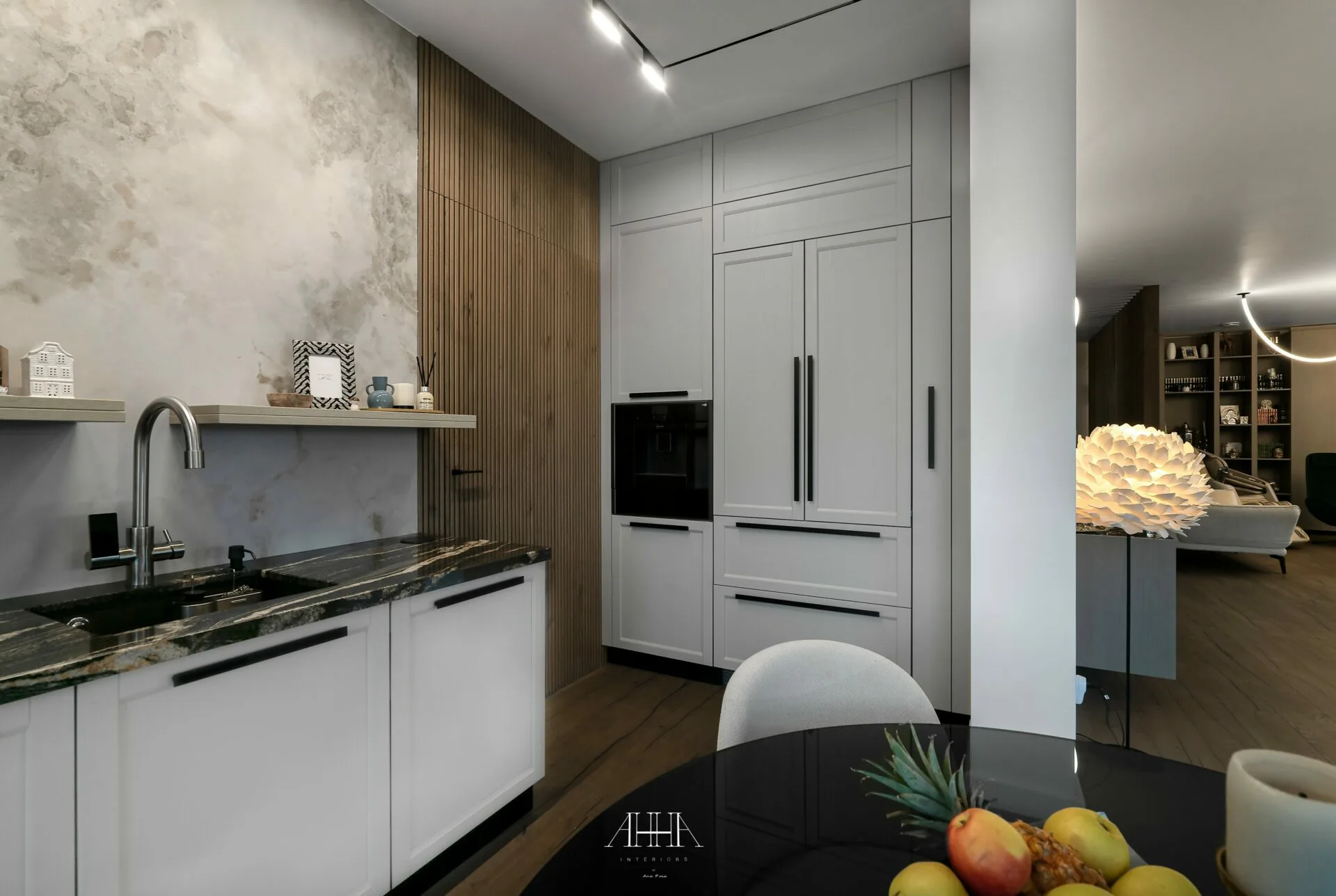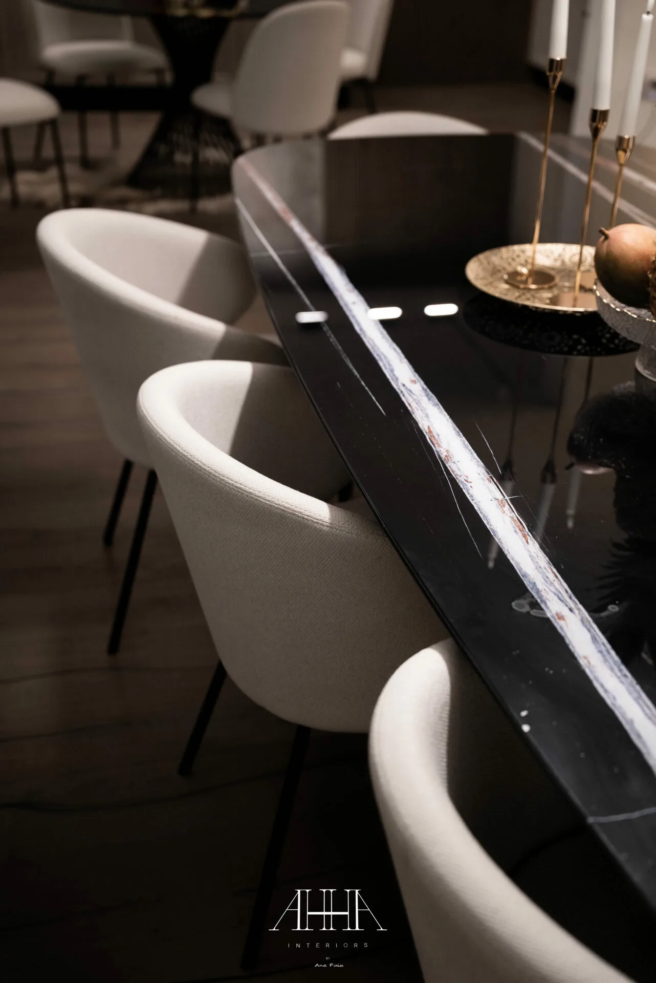 Corpurile de iluminat sculpturale devin elemente centrale de design, adăugând dinamism și identitate spațiului. Zona de dining completează compoziția prin finisaje lucioase, volume organice și accente metalice atent dozate.