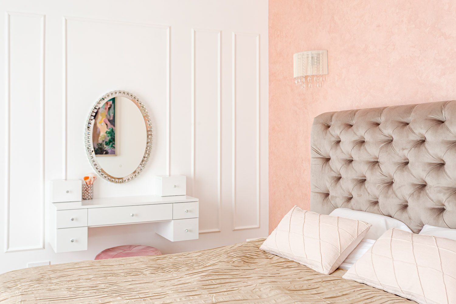 Amenajarea îmbina elemente de inspirație clasică cu accente moderne, în tonuri pudrate și neutre. Băile îmbină mozaicuri glam cu obiecte sanitare contemporane cu linii subțiri. Pentru băile fără lumină naturală, lumina artificială poate influența finisajele, astfel încât aceleași plăci să vibreze o cu totul altă atmosferă în diferitele tonuri de lumină.
