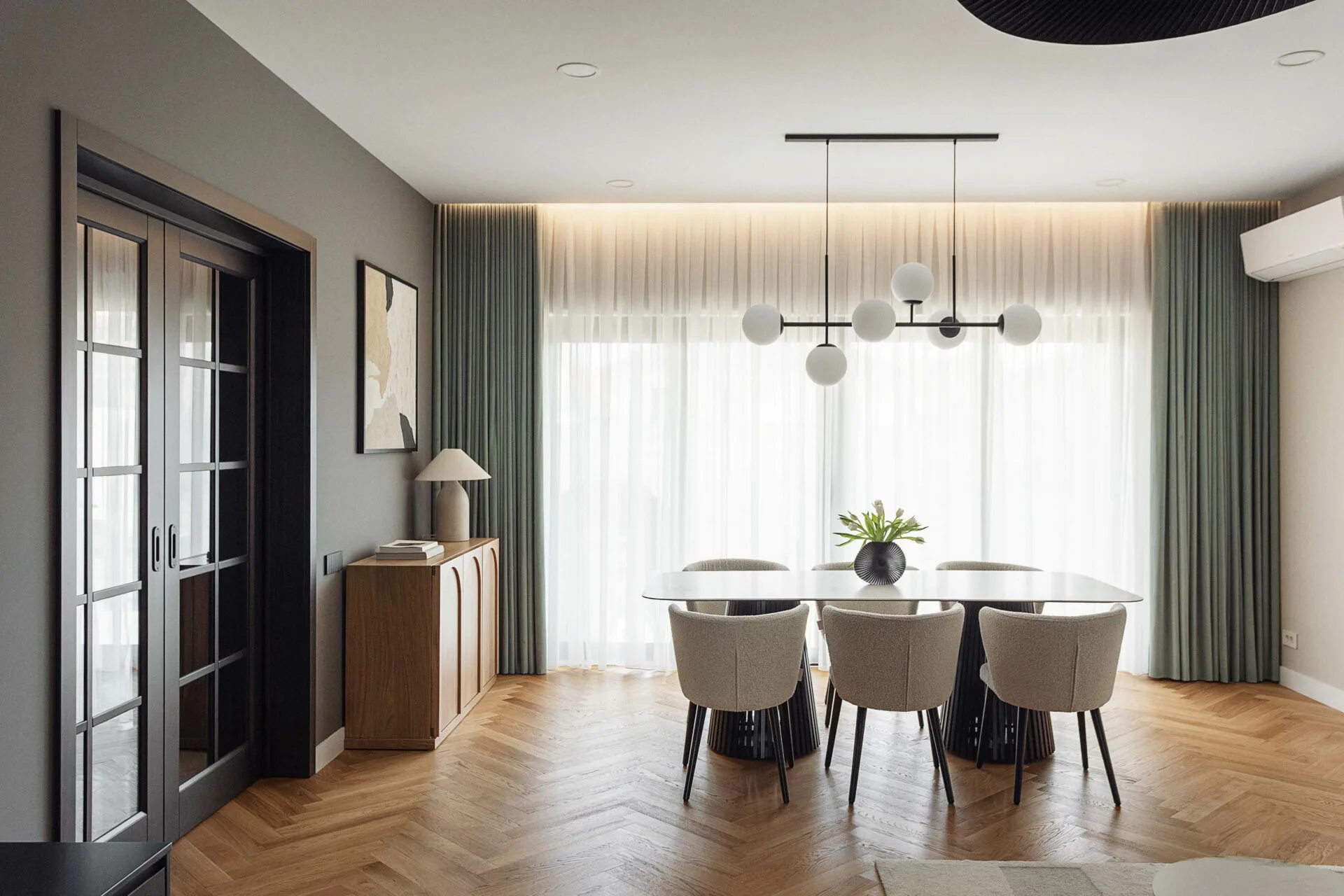 Acestea sunt puse în valoare prin inserții cromatice punctuale, precum bucătăria, unde am ales un verde salvie ușor închis și desaturat, menit să se diferențieze de zona de zi, fără a deveni dominant. Un alt exemplu este dormitorul matrimonial, unde patul din catifea albastru închis creează un contrast elegant cu pereții crem și parchetul cald din lemn. Parchetul din lemn stratificat, dispus în model herringbone, contribuie la încălzirea atmosferei în întreaga locuință, cu excepția bucătăriei și a băilor, unde, din considerente practice, am optat pentru pardoseli din plăci ceramice.