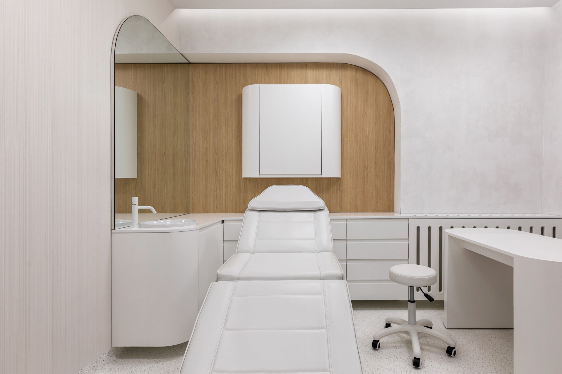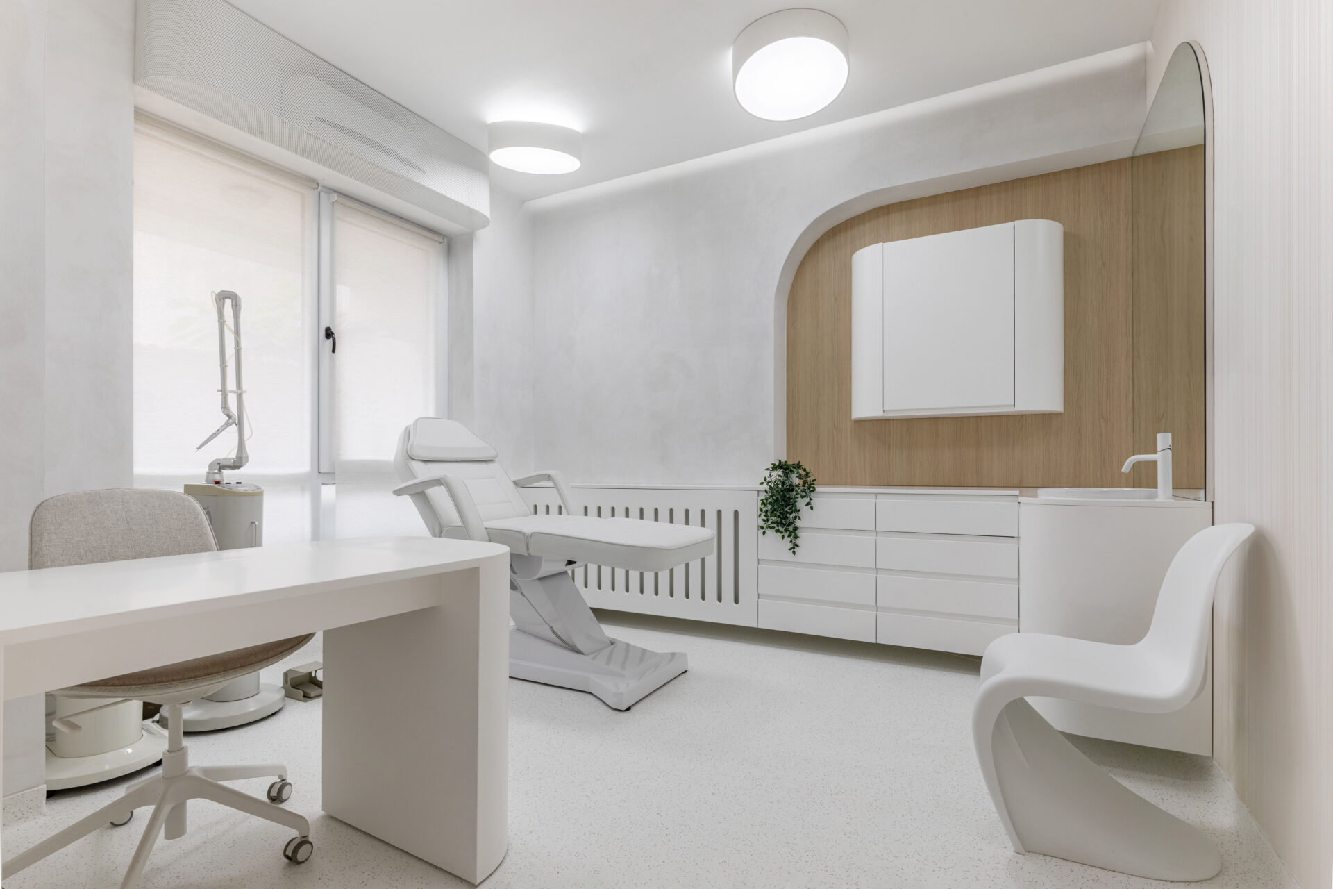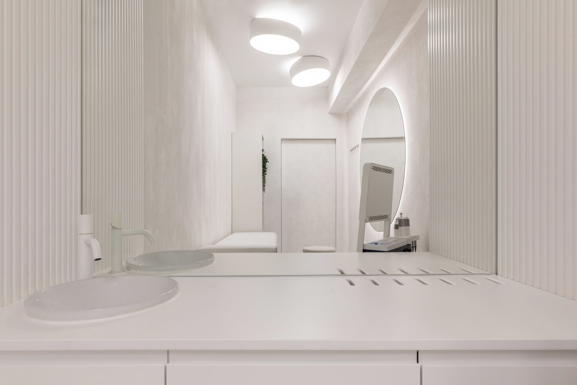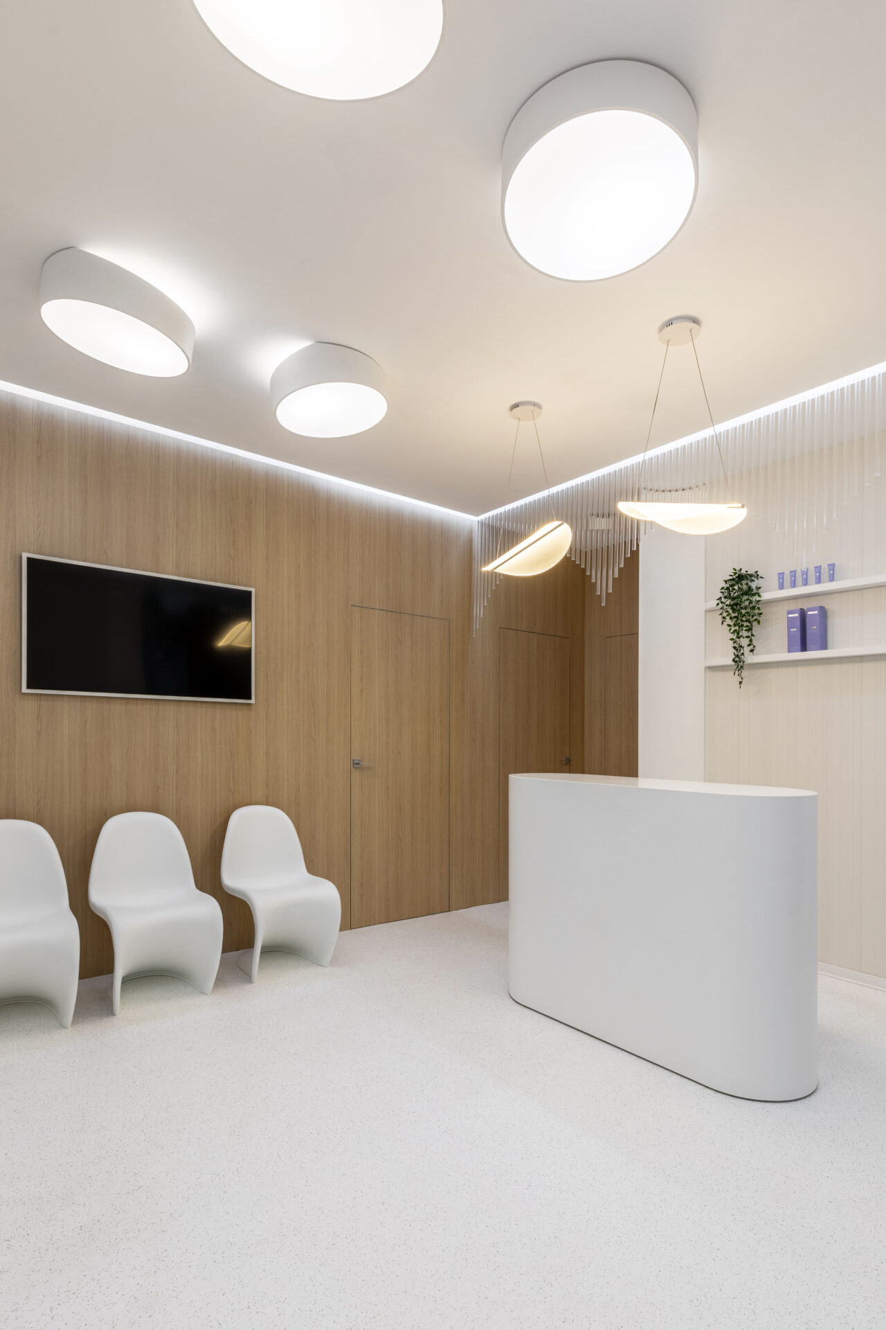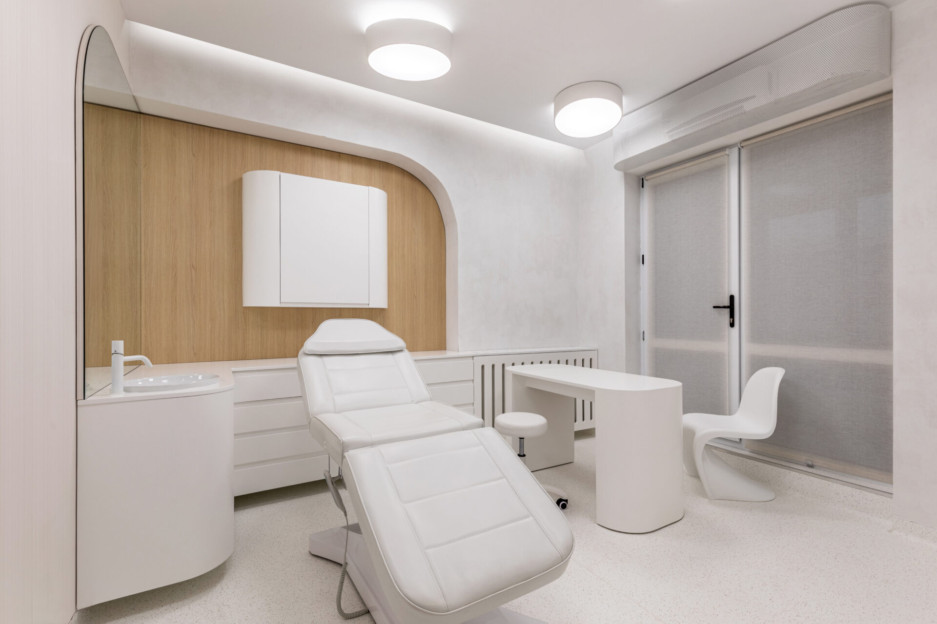 Context. Spațiul este localizat la parterul unei clădiri de locuințe colective, fiind destinat anterior unei funcțiuni asemănătoare. Tema proiectare. Brief-ul a constat în asigurarea a 4 cabinete de consultații și tratament, sala de sterilizare, recepție și două grupuri sanitare. Dezideratele beneficiarului au fost: asigurarea a cât mai multor spații de depozitare, asigurarea funcționalității fiecărui cabinet, după principii ergonomice și aspectul estetic atractiv. Provocări. Din punct de vedere architectural, cea mai mare preocupare a fost să integrăm elementele constructive sau de instalații care nu puteau fi modificate, într-un concept spațial unitar. S-a acordat atenție aspectului funcțional care ținea de ierarhia și relația dintre spații. Deasemenea am avut de a face cu o gama restrânsă de finisaje, folosită uzual în spații cu funcțiune medicală, ținând cont în permanență de aspectul economic. Rezolvări. Cel mai important spațiu este cel al recepției. Aceasta a fost redus la o formă pătrată în plan cu ajutorul a două noi laturi sugerate de arcadele transparente. Aceastea au și rolul de a conduce pacienții către cabinetele medicale, creând alveole care adăpostesc zona de așteptare și desk-ul recepției. Scafele rotunjite au fost create special pentru a masca elementele structurale existente, creând premise pentru o relație organică cu mobilierul ce urma să fie integrat (desk-uri, oglinzi, dulapuri). La final am obținut spații unitare, care oferă un sentiment plăcut utilizatorilor. Finisaje. Finisajele sunt alese în așa fel încât să transmită un sentiment de relaxare în primul rand, dar cu mici doze de contrast și o gamă cromatică restrânsă.