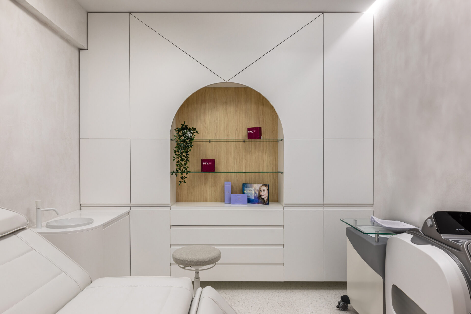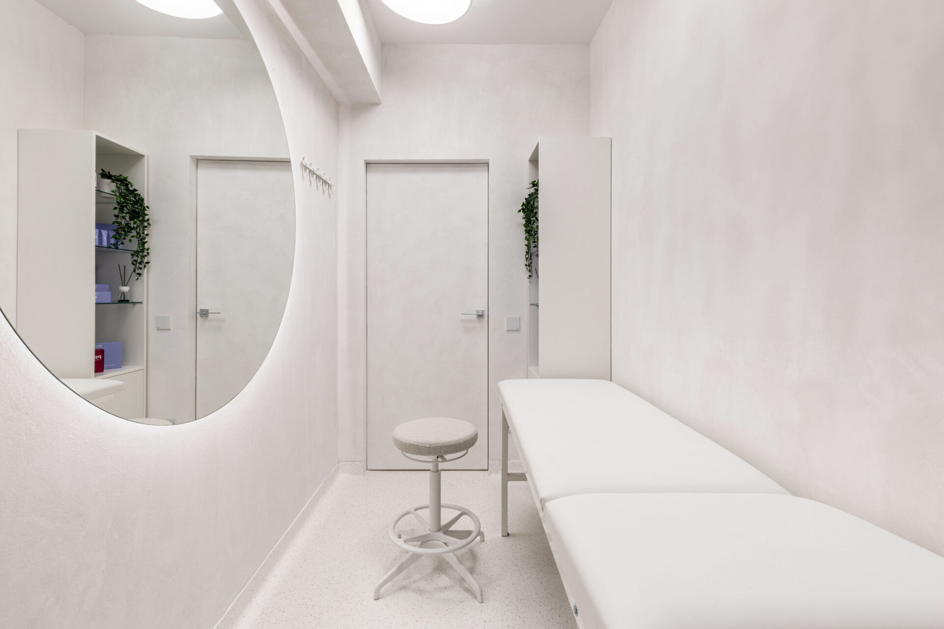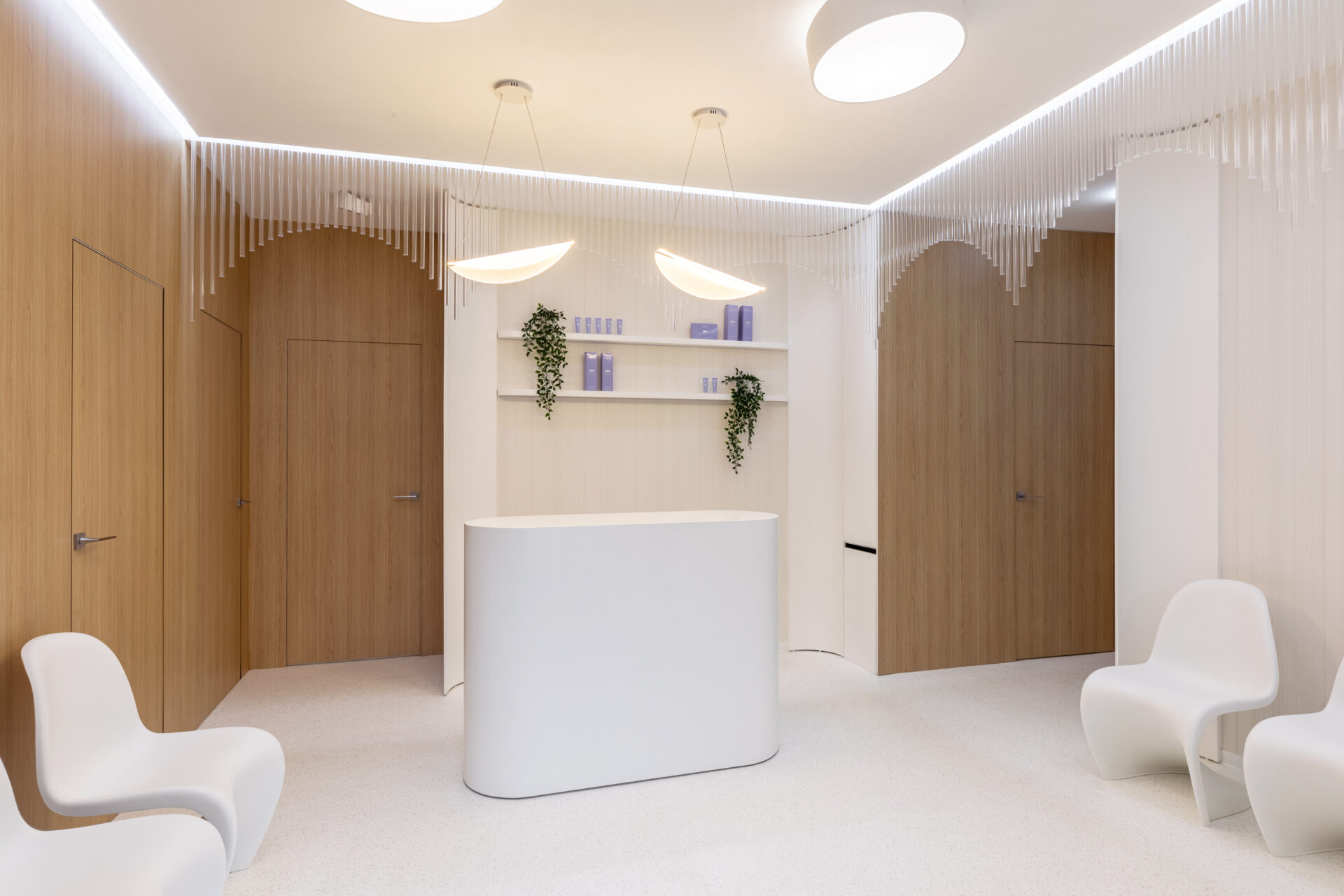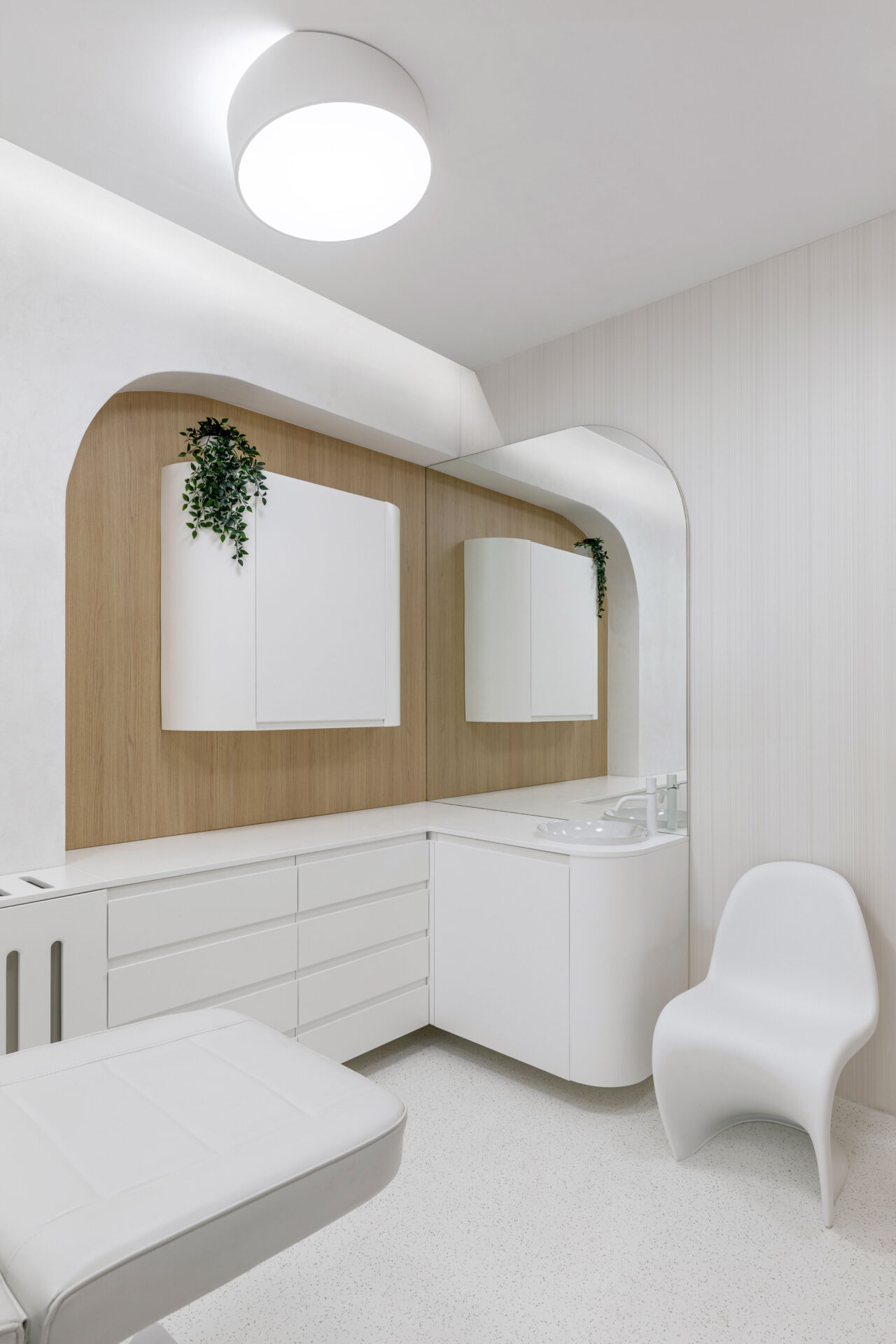 Context. Spațiul este localizat la parterul unei clădiri de locuințe colective, fiind destinat anterior unei funcțiuni asemănătoare. Tema proiectare. Brief-ul a constat în asigurarea a 4 cabinete de consultații și tratament, sala de sterilizare, recepție și două grupuri sanitare. Dezideratele beneficiarului au fost: asigurarea a cât mai multor spații de depozitare, asigurarea funcționalității fiecărui cabinet, după principii ergonomice și aspectul estetic atractiv. Provocări. Din punct de vedere architectural, cea mai mare preocupare a fost să integrăm elementele constructive sau de instalații care nu puteau fi modificate, într-un concept spațial unitar. S-a acordat atenție aspectului funcțional care ținea de ierarhia și relația dintre spații. Deasemenea am avut de a face cu o gama restrânsă de finisaje, folosită uzual în spații cu funcțiune medicală, ținând cont în permanență de aspectul economic. Rezolvări. Cel mai important spațiu este cel al recepției. Aceasta a fost redus la o formă pătrată în plan cu ajutorul a două noi laturi sugerate de arcadele transparente. Aceastea au și rolul de a conduce pacienții către cabinetele medicale, creând alveole care adăpostesc zona de așteptare și desk-ul recepției. Scafele rotunjite au fost create special pentru a masca elementele structurale existente, creând premise pentru o relație organică cu mobilierul ce urma să fie integrat (desk-uri, oglinzi, dulapuri). La final am obținut spații unitare, care oferă un sentiment plăcut utilizatorilor. Finisaje. Finisajele sunt alese în așa fel încât să transmită un sentiment de relaxare în primul rand, dar cu mici doze de contrast și o gamă cromatică restrânsă.