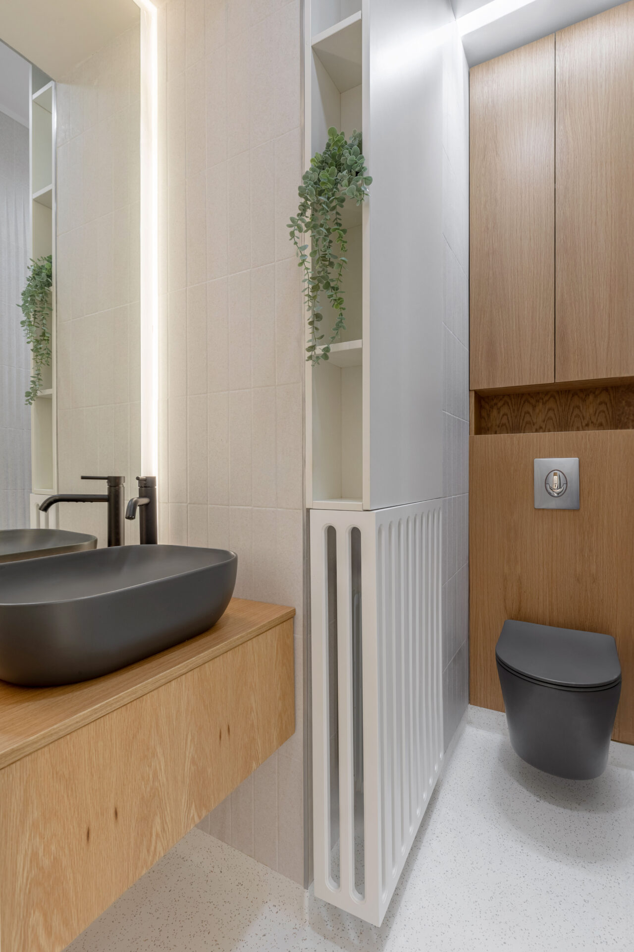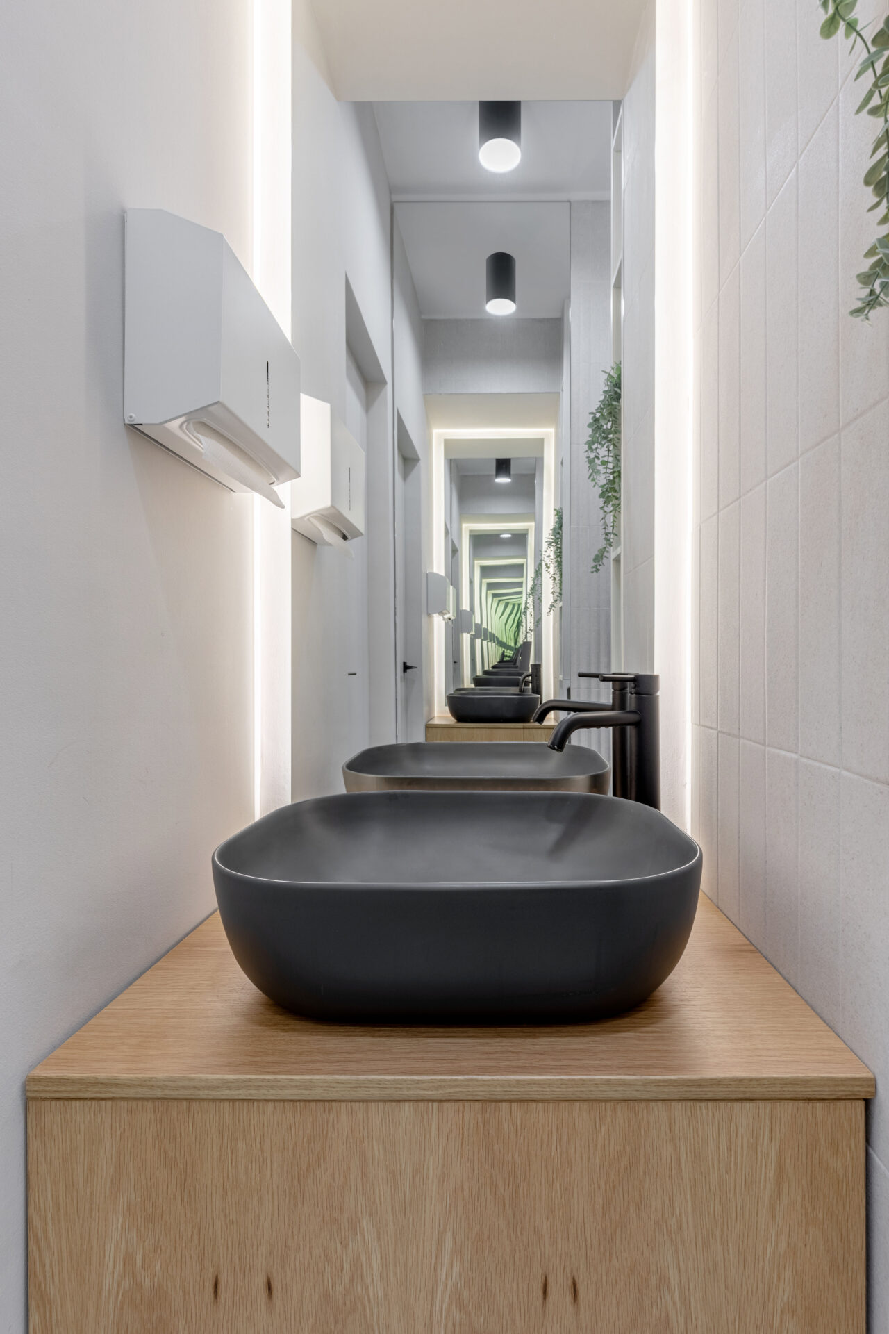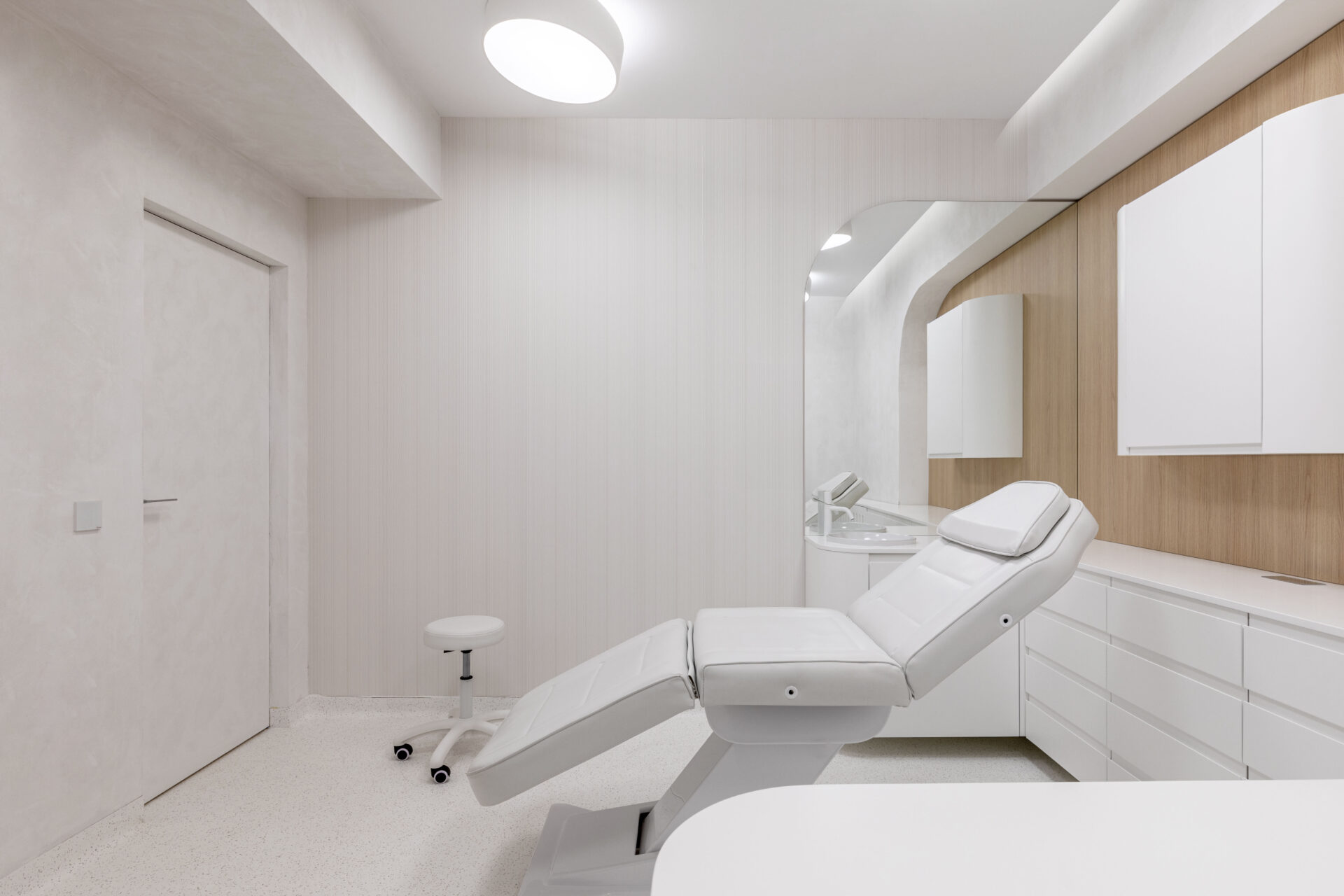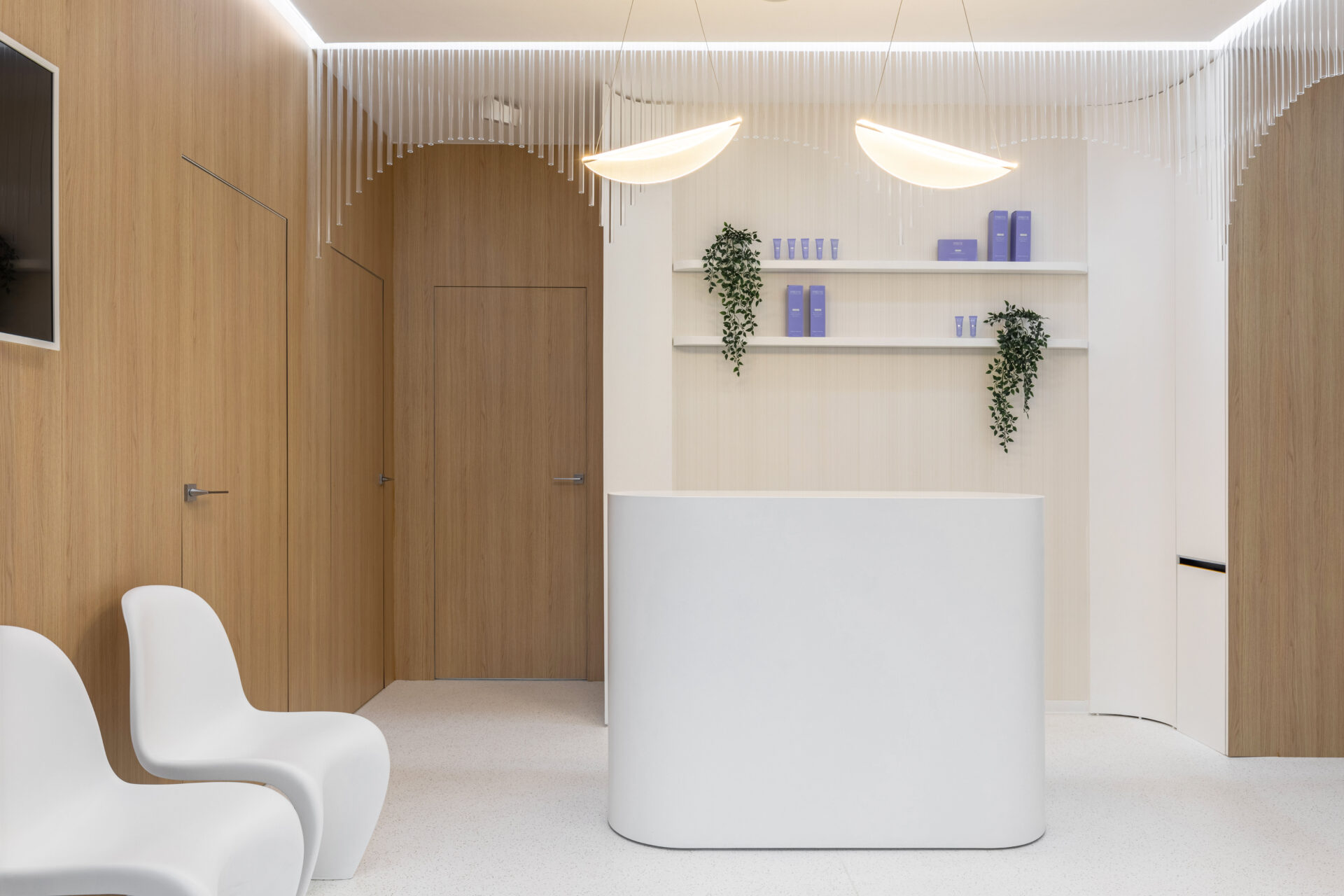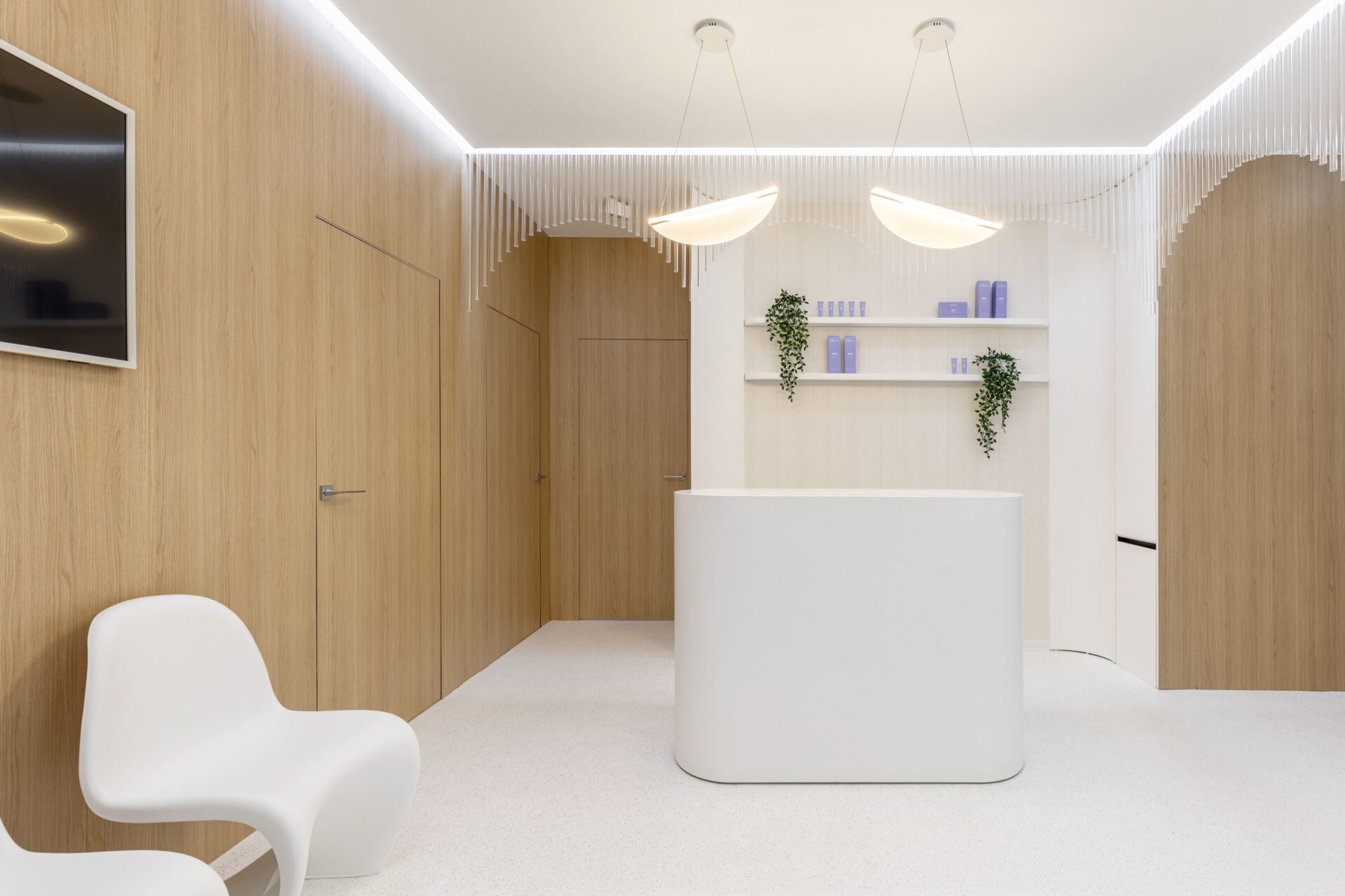 Context. Spațiul este localizat la parterul unei clădiri de locuințe colective, fiind destinat anterior unei funcțiuni asemănătoare. Tema proiectare. Brief-ul a constat în asigurarea a 4 cabinete de consultații și tratament, sala de sterilizare, recepție și două grupuri sanitare. Dezideratele beneficiarului au fost: asigurarea a cât mai multor spații de depozitare, asigurarea funcționalității fiecărui cabinet, după principii ergonomice și aspectul estetic atractiv. Provocări. Din punct de vedere architectural, cea mai mare preocupare a fost să integrăm elementele constructive sau de instalații care nu puteau fi modificate, într-un concept spațial unitar. S-a acordat atenție aspectului funcțional care ținea de ierarhia și relația dintre spații. Deasemenea am avut de a face cu o gama restrânsă de finisaje, folosită uzual în spații cu funcțiune medicală, ținând cont în permanență de aspectul economic. Rezolvări. Cel mai important spațiu este cel al recepției. Aceasta a fost redus la o formă pătrată în plan cu ajutorul a două noi laturi sugerate de arcadele transparente. Aceastea au și rolul de a conduce pacienții către cabinetele medicale, creând alveole care adăpostesc zona de așteptare și desk-ul recepției. Scafele rotunjite au fost create special pentru a masca elementele structurale existente, creând premise pentru o relație organică cu mobilierul ce urma să fie integrat (desk-uri, oglinzi, dulapuri). La final am obținut spații unitare, care oferă un sentiment plăcut utilizatorilor. Finisaje. Finisajele sunt alese în așa fel încât să transmită un sentiment de relaxare în primul rand, dar cu mici doze de contrast și o gamă cromatică restrânsă.