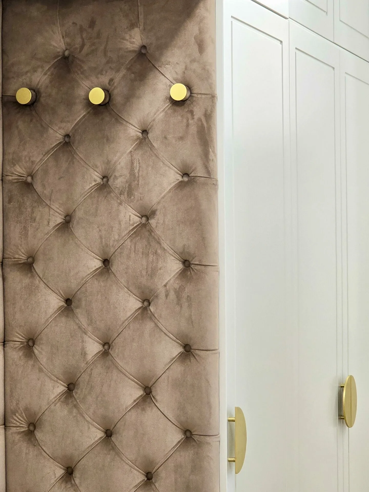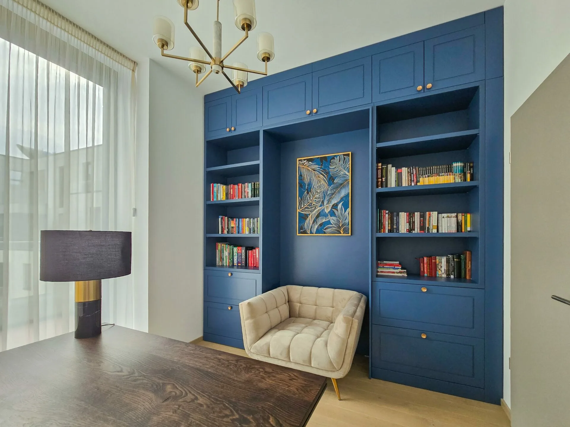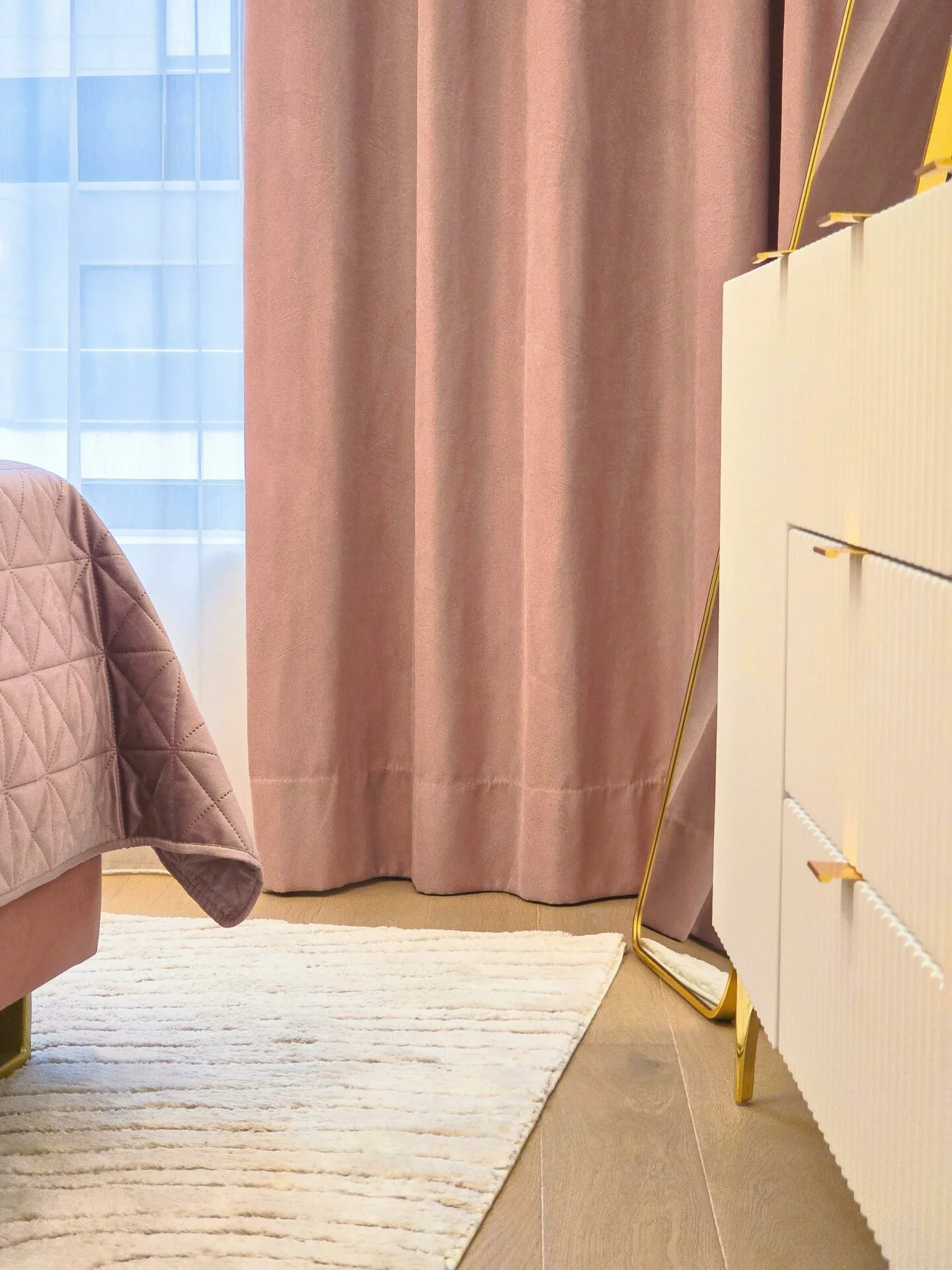 Este cu totul și cu totul distinct de restul încăperilor, diametral opus, aș putea spune, de un roz pudră calm și liniștitor. O cameră în care nu a fost nevoie de alte nuanțe decât alb, roz și mici detalii aurii care se regăsesc în întreaga amenajare. Ce este special la această amenajare, pe lângă evidenta prezență a culorii și tavanele înalte de peste 3 metri, este încăperea dedicată muncii de acasă, mai specific biroul din lemn masiv. Acesta are o greutate de câteva zeci de kg și este lucrat în două nuanțe, una nuc natur și una nuc închis, fiind accesorizat cu mânere aurii și interioare de piele.