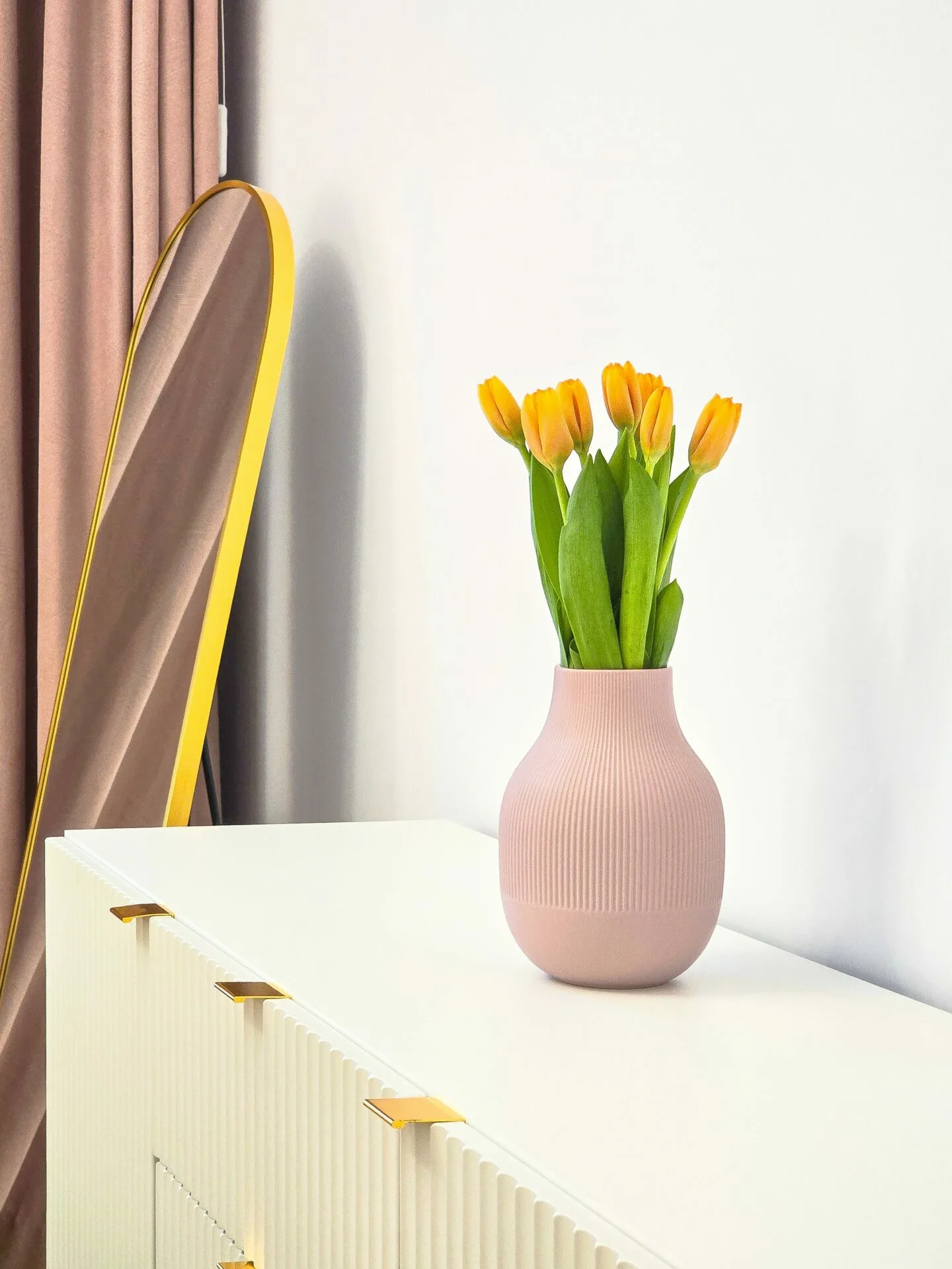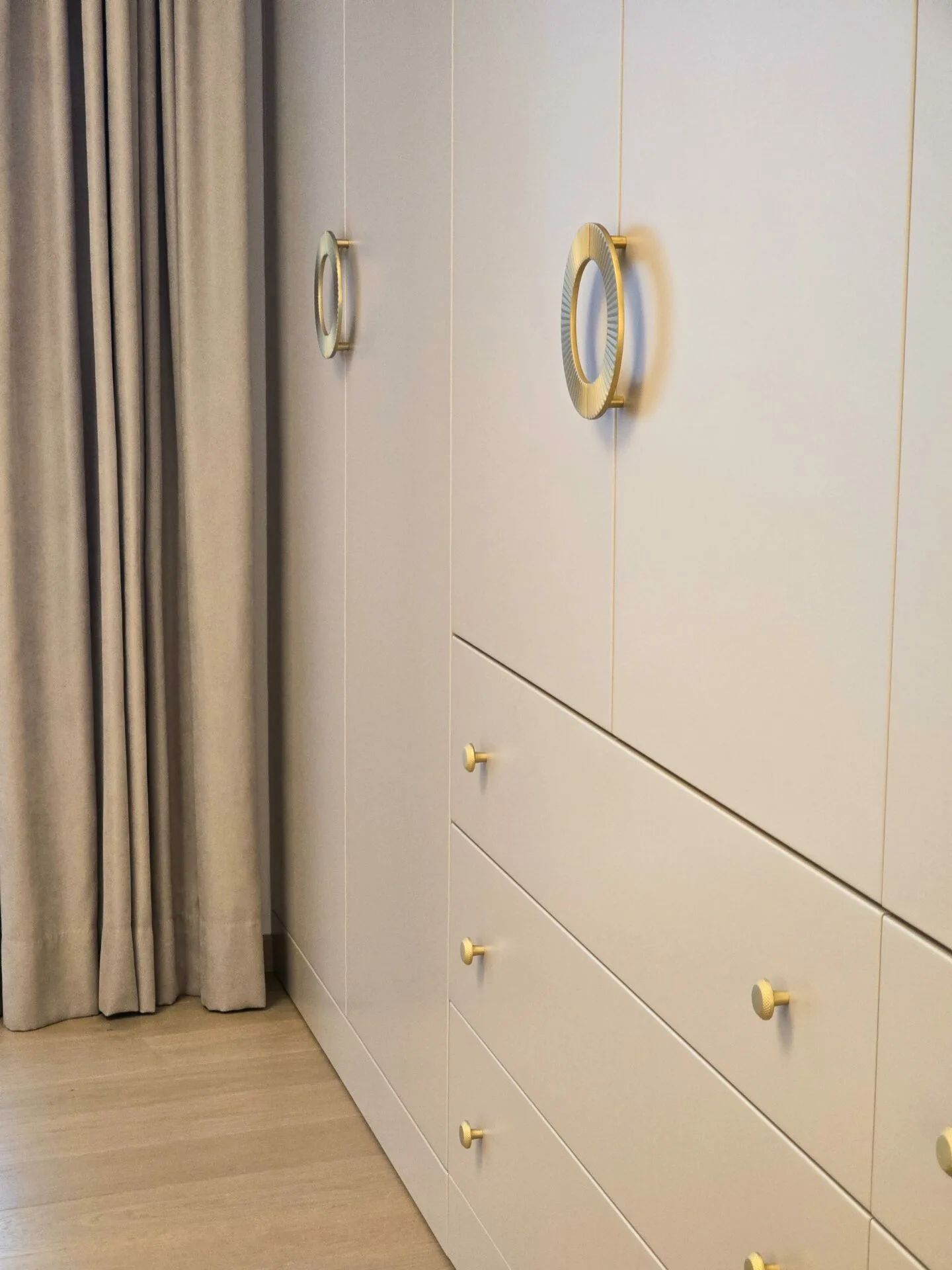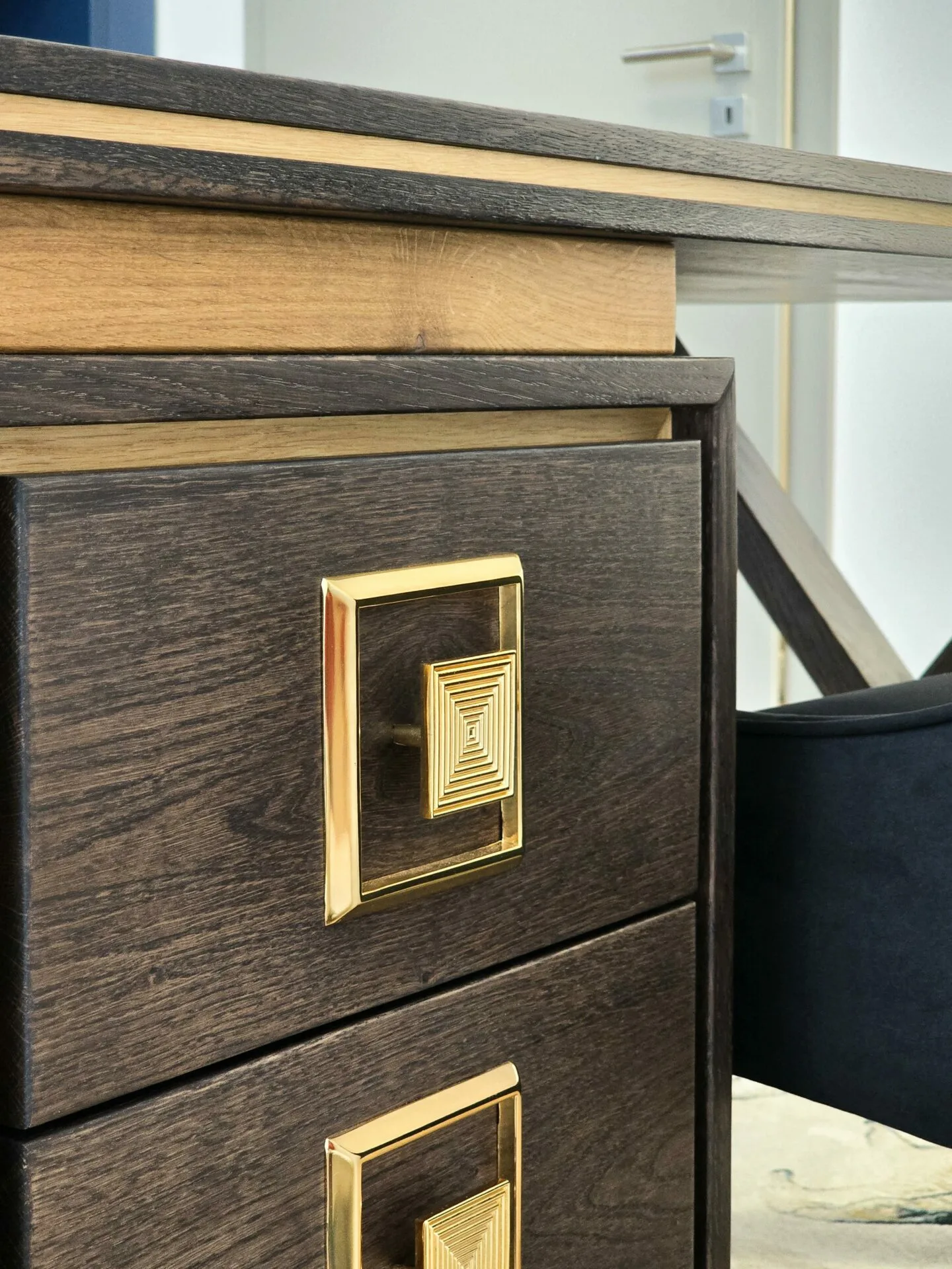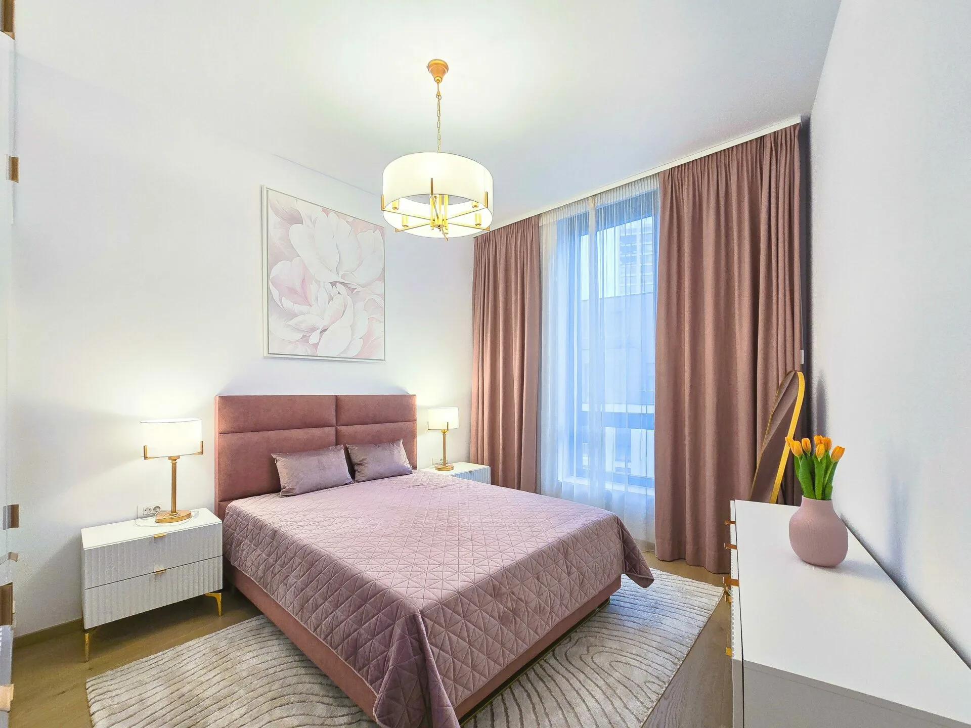 Este cu totul și cu totul distinct de restul încăperilor, diametral opus, aș putea spune, de un roz pudră calm și liniștitor. O cameră în care nu a fost nevoie de alte nuanțe decât alb, roz și mici detalii aurii care se regăsesc în întreaga amenajare. Ce este special la această amenajare, pe lângă evidenta prezență a culorii și tavanele înalte de peste 3 metri, este încăperea dedicată muncii de acasă, mai specific biroul din lemn masiv. Acesta are o greutate de câteva zeci de kg și este lucrat în două nuanțe, una nuc natur și una nuc închis, fiind accesorizat cu mânere aurii și interioare de piele.