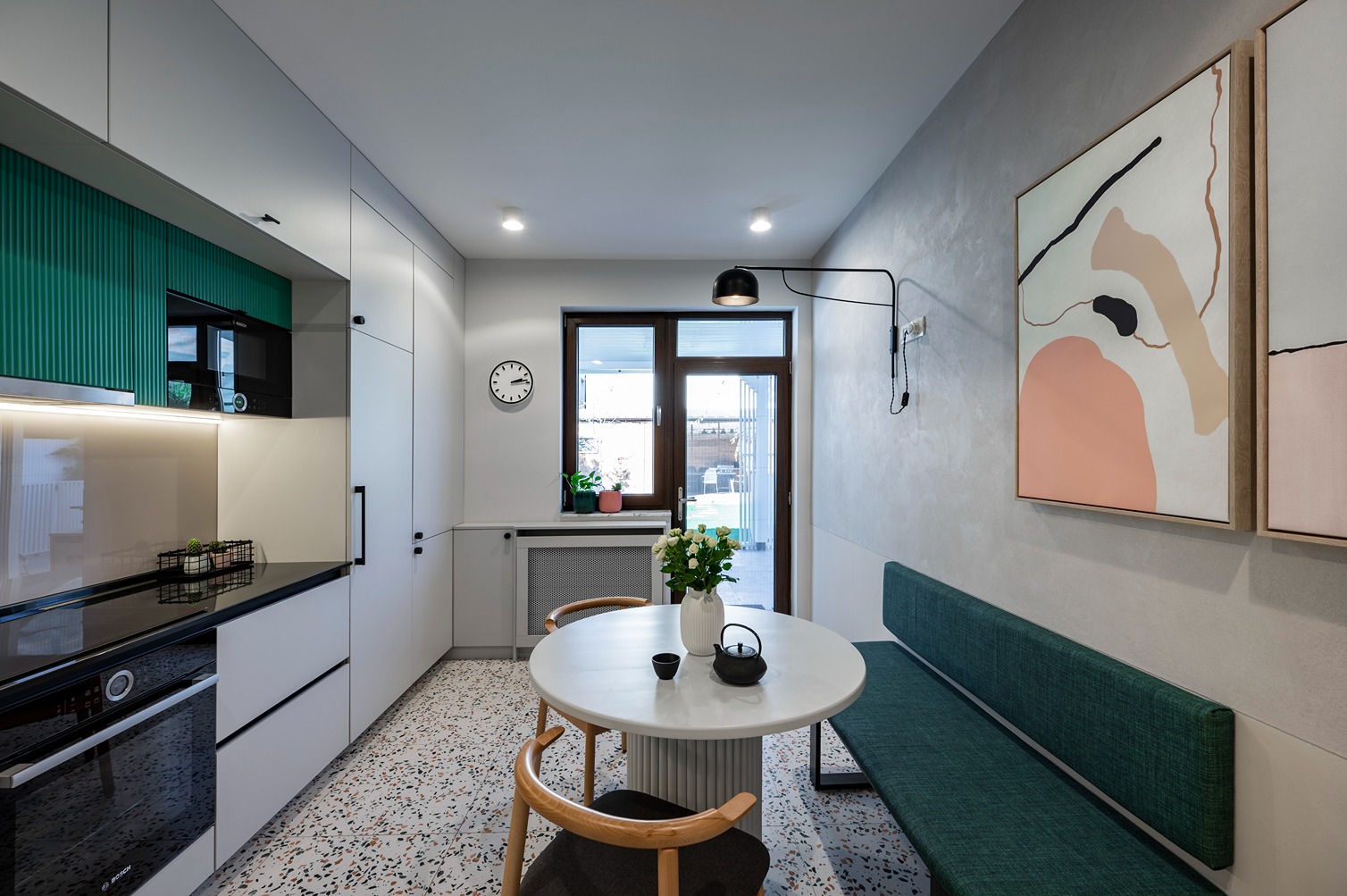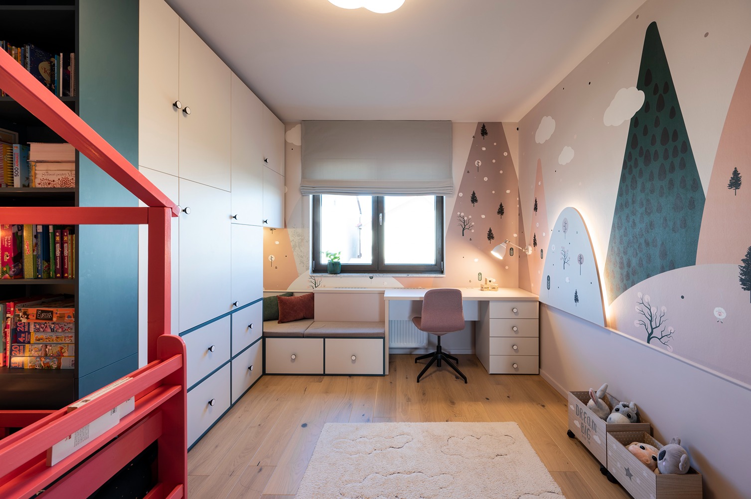 Cerințele beneficiarilor au fost foarte bine definite și foarte punctuale. Fiecare și-a ales colțul din casă care îi era mai drag și modul în care dorește să îi deservească. Astfel ne-au permis nouă să îi descoperim în ritmul nostru, să îi cunoaștem pe îndelete și să conturăm împreună povestea de design pe care au numit-o ulterior “acasă”. Am creat nuanțe de culoare noi, pe care nu le-am regăsit în paletarele de specialitate, am creionat piese de mobilier și am desenat numeroase schițe până am finalizat modelul fiecărui tapet. Culorile predominante sunt verde, deoarece este o nuanță ce reprezintă echilibrul pe care îl asociem cu vegetația, aducând cu sine liniștea și confortul oferit de natură și roz pentru sensibilitate, empatie și grijă față de persoanele care ne înconjoară; așa i-am descrie noi pe membrii acestei familii.