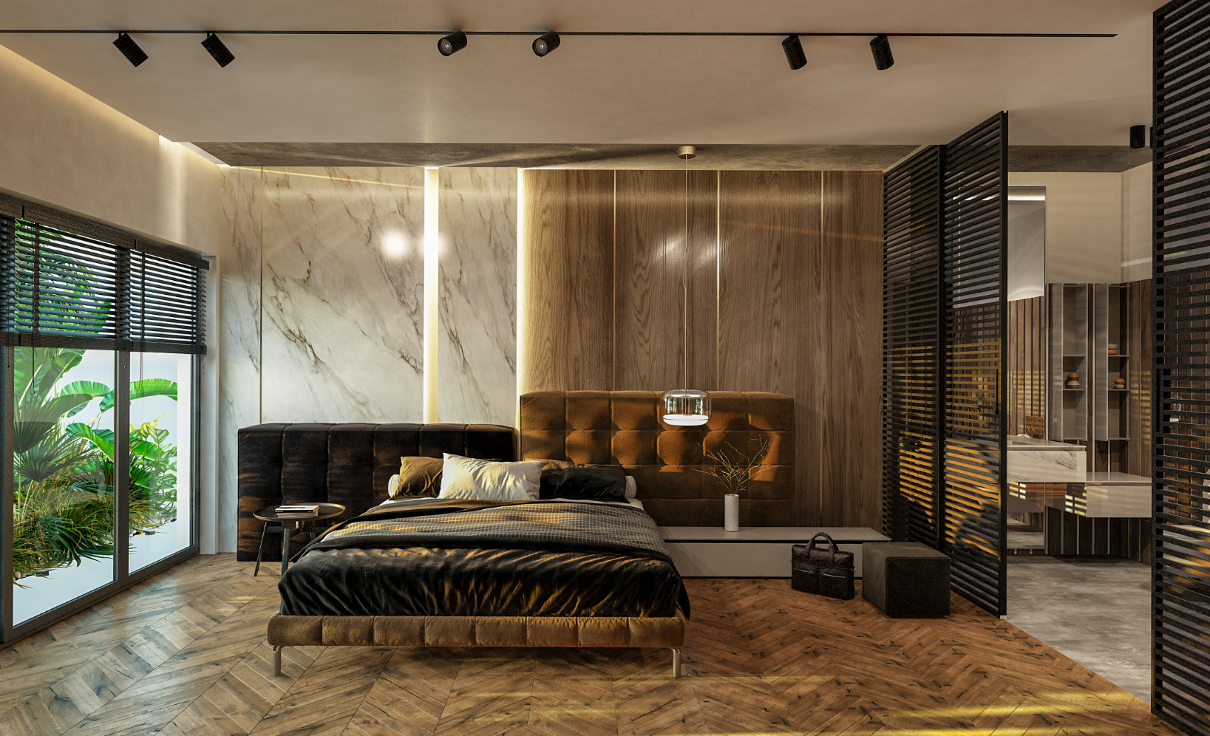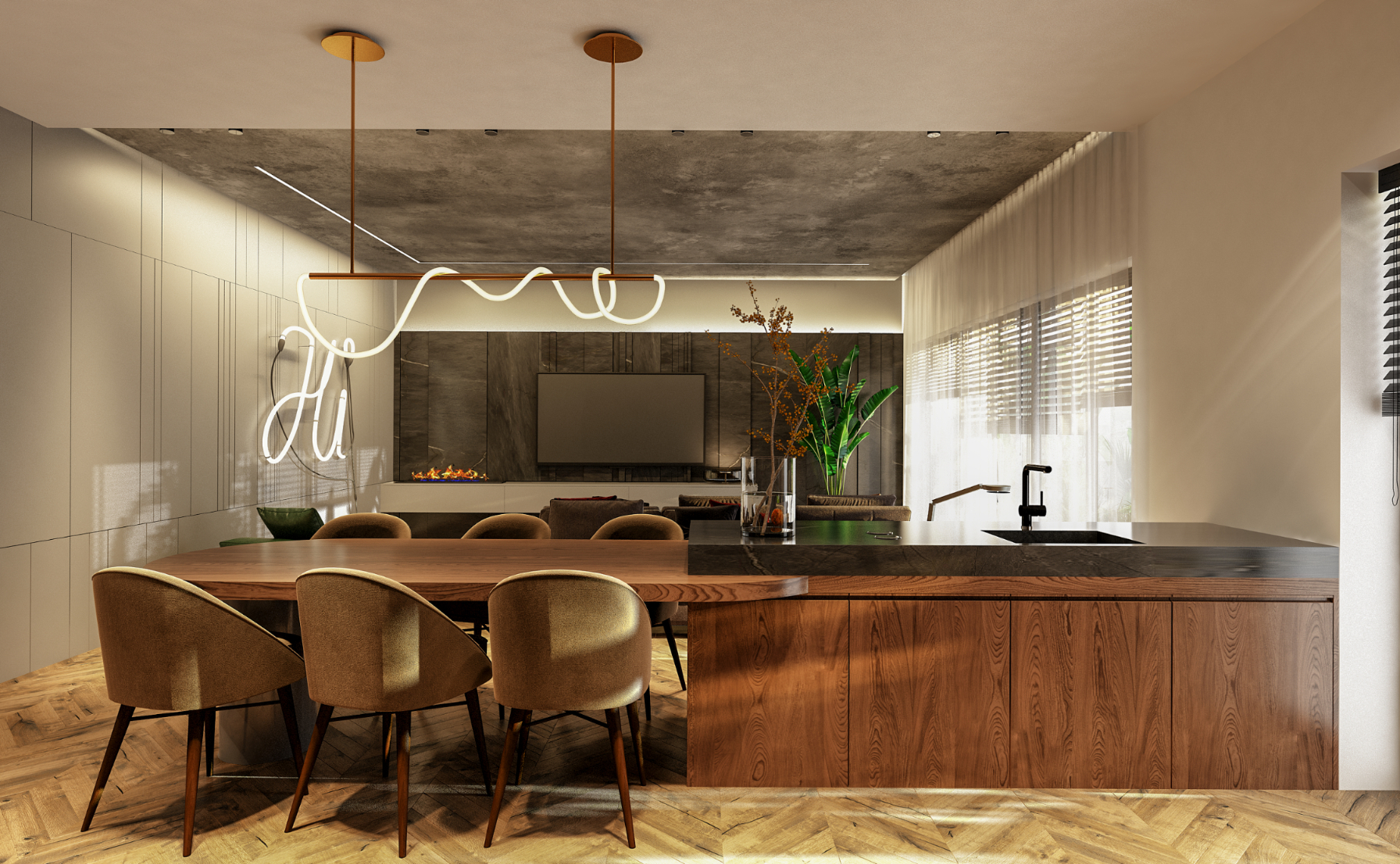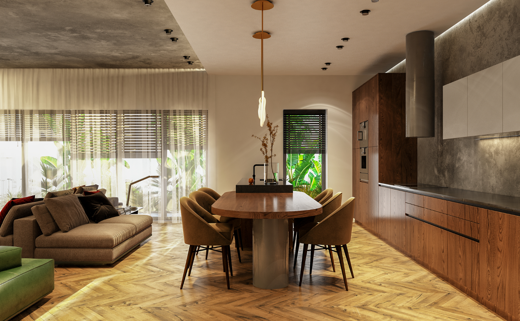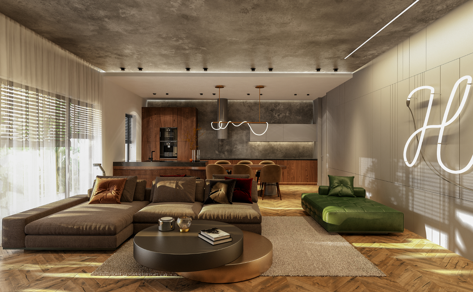 Un cuplu tânăr, care vrea să se simtă mereu aproape de natură, a optat pentru o casă cu grădină mare, dar și pentru o grădină interioară închisă cu sticlă rilfată, care creează niste umbre și reflexii superbe. Pornind de la asta, am folosit doar materiale naturale precum betonul, marmura, lemnul masiv și am armonizat totul cu textile din catifea în culori pământii cu acente roșu-verde.