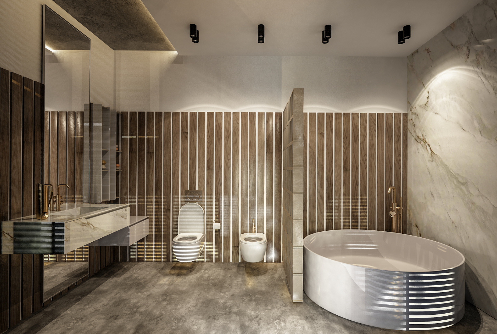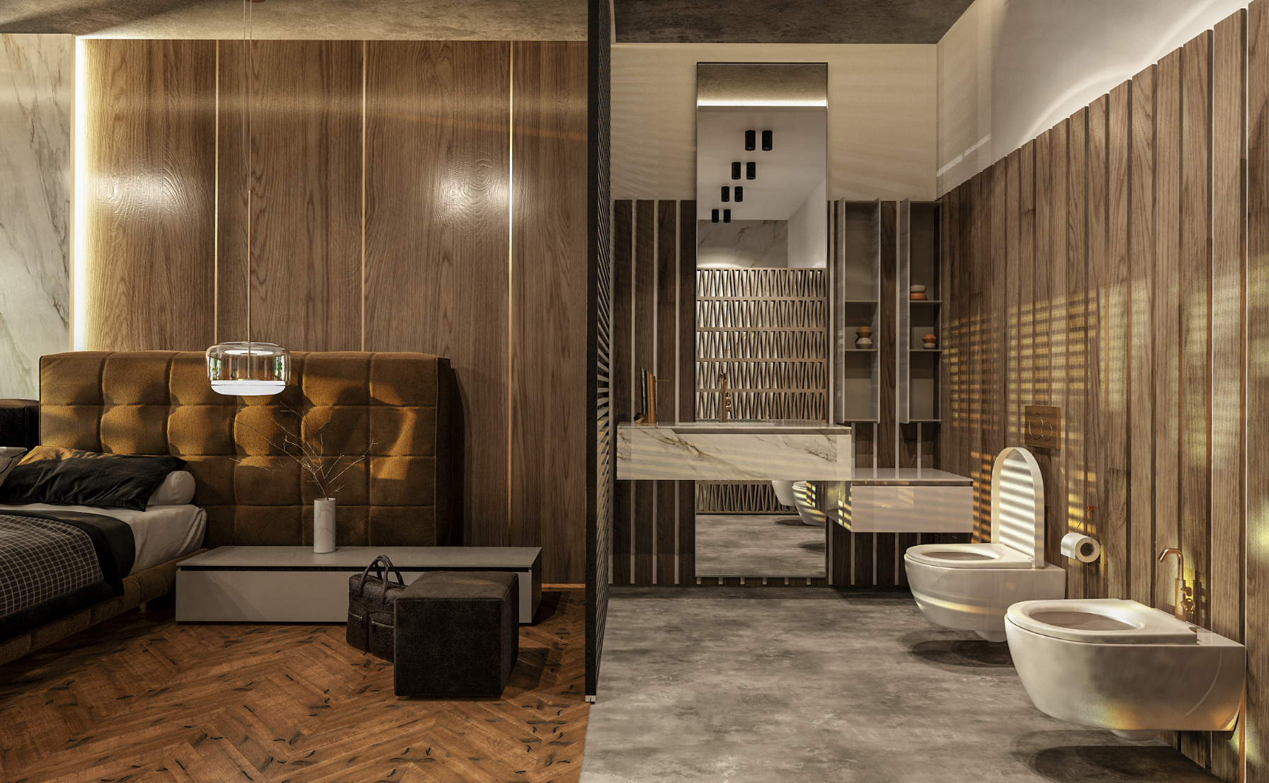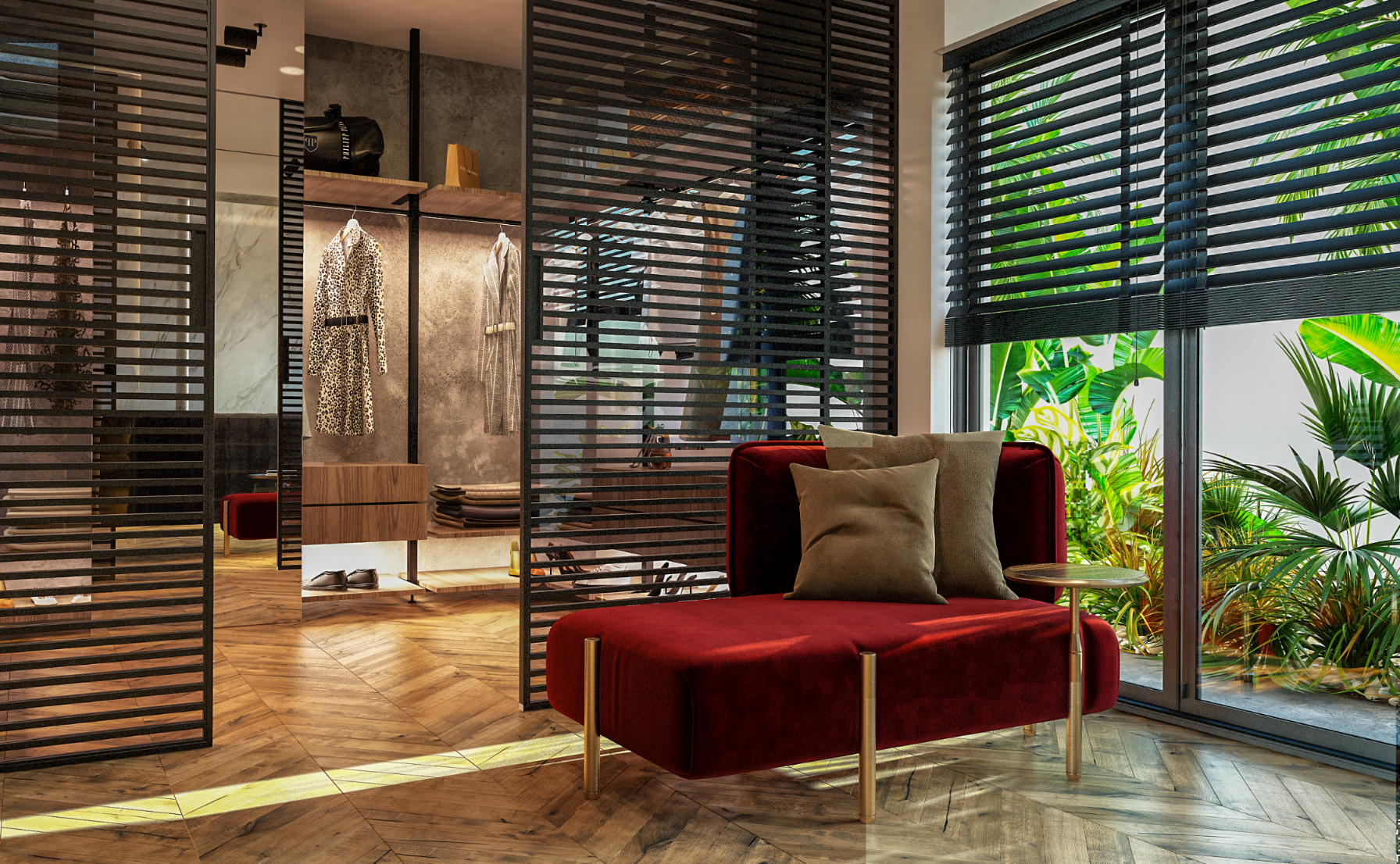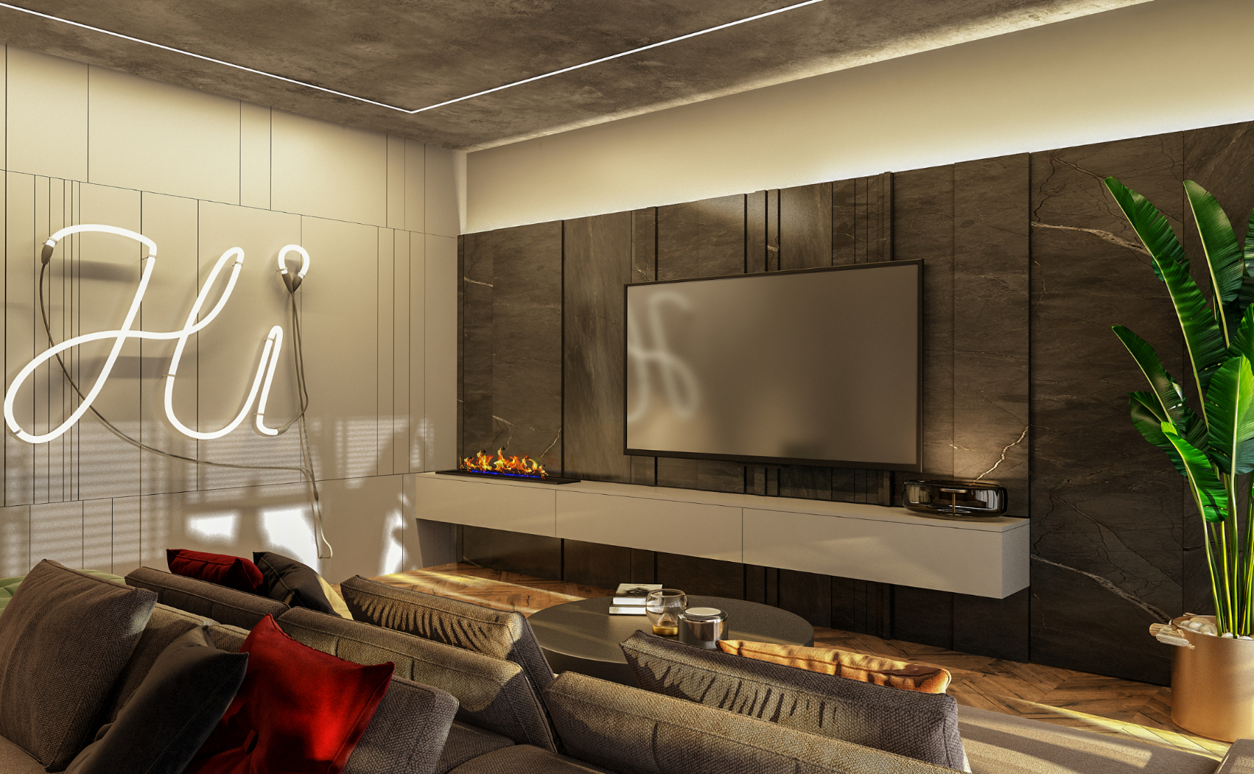 Un cuplu tânăr, care vrea să se simtă mereu aproape de natură, a optat pentru o casă cu grădină mare, dar și pentru o grădină interioară închisă cu sticlă rilfată, care creează niste umbre și reflexii superbe. Pornind de la asta, am folosit doar materiale naturale precum betonul, marmura, lemnul masiv și am armonizat totul cu textile din catifea în culori pământii cu acente roșu-verde.