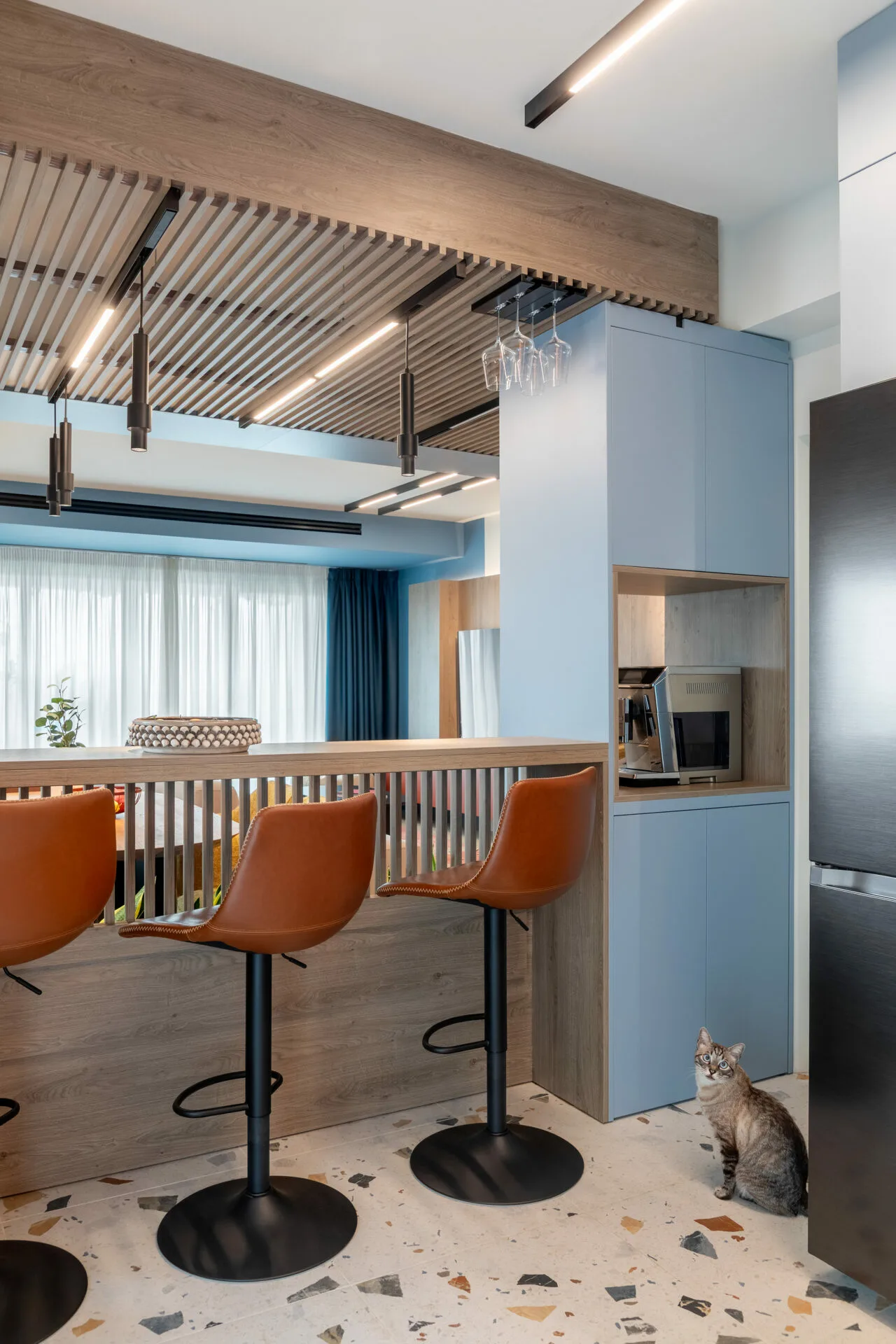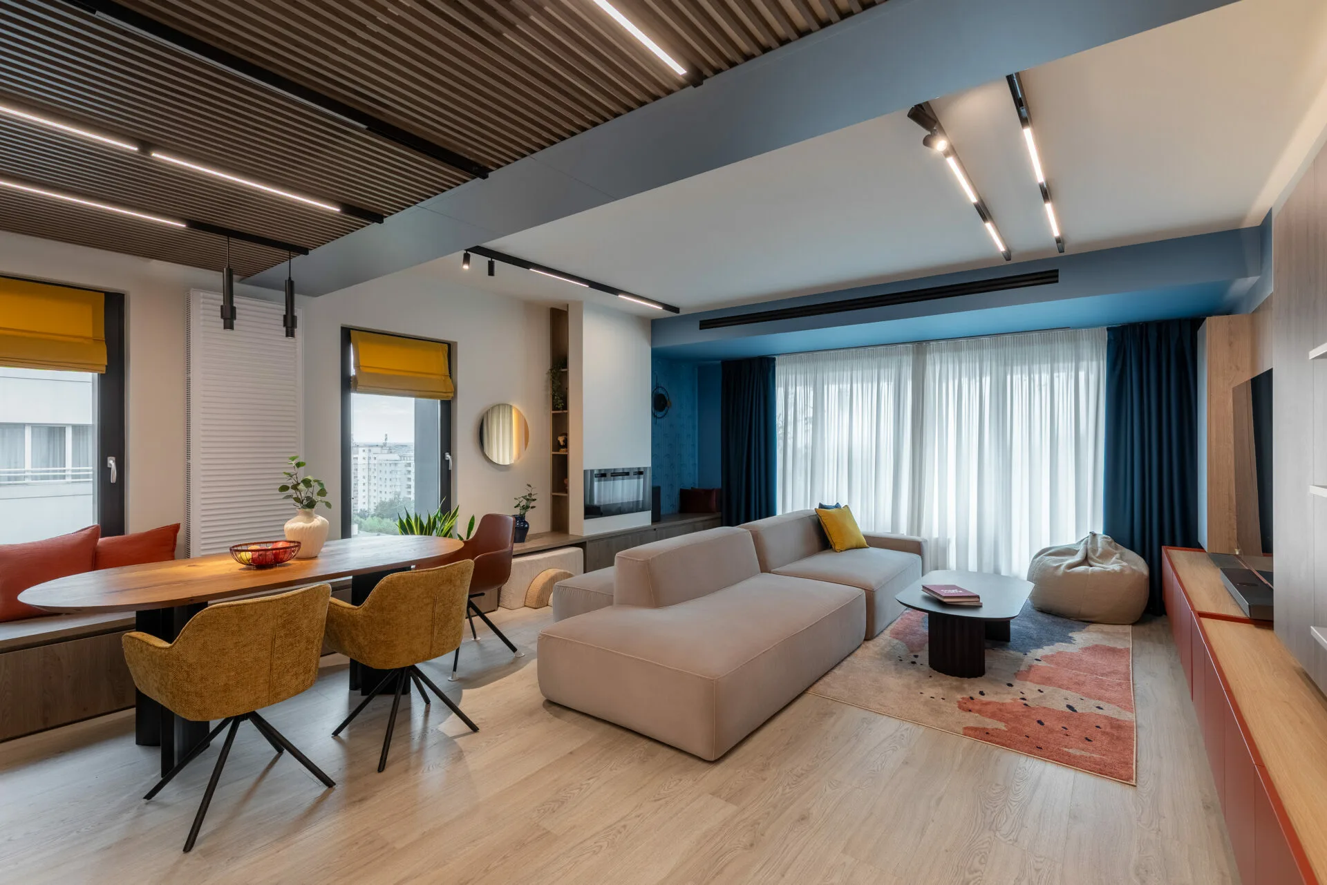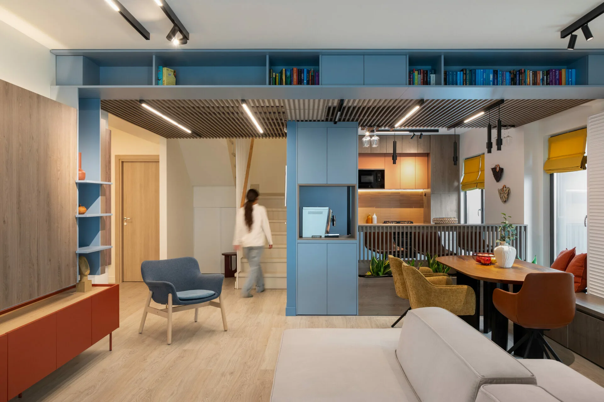 Într-o casă în care fiecare zi arată altfel, acest duplex a fost creat fără obstacole, fără rigiditate. Designul e o formă de grijă, care lasă loc copilăriei, liniștii și apropierii. Liniile sunt ferme, culorile delimitează; dar nu taie, totul se leagă natural. Designul nu impune reguli, doar le face mai blânde.