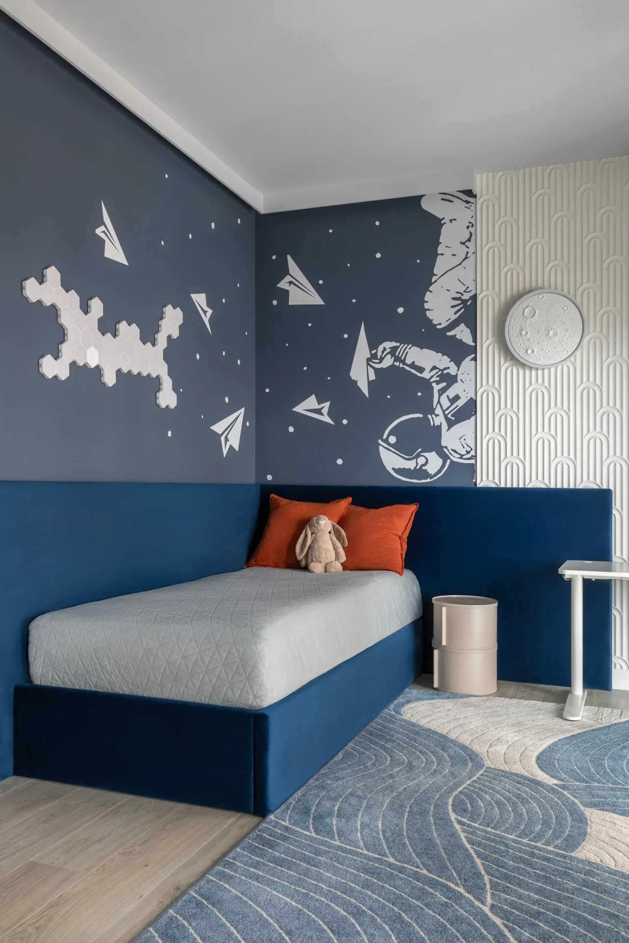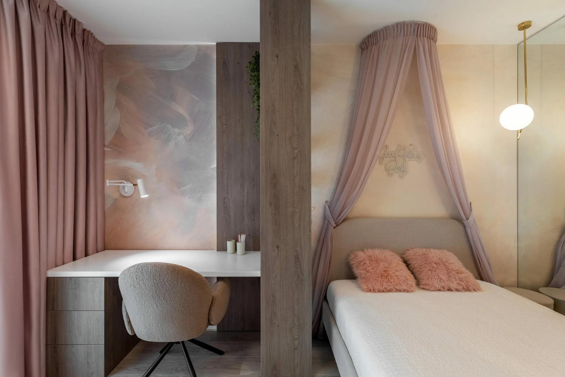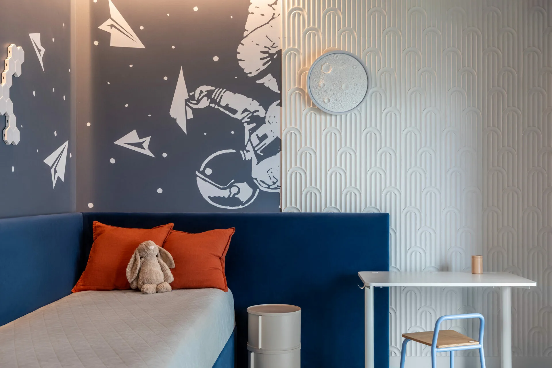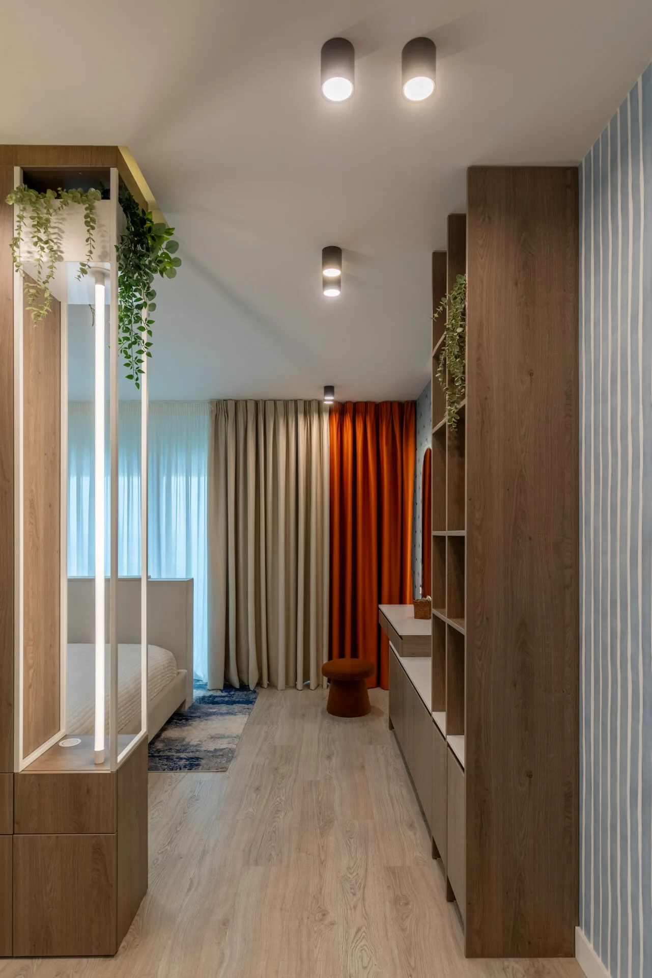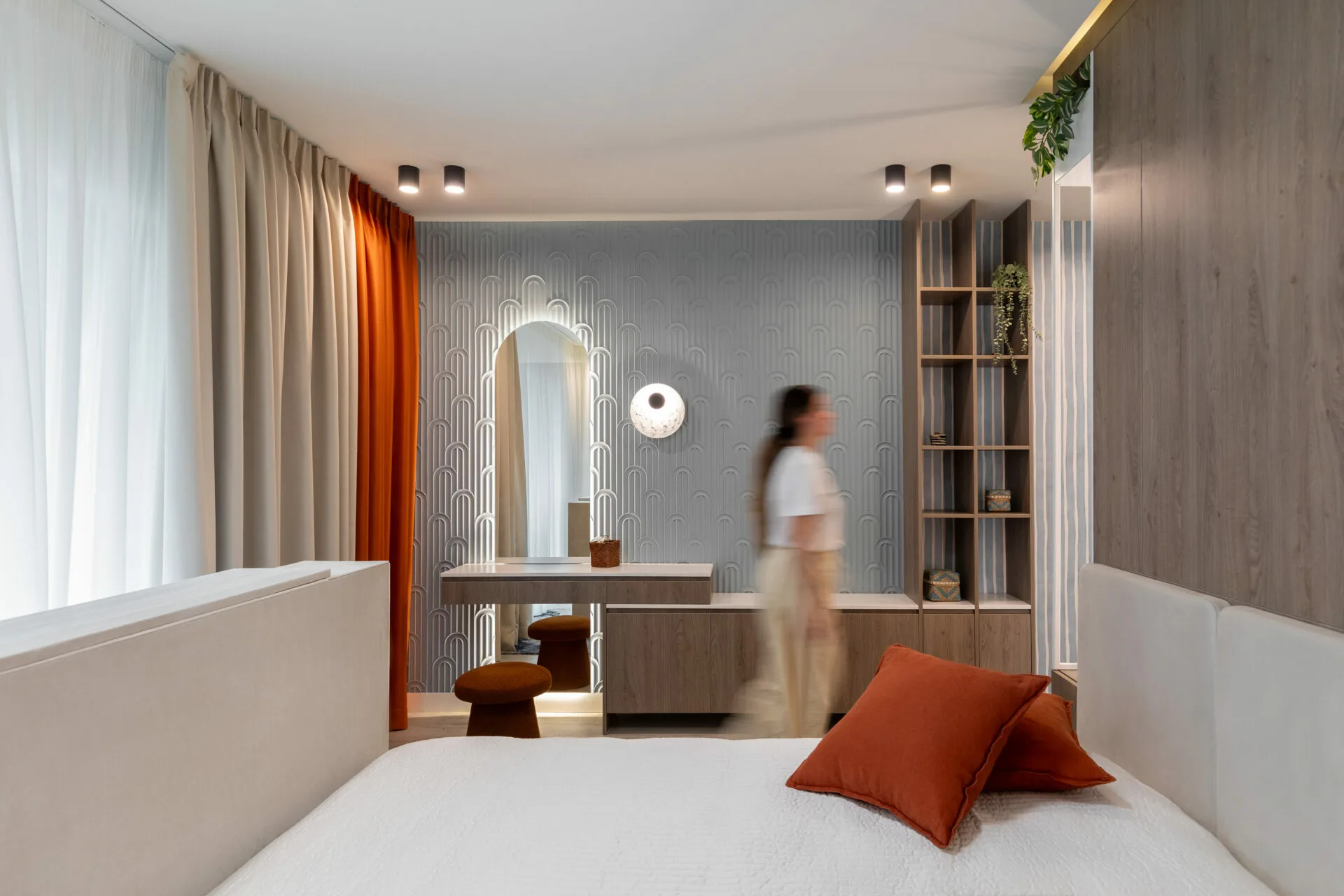 Pentru o familie cu doi copii, dintre care unul cu nevoi speciale, am căutat fluiditate, nu doar frumusețe, iar siguranța a fost un punct de plecare, nu o constrângere. Această atenție se regăsește în întreaga casă, de la ritmul spațiilor până la soluțiile discrete care protejează, fără să apese. Camerele copiilor sunt universuri construite din interior spre exterior. Camera băiatului funcționează ca o hartă senzorială, cu texturi moi, lumină blândă și elemente care îl ajută să exploreze fără teamă. Dormitorul adolescentei este unul cu personalitate, un spațiu în care se poate regăsi acum și care poate crește alături de ea.