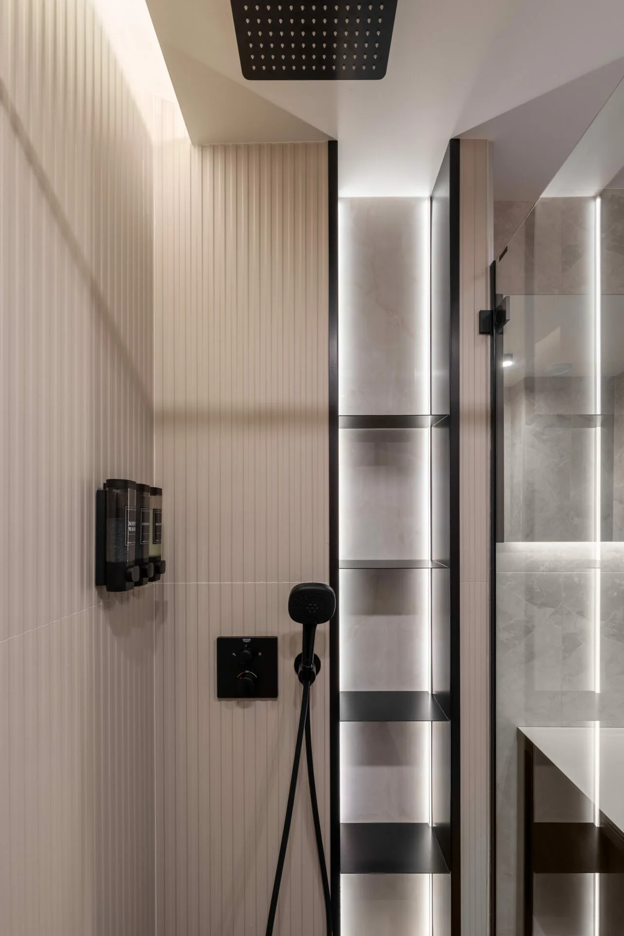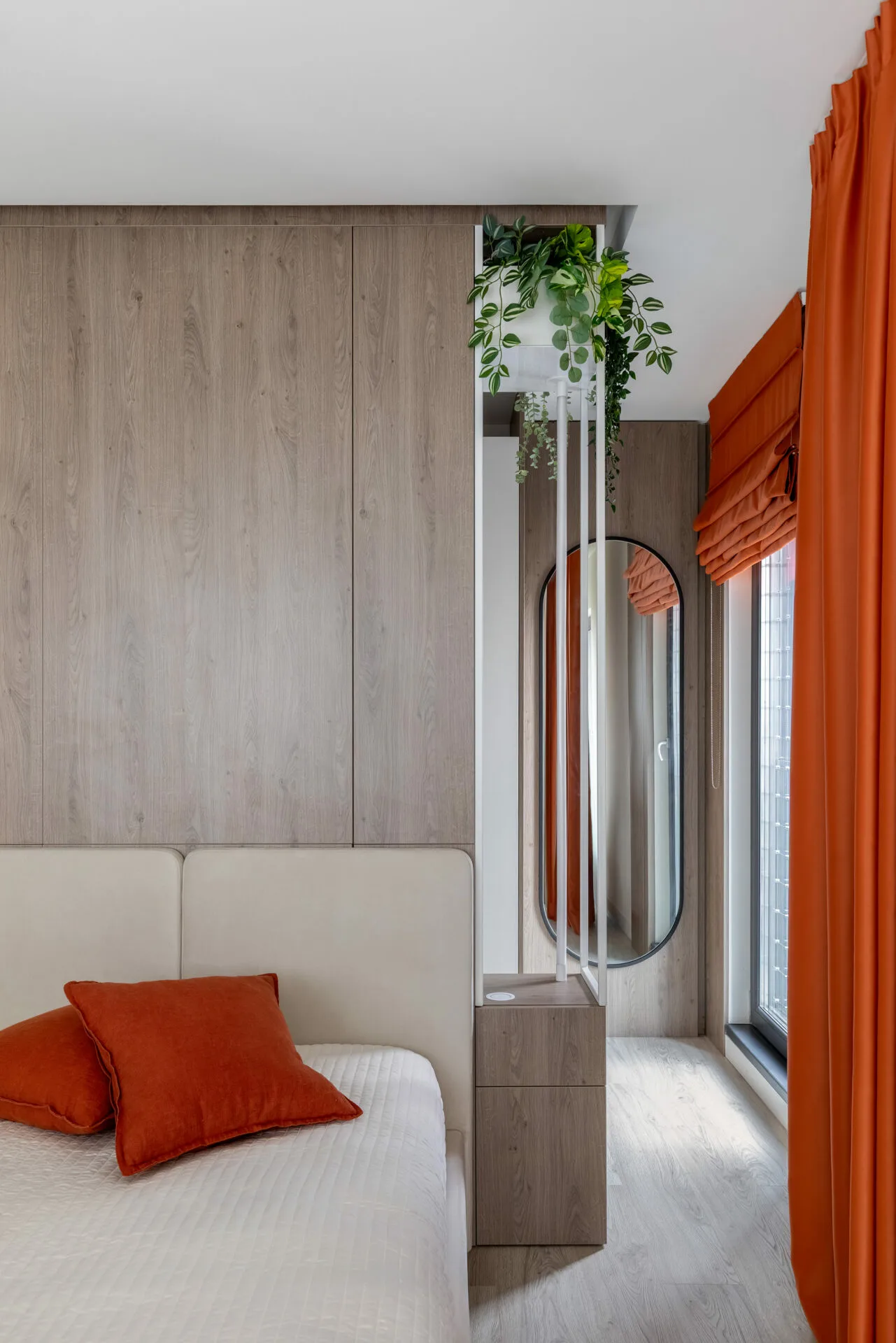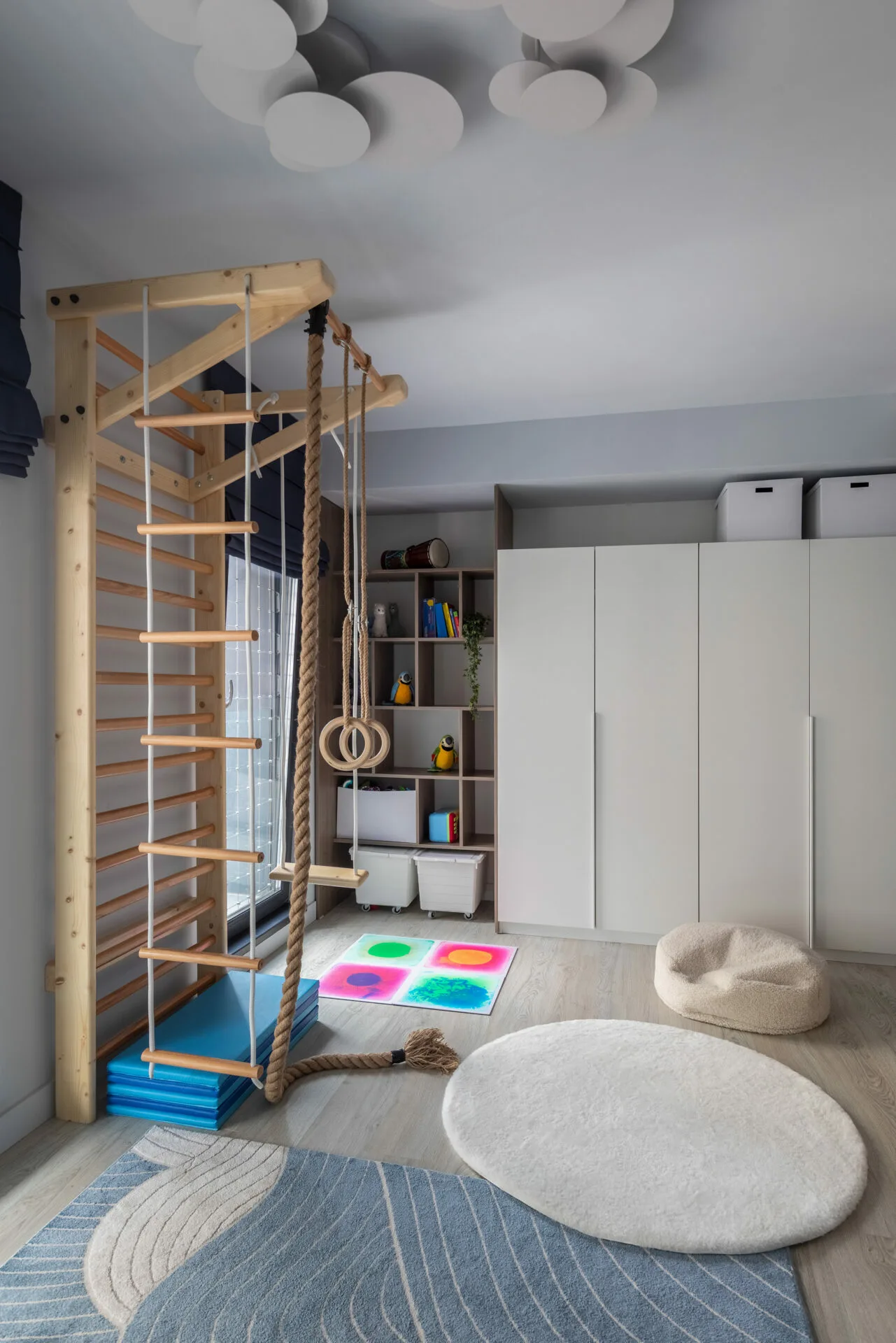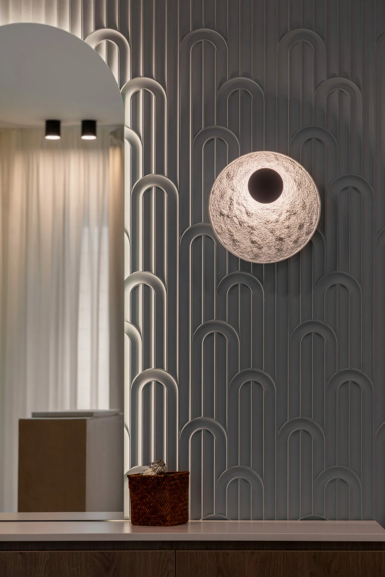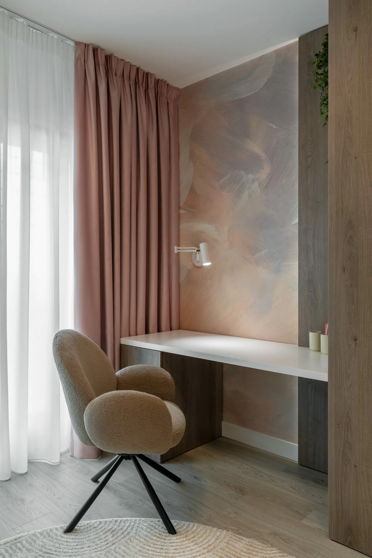 Pentru o familie cu doi copii, dintre care unul cu nevoi speciale, am căutat fluiditate, nu doar frumusețe, iar siguranța a fost un punct de plecare, nu o constrângere. Această atenție se regăsește în întreaga casă, de la ritmul spațiilor până la soluțiile discrete care protejează, fără să apese. Camerele copiilor sunt universuri construite din interior spre exterior. Camera băiatului funcționează ca o hartă senzorială, cu texturi moi, lumină blândă și elemente care îl ajută să exploreze fără teamă. Dormitorul adolescentei este unul cu personalitate, un spațiu în care se poate regăsi acum și care poate crește alături de ea.