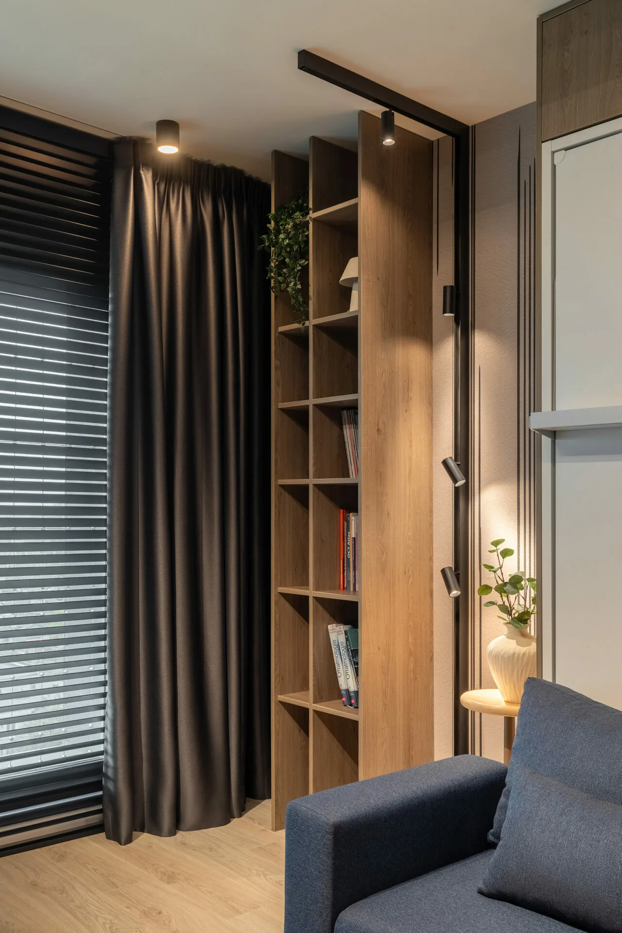Dormitorul matrimonial este un loc care inspiră calm, în care biblioteca face parte din viața de zi cu zi și din identitatea familiei. Patul, fiind așezat în mijlocul camerei, este un gest simplu care schimbă totul: spațiul devine fluid, respiră și oferă libertate de mișcare. Siguranța este integrată discret în ritmul casei, fără a deveni o barieră vizuală. Întregul proiect vorbește despre un design care nu caută perfecțiunea, ci continuitatea, o casă care crește odată cu oamenii ei și rămâne, în timp, la fel de vie.