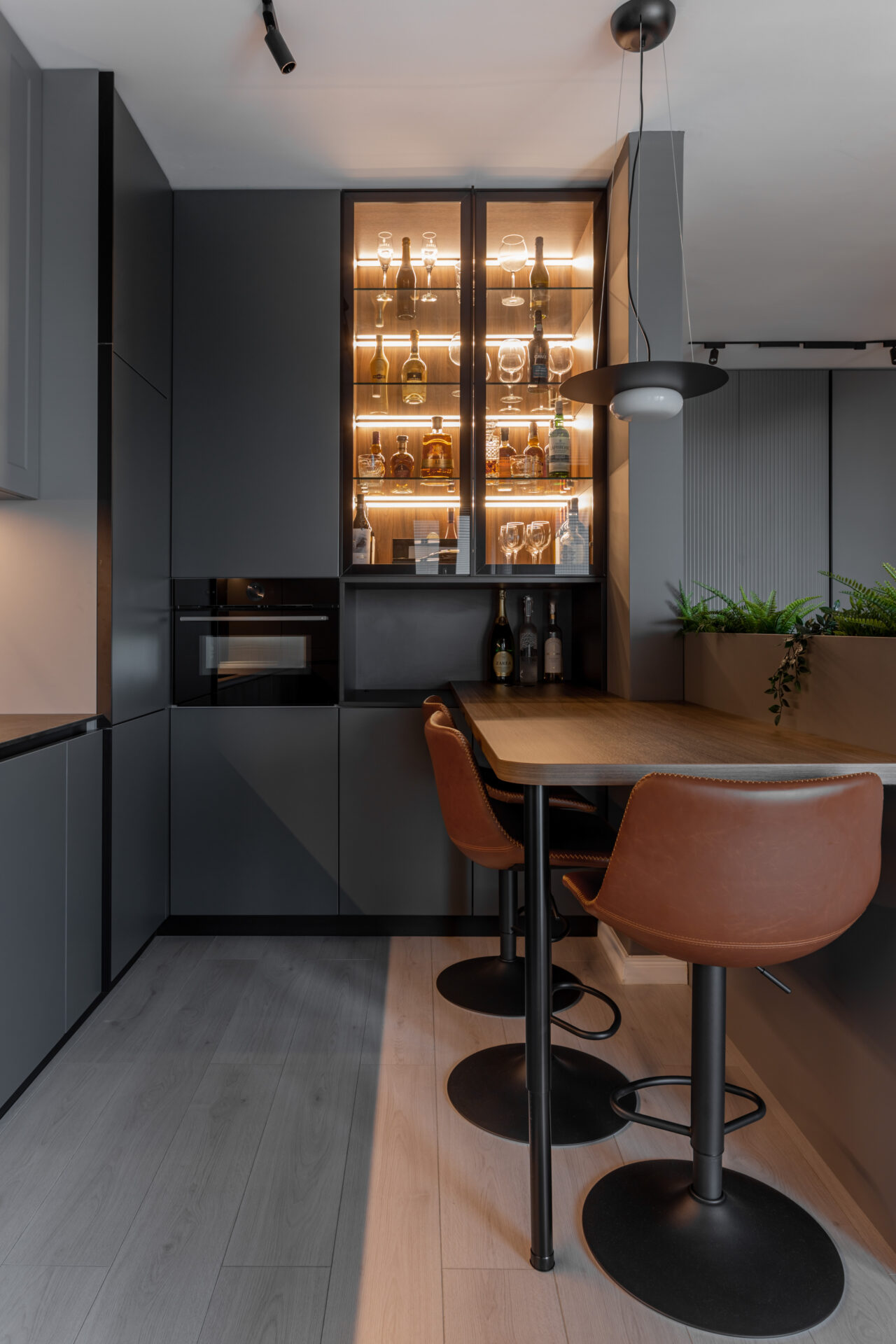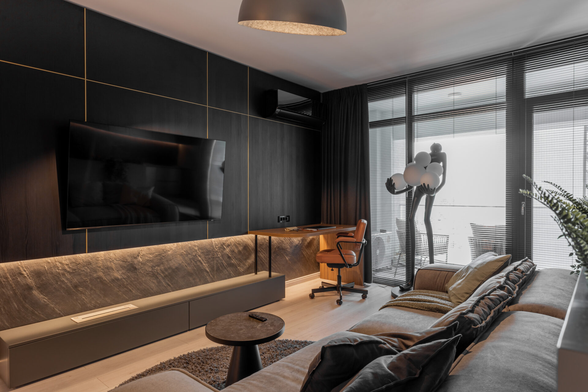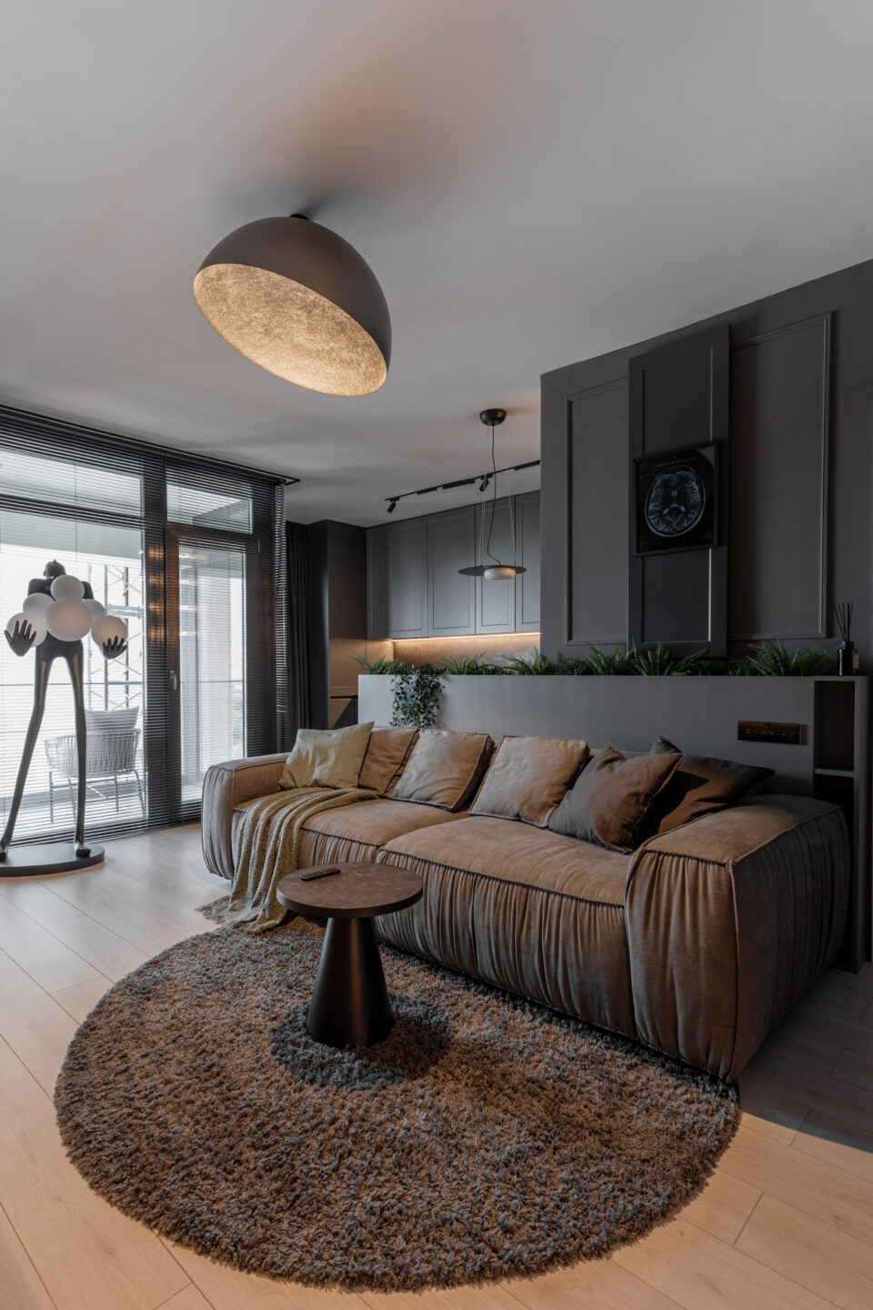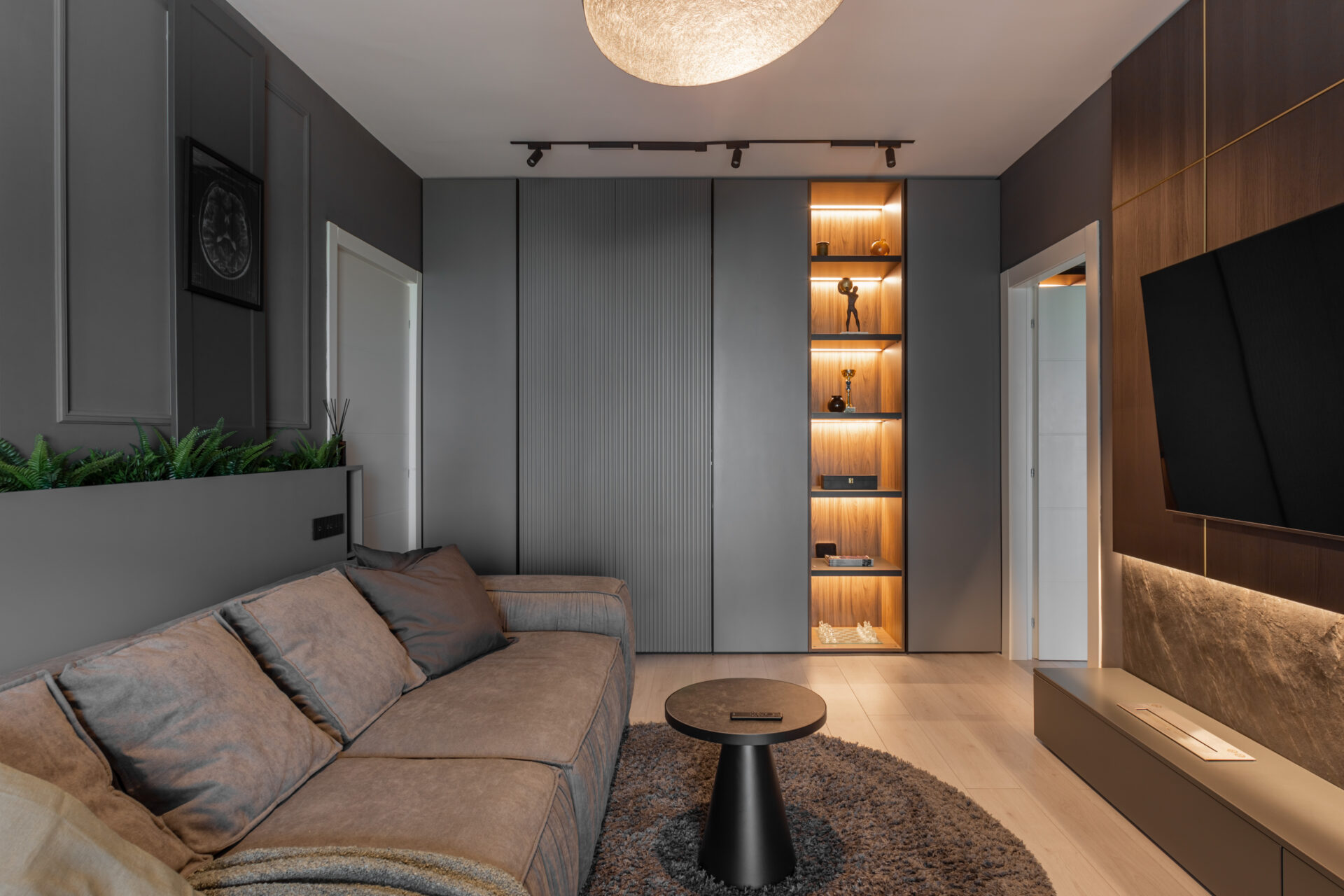 Amenajarea acestui apartament combină funcționalitatea cu un design modern și contemporan. Paleta cromatică închisă, negrul mat și accentele de alamă adaugă personalitate, iar texturile calde echilibrează atmosfera. Spațiile de depozitare integrate inteligent și detaliile Premium creează un ansamblu unitar, perfect pentru un stil de viață dinamic.
