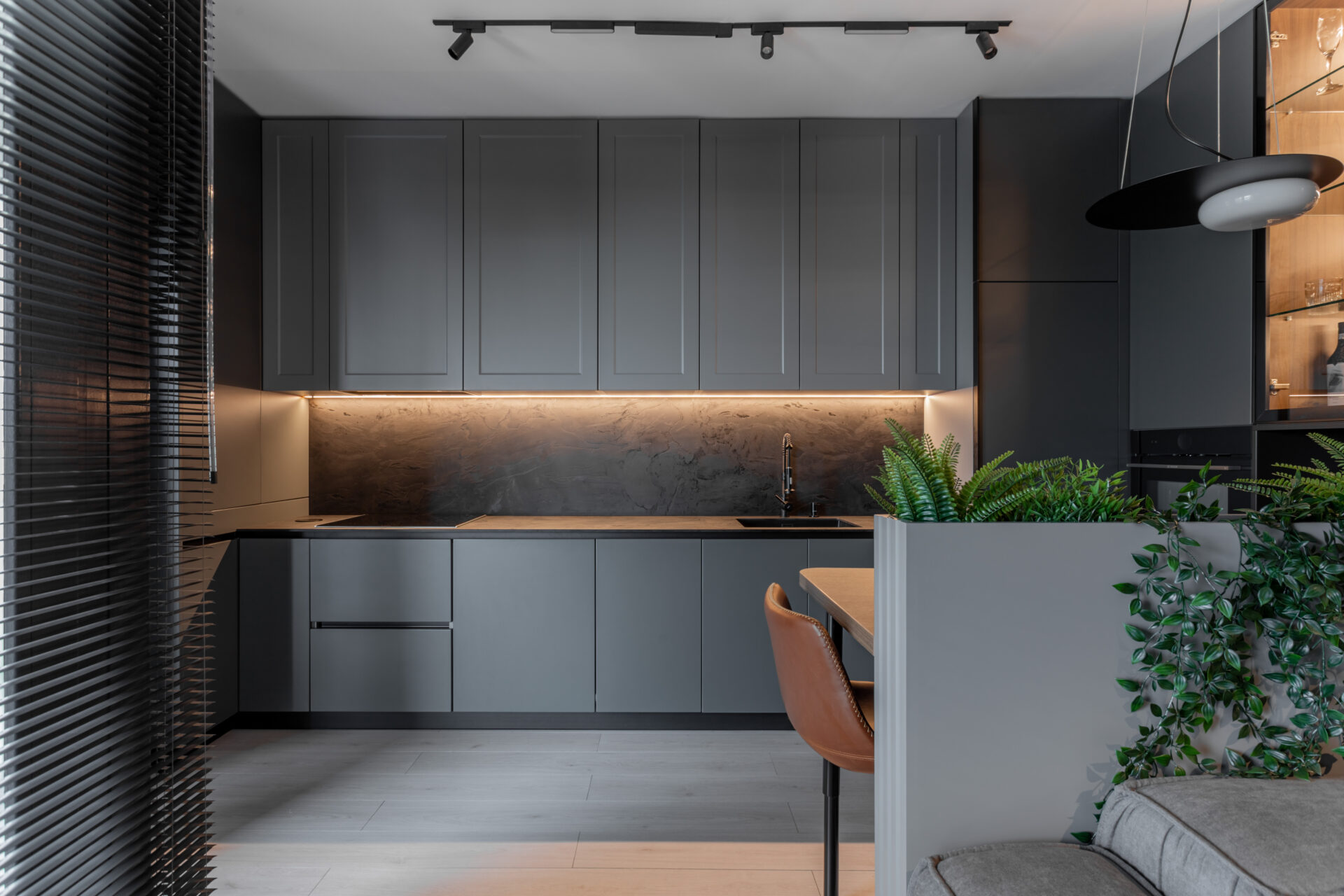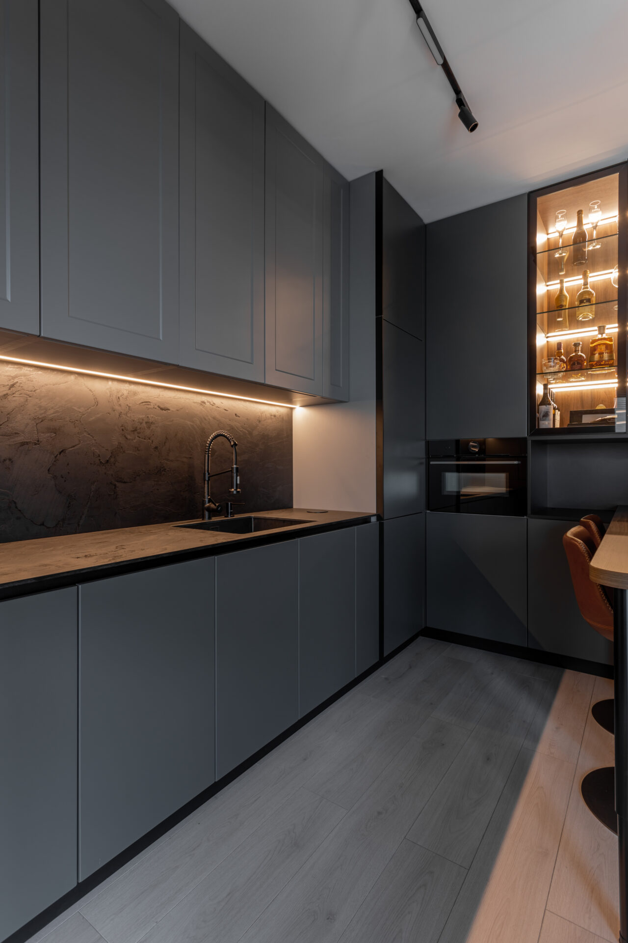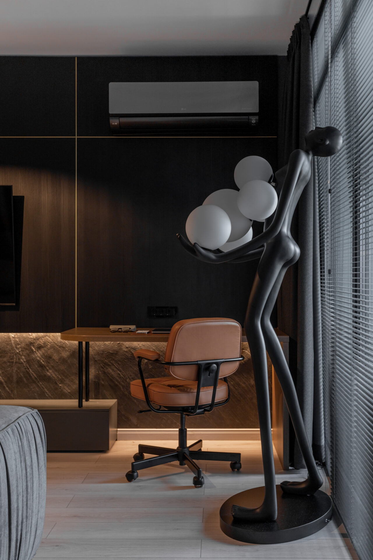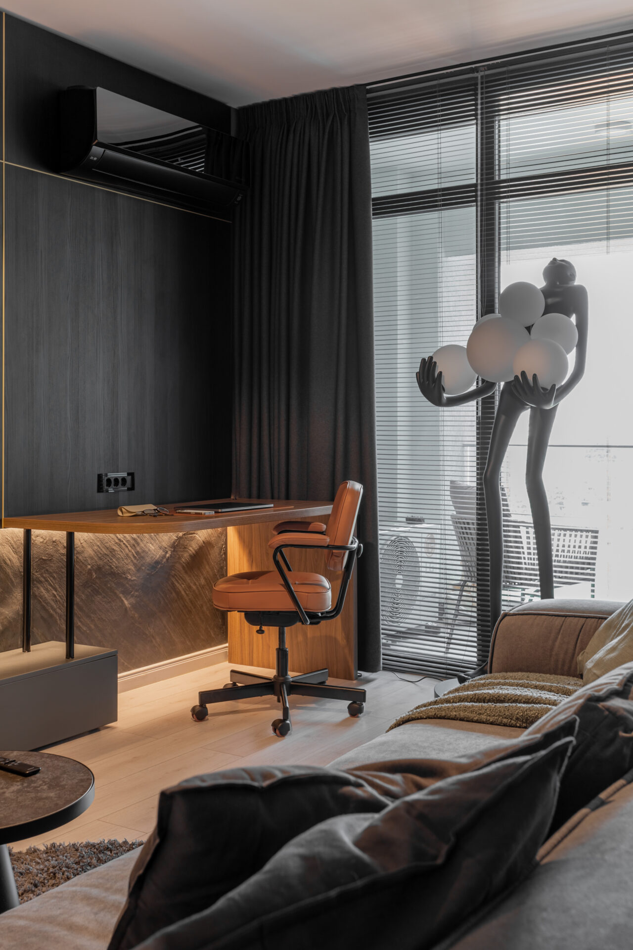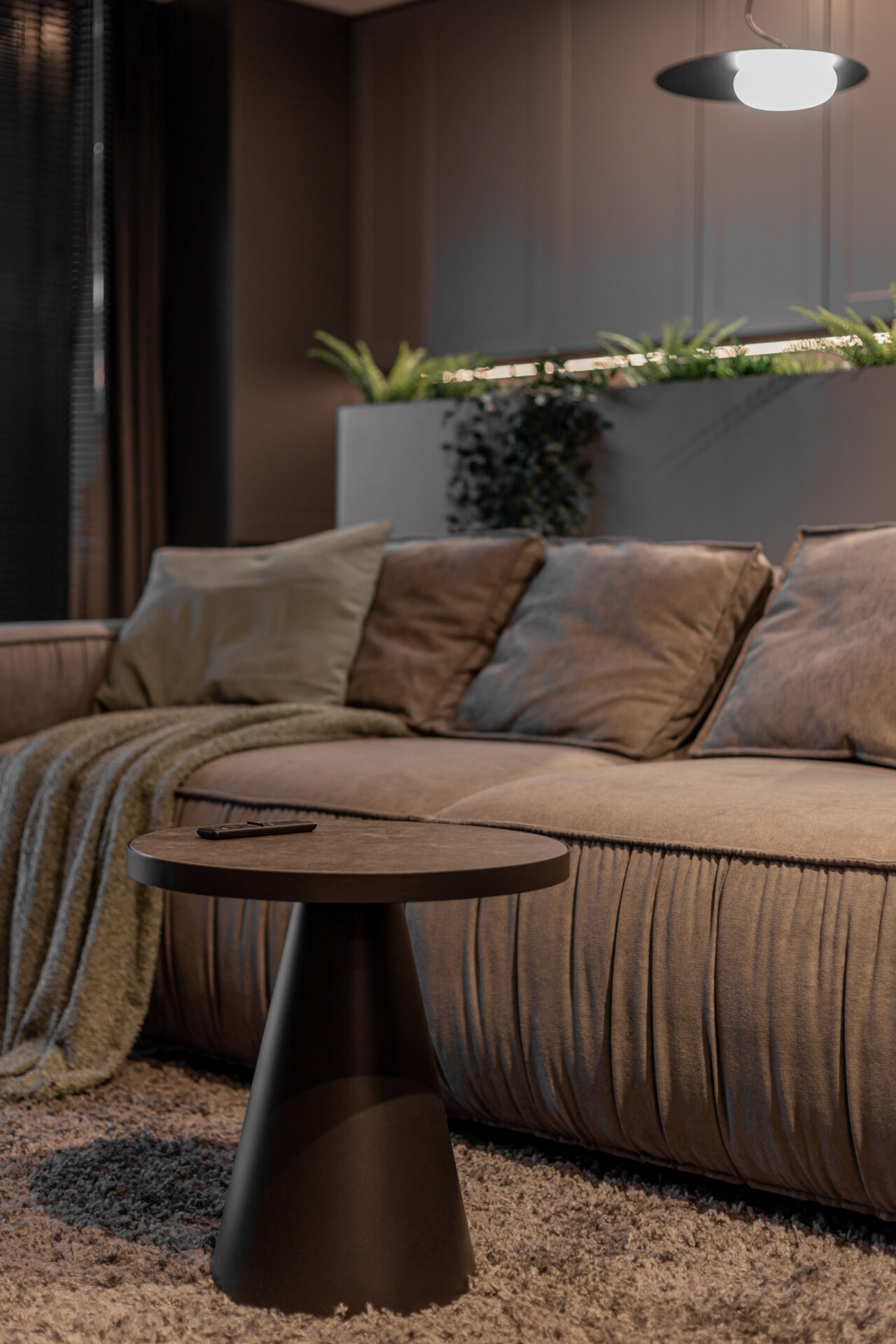 Amenajarea acestui apartament combină funcționalitatea cu un design modern și contemporan. Paleta cromatică închisă, negrul mat și accentele de alamă adaugă personalitate, iar texturile calde echilibrează atmosfera. Spațiile de depozitare integrate inteligent și detaliile Premium creează un ansamblu unitar, perfect pentru un stil de viață dinamic.