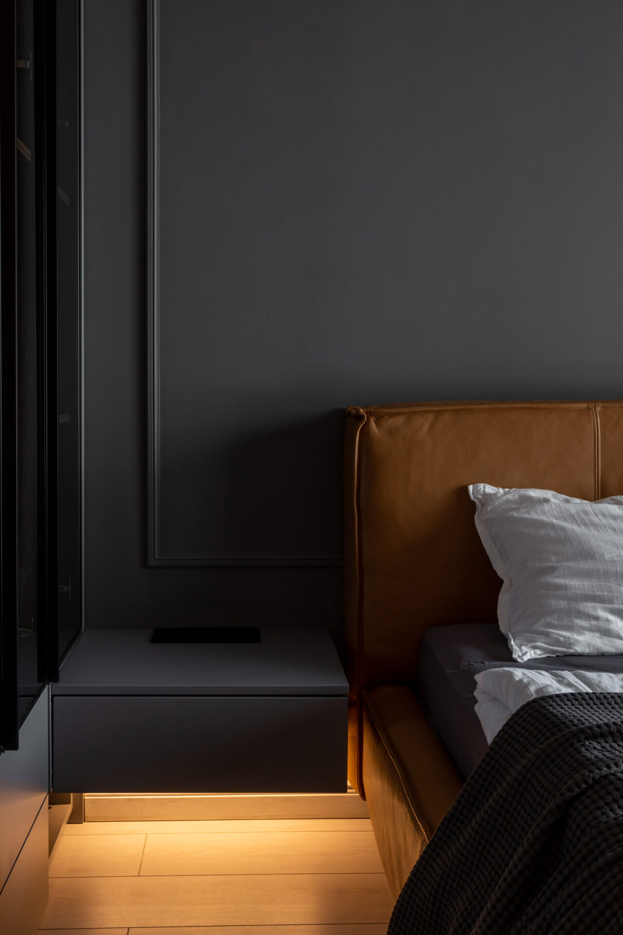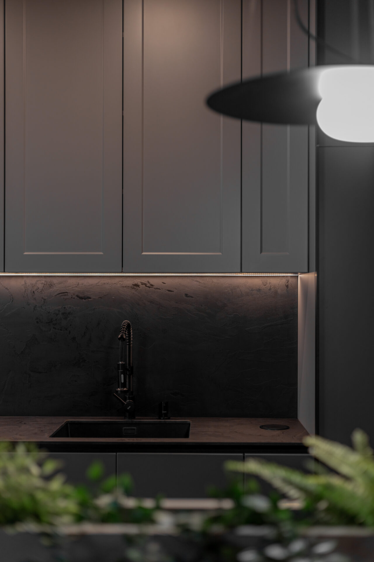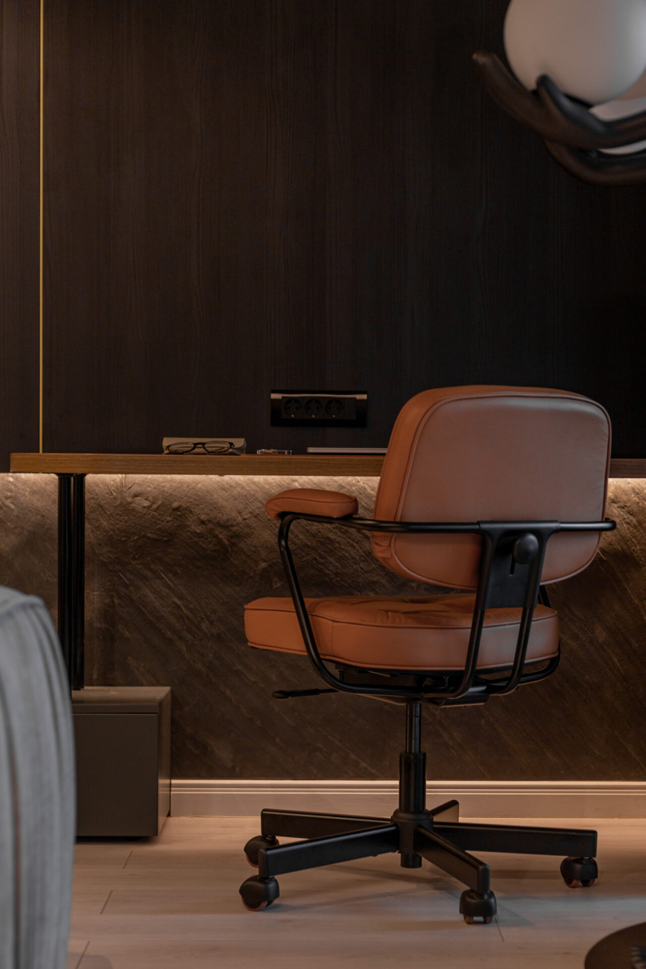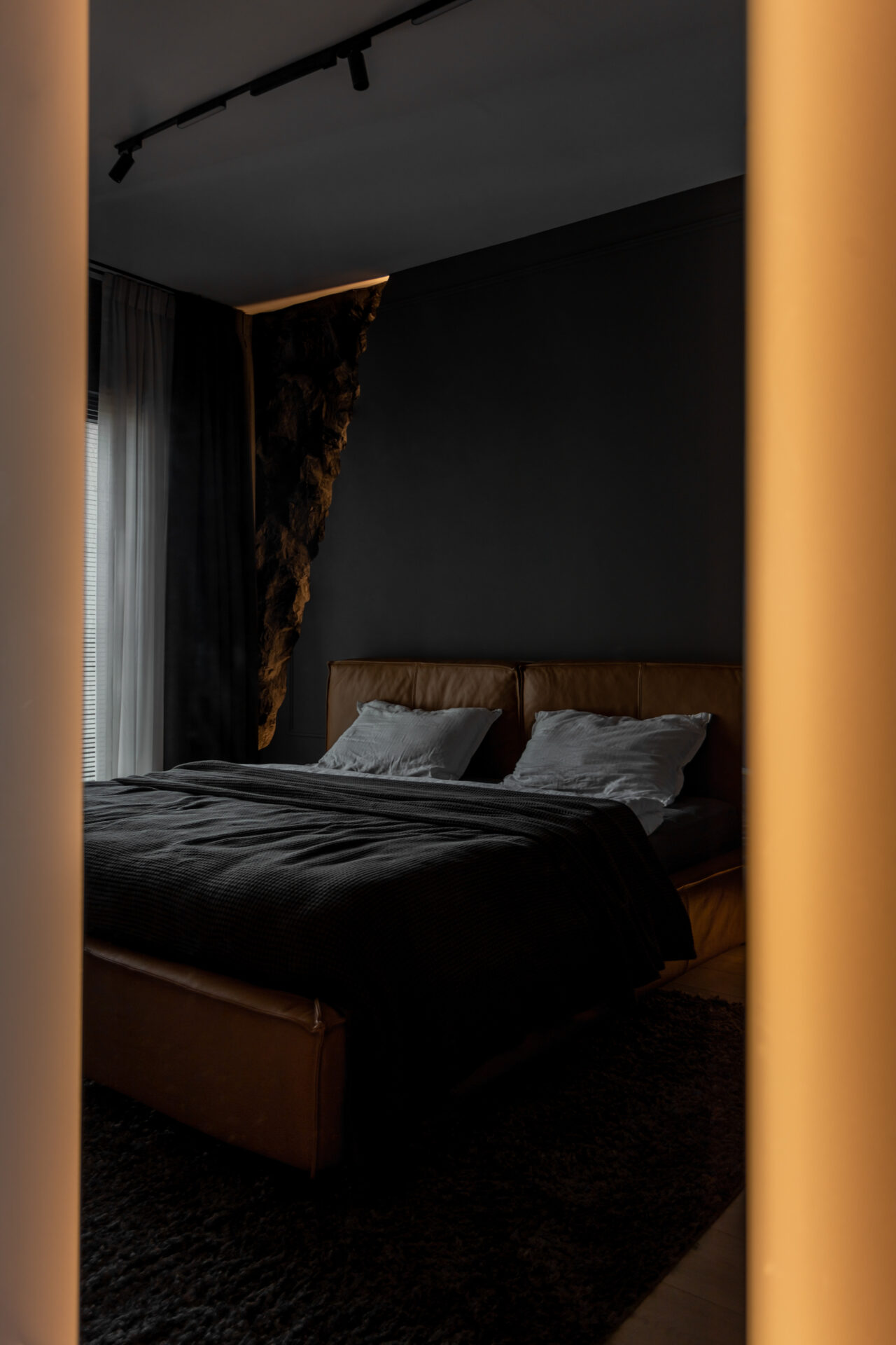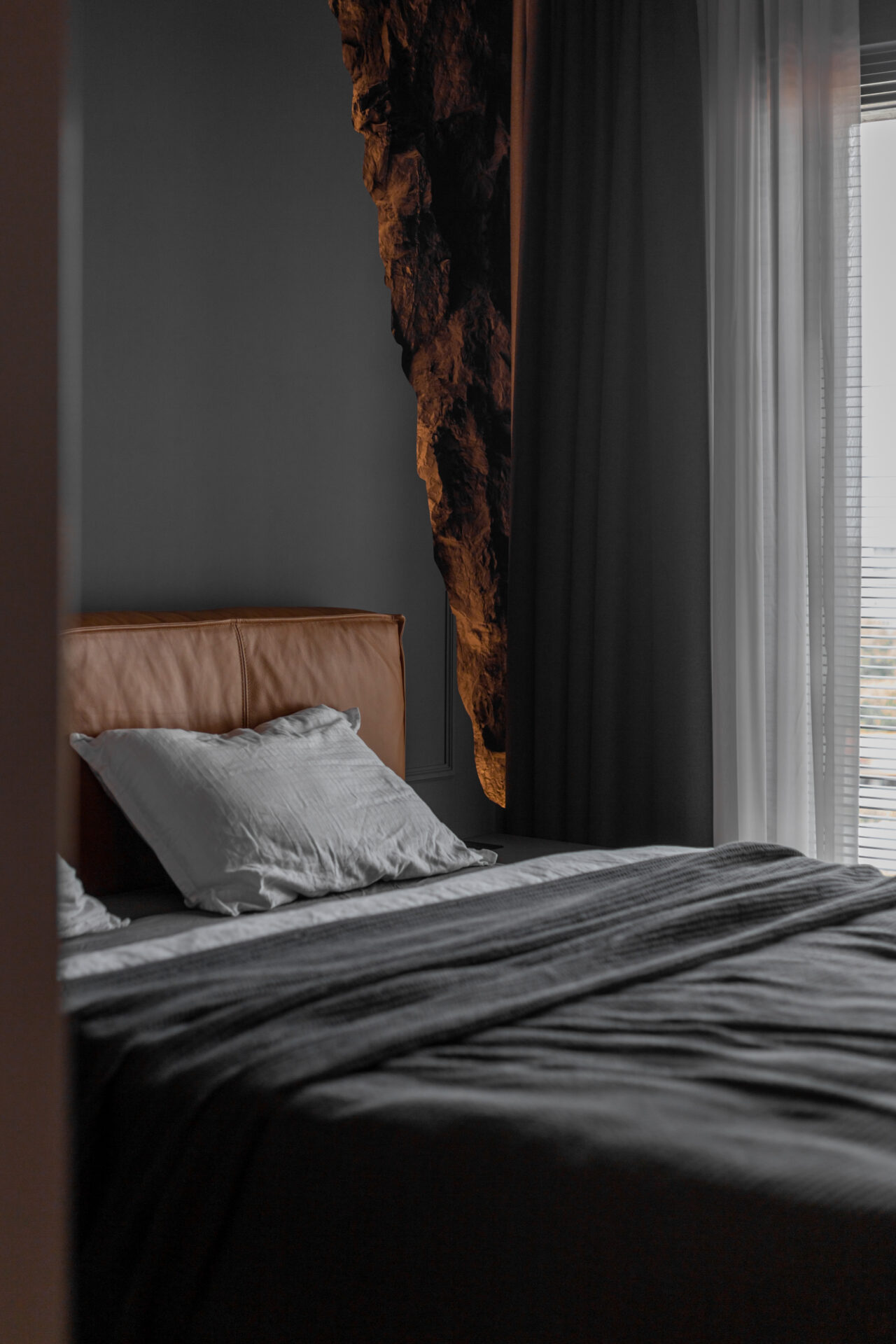 Livingul este conceput ca un spațiu central, dedicat atât relaxării, cât și activităților zilnice. Canapeaua generoasă, combinată cu un birou discret, transformă încăperea într-un loc multifuncțional, ideal pentru momentele de liniște sau sarcinile de lucru din viață de zi cu zi a beneficiarului. Atmosfera este completată de luminile calde, care induc o senzație de confort și intimitate. Un corp de iluminat sculptural adaugă o notă de creativitate, devenind un punct de atracție în amenajare. În zona TV-ului, ardezia flexibilă, accentuată de iluminarea LED integrată, conferă un efect vizual spectaculos și textură. Combinația de perdele vaporoase, draperii și jaluzele metalice orizontale creează un joc subtil de transparență și umbră, aducând un echilibru între eleganță și funcționalitate. Fiecare detaliu este gândit pentru a transforma livingul într-un spațiu cu adevărat personal și primitor. Livingul se prelungește armonios în bucătărie, cele două zone fiind delimitate subtil de o jardinieră realizată din MDF vopsit. În spatele acesteia se află zona de luat masa, care se integrează perfect cu spațiile de depozitare ale bucătăriei. Blatul se continuă fluid în această zonă, conectându-se cu o vitrină elegantă. Electrocasnicele sunt complet încastrate, accentul fiind pus pe liniile simple ale fronturilor. Textura frezată a corpurilor suspendate adaugă un plus de dinamism. Pentru a introduce un element premium, blatul și contra blatul din HPL compact cu aspect de rocă creează o tranziție naturală spre textura similară utilizată în dormitor, consolidând coerența întregii amenajări. Dormitorul continuă paleta masculină a apartamentului, completată de un contrast puternic prin patul din piele naturală, într-o nuanță caldă de cognac. Elementul central al camerei este un perete captivant, care dezvăluie o textură spectaculoasă de rocă naturală, evidențiată de benzile LED cu lumină caldă și iluminatul arhitectural atent poziționat. Pentru a echilibra aspectul brut al rocii, s-a optat pentru un ansamblu simplu de ancadramente, care adaugă un aer elegant și rafinat, temperând în același timp textura și conferind spațiului o atmosferă armonioasă și sofisticată.