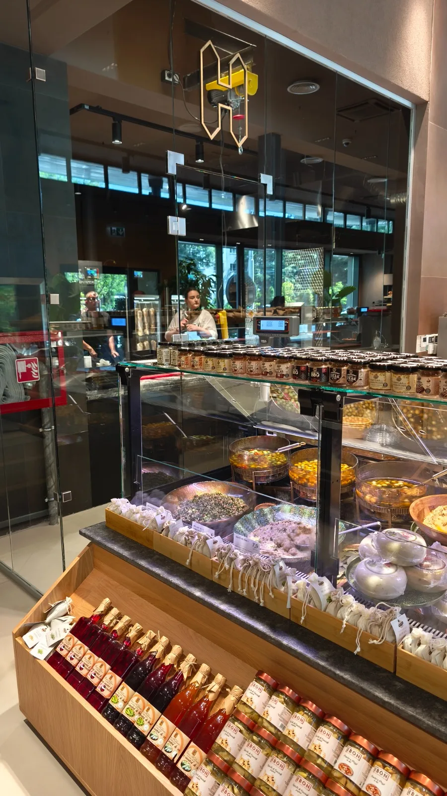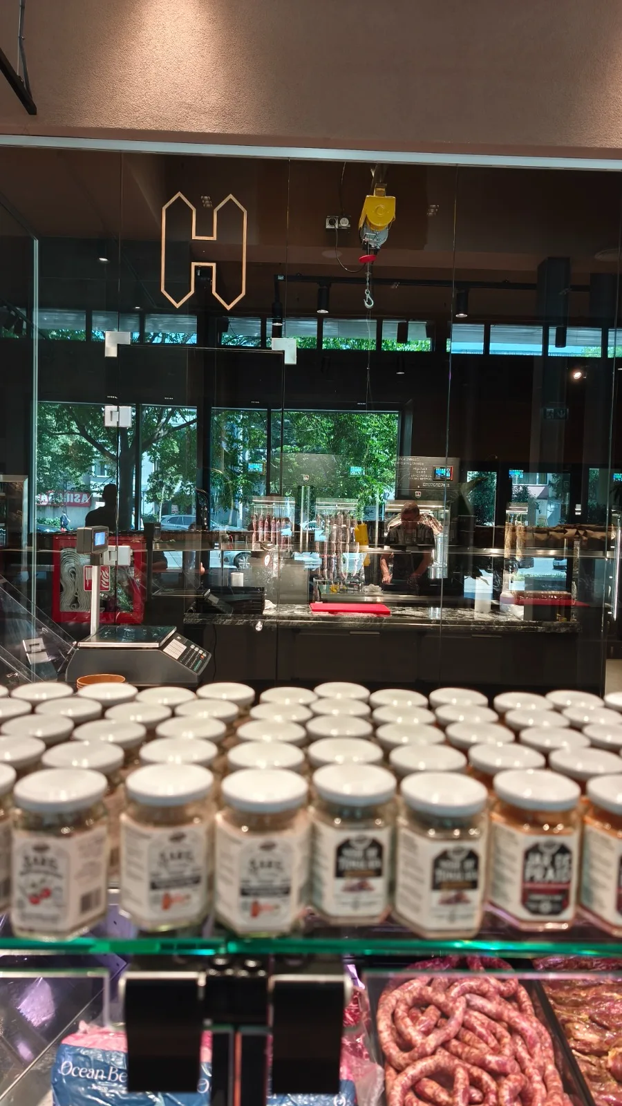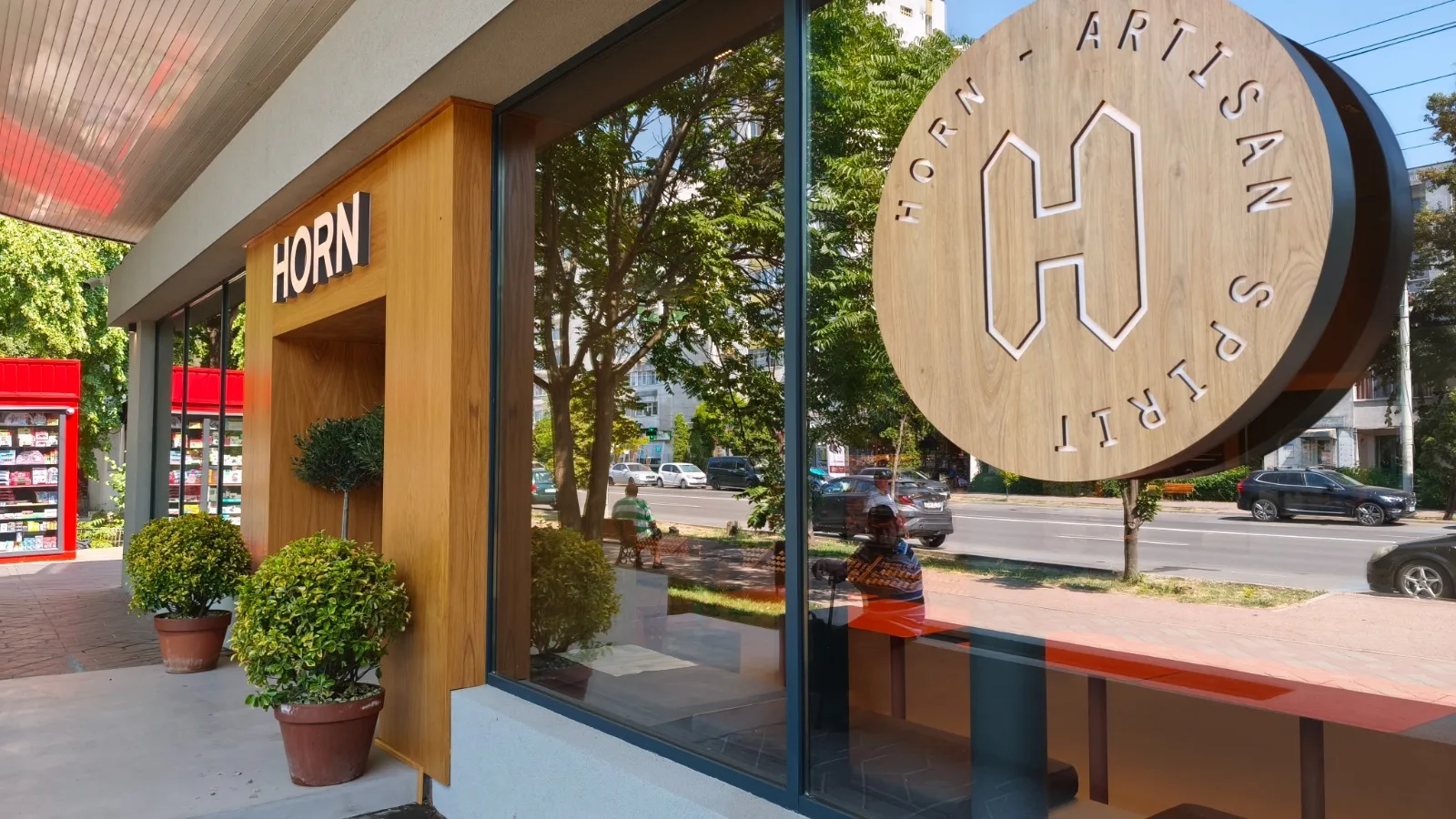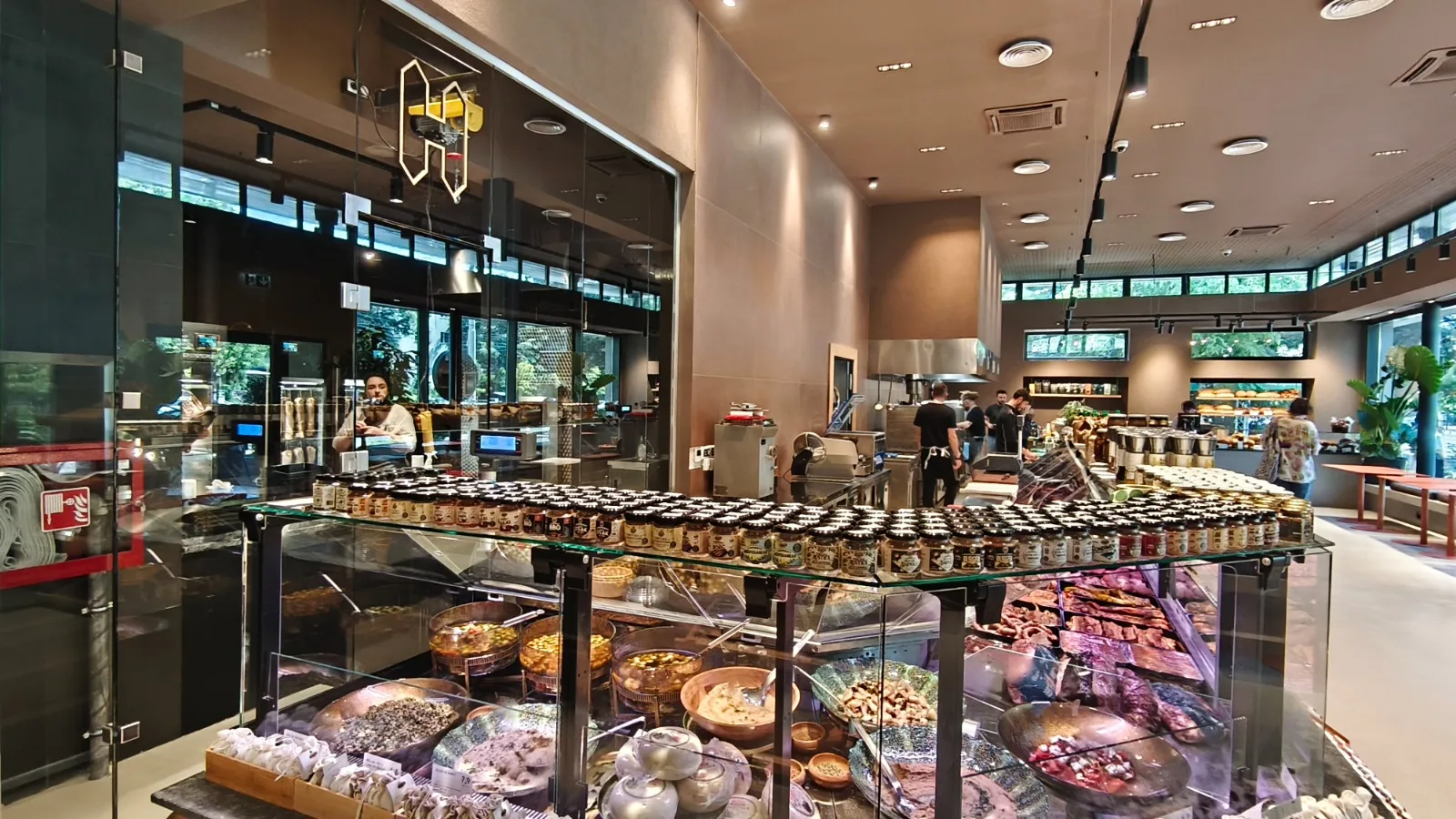 Designul proiectului HORN — Artisan Meat & Delicatessen, realizat de NEO Proiect, este unul minimalist, construit pe o paletă de materiale naturale și finisaje discrete. Pardoseala din microciment asigură continuitate vizuală și un fundal neutru, în timp ce pereții finisați cu tencuieli pe bază de argilă contribuie la un ambient cald și autentic.
