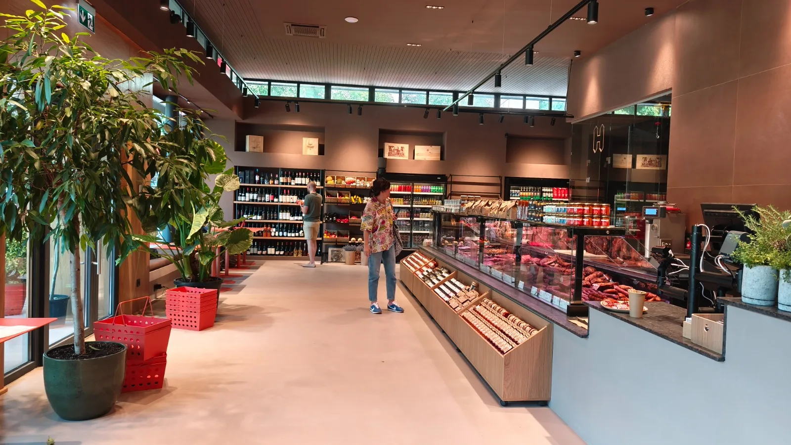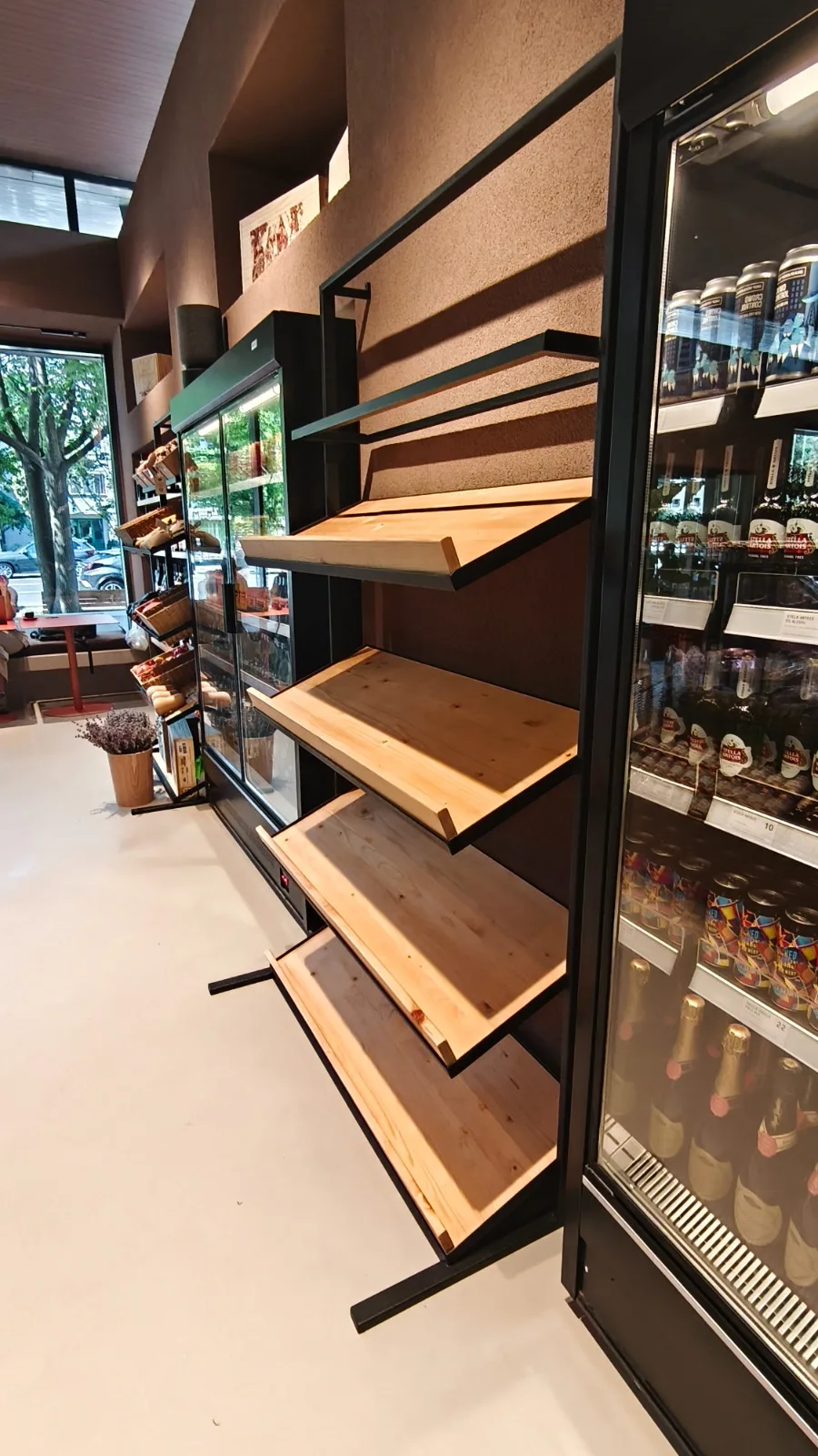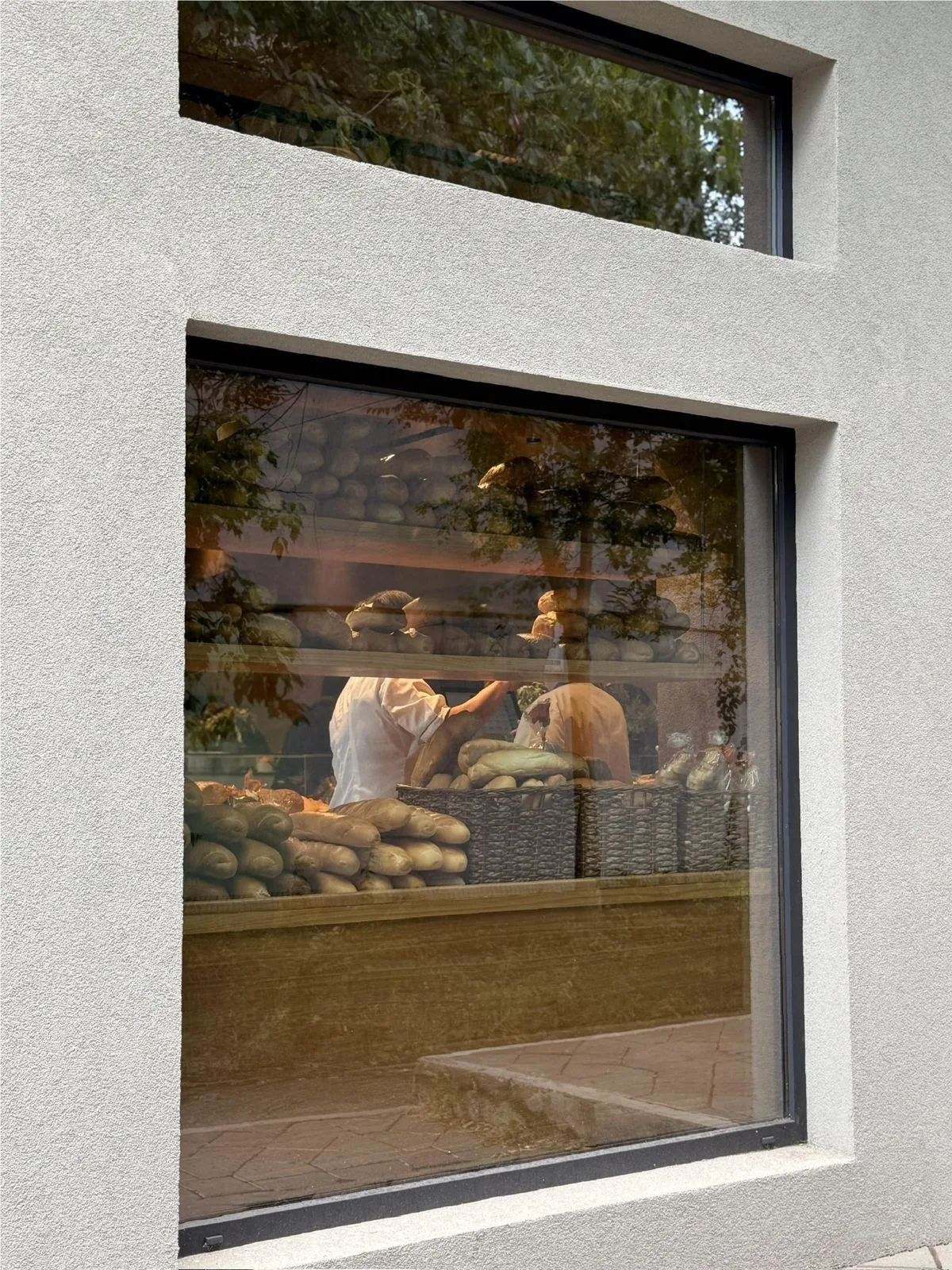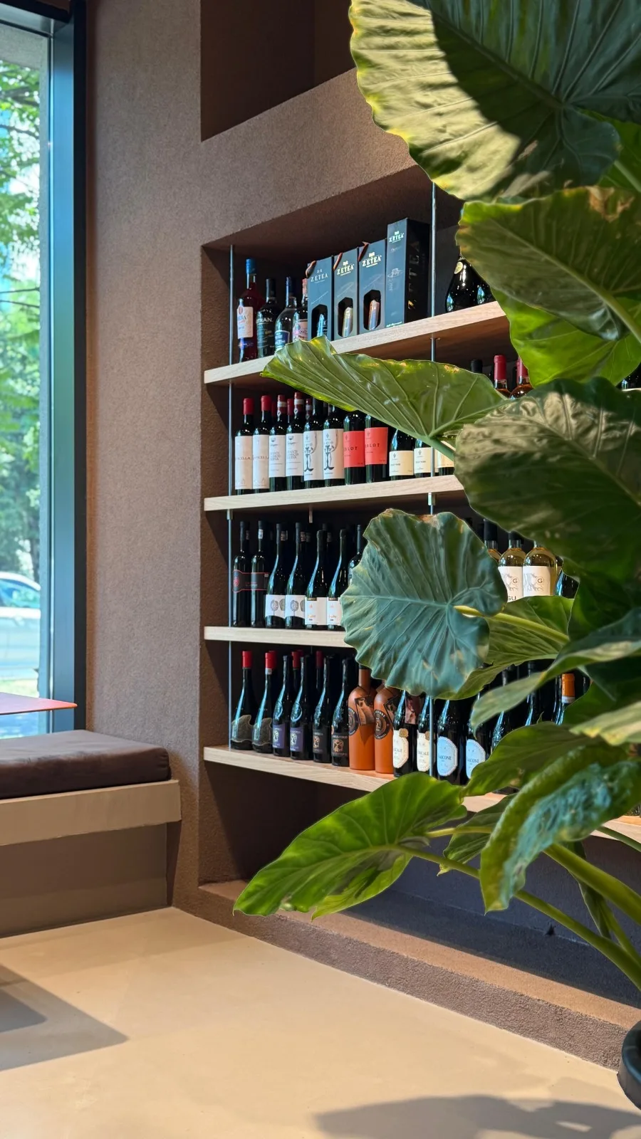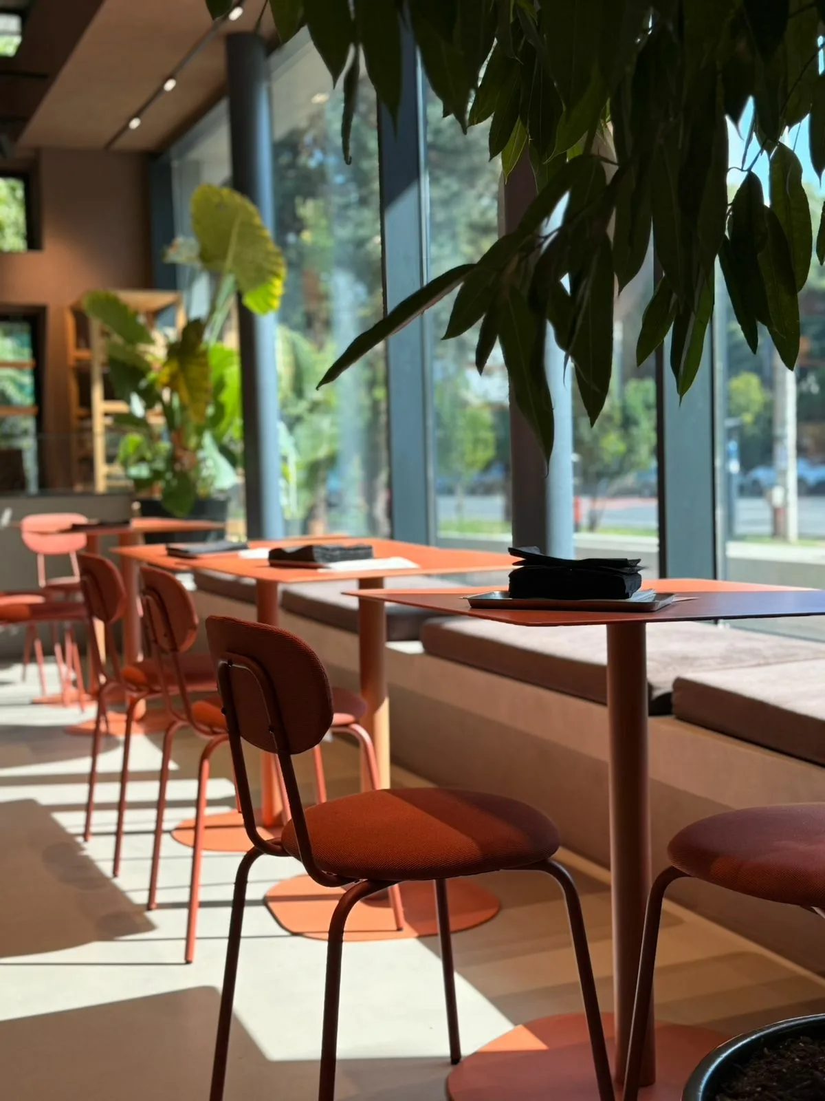 Placările cu furnir de stejar fac trimitere subtilă la culoarea grâului și la universul produselor de panificație, consolidând legătura dintre materie primă, tradiție și prezentare contemporană. Accentele de culoare terracota, prezente în mobilierulul custom made, împreună cu utilizarea plantelor naturale, adaugă profunzime vizuală și un caracter prietenos spațiului. Întregul concept este gândit pentru a crea un cadru echilibrat, natural și coerent, în care produsele rămân elementul central al experienței.