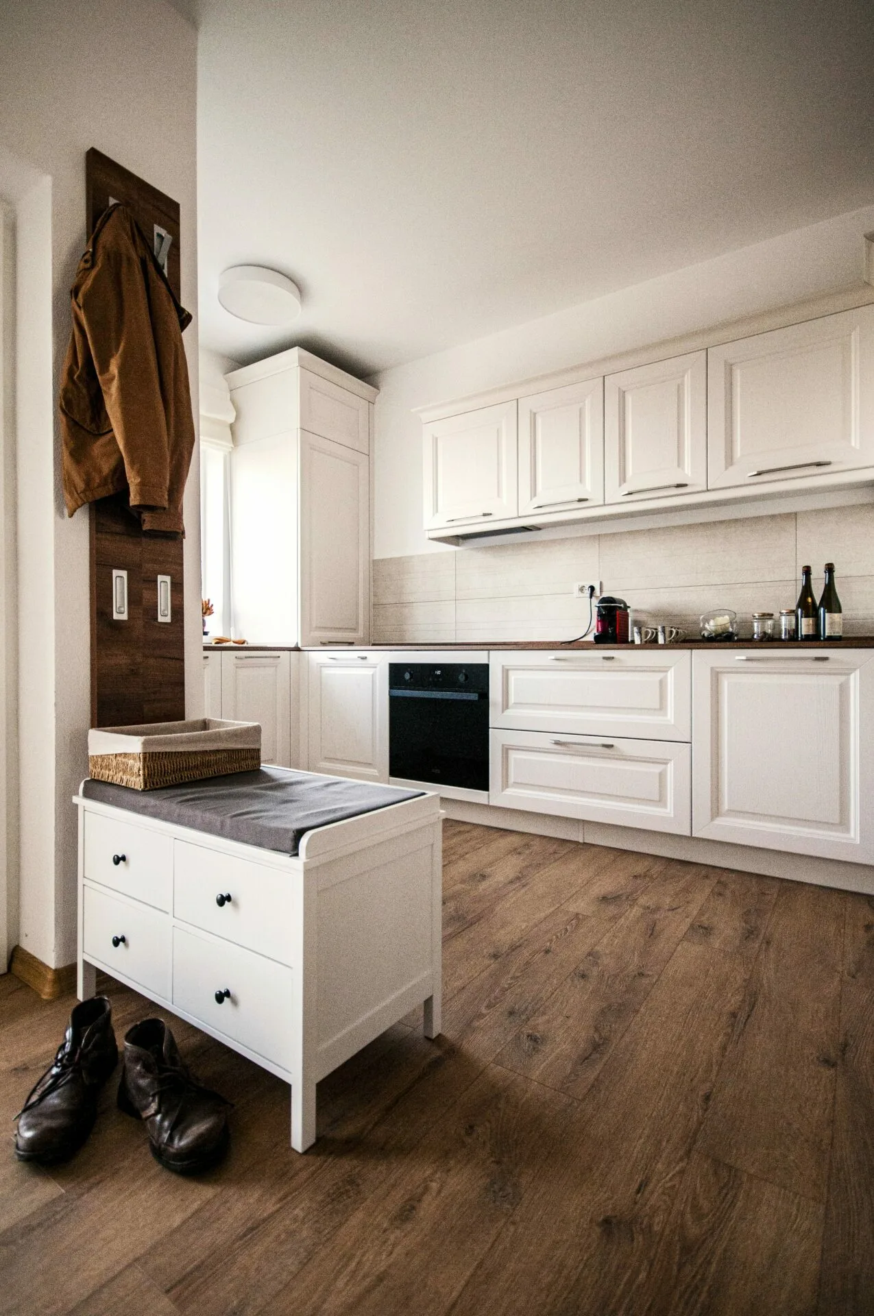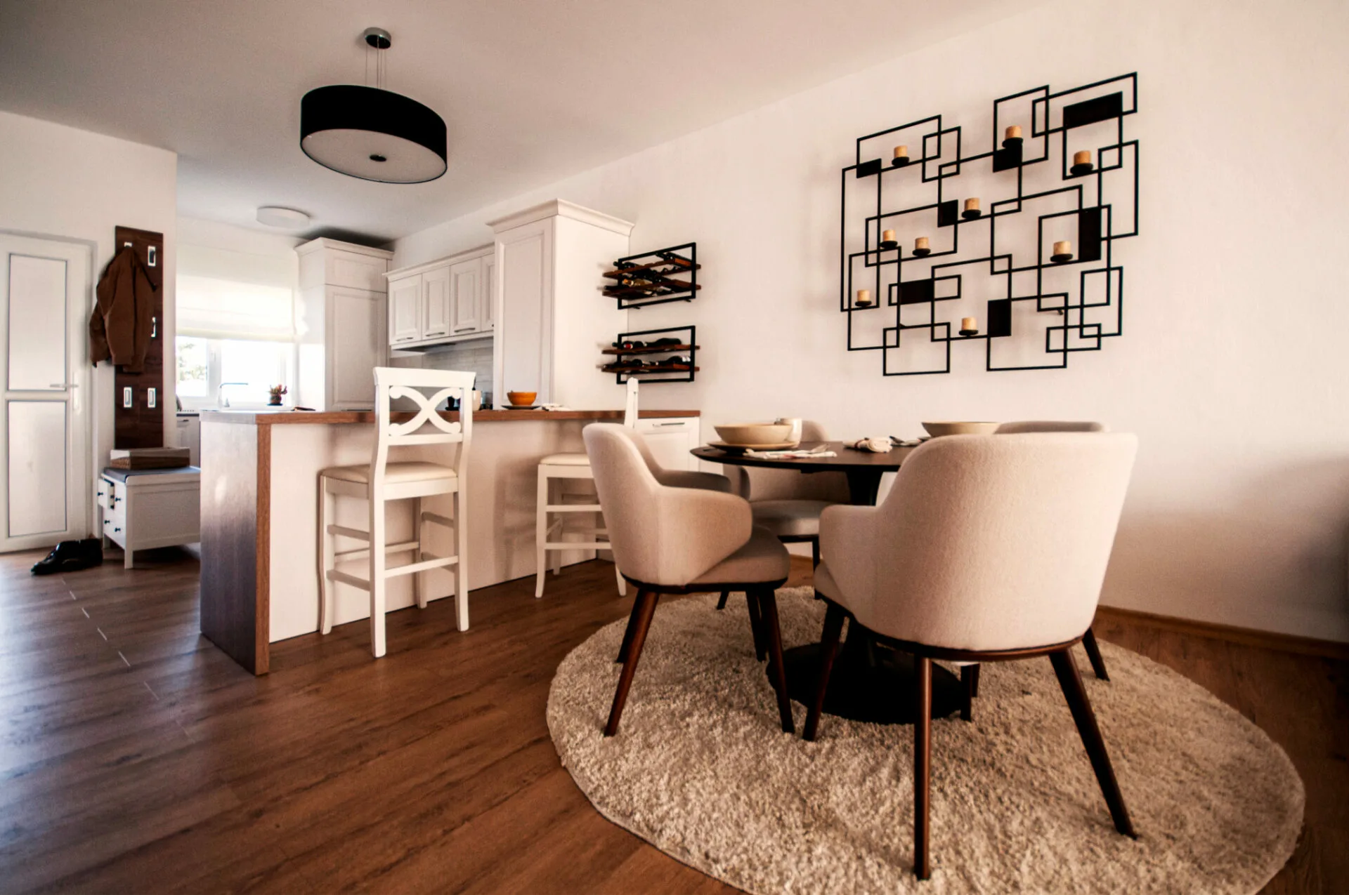 Proiectul își propune să ilustreze o poveste despre echilibru, liniște și identitate spațială. Fiecare element a fost gândit pentru a crea o atmosferă în care lumina modelează volumul, iar materialele naturale aduc sinceritate și calm. Intenția a fost construirea unui spațiu care nu doar funcționează, ci transmite și o stare, aceea de refugiu autentic, eliberat de aglomerație vizuală și ancorat într-o estetică curată, coerentă și caldă. Tema de proiectare a avut ca și obiectiv amenajarea unui open space deja finisat, transformat într-un interior capabil să răspundă nevoilor esențiale ale unei case de vacanță. Clienții își doreau un ambient primitor, luminos și apropiat de atmosfera unui modern cottage, în care confortul și simplitatea contemporană să se împletească armonios. Una dintre provocările centrale a fost integrarea tuturor funcțiunilor dorite într-un spațiu restrâns. A fost necesară o gestionare atentă a fiecărui metru pătrat, astfel încât insula de bucătărie, zona dedicată locului de luat masa și segmentul destinat socializării să se completeze reciproc, rămânând totodată aerisite și unitare. Prin echilibrarea acestor cerințe, proiectul capătă o identitate calmă, luminoasă și coerentă, transformând open space-ul într-un loc care invită la reconectare, relaxare și trăire autentică.