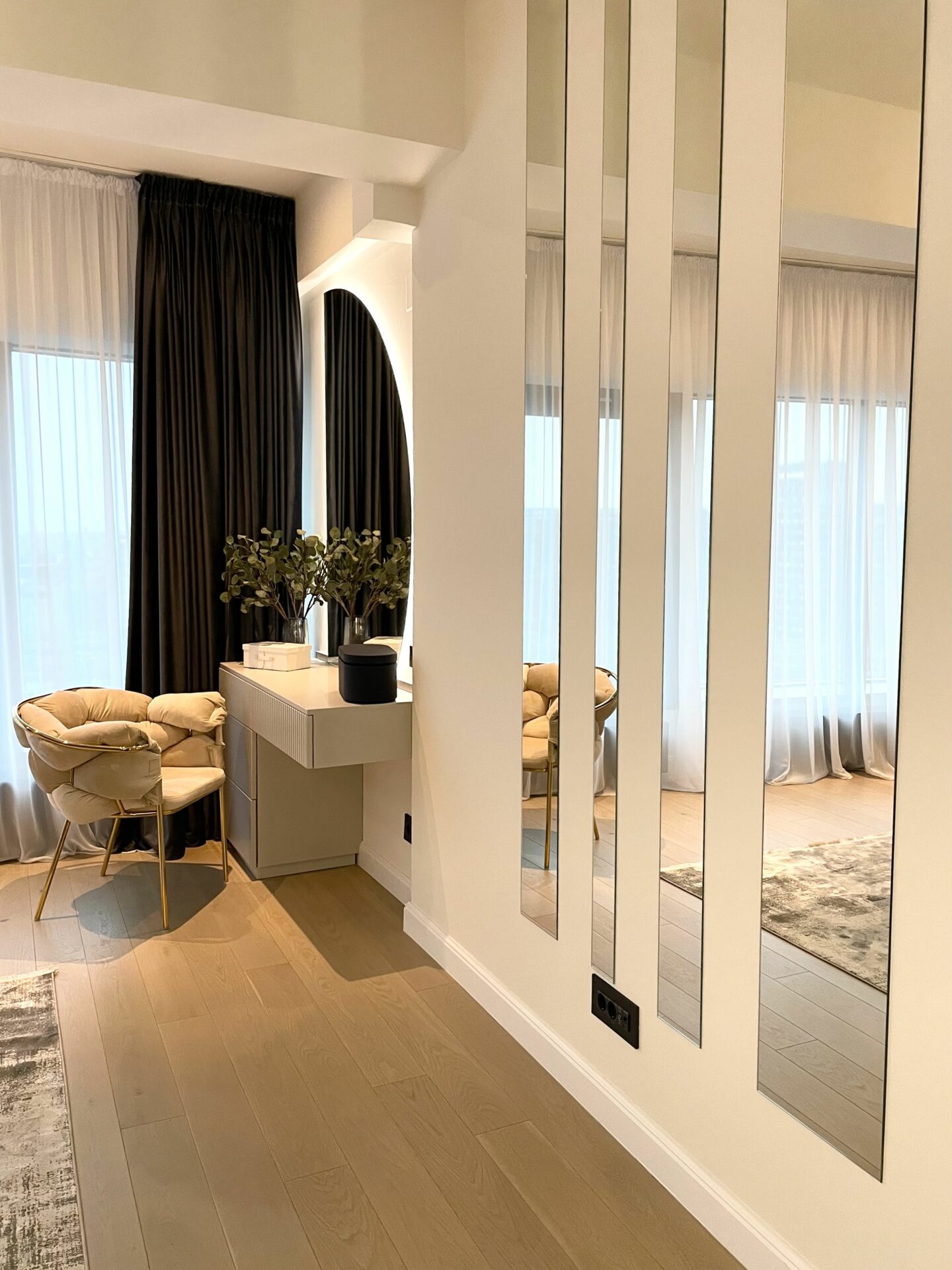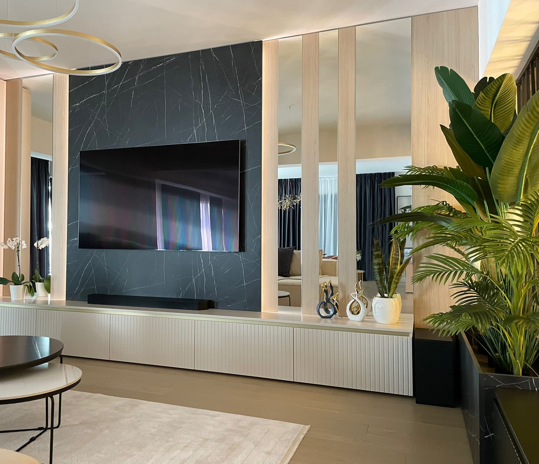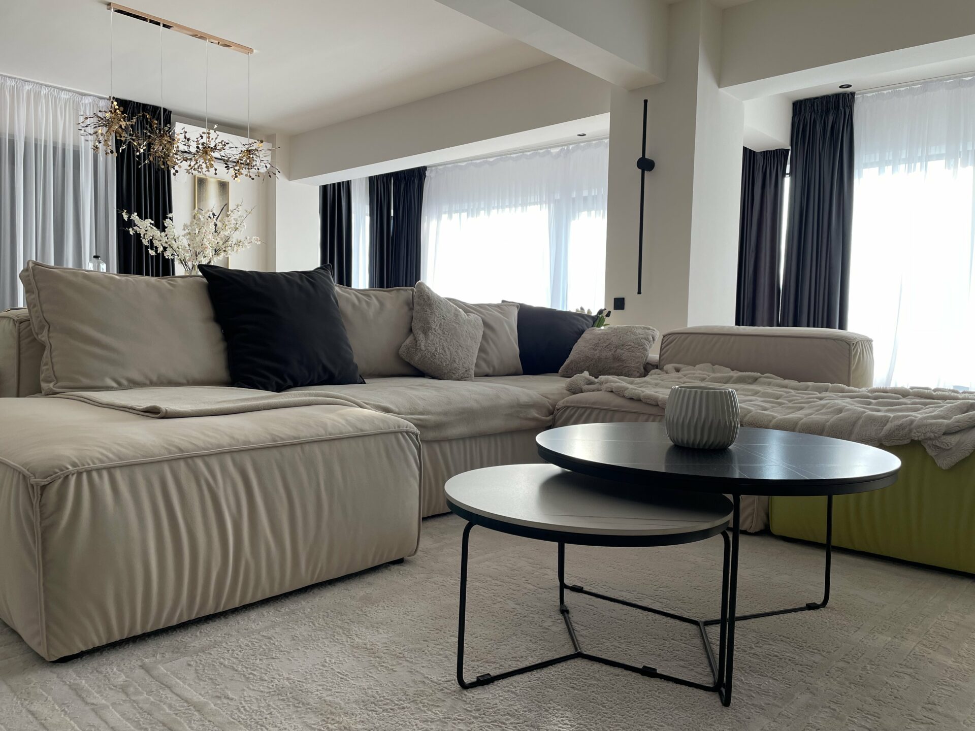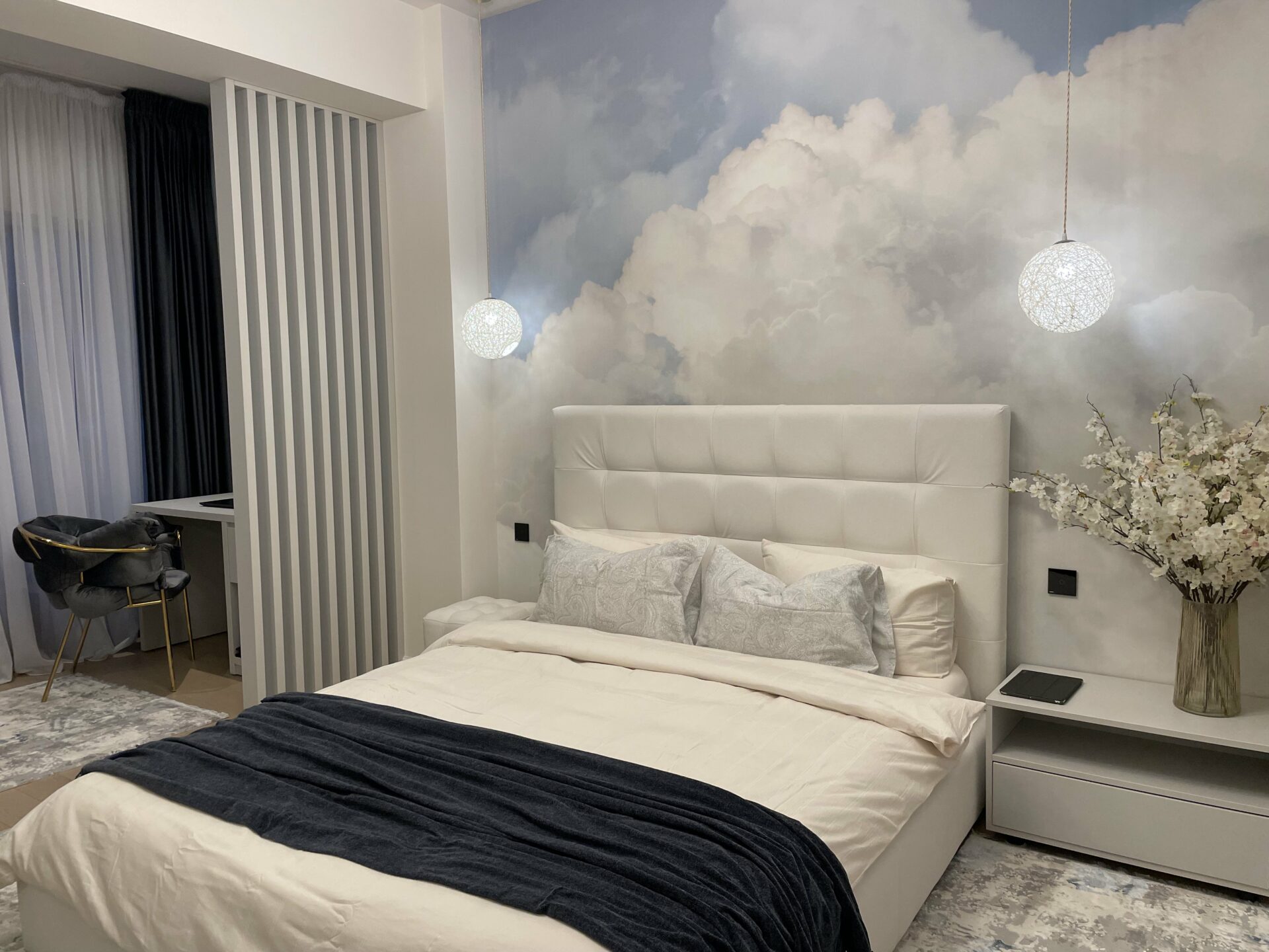 Livingul a fost gândit ca o zonă de relaxare, foarte aerisită, cu o canapea foarte comodă și generoasă. În ambele dormitoare am gândit dressinguri destul de spațioase, elegant separate de zona de dormit. În dormitorul matrimonial, am decis orientarea patului către fereastră, astfel încât beneficiarii să se bucure de priveliștea de afară, separând zona de dormit de cea de dressing printr-un riflaj. Dormitorul cel mic a fost gândit cu dublă destinație: o zonă de escape, beneficiarei i-a plăcut foarte mult ideea unui tapet cu nori care crează senzația de spațialitate, liniște și relaxare, dar și o zonă de birou pentru zilele de work from home. Beneficiarii și-au dorit o baie în stil modern, alb-negru, în care am inclus plante pentru a da contrast și vitalitate spațiului.