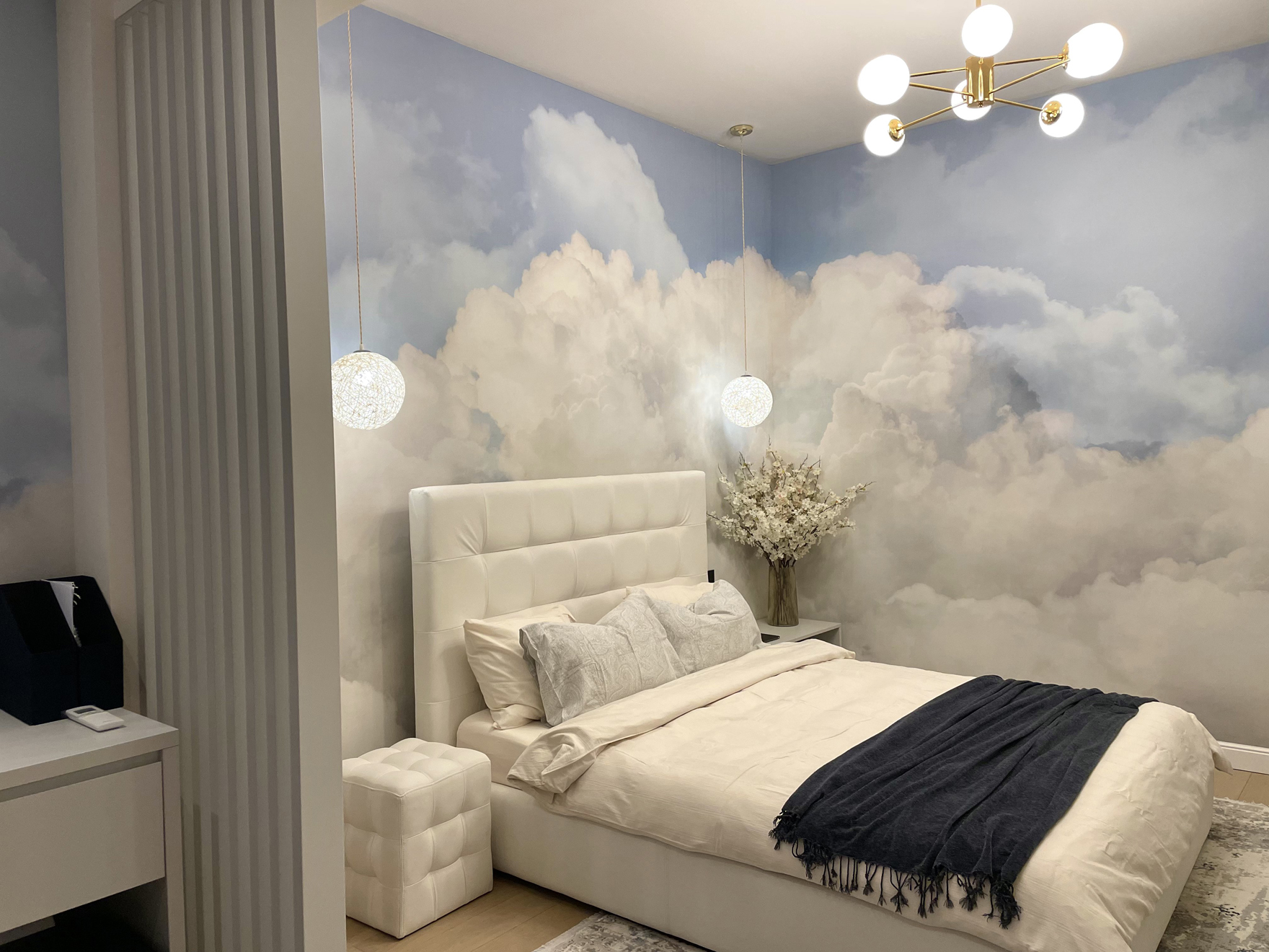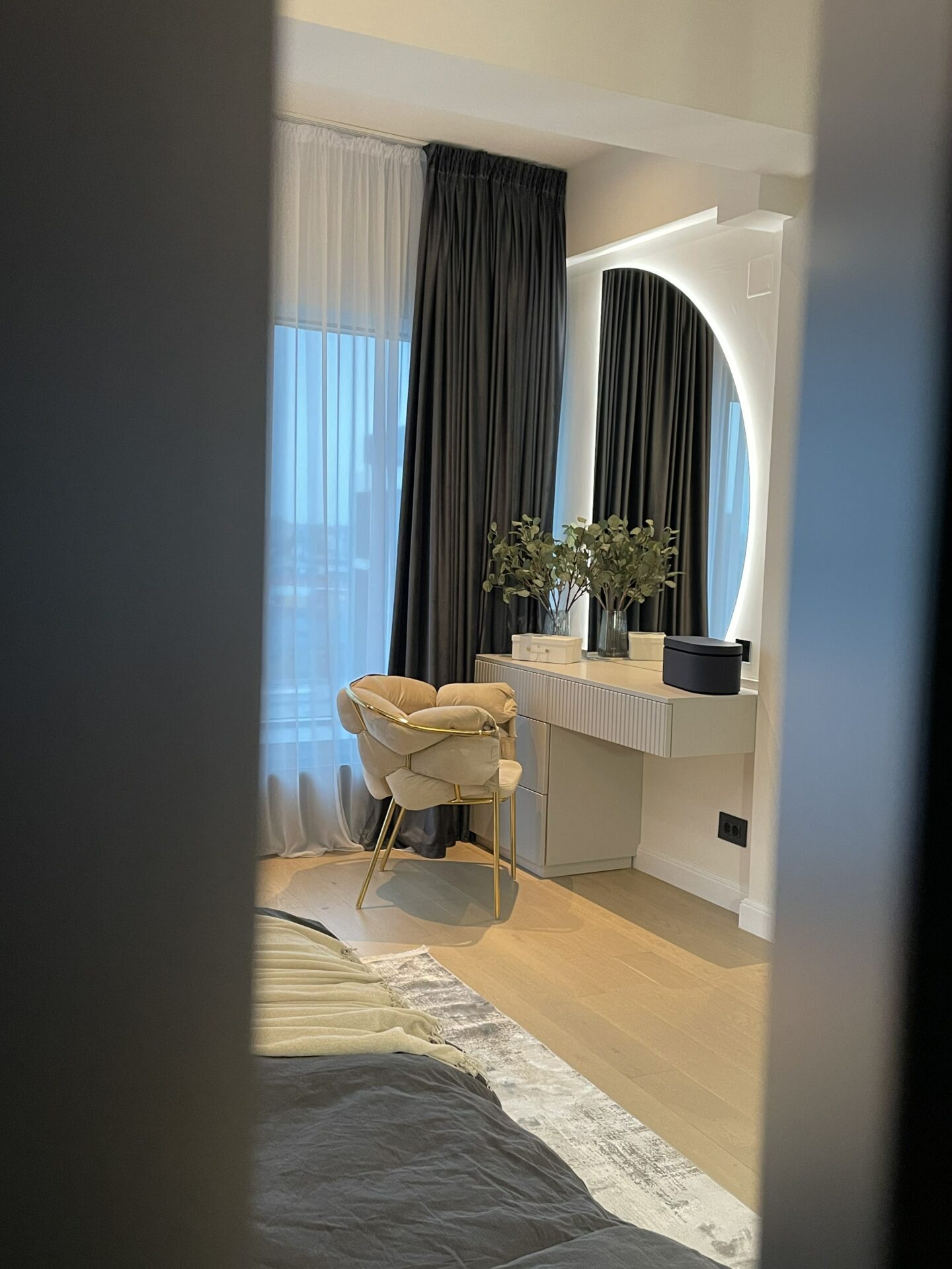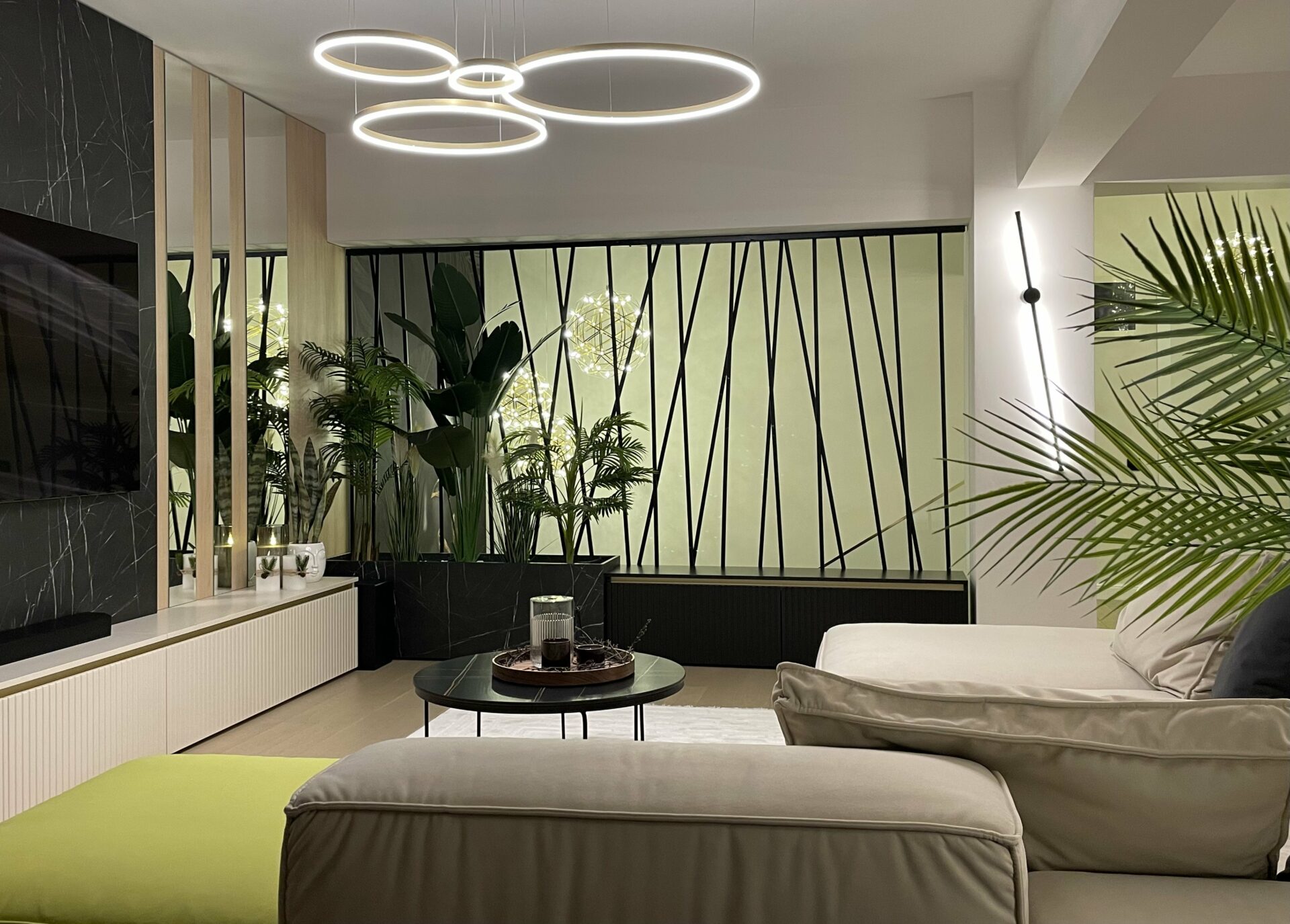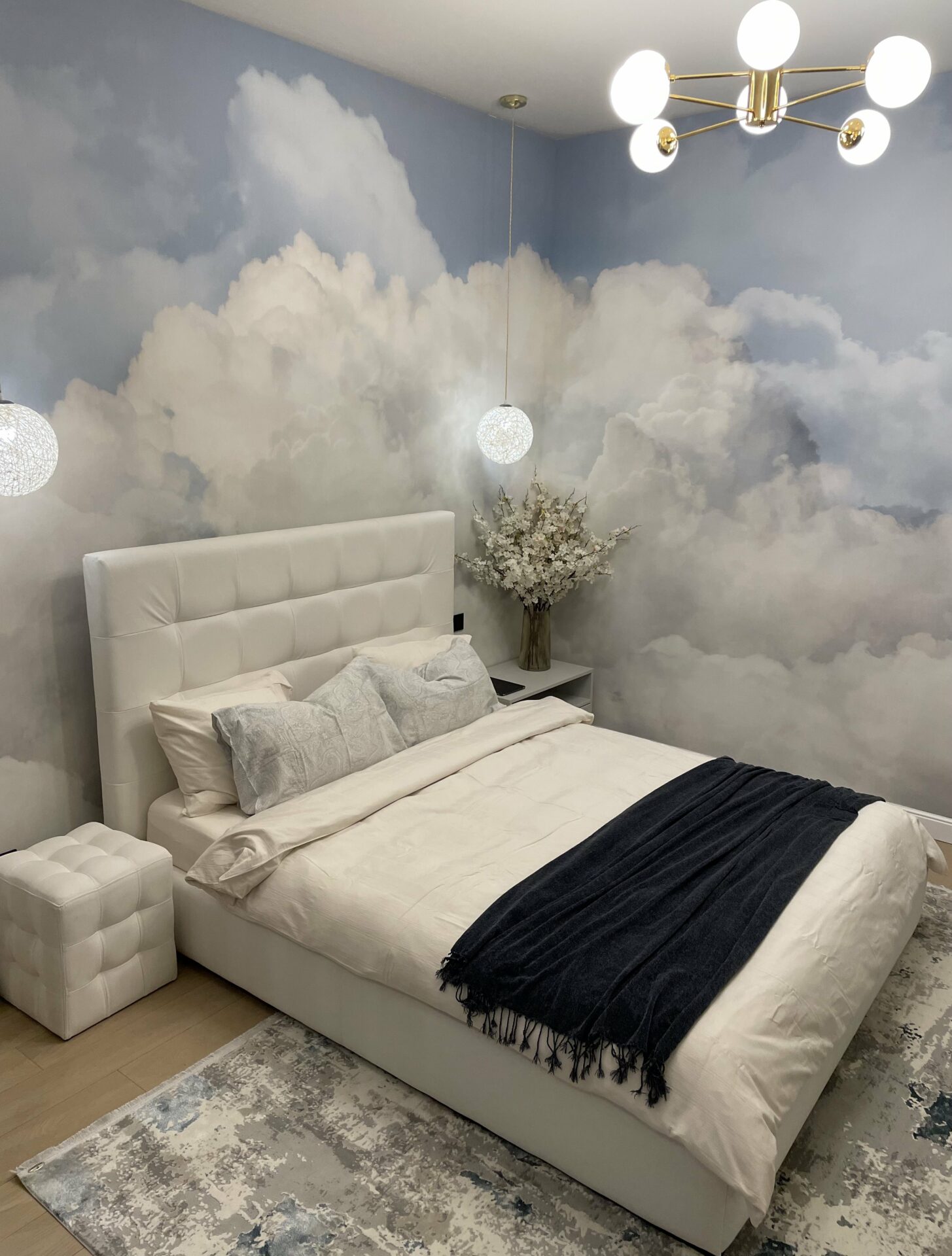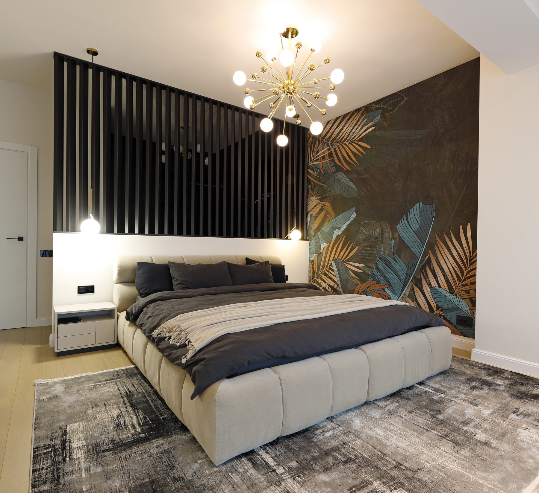 Livingul a fost gândit ca o zonă de relaxare, foarte aerisită, cu o canapea foarte comodă și generoasă. În ambele dormitoare am gândit dressinguri destul de spațioase, elegant separate de zona de dormit. În dormitorul matrimonial, am decis orientarea patului către fereastră, astfel încât beneficiarii să se bucure de priveliștea de afară, separând zona de dormit de cea de dressing printr-un riflaj. Dormitorul cel mic a fost gândit cu dublă destinație: o zonă de escape, beneficiarei i-a plăcut foarte mult ideea unui tapet cu nori care crează senzația de spațialitate, liniște și relaxare, dar și o zonă de birou pentru zilele de work from home. Beneficiarii și-au dorit o baie în stil modern, alb-negru, în care am inclus plante pentru a da contrast și vitalitate spațiului.