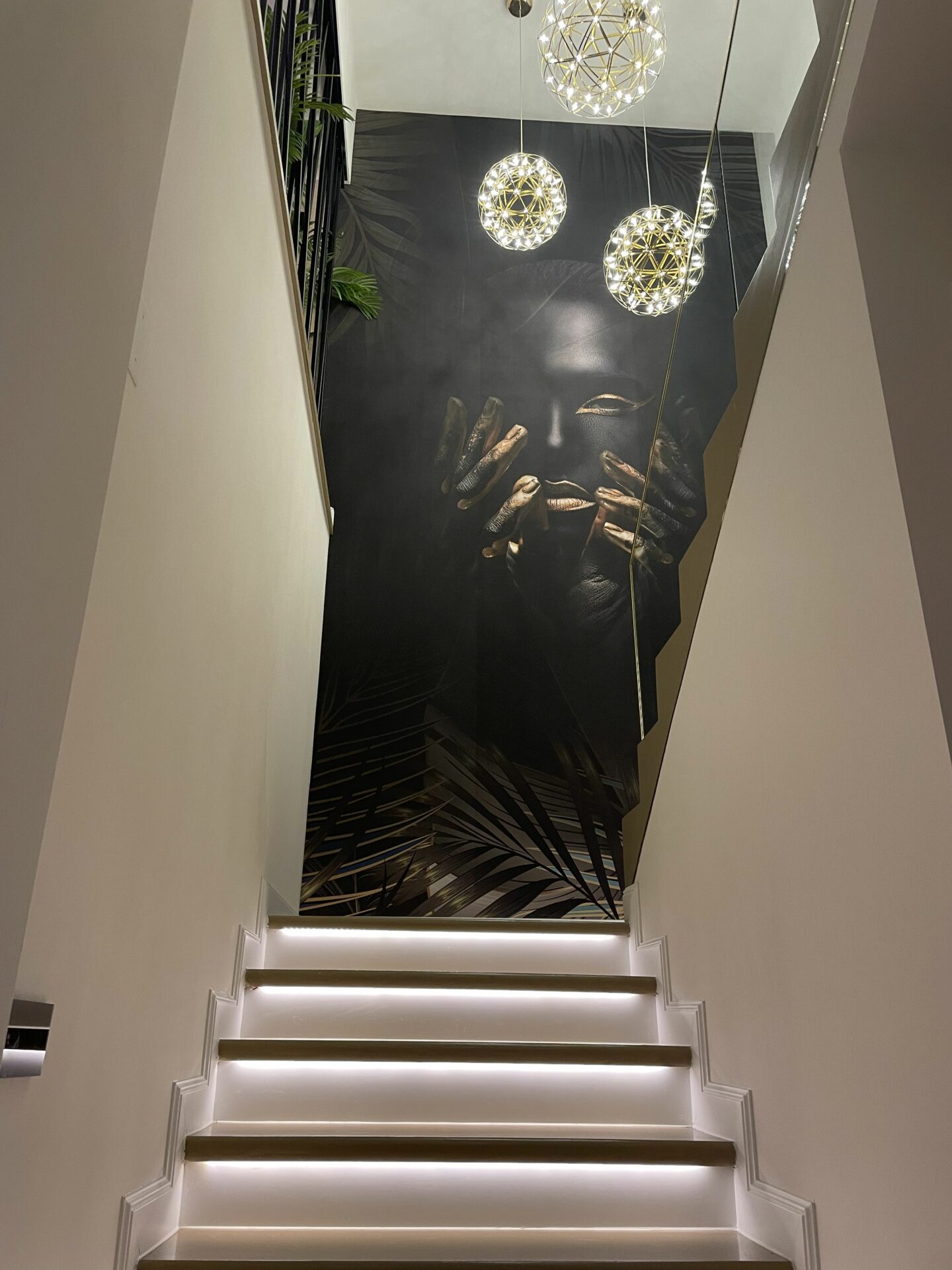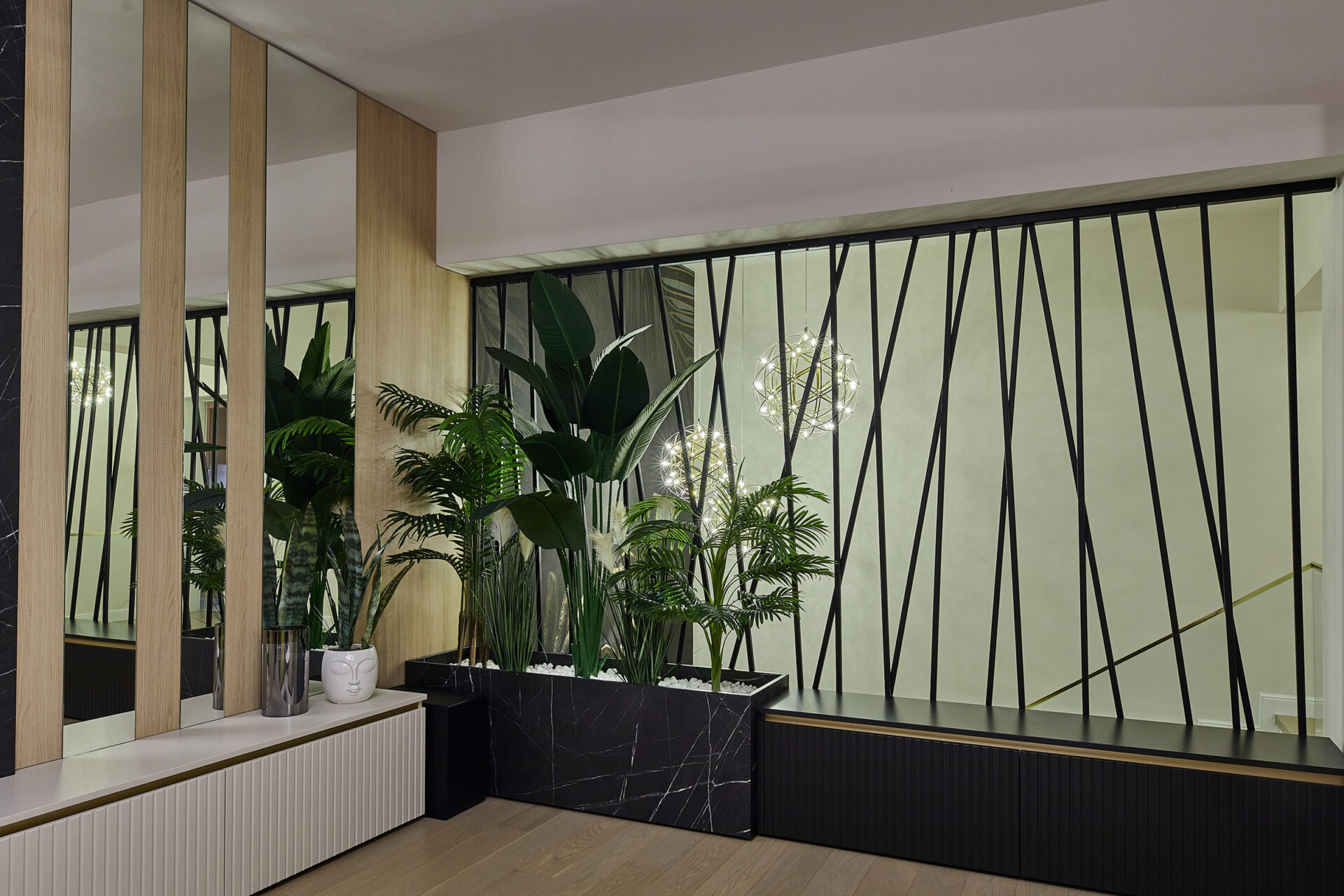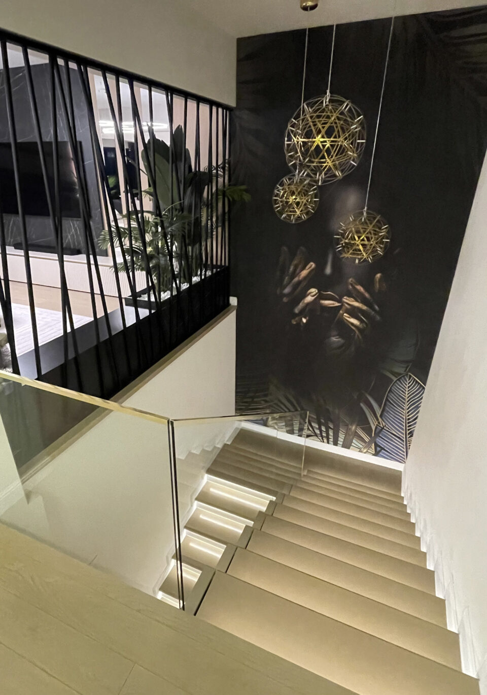 Pentru amenajarea acestui penthouse de 175 mp, situat într-o zonă centrală a Bucureștiului, s-a dorit o amenajare elegantă în care să reușim să integram cerințele foarte diferite ale ambilor beneficiari. Camerele sunt destul de spațioase, cu ferestre înalte beneficiind de multă lumină naturală. Cu toate acestea, casa scării era o zonă destul de întunecoasă, existând un perete între zona de living și scară, care bloca lumina naturală. Am decis, împreună cu beneficiarii, să renunțăm la acel perete și să-l înlocuim cu un riflaj metalic și o zonă de plante, pentru a aduce natura și lumina naturală și pe casa scării. Lustrele alese aduc eleganță scării, rafinament și conferă un aspect sofisticat, integrându-se plăcut cu tapetul. Această schimbare a creat o continuitate între zona de noapte și zona de zi.