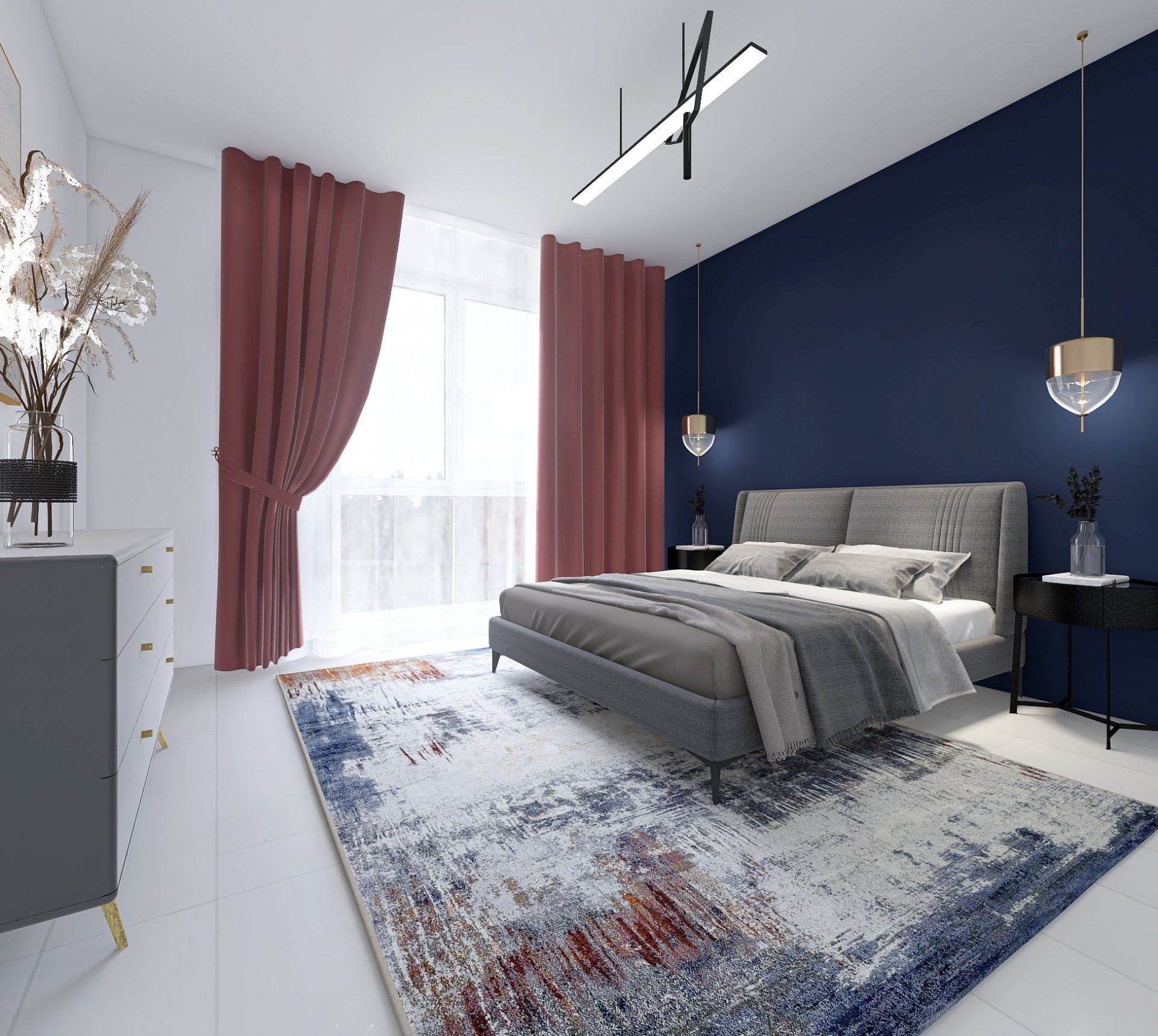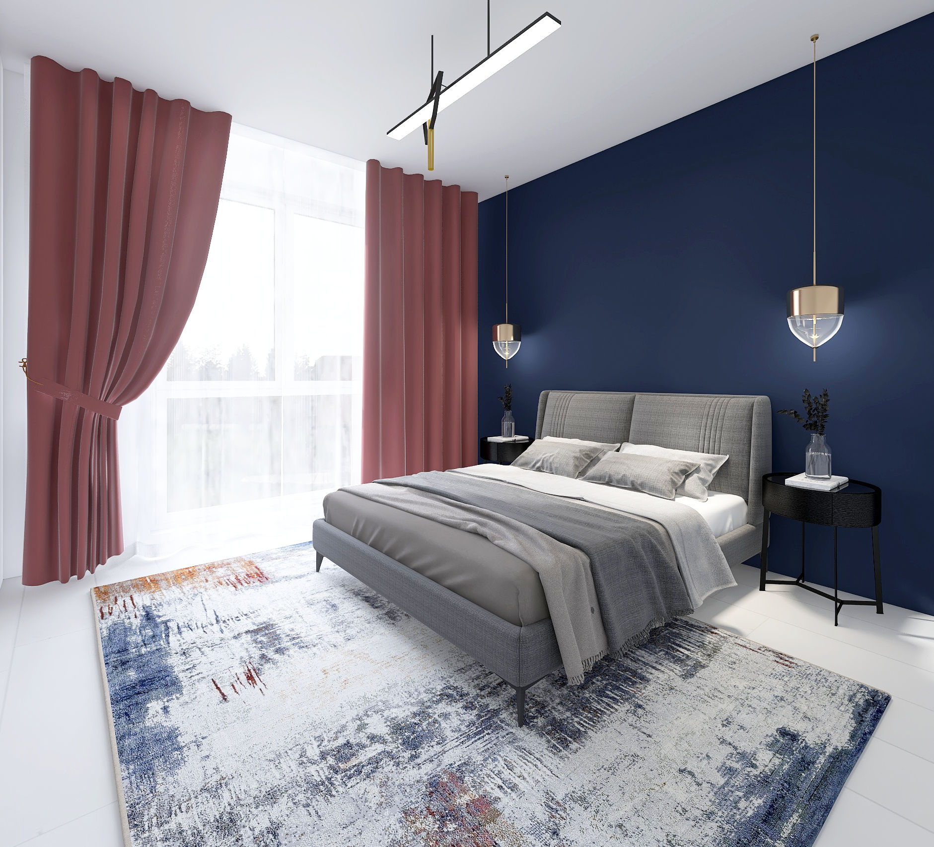 În dormitor predomină albastru că nuanță de contrast și culori derivate din gri și bordo. Pendulele așezate în lateralele patului încadrează imaginea de ansamblu, aspectul general fiind unul care îmbie la odihnă și relaxare. Toate corpurile sunt prevăzute cu picioare de susținere înalte sau sunt fixate în perete, aceasta fiind dorința clientului, astfel întregul mobilier a fost adaptat și s-au adus soluții estetice și practice.