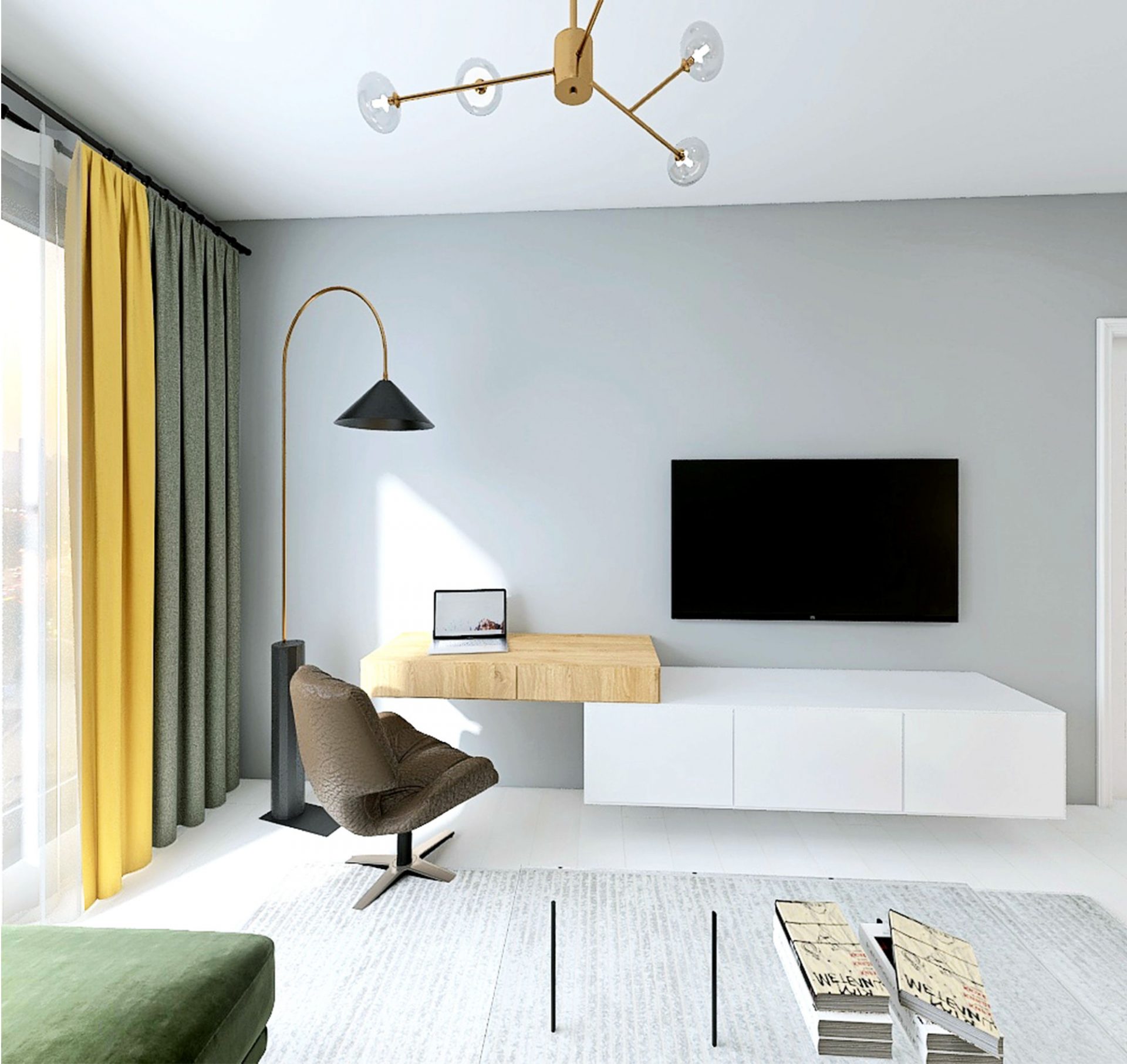Comoda TV se continuă cu blatul de lucru ce se conturează că fiind un birou, asociat cu un scaun confortabil din piele. Depozitarea este pe întreaga suprafață a peretelui, reprezentând dressingul principal.