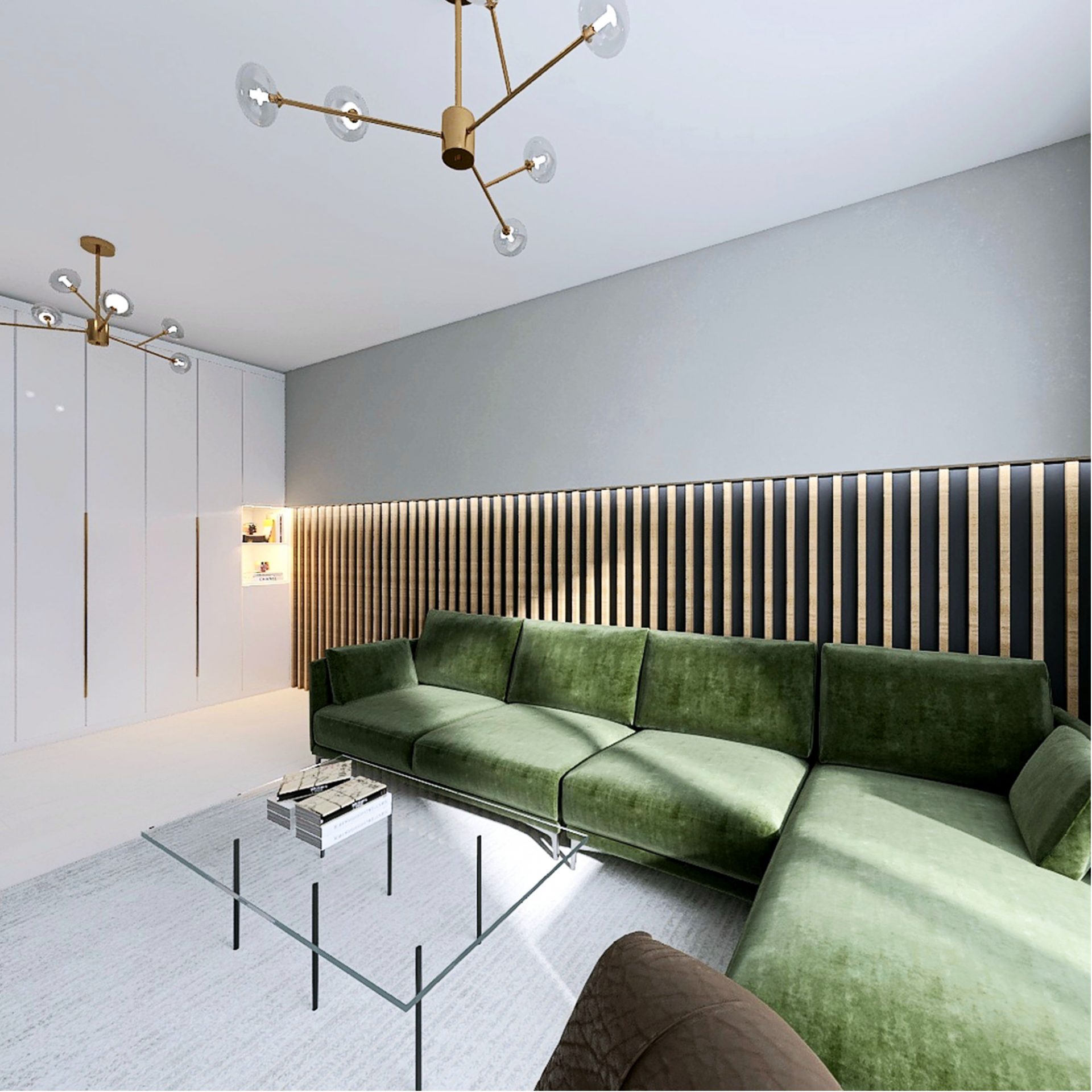 Vedeta amenajării din living este colțarul din stofă vernil, acesta fiind pus în scenă de peretele riflat din spatele acestuia, prevăzut sub scafă și iluminat cu bandă led pe toață suprafața, accentuând ideea de intimitate și căldură.