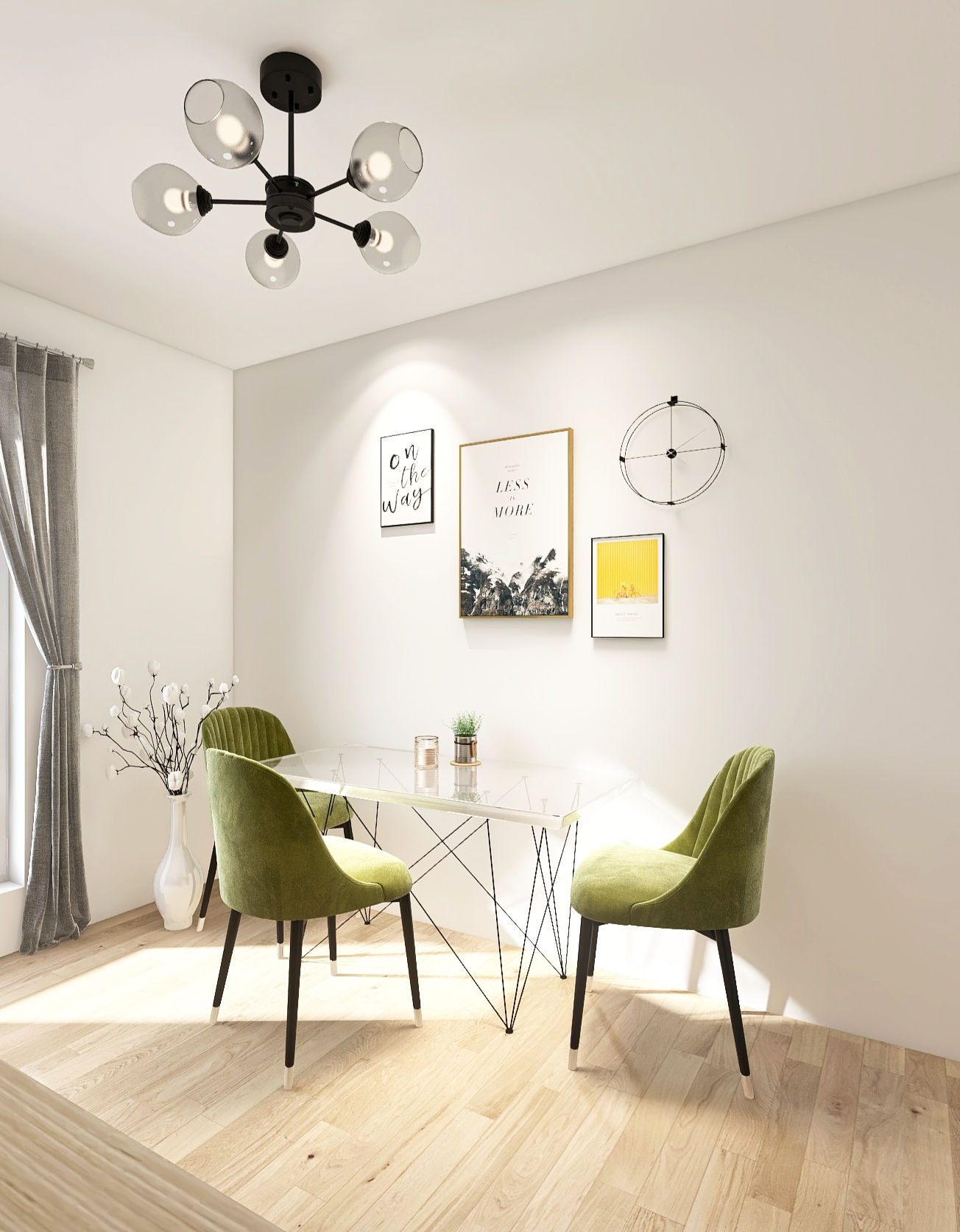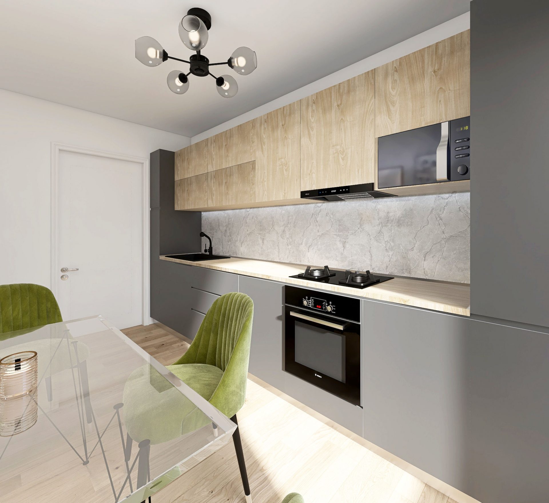 Bucătăria preia din culorile zonei de zi, iar pe unul din pereți este evidențiată o compoziție veselă de postere ilustrate.
