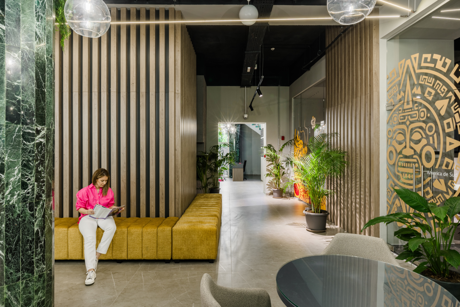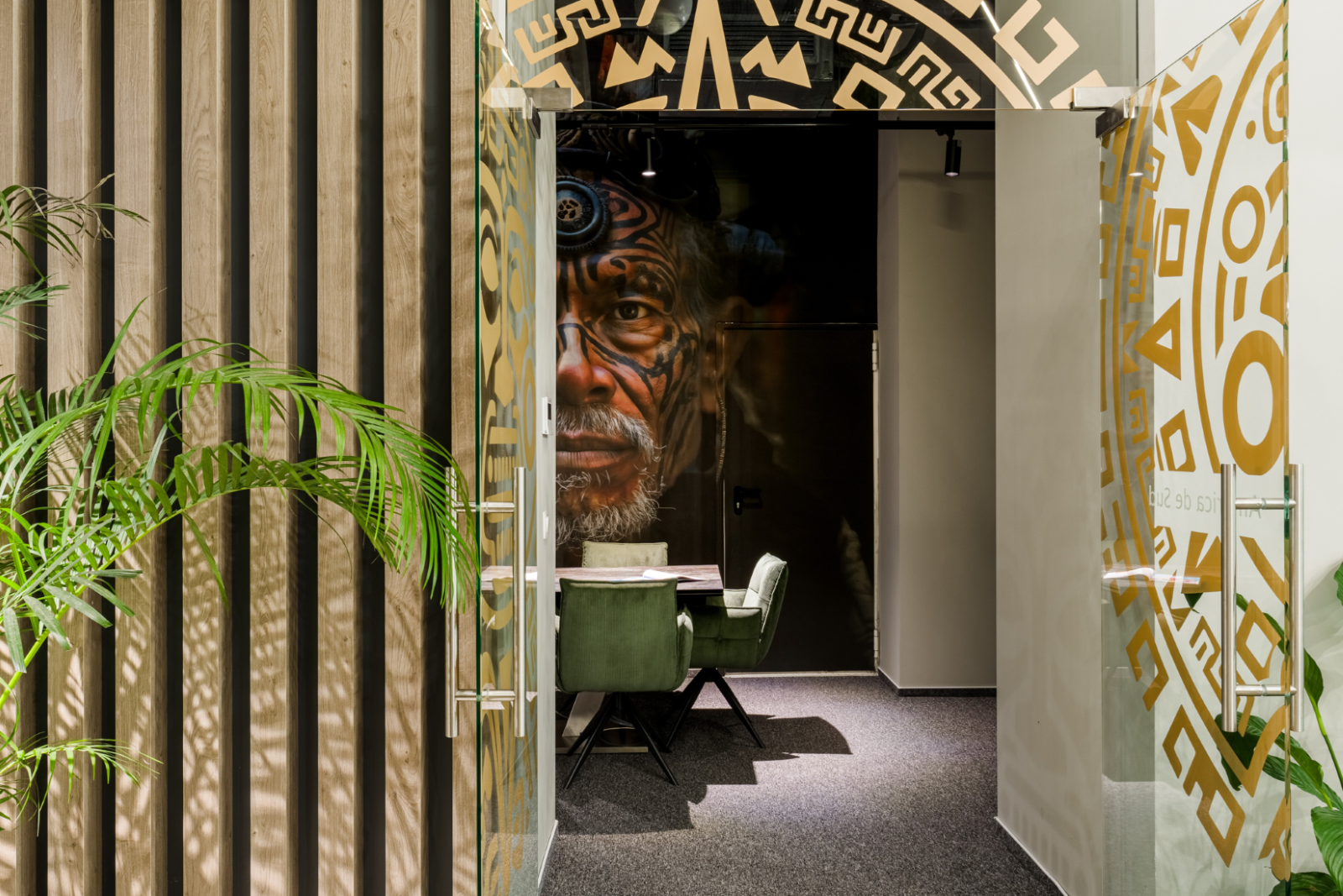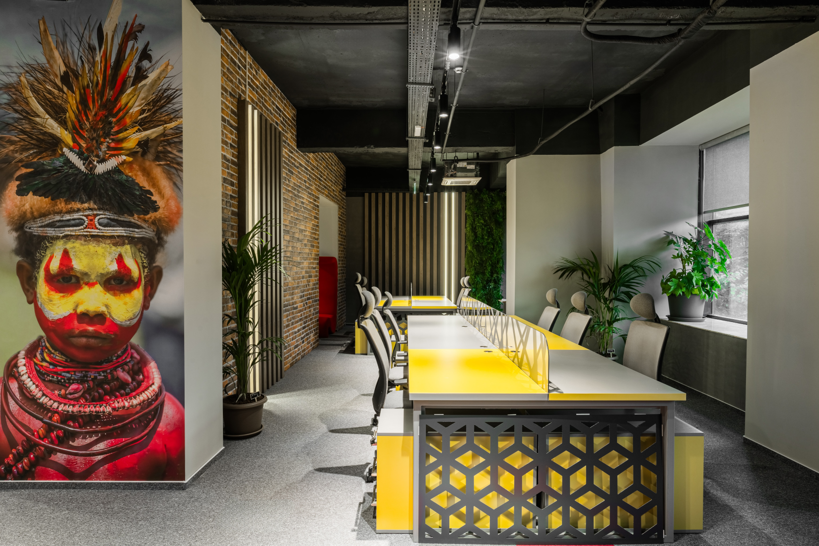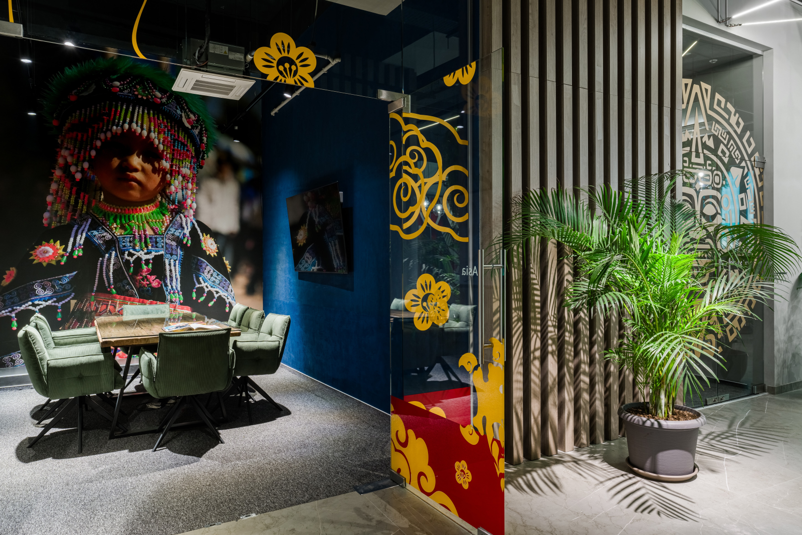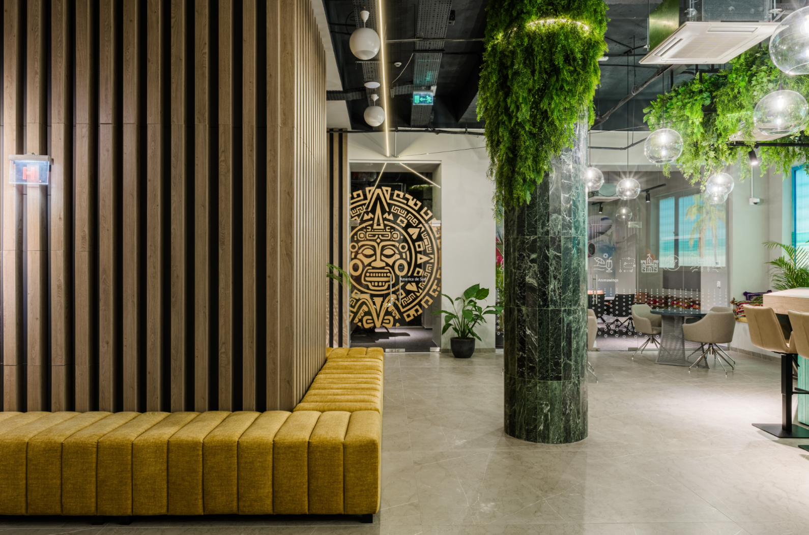 Armonie între design, cultură și funcționalitate. Un spațiu de birouri care redefinește conceptul de amenajare office, îmbinând estetica modernă cu accente culturale și elemente naturale pentru a crea un mediu de lucru dinamic și inspirațional. Designul a fost gândit să ofere atât funcționalitate, cât și o experiență vizuală captivantă. Unul dintre elementele centrale ale amenajării este integrarea vegetației în toate zonele. Panourile cu verdeață suspendată din zonele principale creează o atmosferă relaxantă, contribuind la îmbunătățirea calității aerului și a stării de bine. Lumina joacă, de asemenea, un rol esențial: corpurile de iluminat sferice, cu design contemporan, adaugă un farmec aparte și asigură o iluminare difuză, potrivită atât pentru lucru, cât și pentru socializare. Inserțiile de lumină indirectă, integrate în structuri din lemn și metal, completează această ambianță caldă și primitoare. Un alt aspect definitoriu al acestui spațiu este atenția acordată diversității culturale. Sălile de ședință sunt personalizate cu imagini și motive inspirate din tradiții locale și internaționale, oferind un caracter unic fiecărei zone. Grafica murală vibrantă și motivele decorative tradiționale transformă pereții în opere de artă, creând o experiență vizuală captivantă. Designul interior pune accent pe un mix rafinat de materiale. Lemnul natural, folosit atât pentru pereți cât și pentru mobilier, aduce o notă caldă și primitoare. Pereții din cărămidă aparentă oferă un contrast subtil, adăugând un aer industrial care se îmbină perfect cu texturile naturale. Aceste detalii creează o atmosferă echilibrată, modernă și prietenoasă. Zonele de coworking sunt concepute pentru a încuraja colaborarea și comunicarea. Mobilierul ergonomic, cu mese mari și inserții metalice decorative, oferă atât confort, cât și un aspect modern. Spațiile de relaxare sunt punctate de canapele tapițate în culori vii și accente decorative naturale, creând locuri ideale pentru discuții informale și pauze. Zona de recepție impresionează prin texturi premium precum marmura verde și lemnul, completate de decoruri suspendate cu vegetație. Barul și spațiile de așteptare sunt atât funcționale, cât și estetice, marcând un punct de întâlnire ideal pentru clienți și echipe. Acest spațiu office nu este doar un loc de lucru, ci o experiență în sine. Designul său integrează armonios natura, cultura și funcționalitatea, stimulând creativitatea, colaborarea și starea de bine a celor care îl folosesc. Cu accente personalizate, spații gândite ergonomic și detalii care surprind la fiecare pas, acest birou este o declarație de design modern, sofisticat și sustenabil.