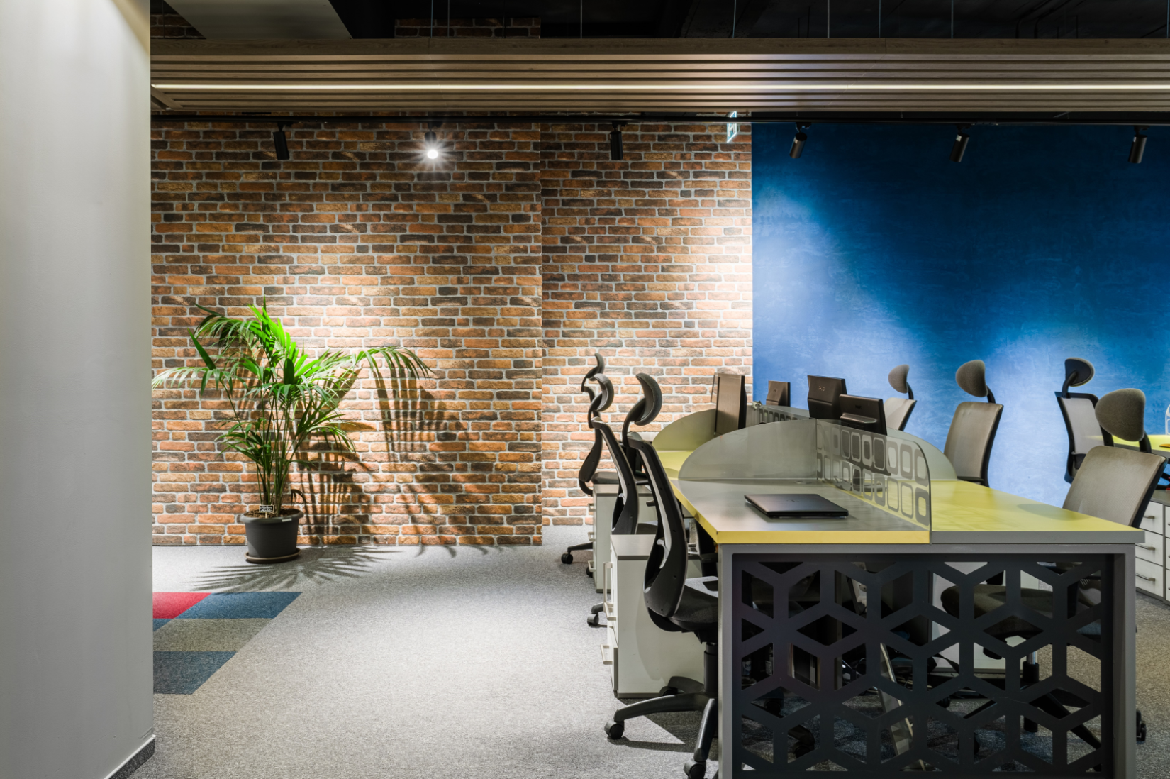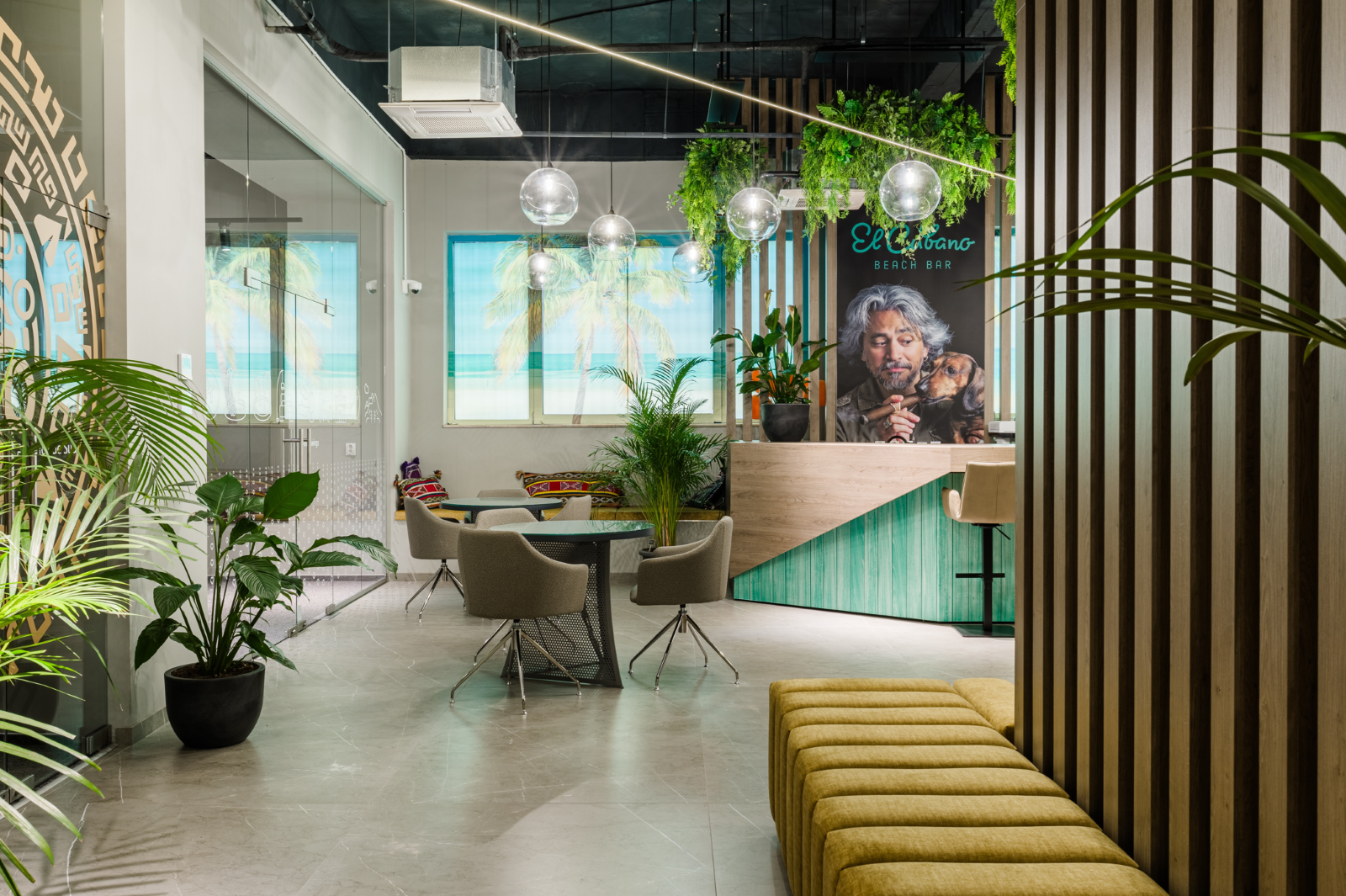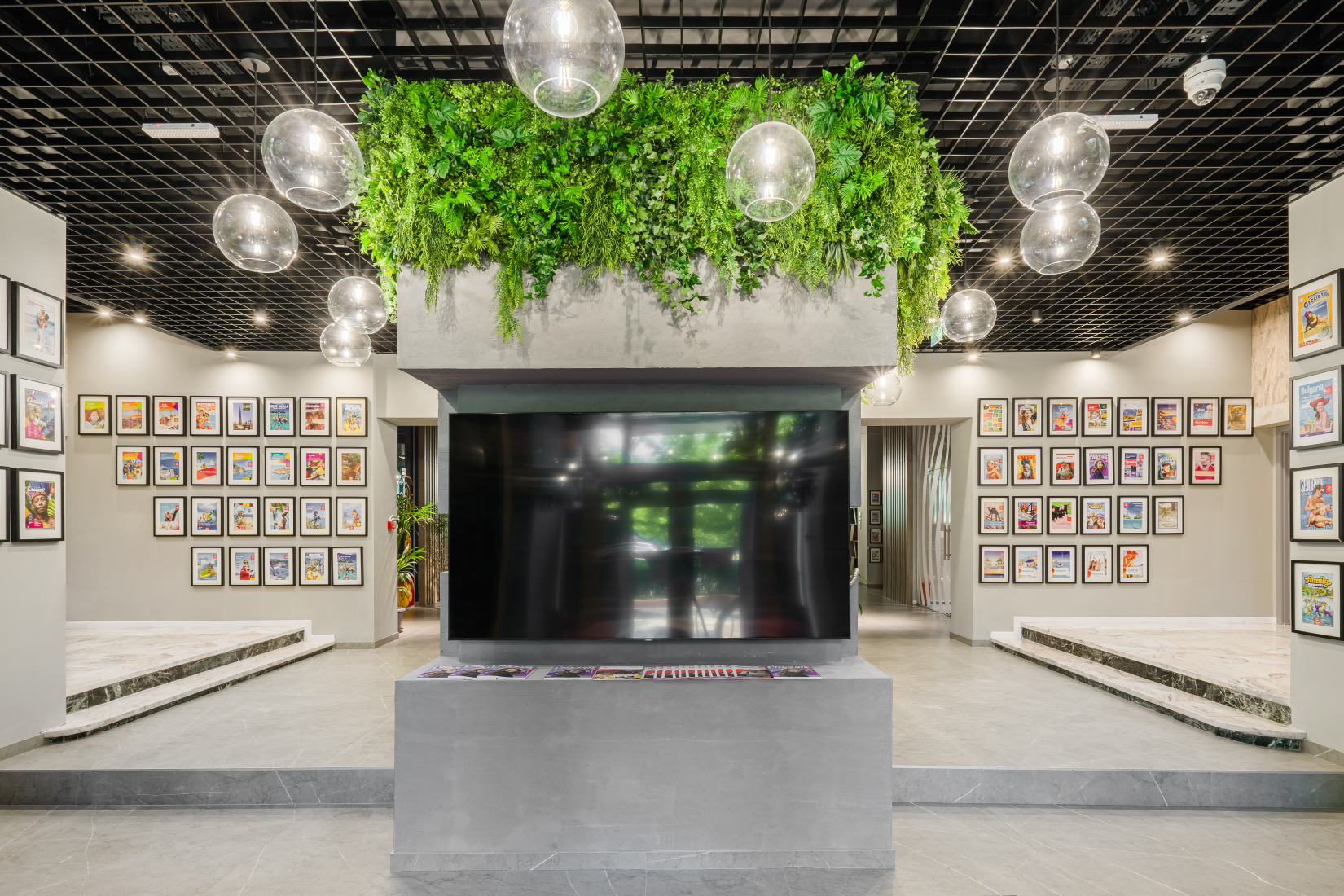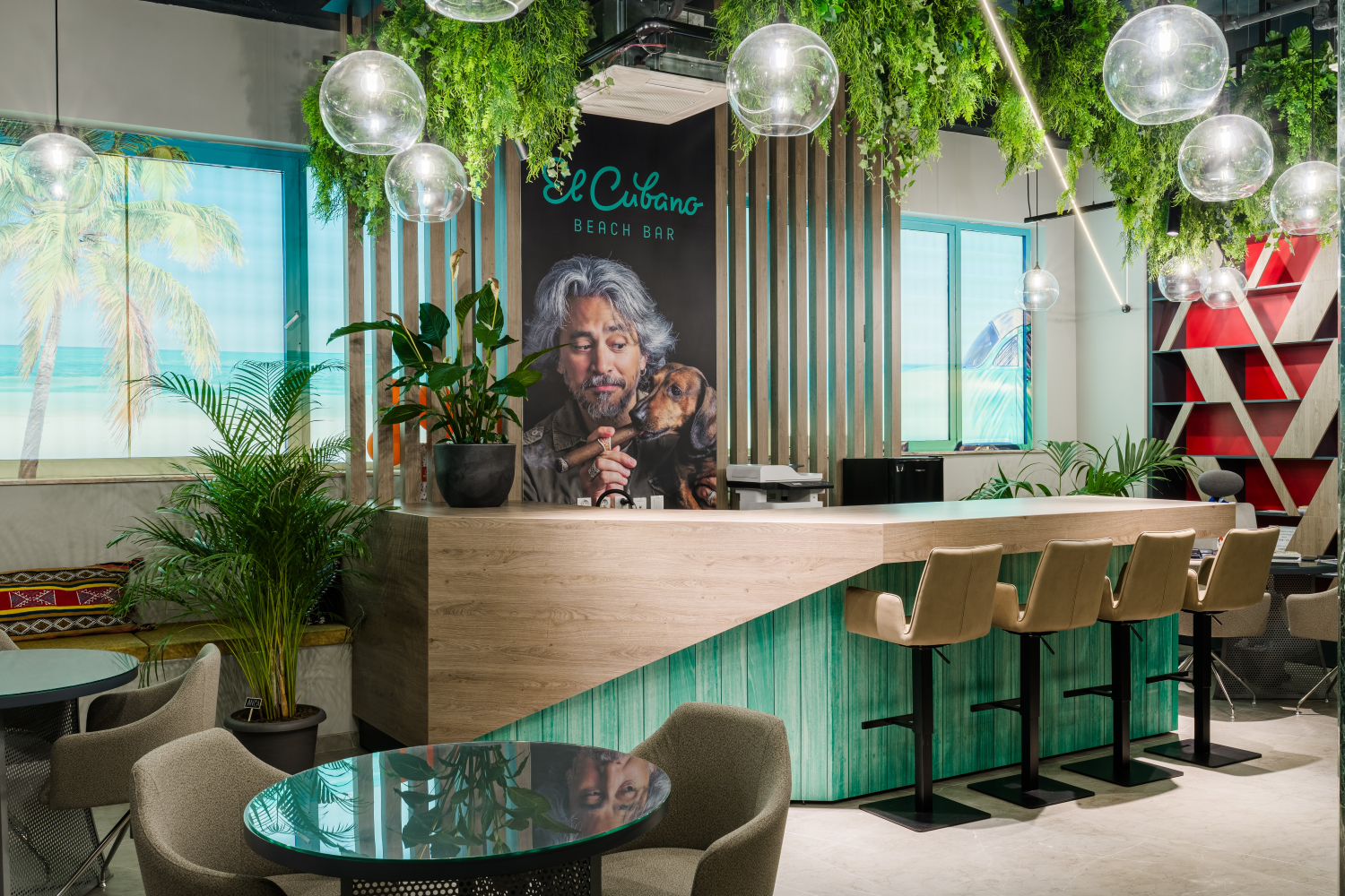 Armonie între design, cultură și funcționalitate. Un spațiu de birouri care redefinește conceptul de amenajare office, îmbinând estetica modernă cu accente culturale și elemente naturale pentru a crea un mediu de lucru dinamic și inspirațional. Designul a fost gândit să ofere atât funcționalitate, cât și o experiență vizuală captivantă. Unul dintre elementele centrale ale amenajării este integrarea vegetației în toate zonele. Panourile cu verdeață suspendată din zonele principale creează o atmosferă relaxantă, contribuind la îmbunătățirea calității aerului și a stării de bine. Lumina joacă, de asemenea, un rol esențial: corpurile de iluminat sferice, cu design contemporan, adaugă un farmec aparte și asigură o iluminare difuză, potrivită atât pentru lucru, cât și pentru socializare. Inserțiile de lumină indirectă, integrate în structuri din lemn și metal, completează această ambianță caldă și primitoare. Un alt aspect definitoriu al acestui spațiu este atenția acordată diversității culturale. Sălile de ședință sunt personalizate cu imagini și motive inspirate din tradiții locale și internaționale, oferind un caracter unic fiecărei zone. Grafica murală vibrantă și motivele decorative tradiționale transformă pereții în opere de artă, creând o experiență vizuală captivantă. Designul interior pune accent pe un mix rafinat de materiale. Lemnul natural, folosit atât pentru pereți cât și pentru mobilier, aduce o notă caldă și primitoare. Pereții din cărămidă aparentă oferă un contrast subtil, adăugând un aer industrial care se îmbină perfect cu texturile naturale. Aceste detalii creează o atmosferă echilibrată, modernă și prietenoasă. Zonele de coworking sunt concepute pentru a încuraja colaborarea și comunicarea. Mobilierul ergonomic, cu mese mari și inserții metalice decorative, oferă atât confort, cât și un aspect modern. Spațiile de relaxare sunt punctate de canapele tapițate în culori vii și accente decorative naturale, creând locuri ideale pentru discuții informale și pauze. Zona de recepție impresionează prin texturi premium precum marmura verde și lemnul, completate de decoruri suspendate cu vegetație. Barul și spațiile de așteptare sunt atât funcționale, cât și estetice, marcând un punct de întâlnire ideal pentru clienți și echipe. Acest spațiu office nu este doar un loc de lucru, ci o experiență în sine. Designul său integrează armonios natura, cultura și funcționalitatea, stimulând creativitatea, colaborarea și starea de bine a celor care îl folosesc. Cu accente personalizate, spații gândite ergonomic și detalii care surprind la fiecare pas, acest birou este o declarație de design modern, sofisticat și sustenabil.