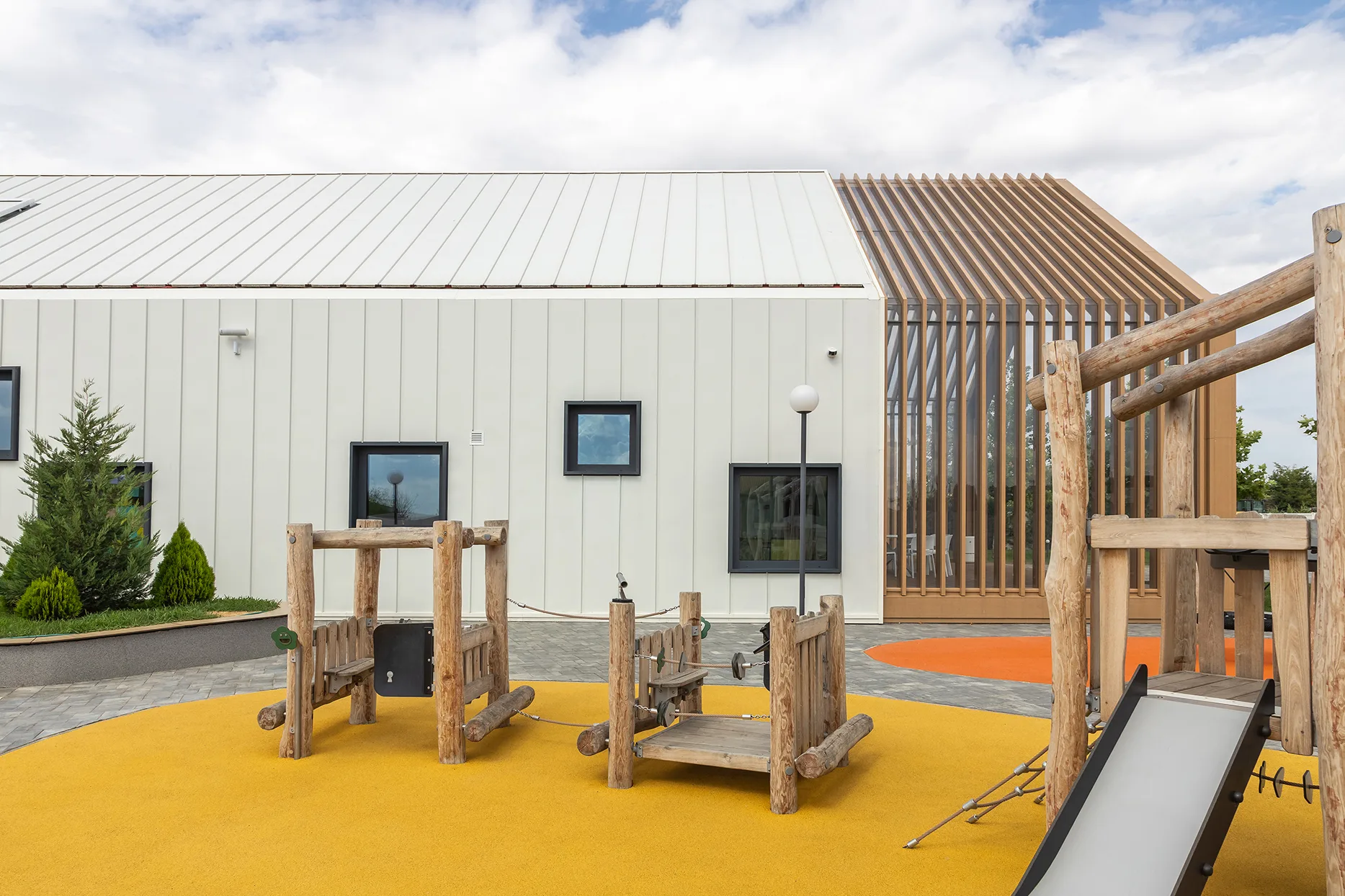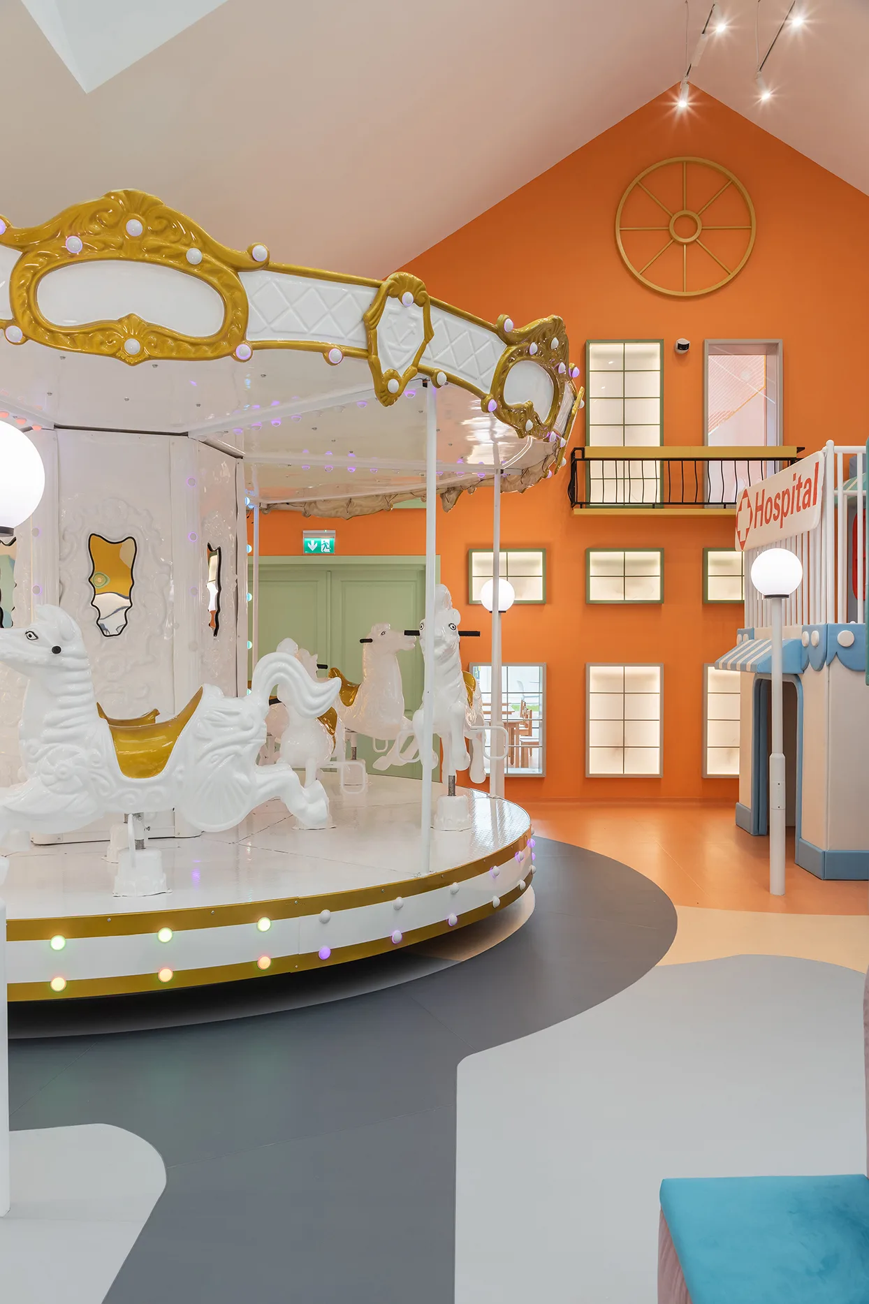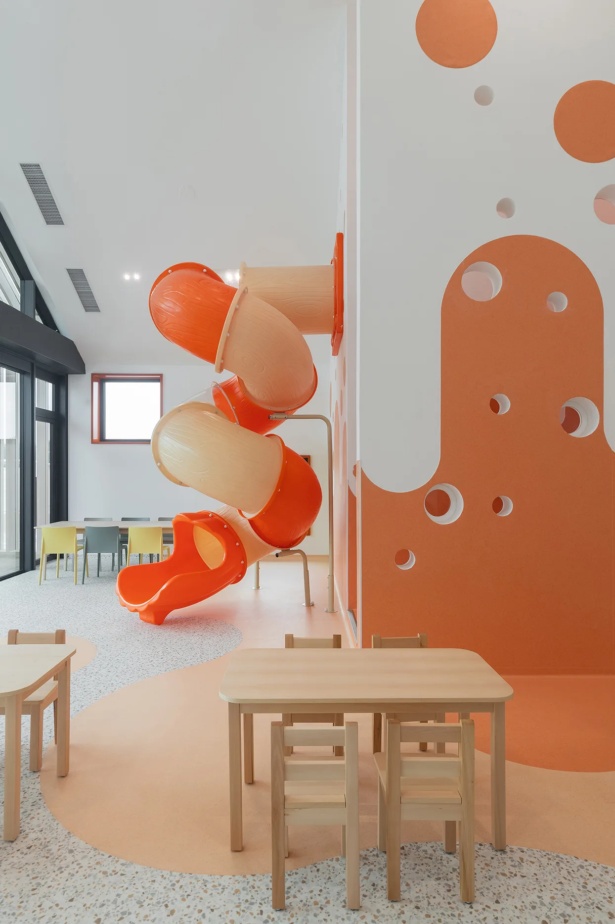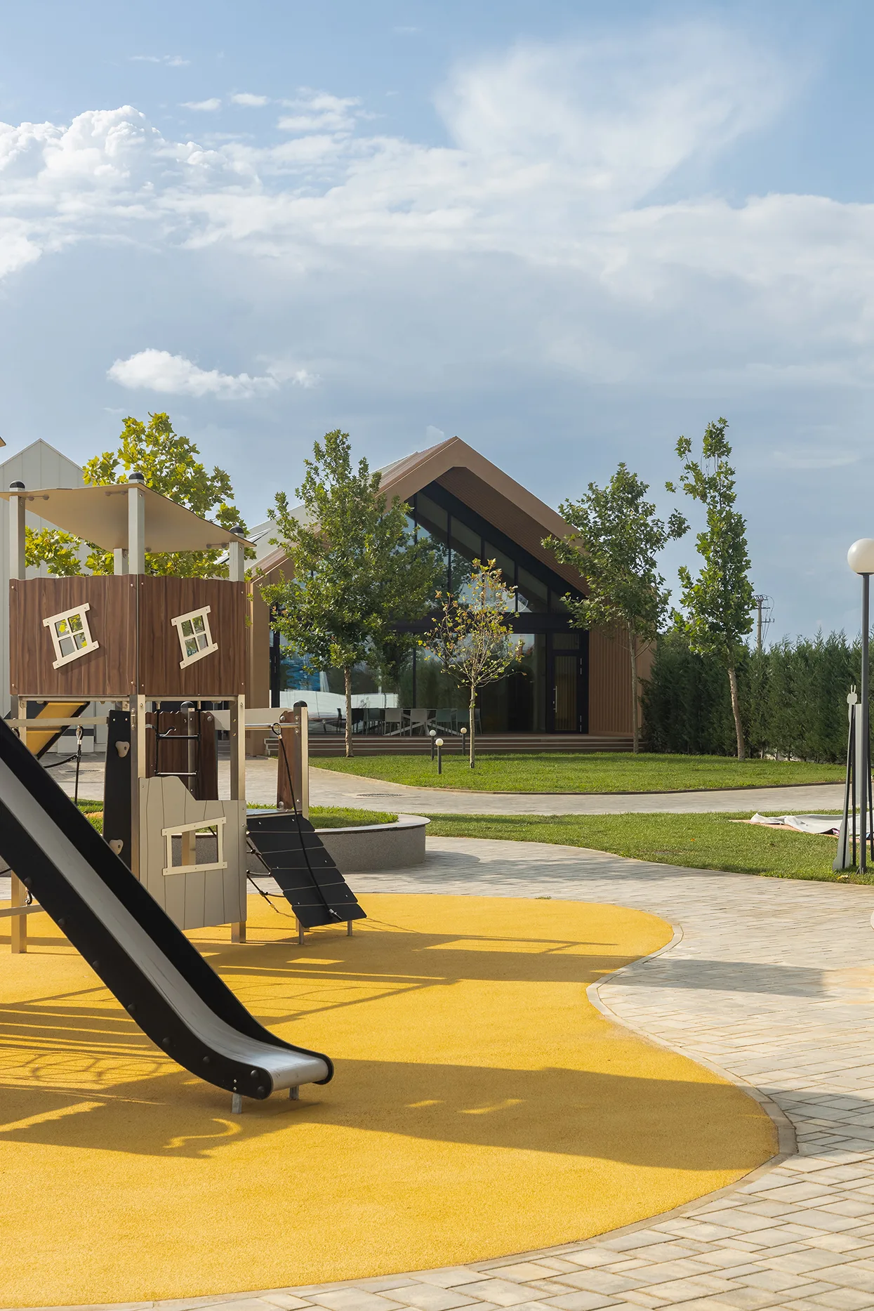 Paleta cromatică este definită de nuanțe pastelate, completate de texturi calde din lemn și terrazzo, creând o atmosferă luminoasă, primitoare și sigură. Fiecare căsuță este individualizată cromatic și beneficiază de o zonă de supantă, o „casă în casă” dedicată exclusiv copiilor. Spațiul interior este conectat direct cu o terasă acoperită și o grădină privată, extinzând experiența în aer liber.